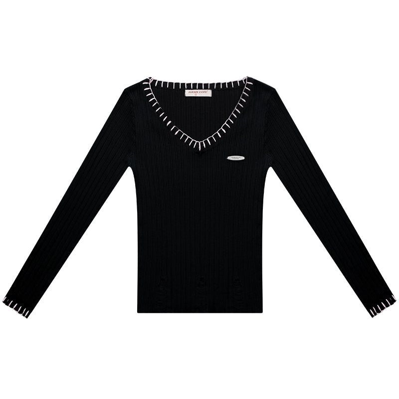 Big V-neck Slim Knit T-shirt | Retro Long Sleeve Base Layer for Autumn/Winter