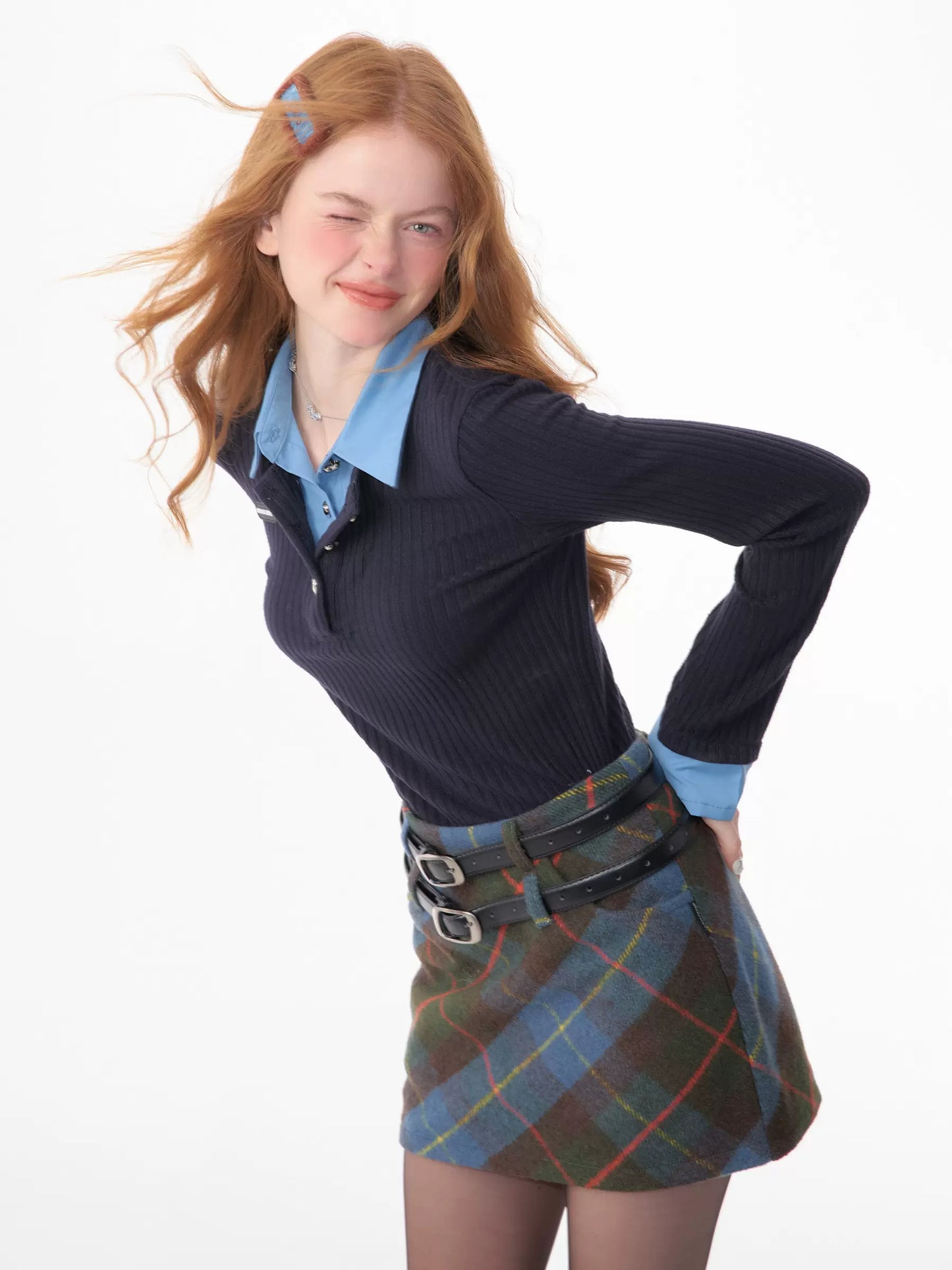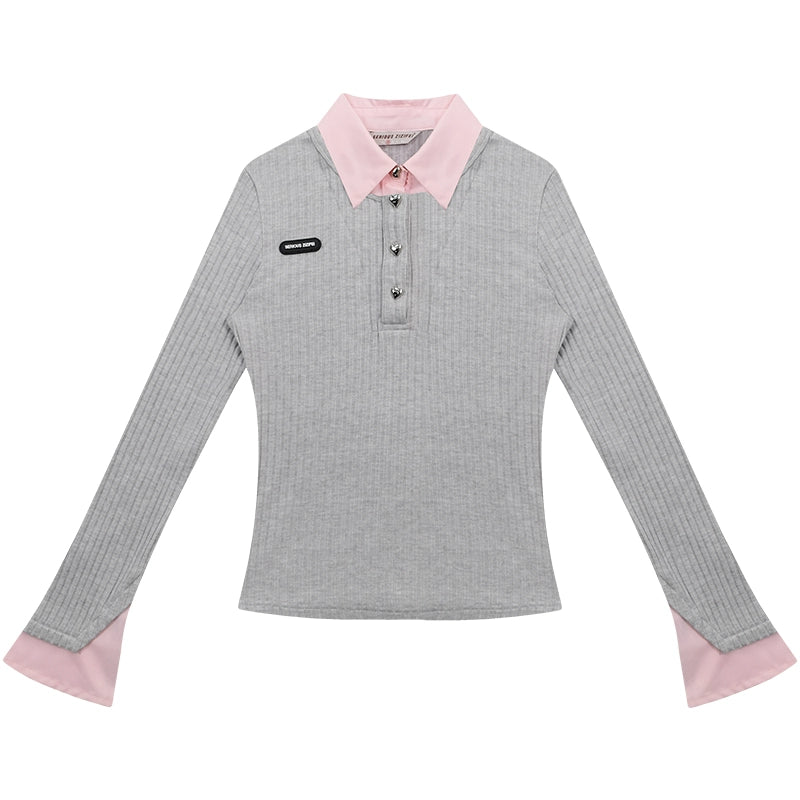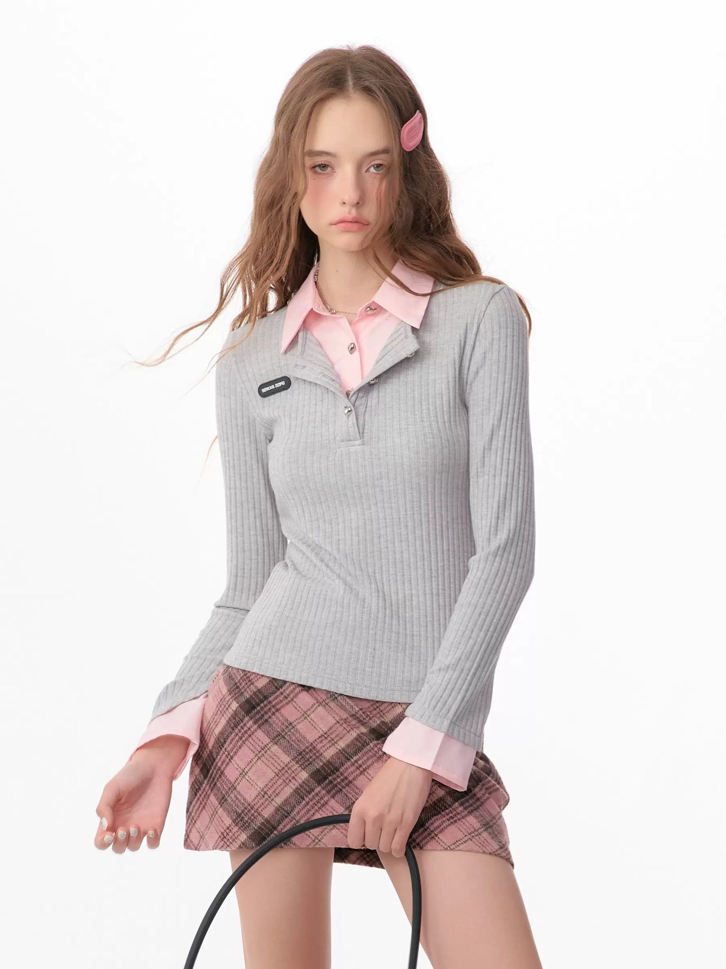 Bell Sleeve Fake Two-Piece Sweater | Slim Fit Polo Neck Retro Design for Autumn/Winter