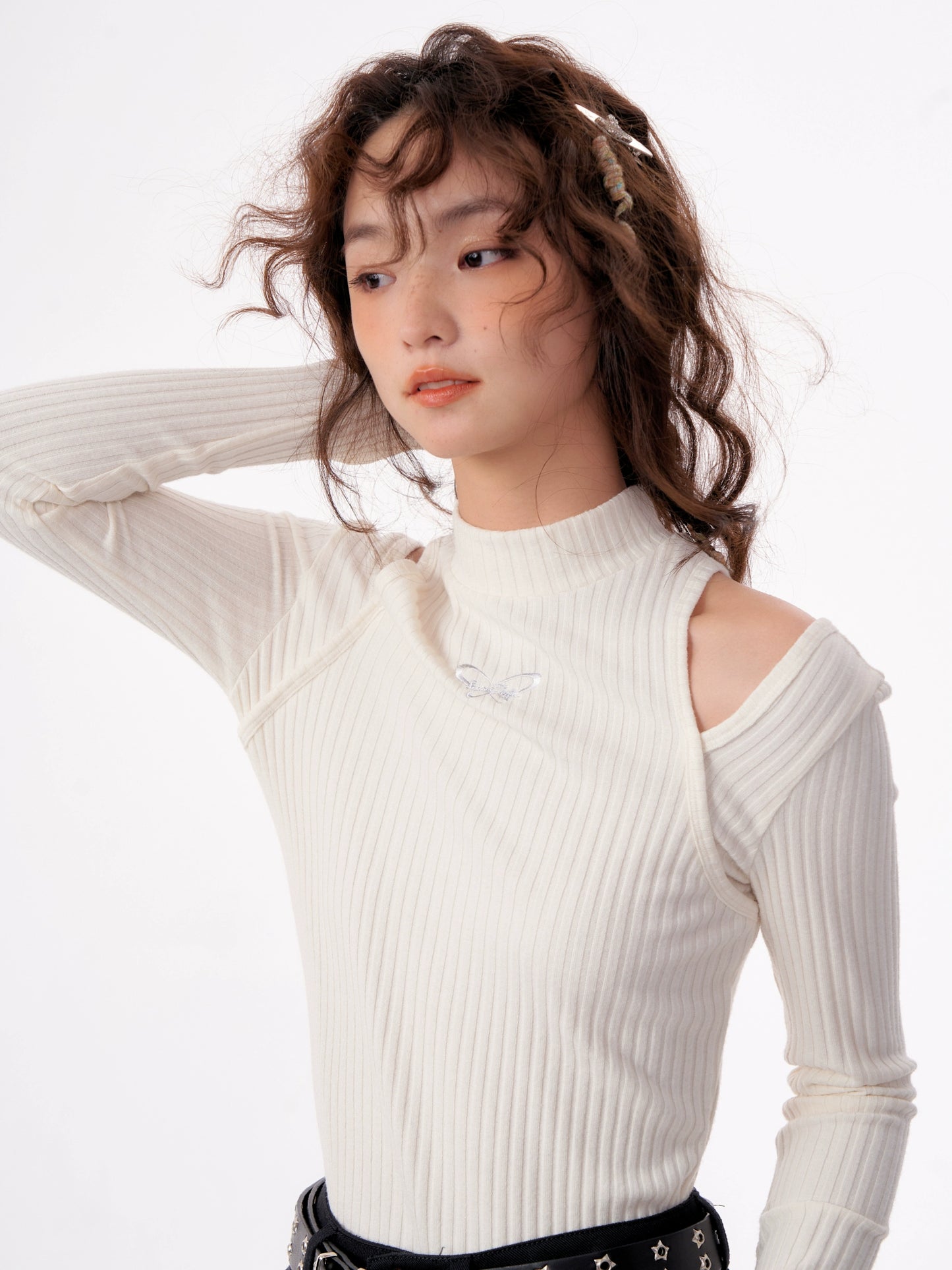 Butterfly Embroidered Hollow Shoulder Top | Slim Fit Long Sleeve Retro Design for Autumn/Winter
