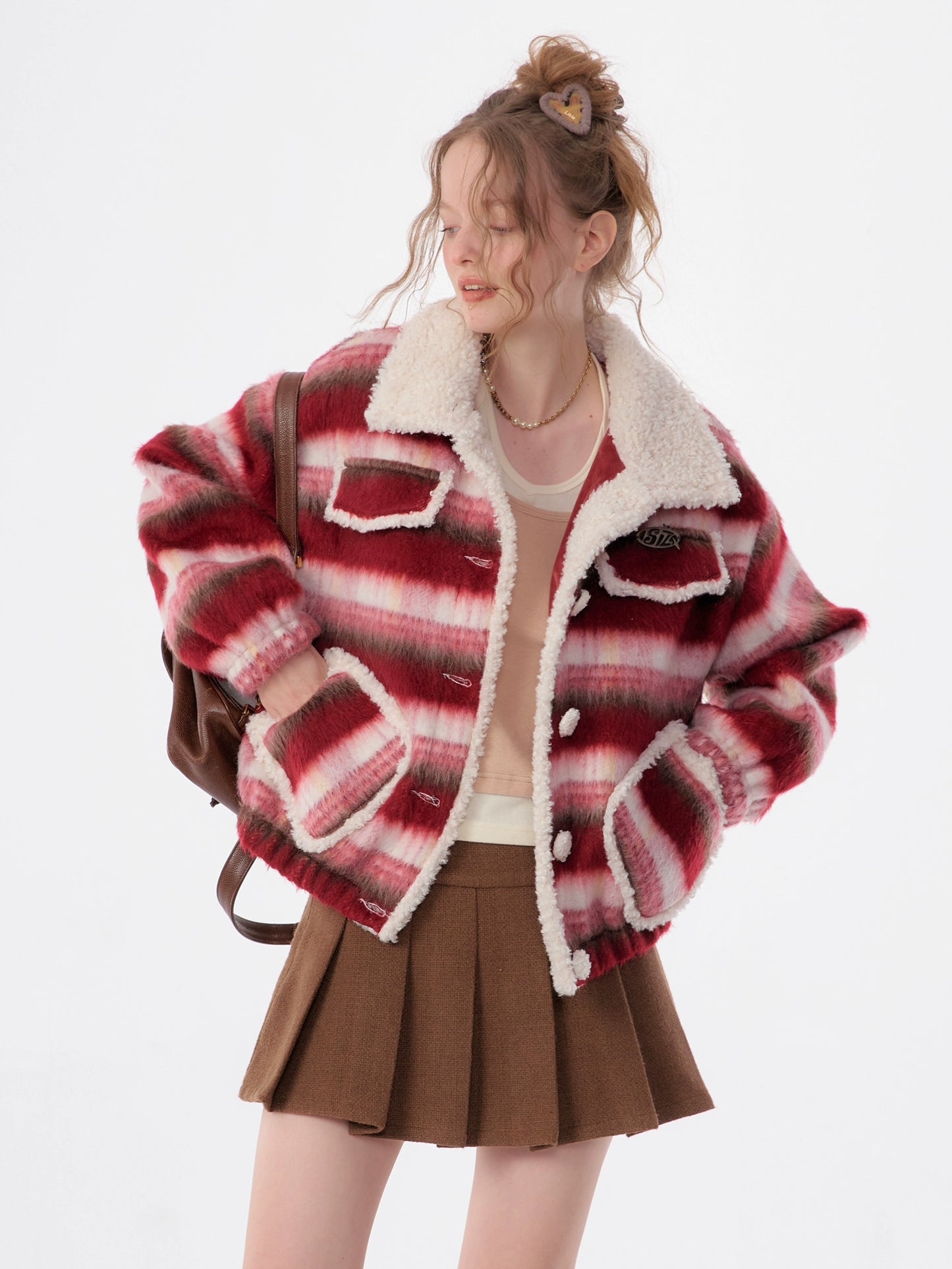 Red Striped Wool Coat | Retro Rabbit Pattern Christmas Design for Autumn/Winter