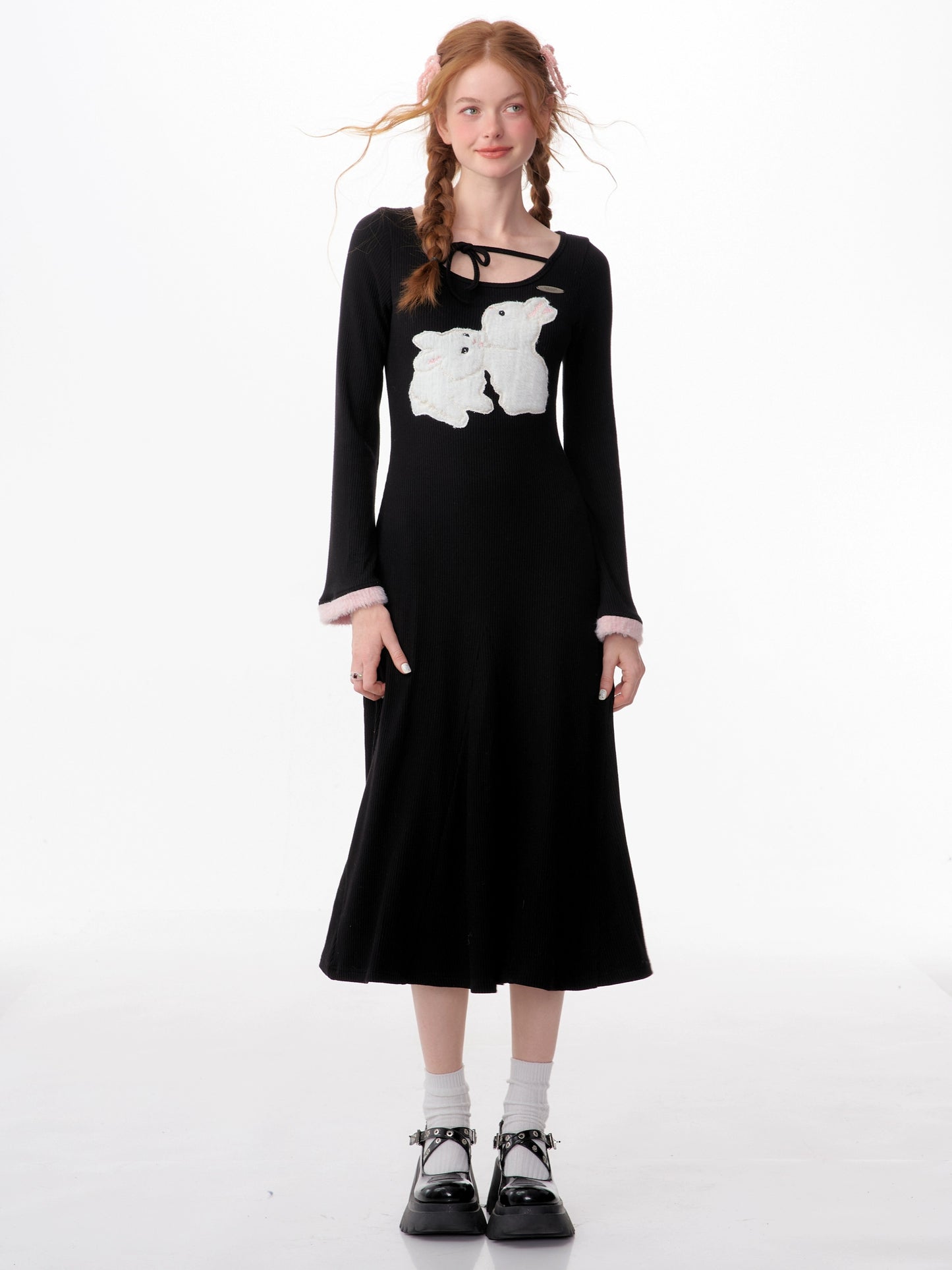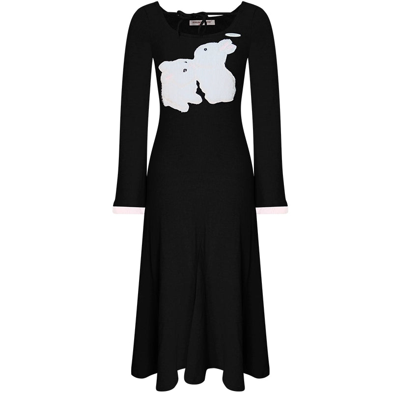 Plush Rabbit Knit Dress | Slim Fit Retro Long Sleeve for Autumn/Winter