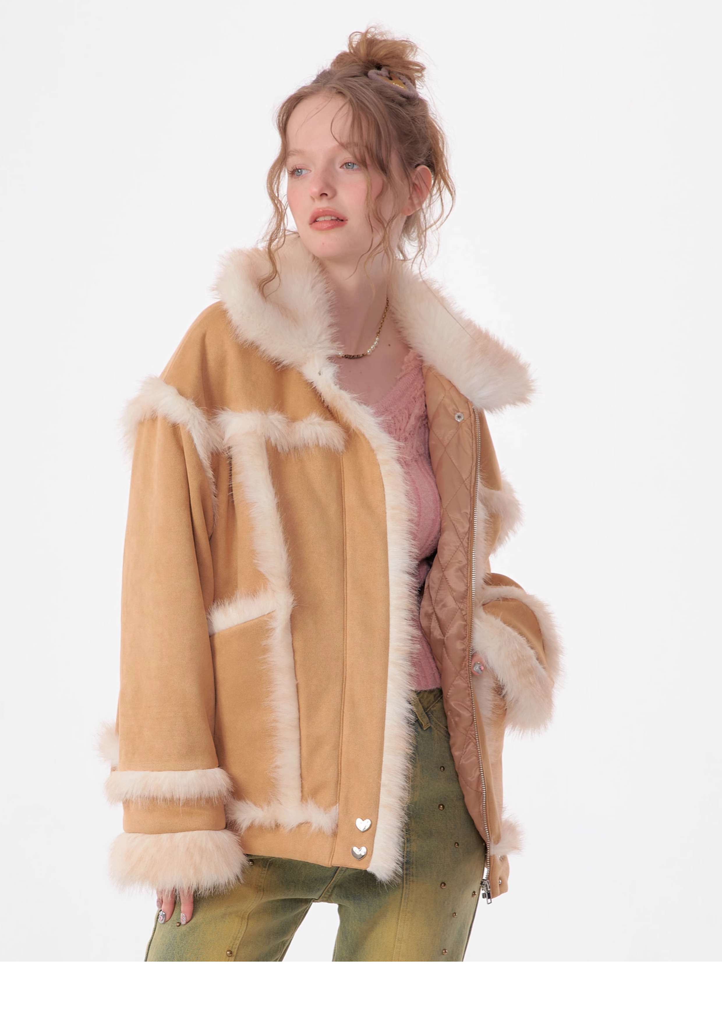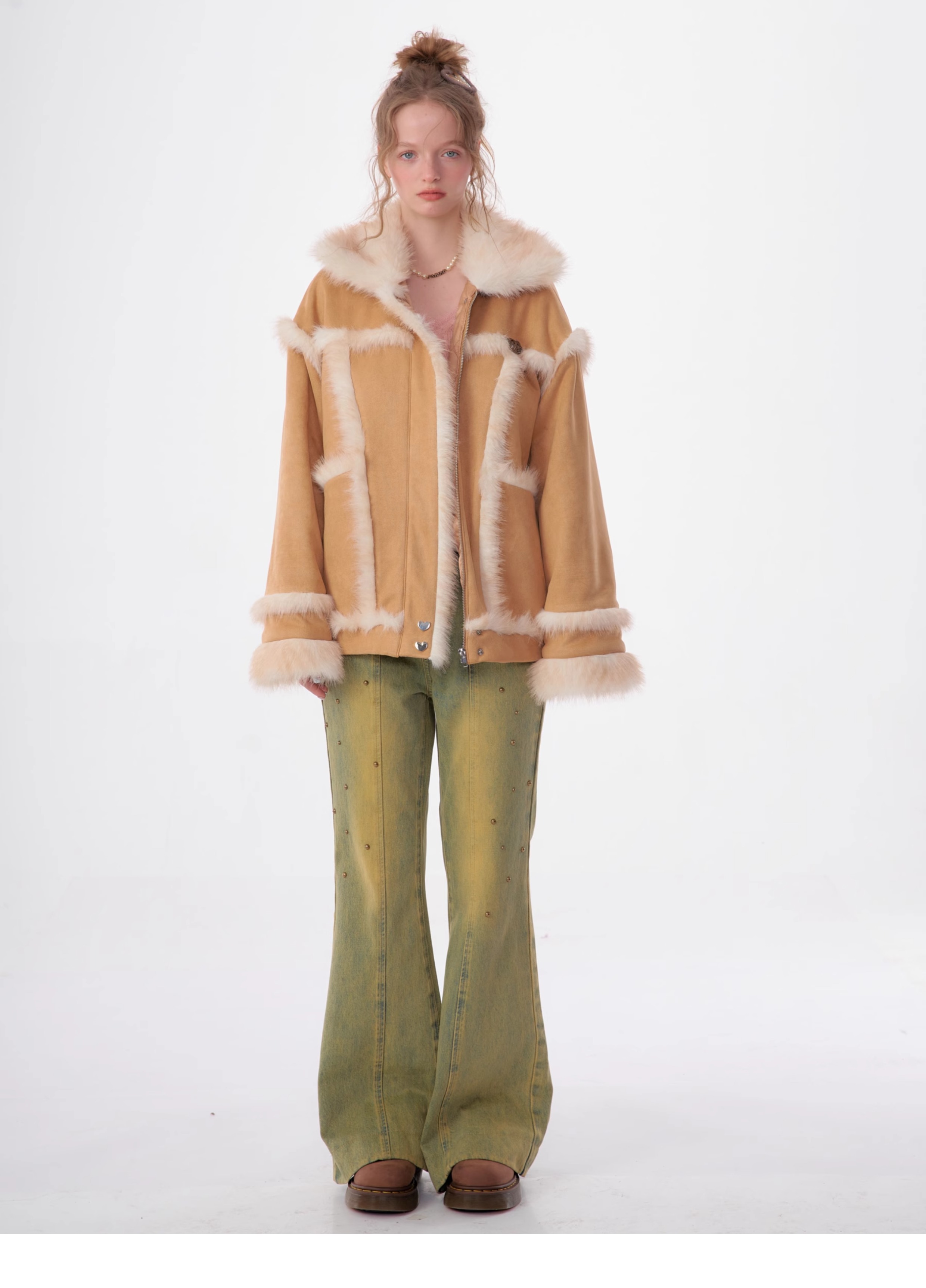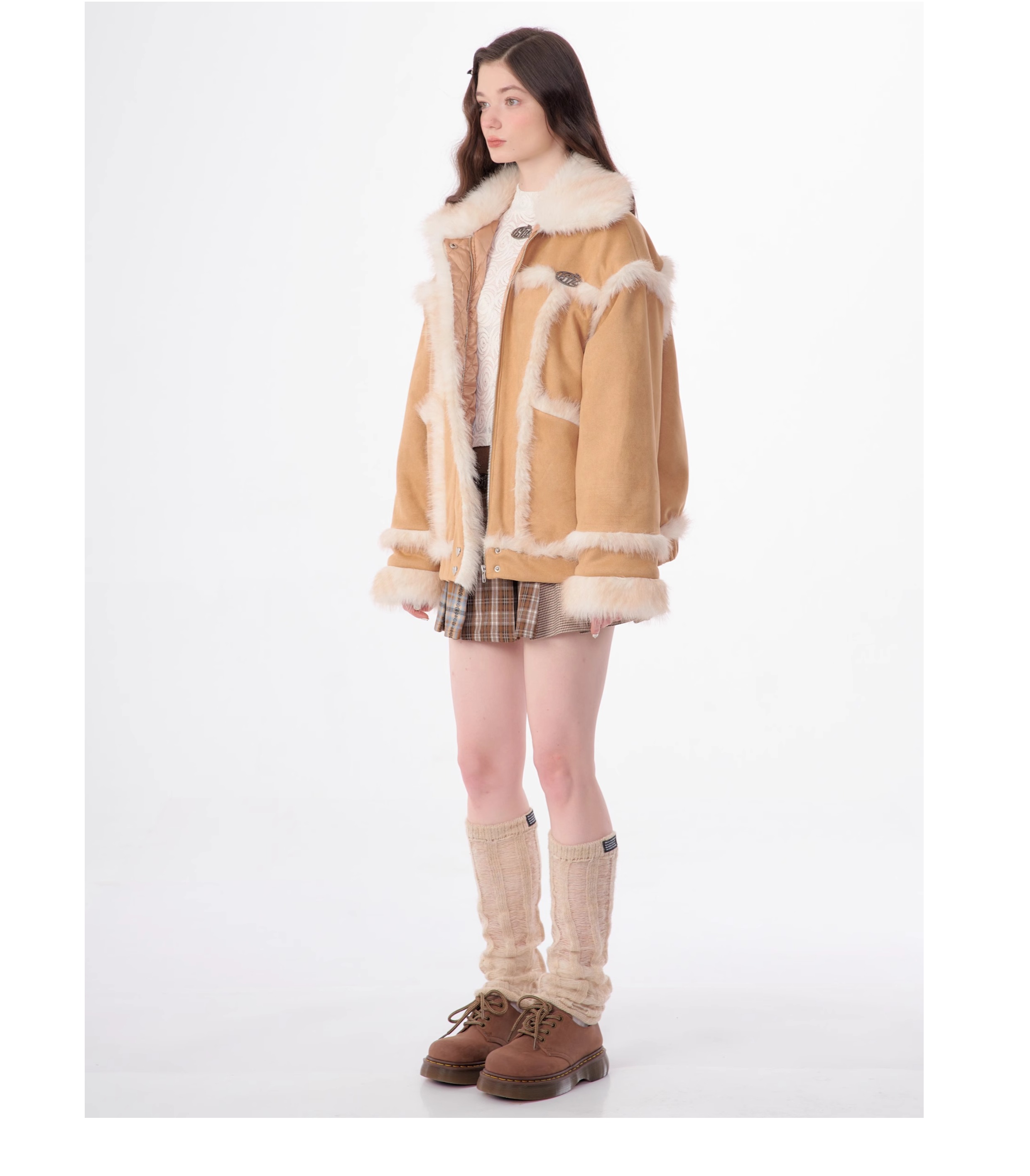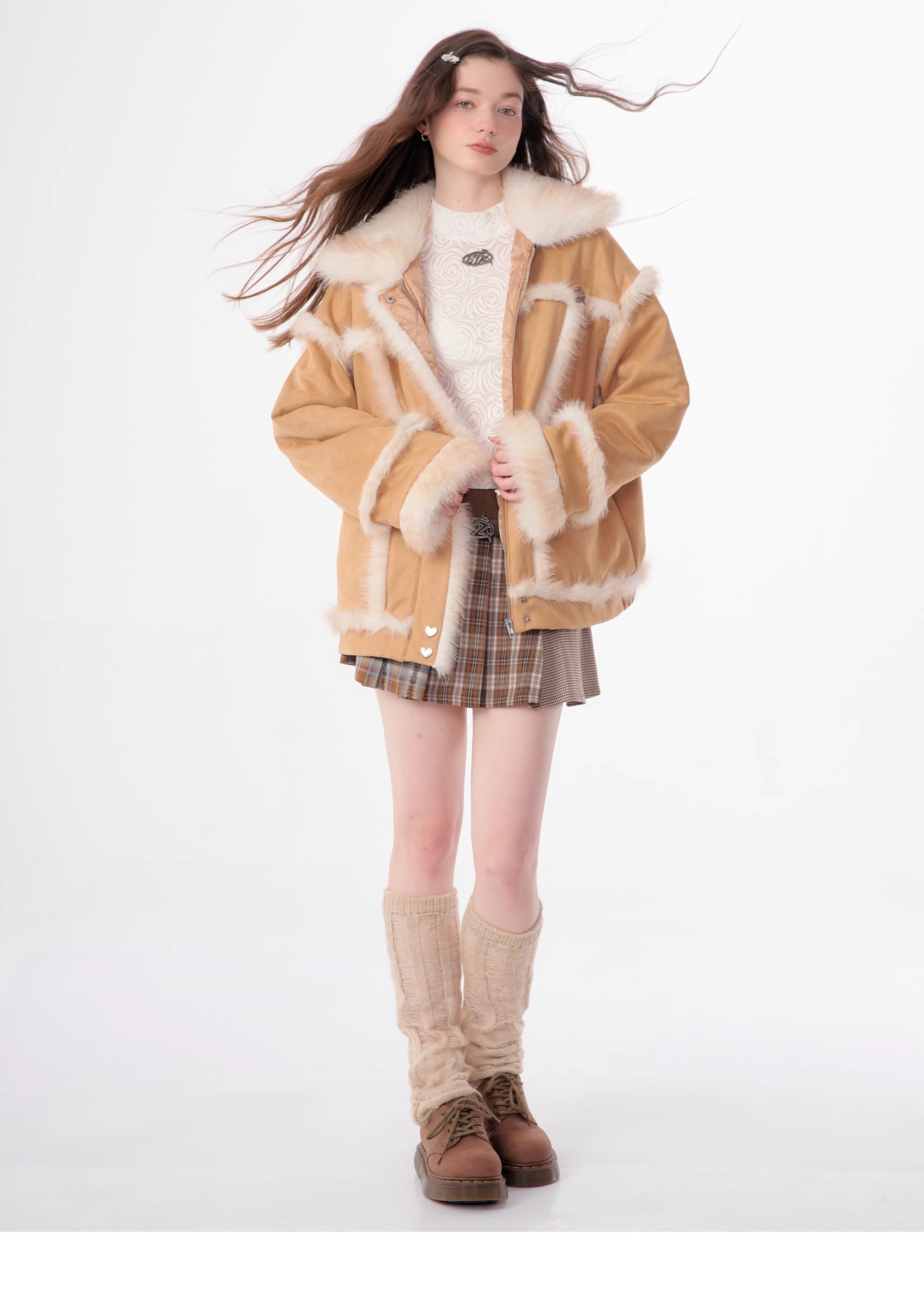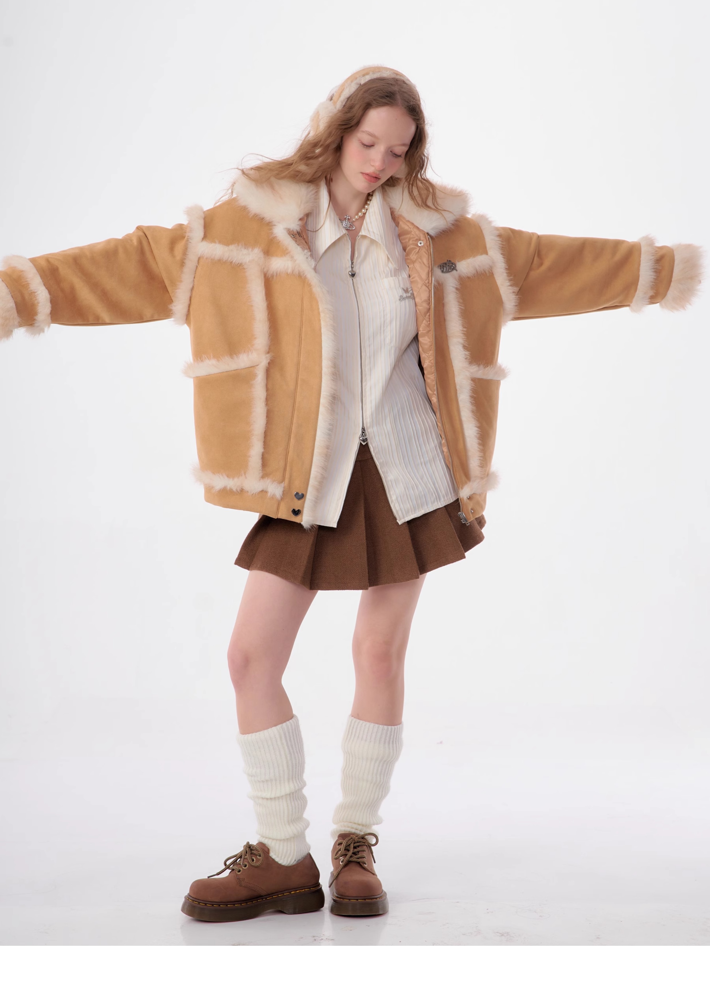 Fur Splicing Suede Coat | Retro Sheepskin Collar Thick Velvet Design for Autumn/Winter