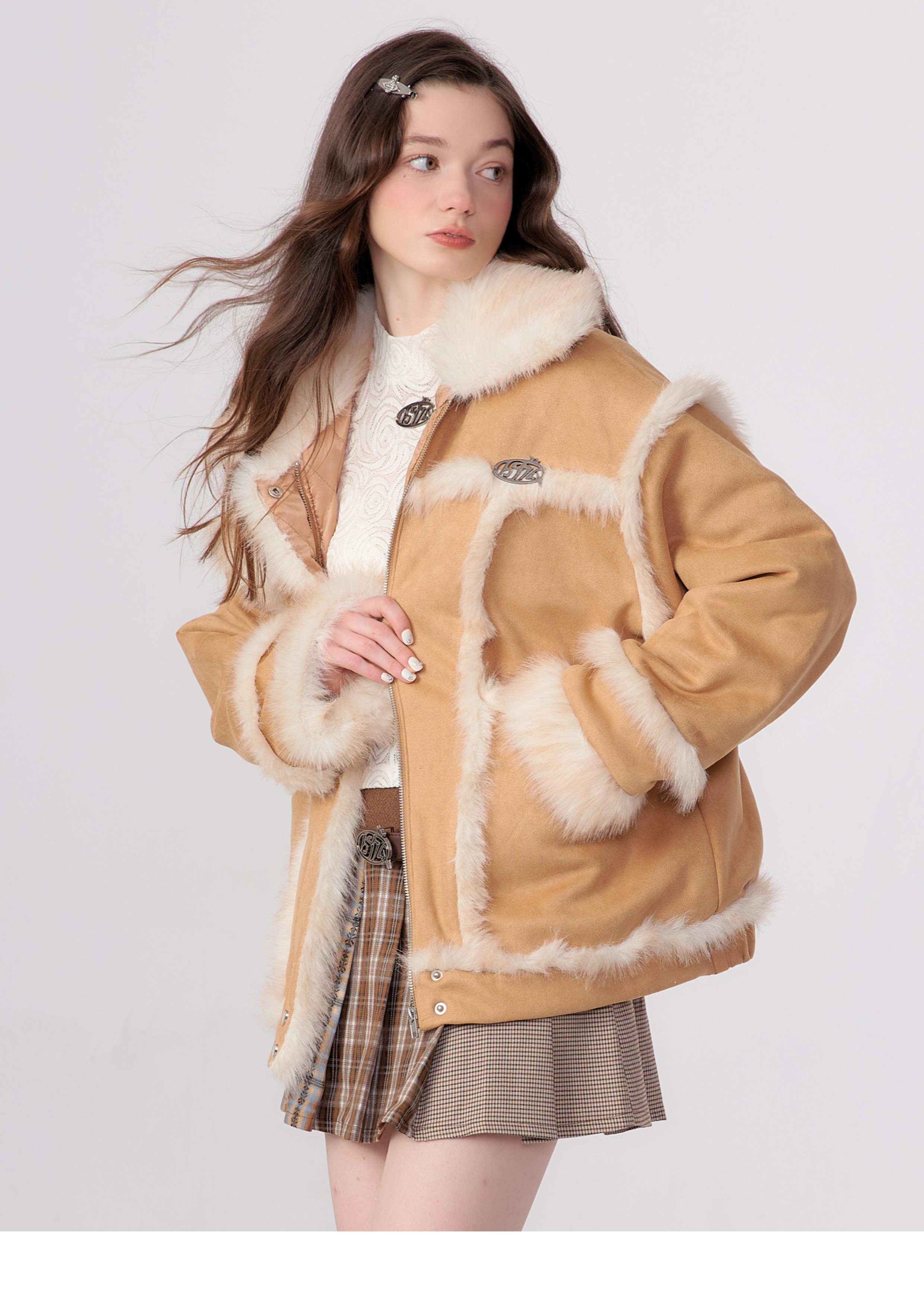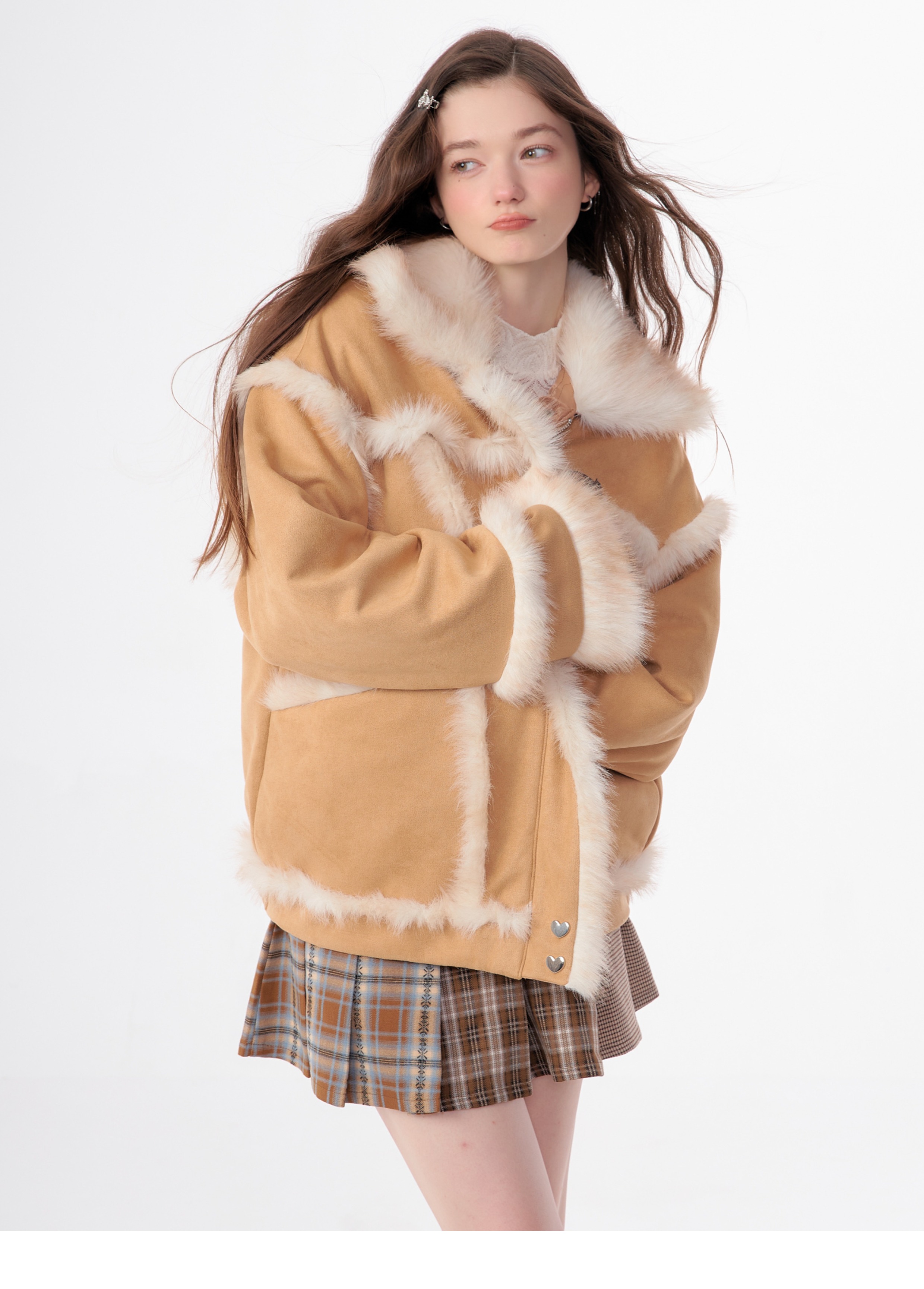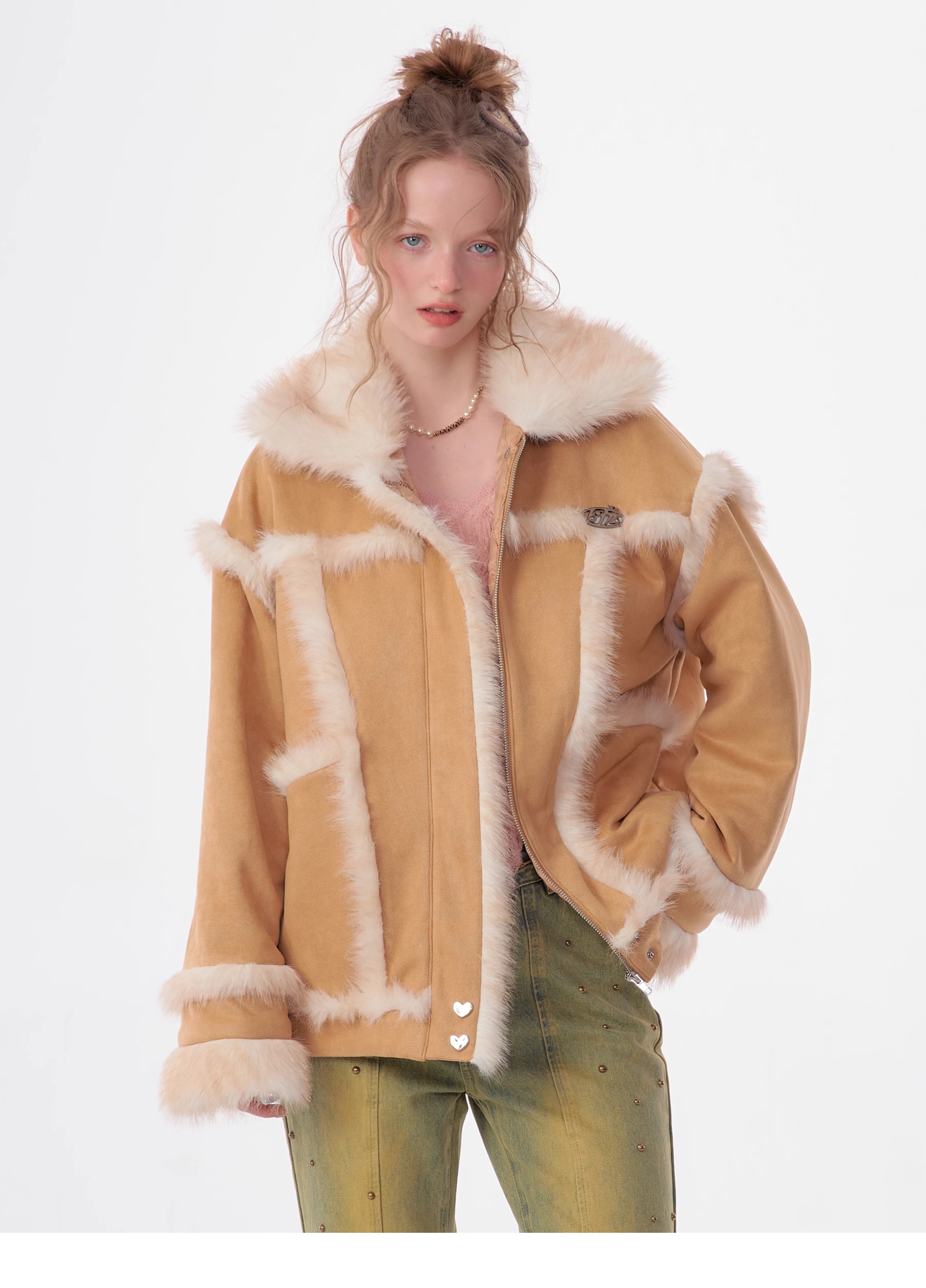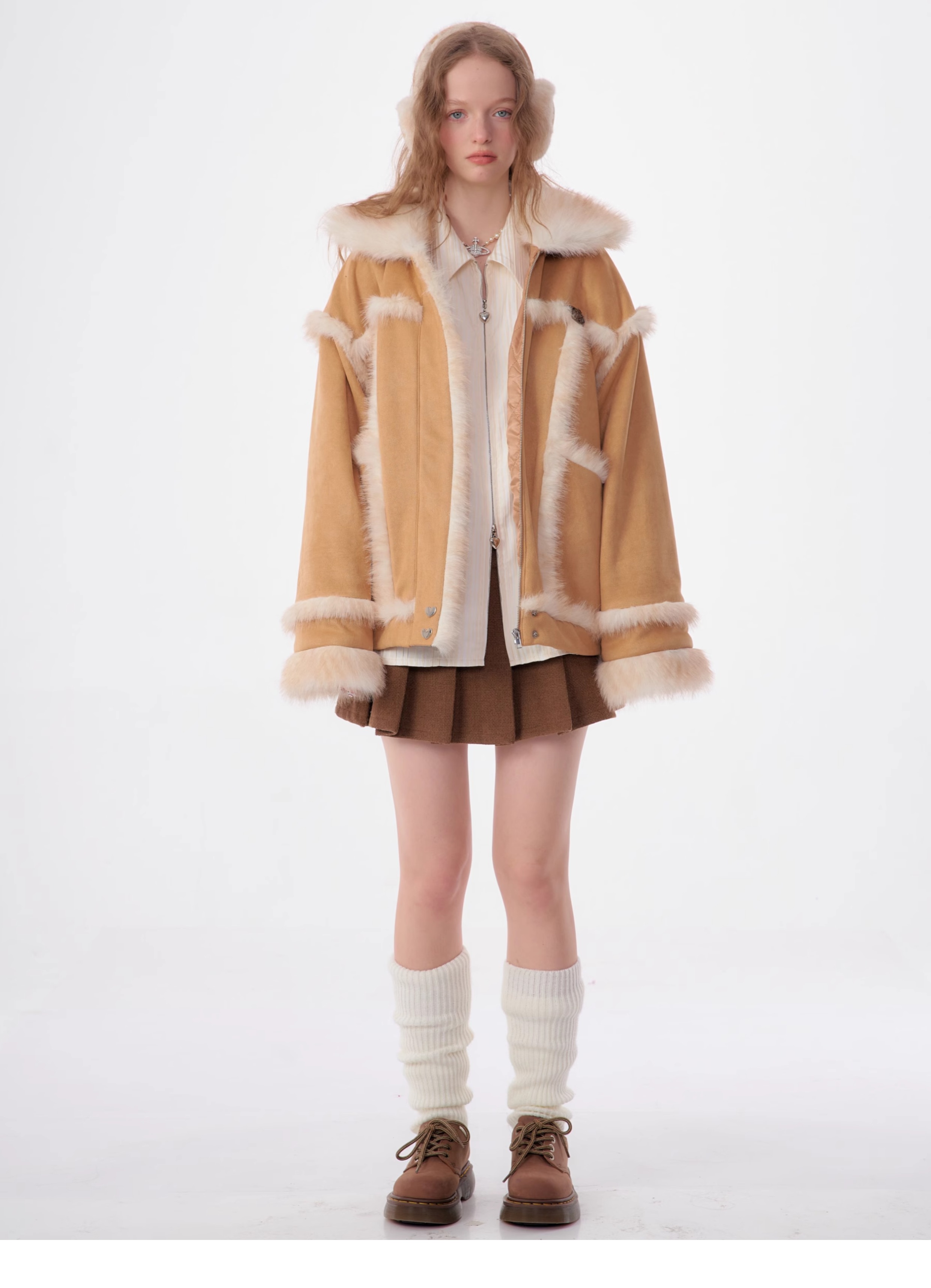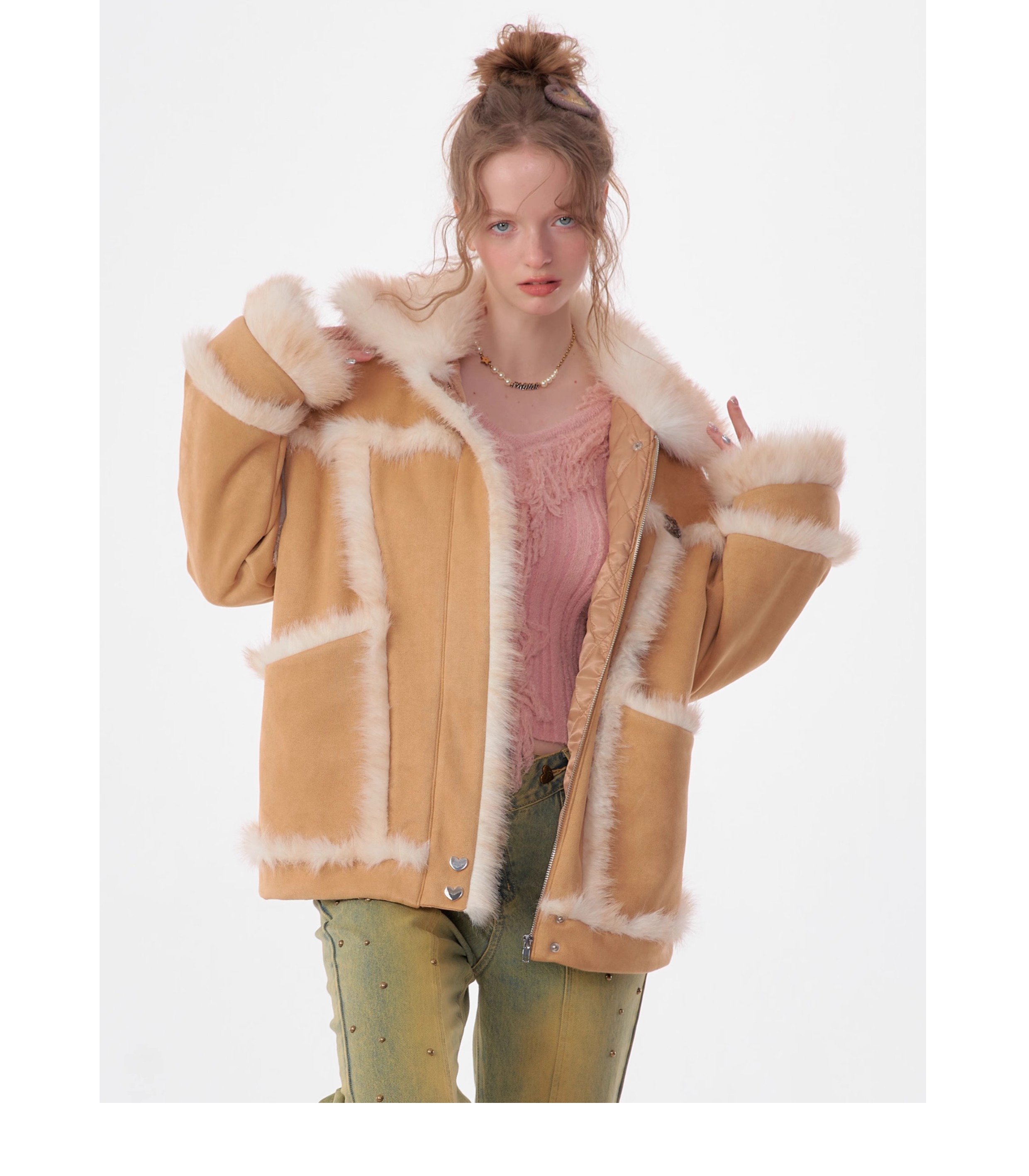 Fur Splicing Suede Coat | Retro Sheepskin Collar Thick Velvet Design for Autumn/Winter