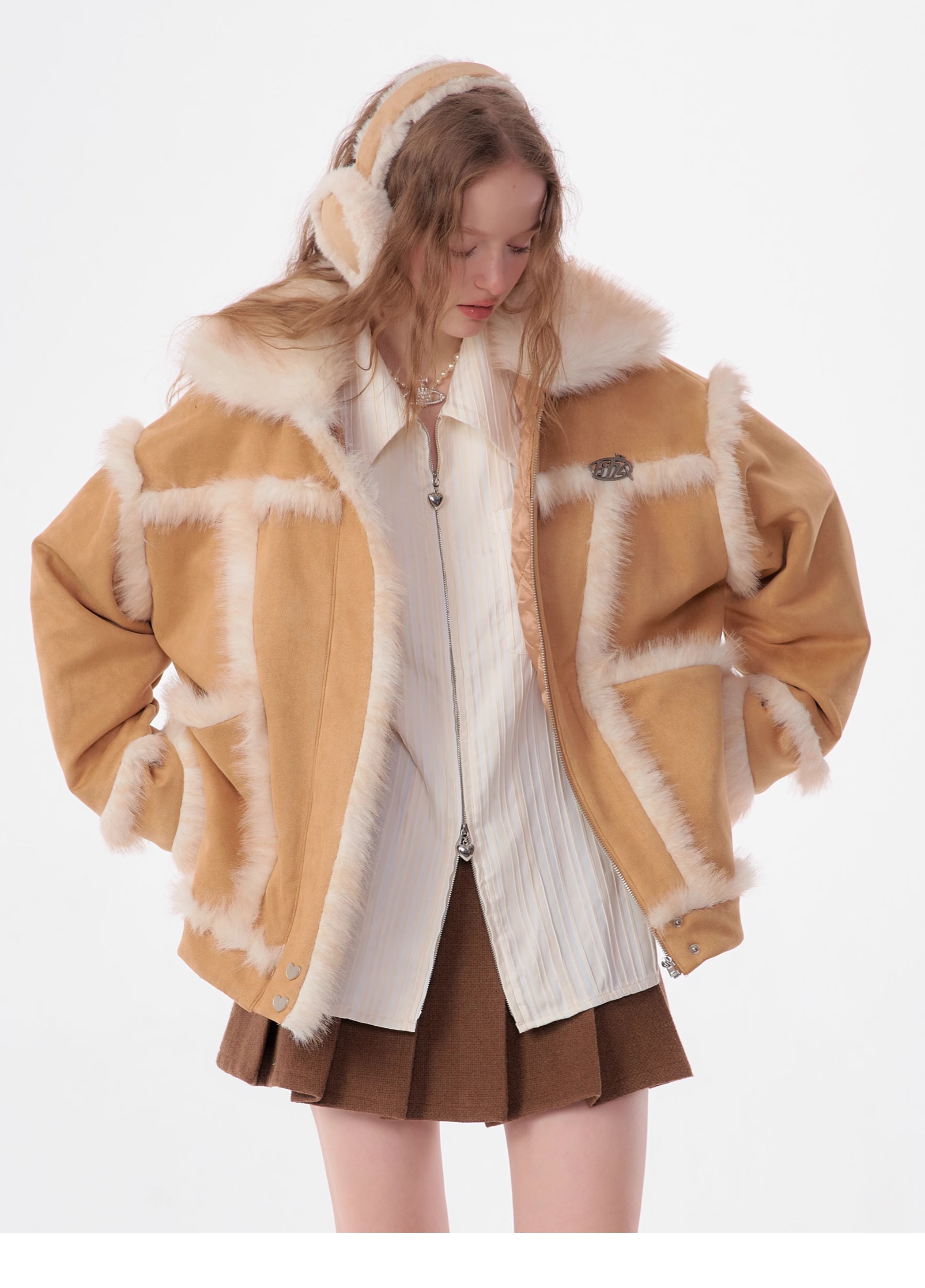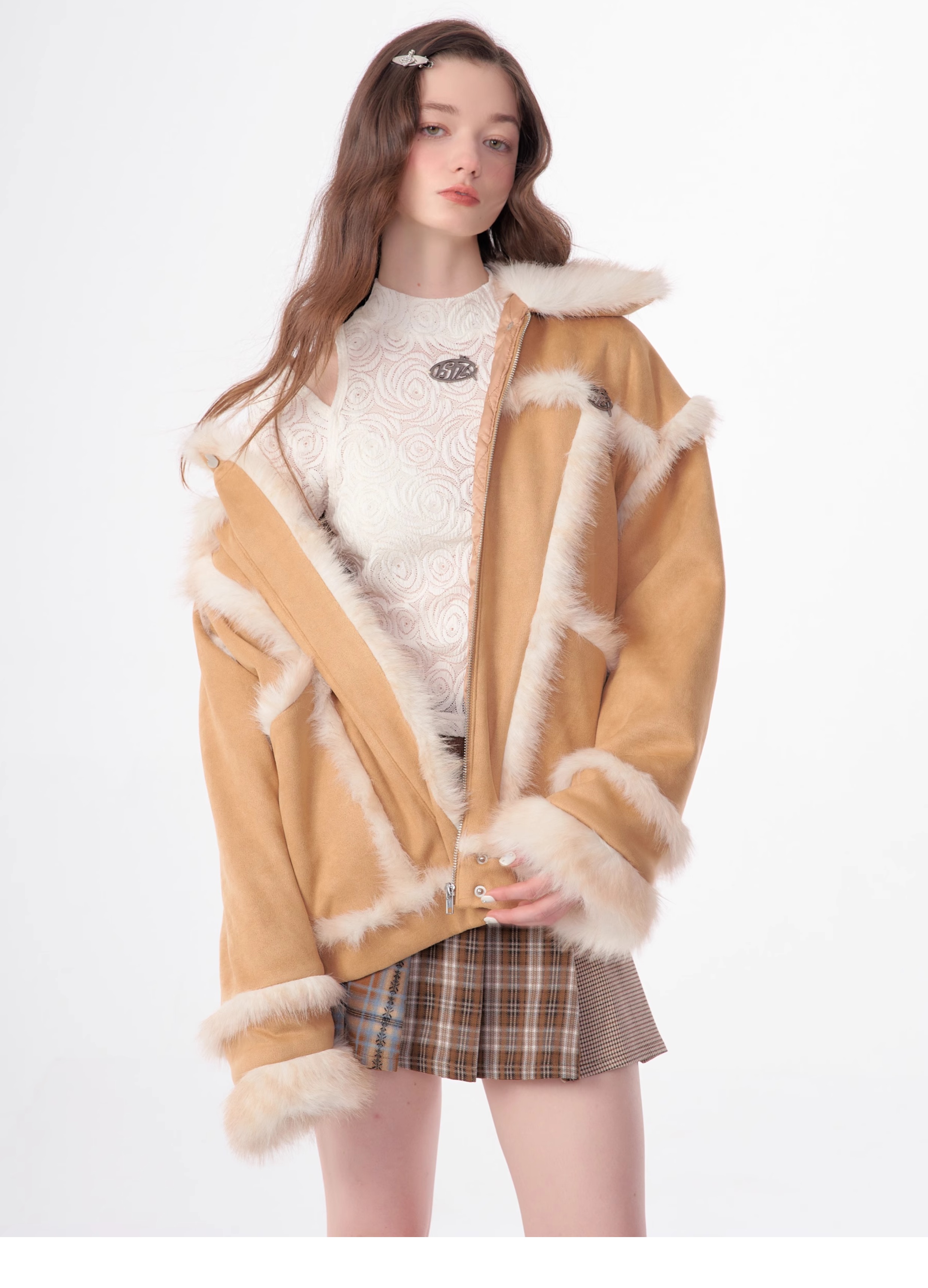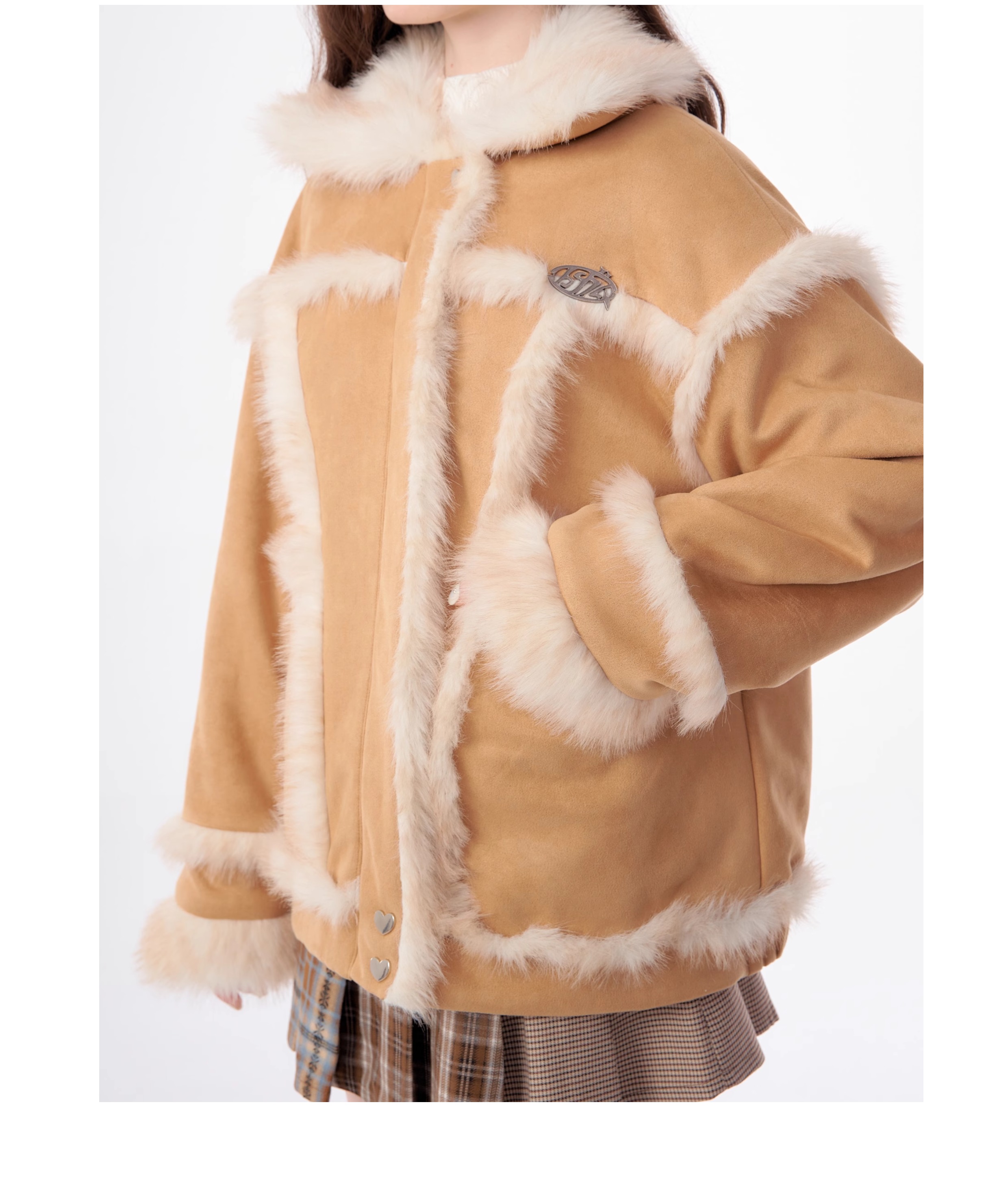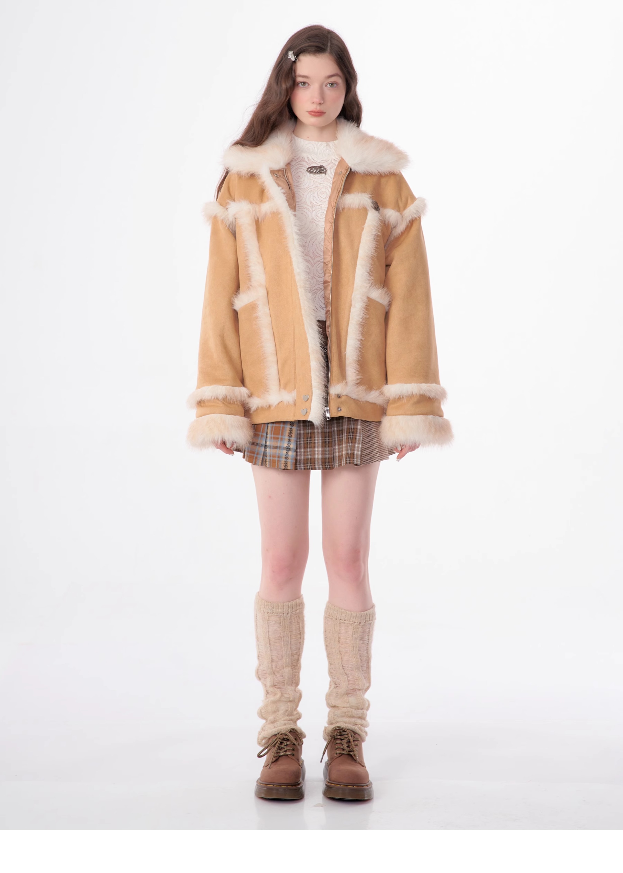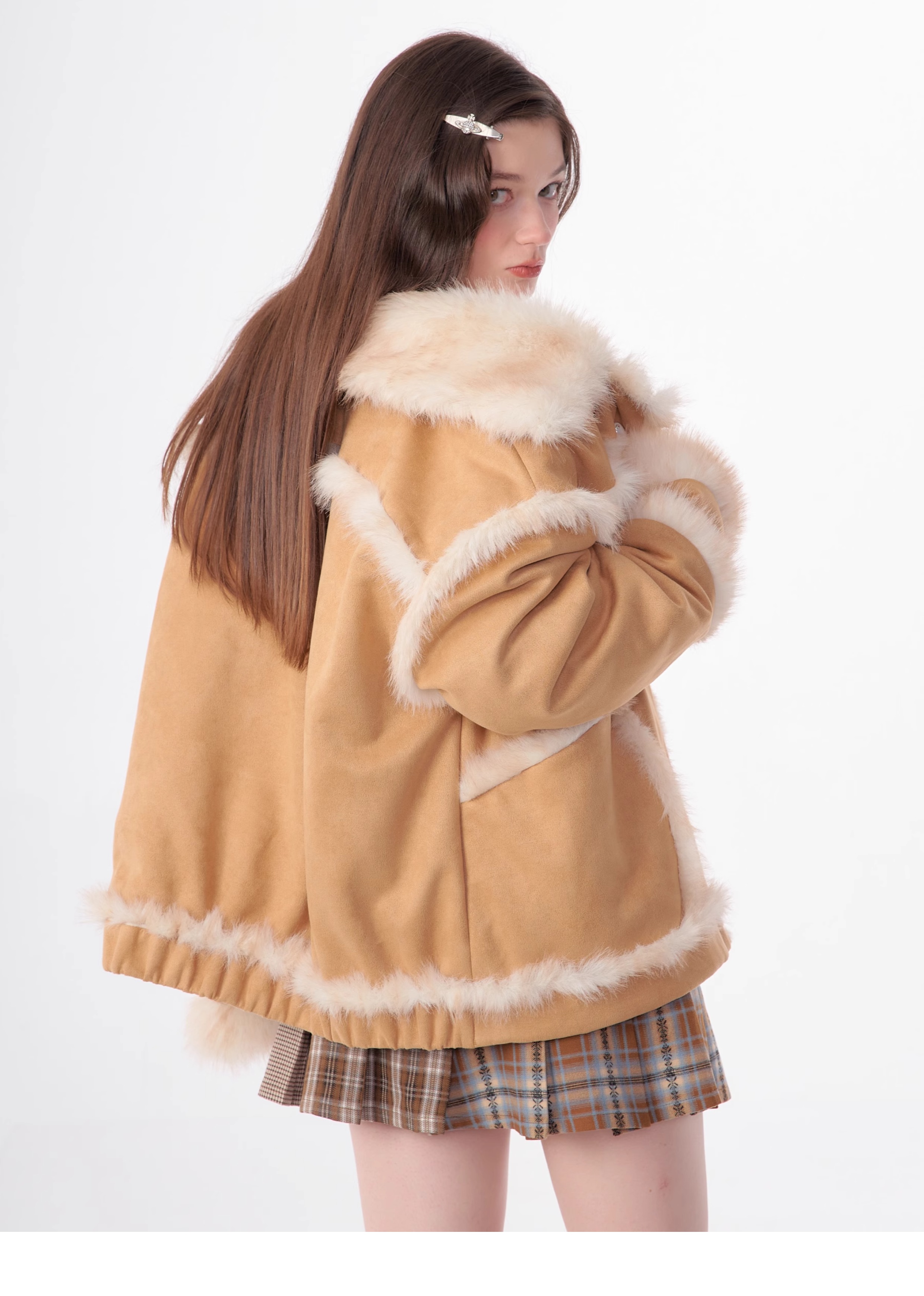 Fur Splicing Suede Coat | Retro Sheepskin Collar Thick Velvet Design for Autumn/Winter