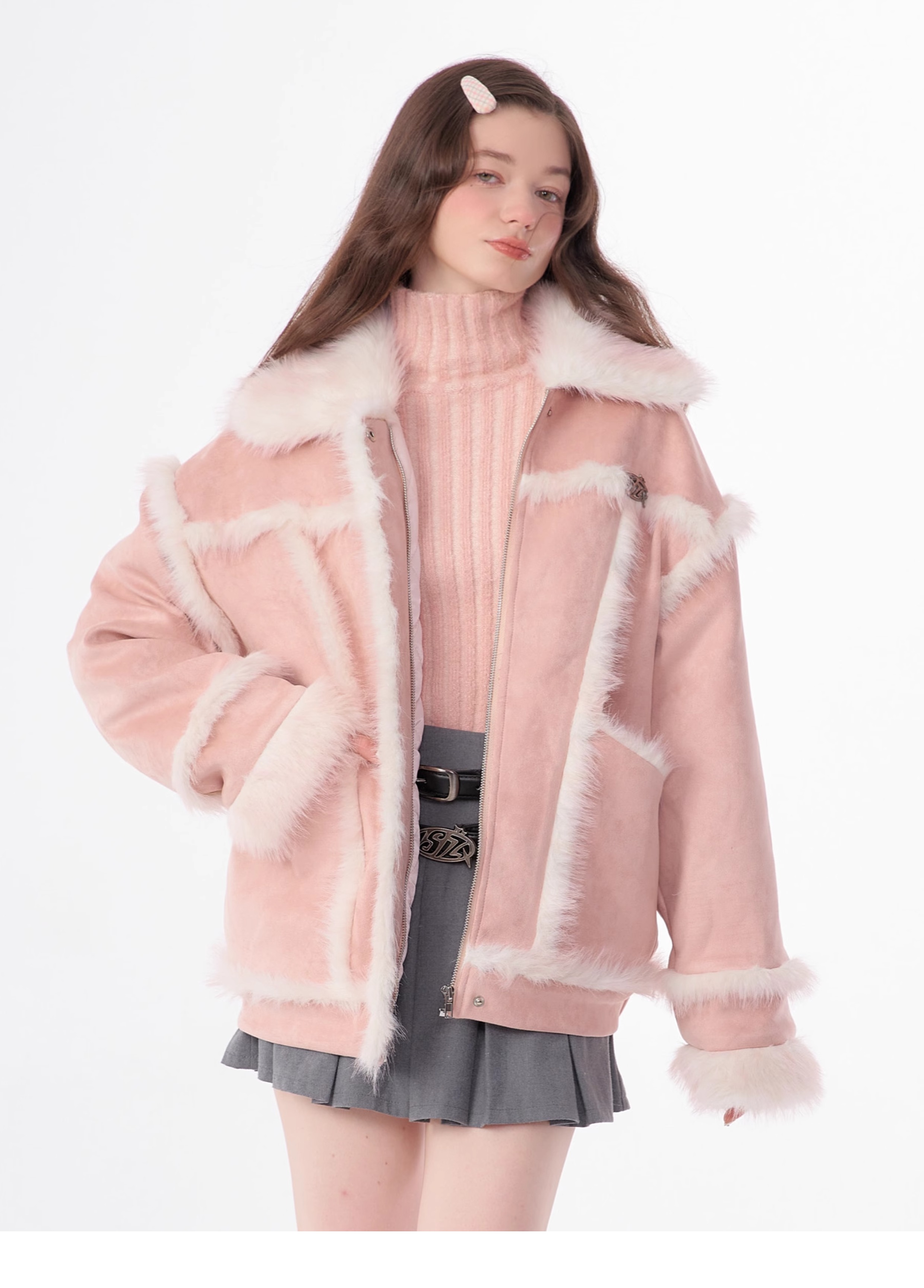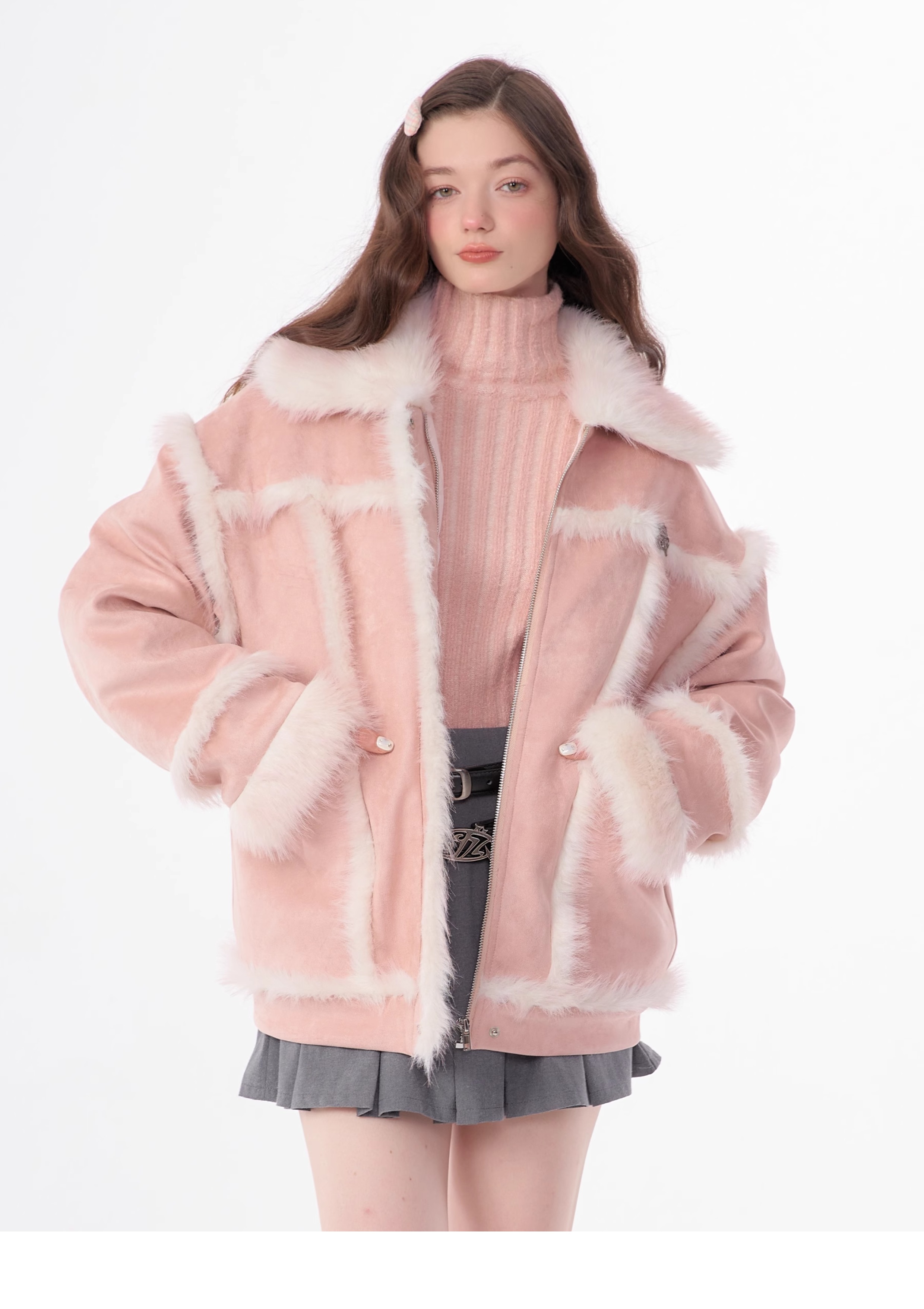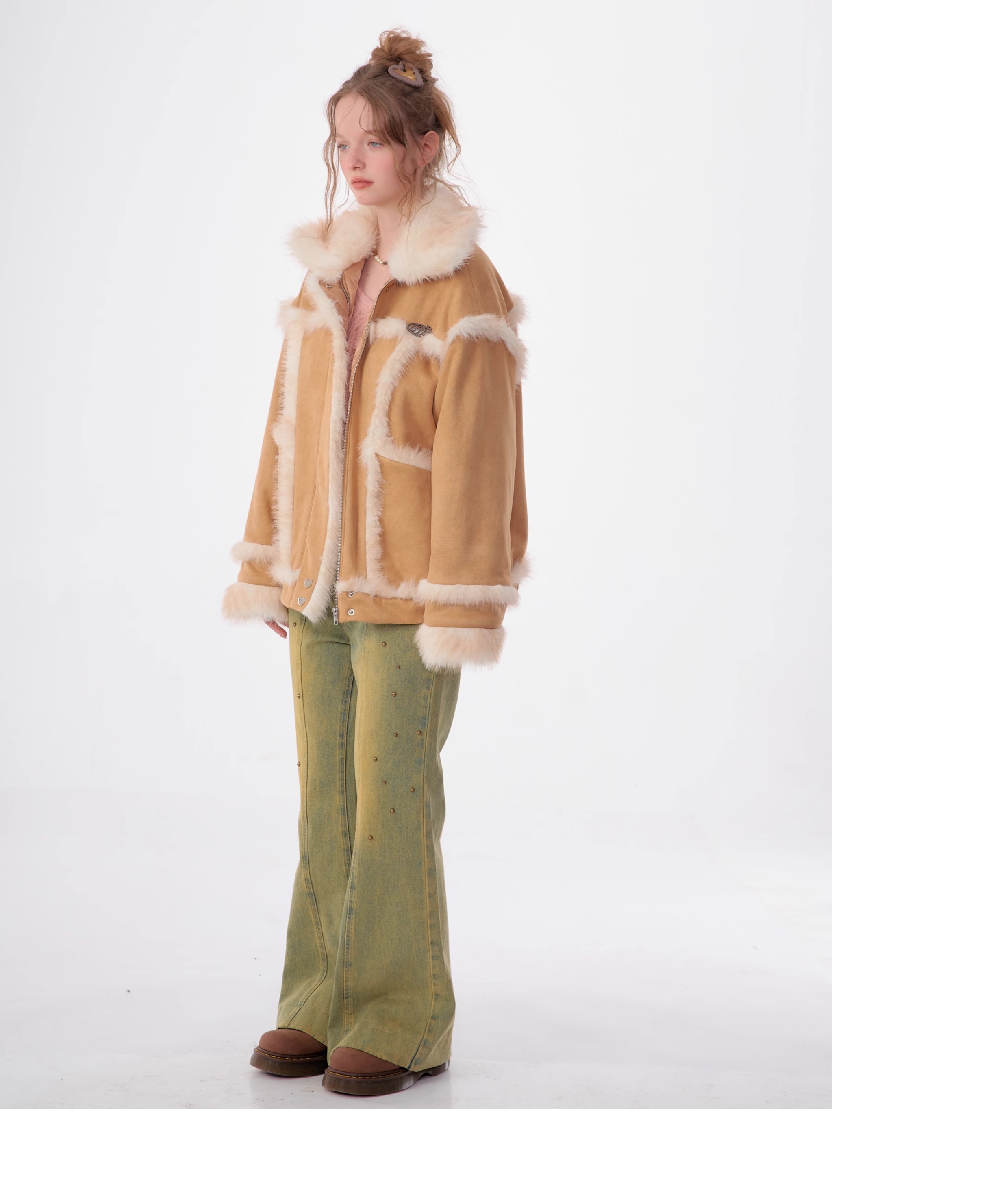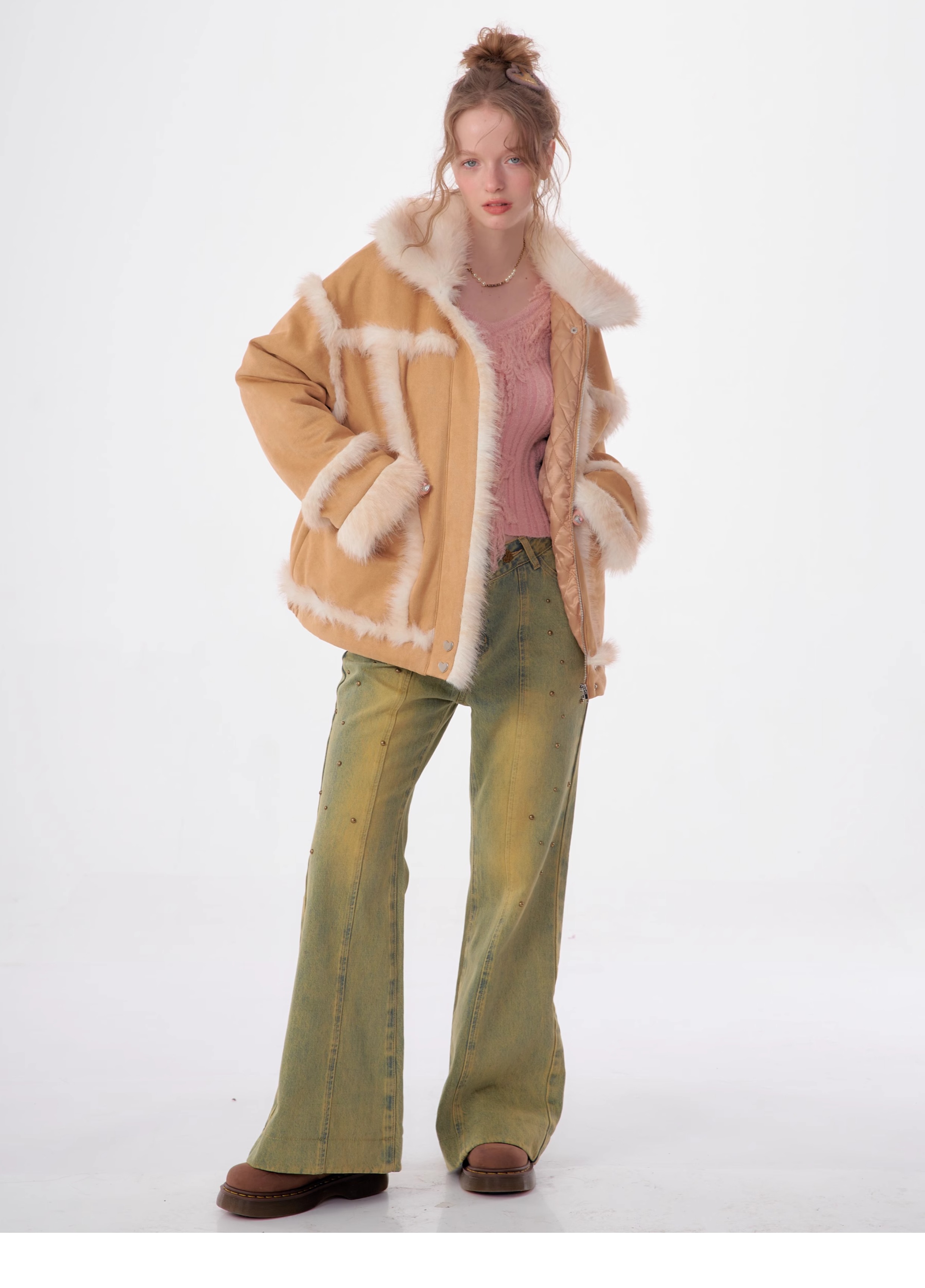 Fur Splicing Suede Coat | Retro Sheepskin Collar Thick Velvet Design for Autumn/Winter