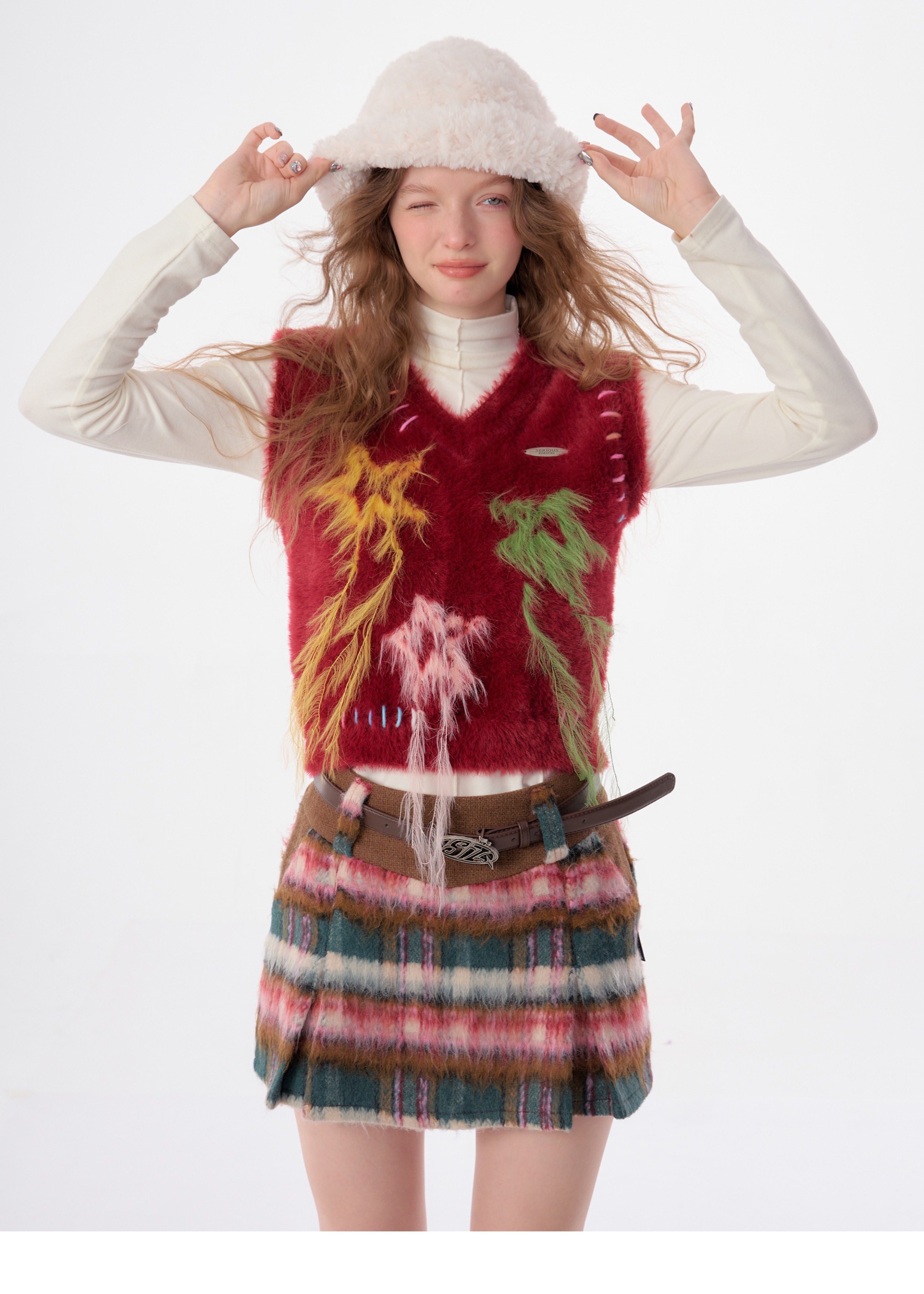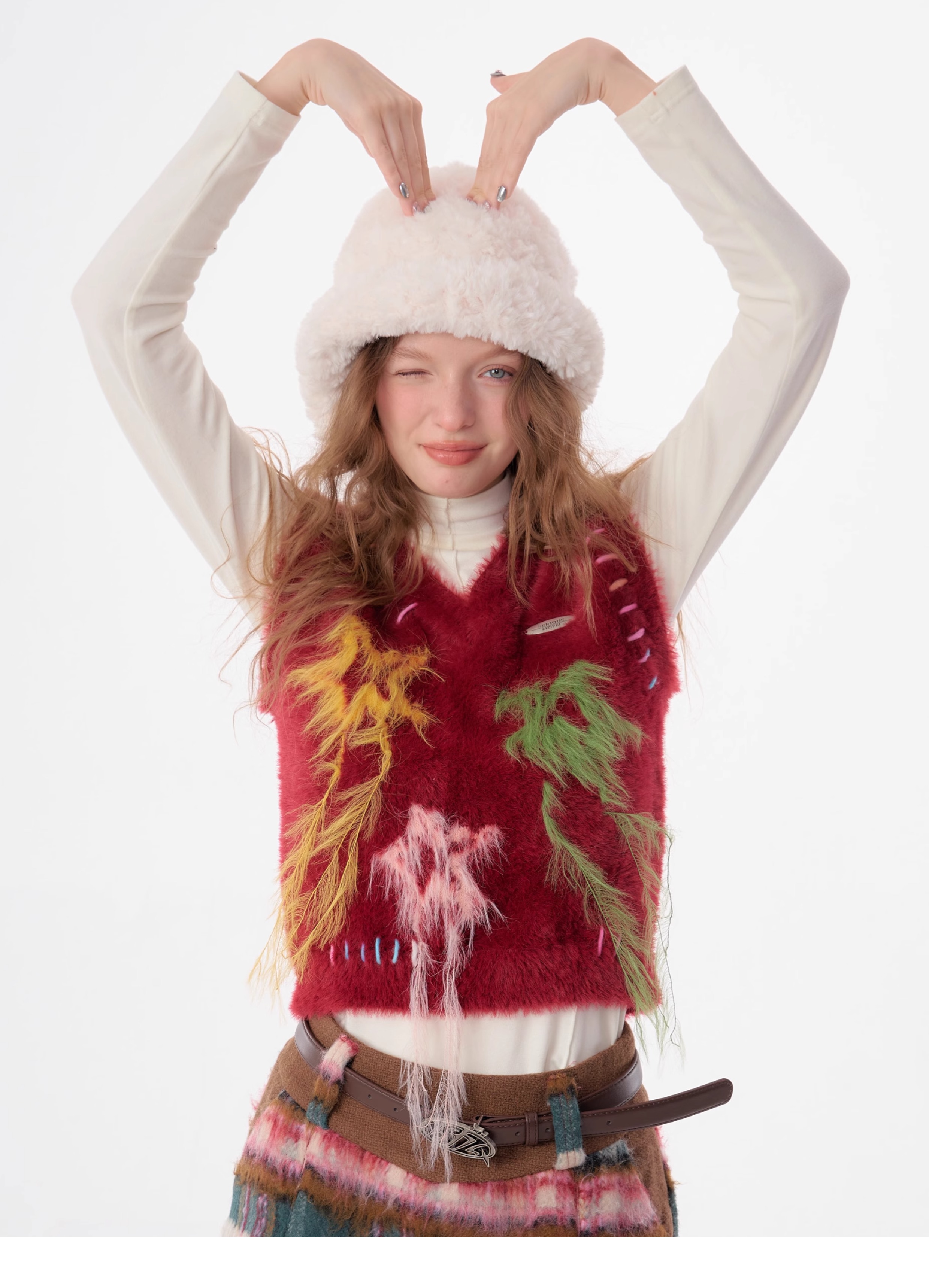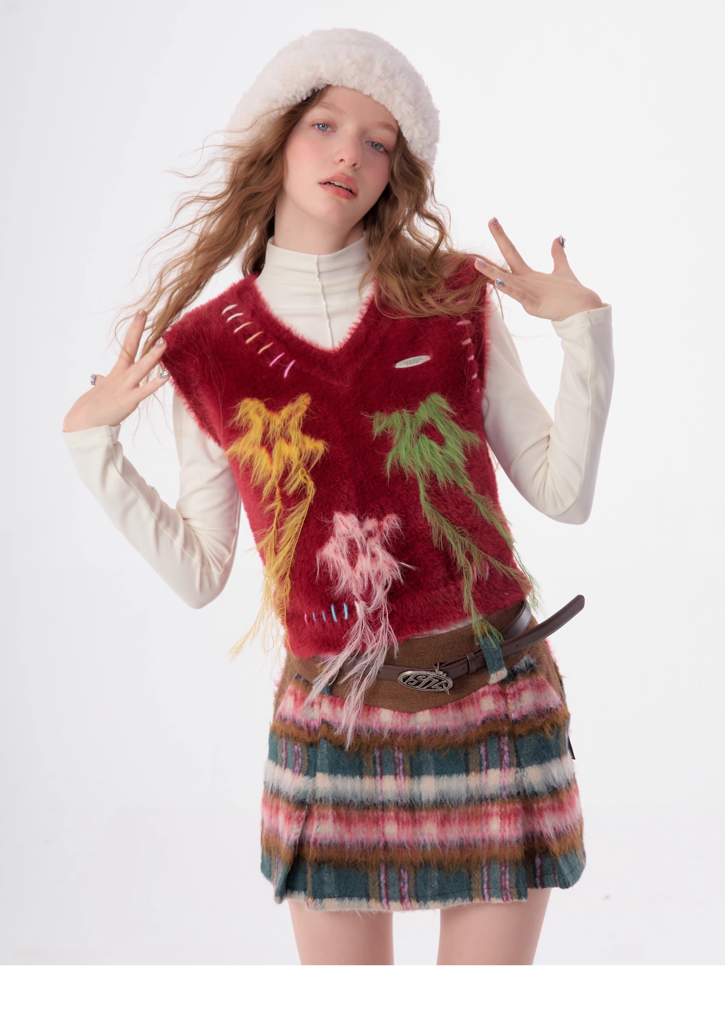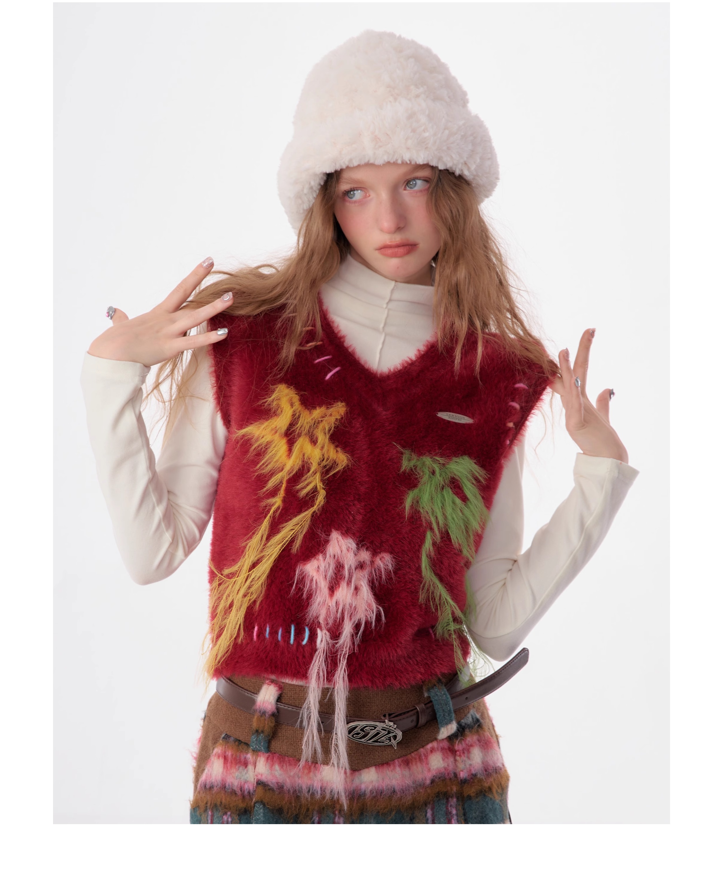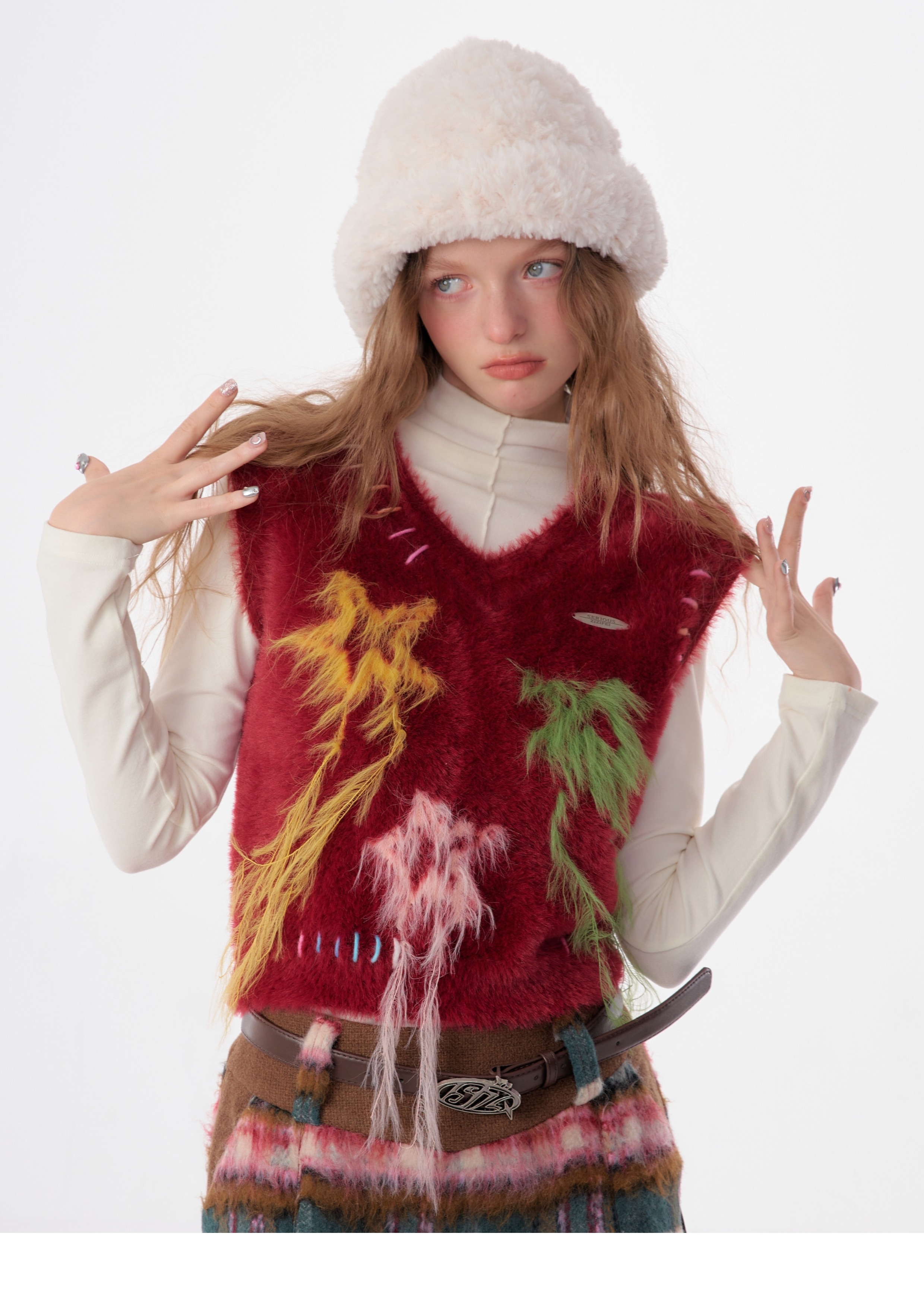 Tassel Star V-neck Sweater Vest | Red Christmas Design for Autumn/Winter