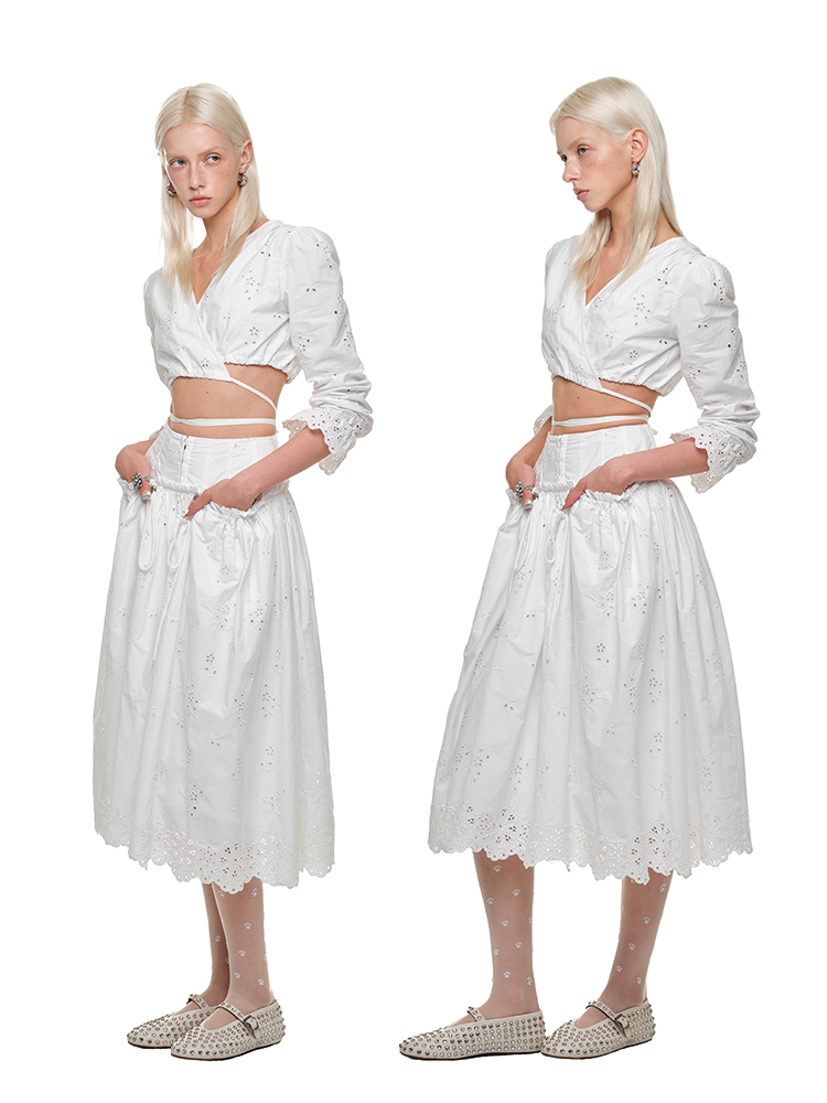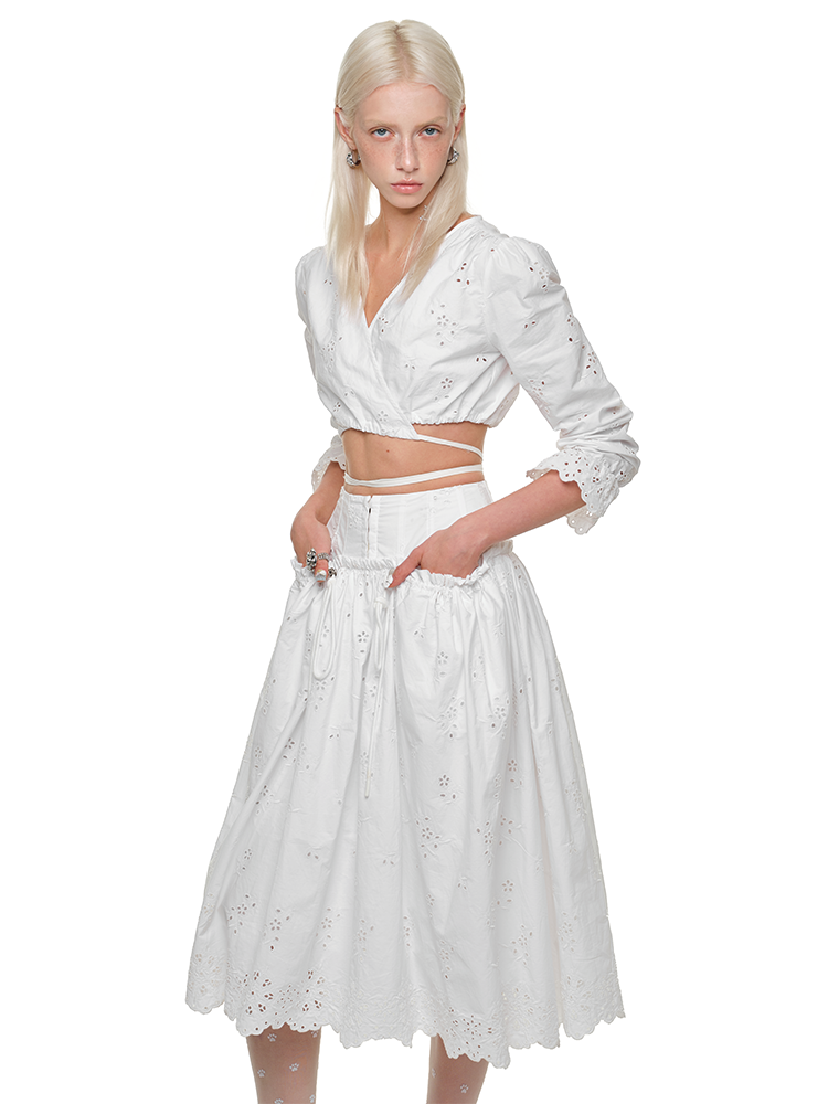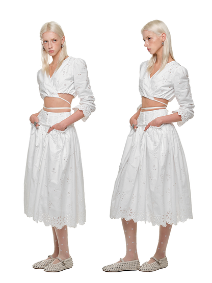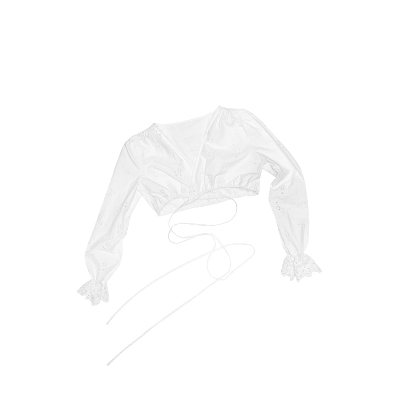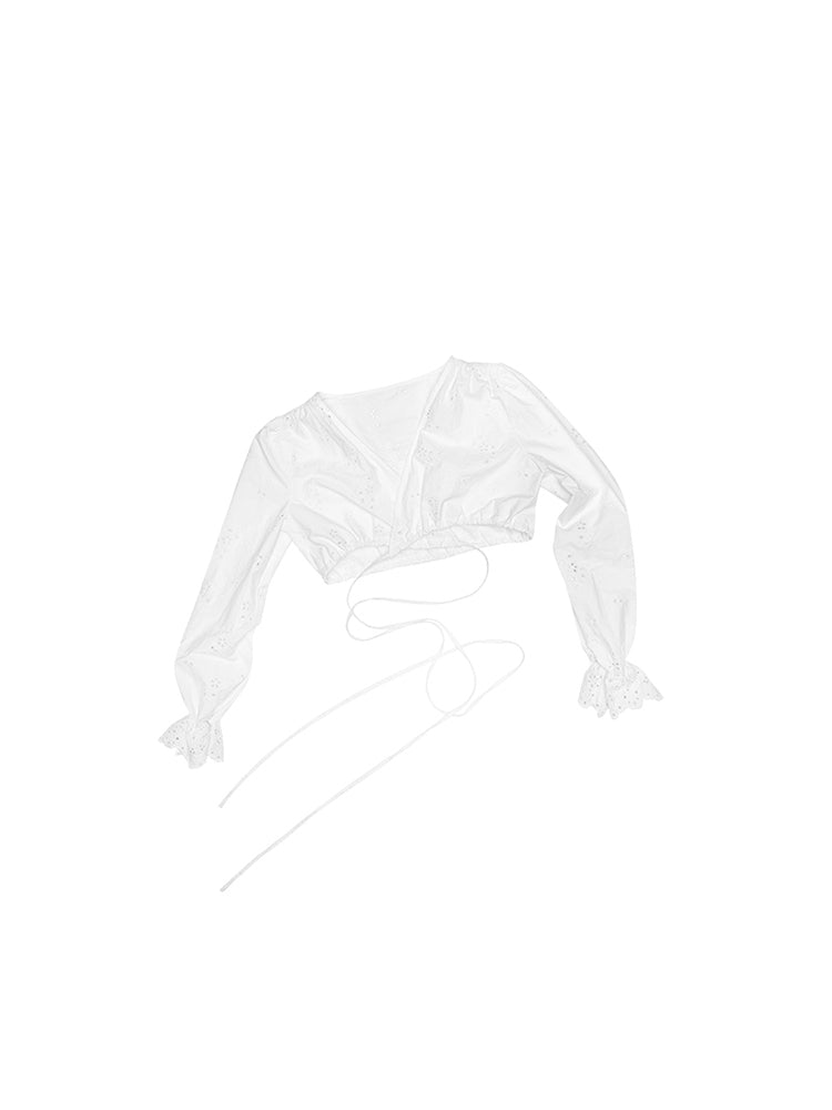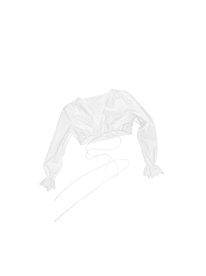 Mini Cut-Out Jacquard Blouse – Puff Sleeve Lace-Up V-Neck Shirt