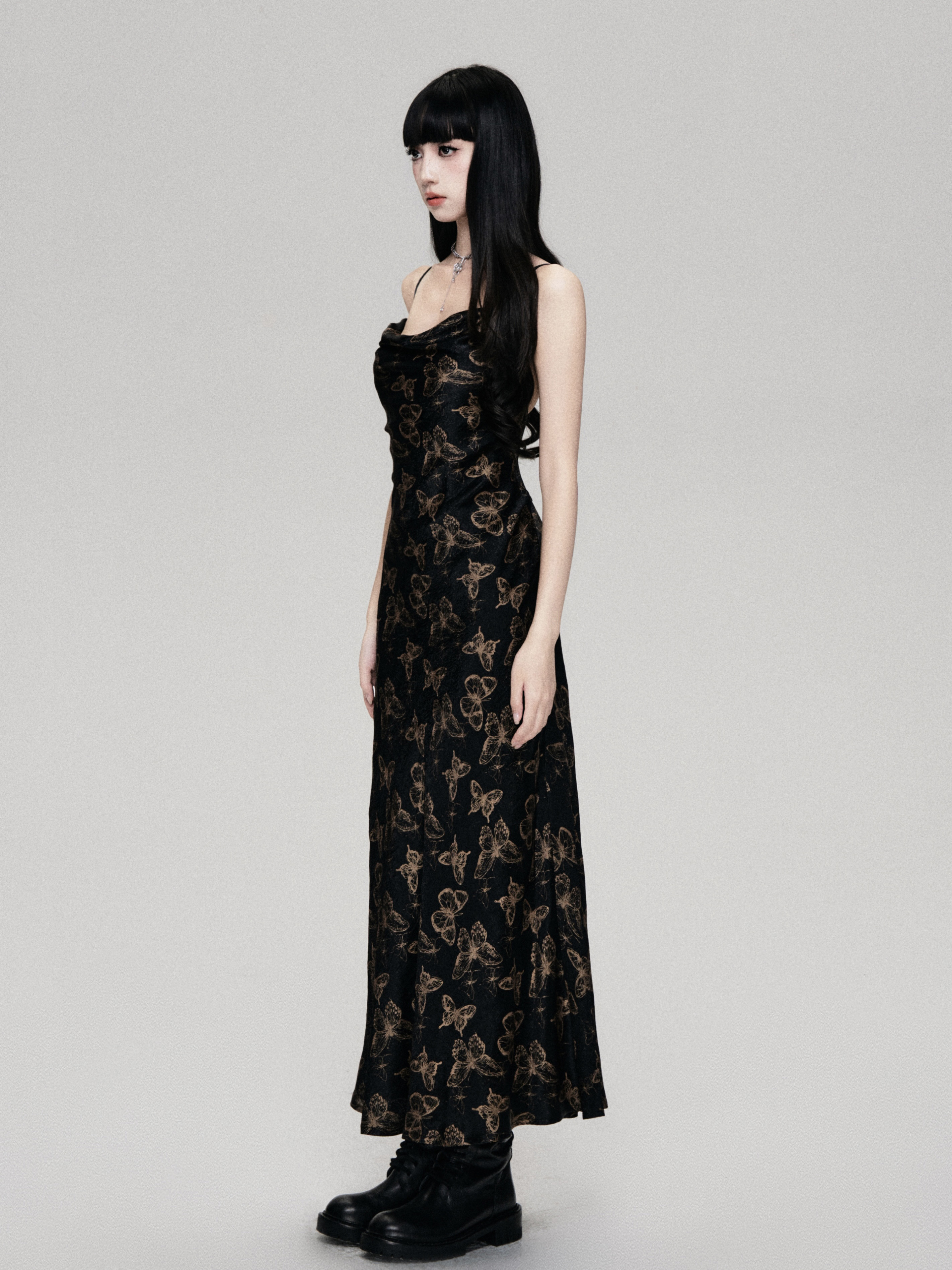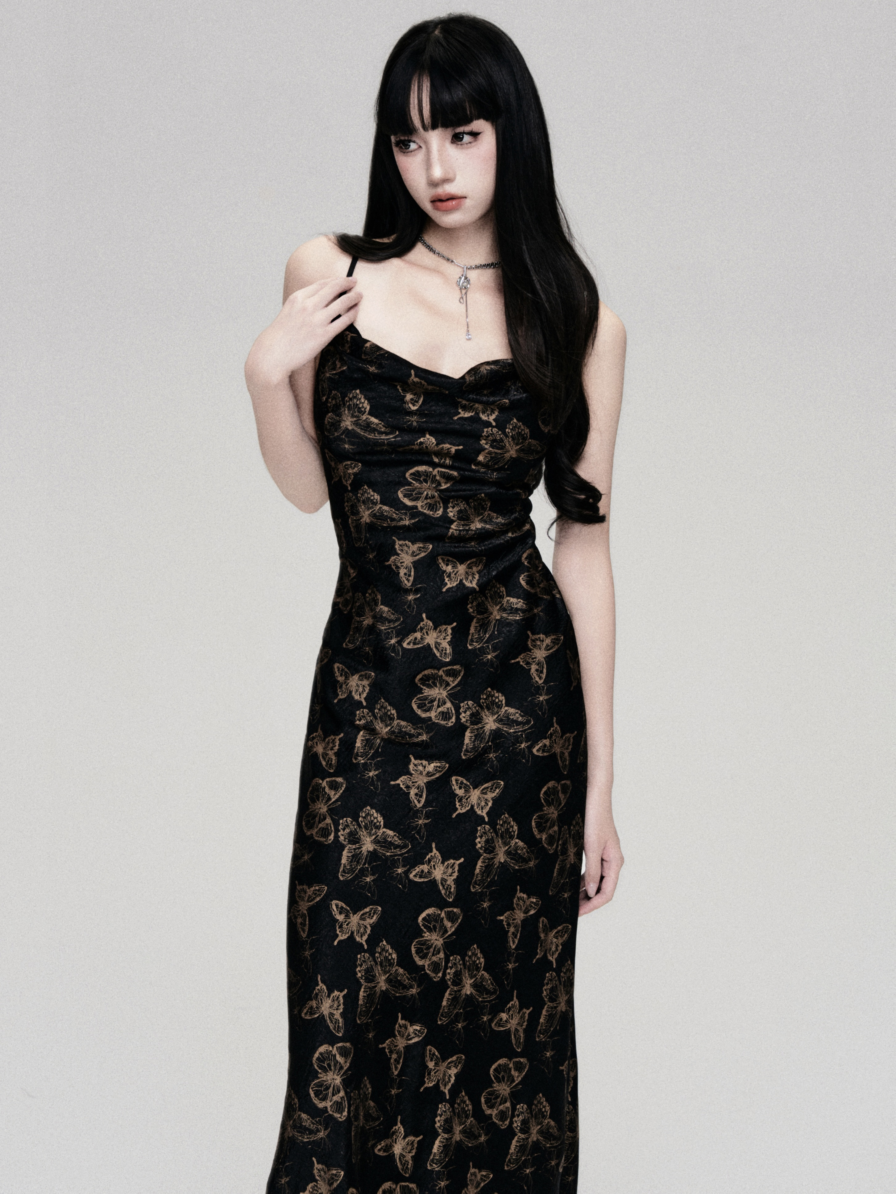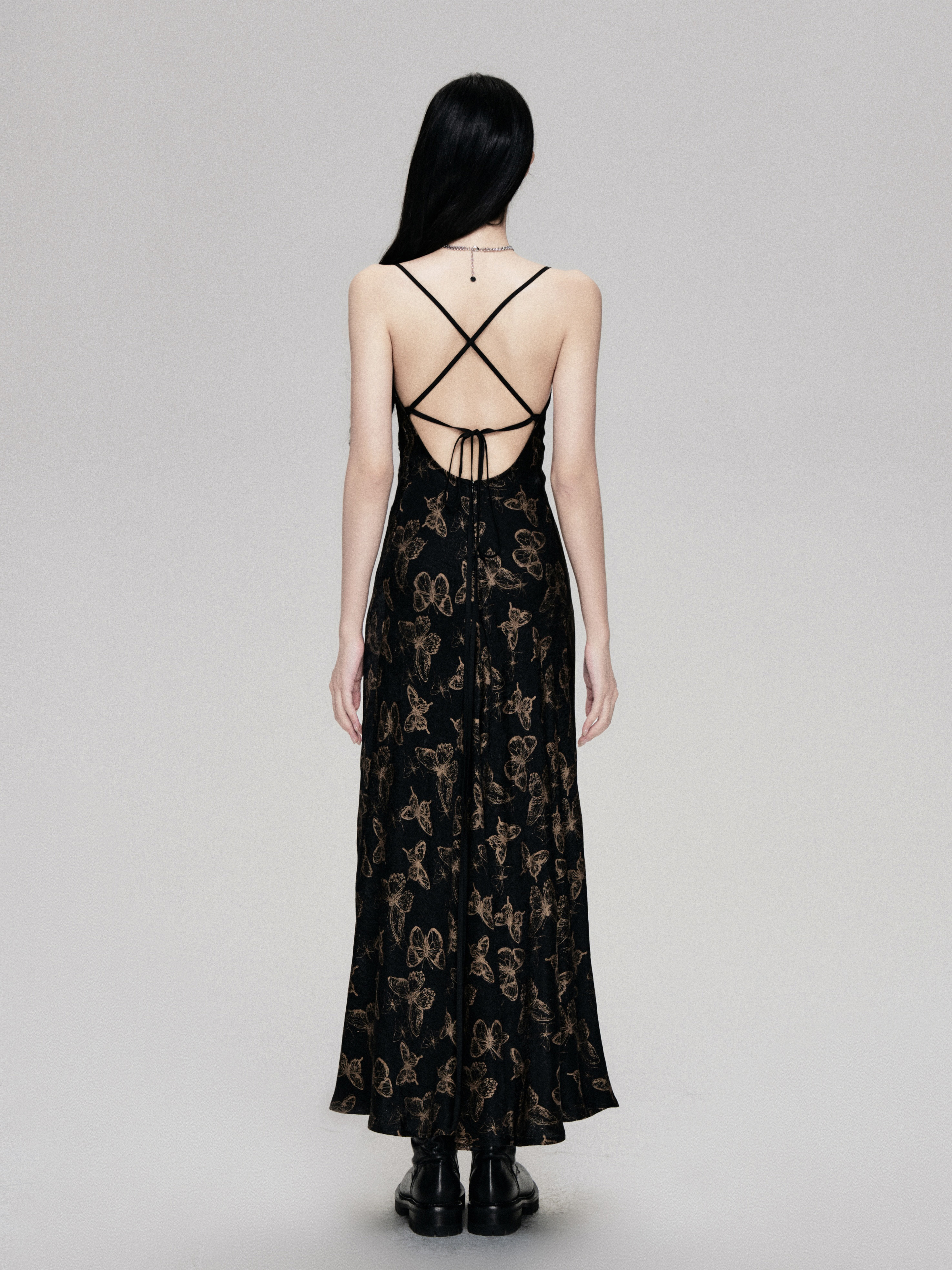 Foil Butterfly Swing Collar Tie Back Slim Slip Dress