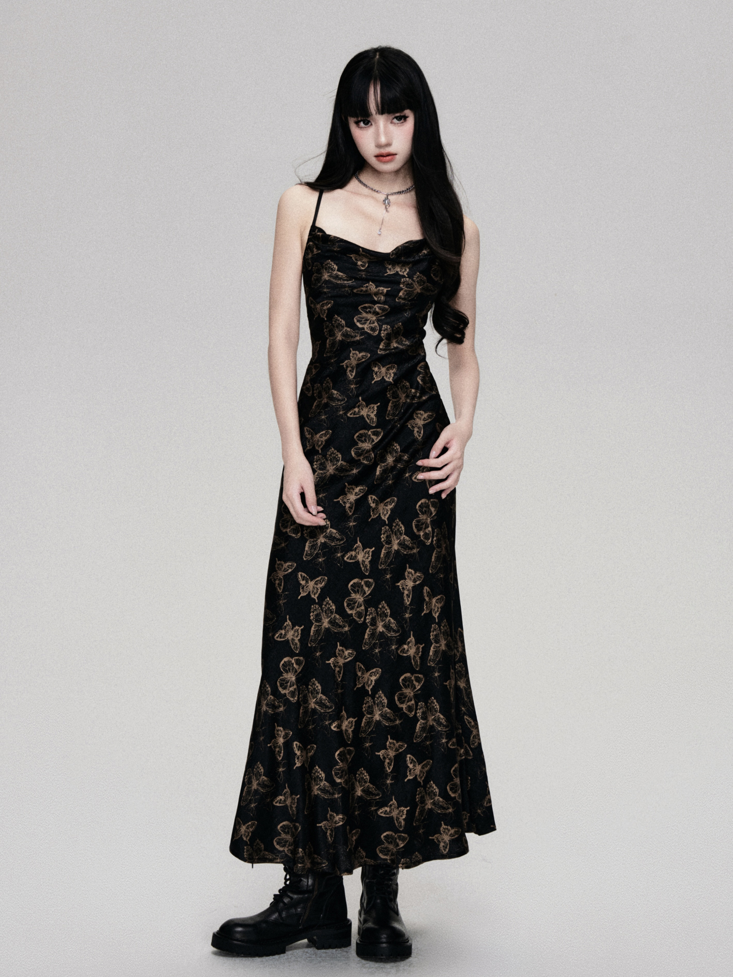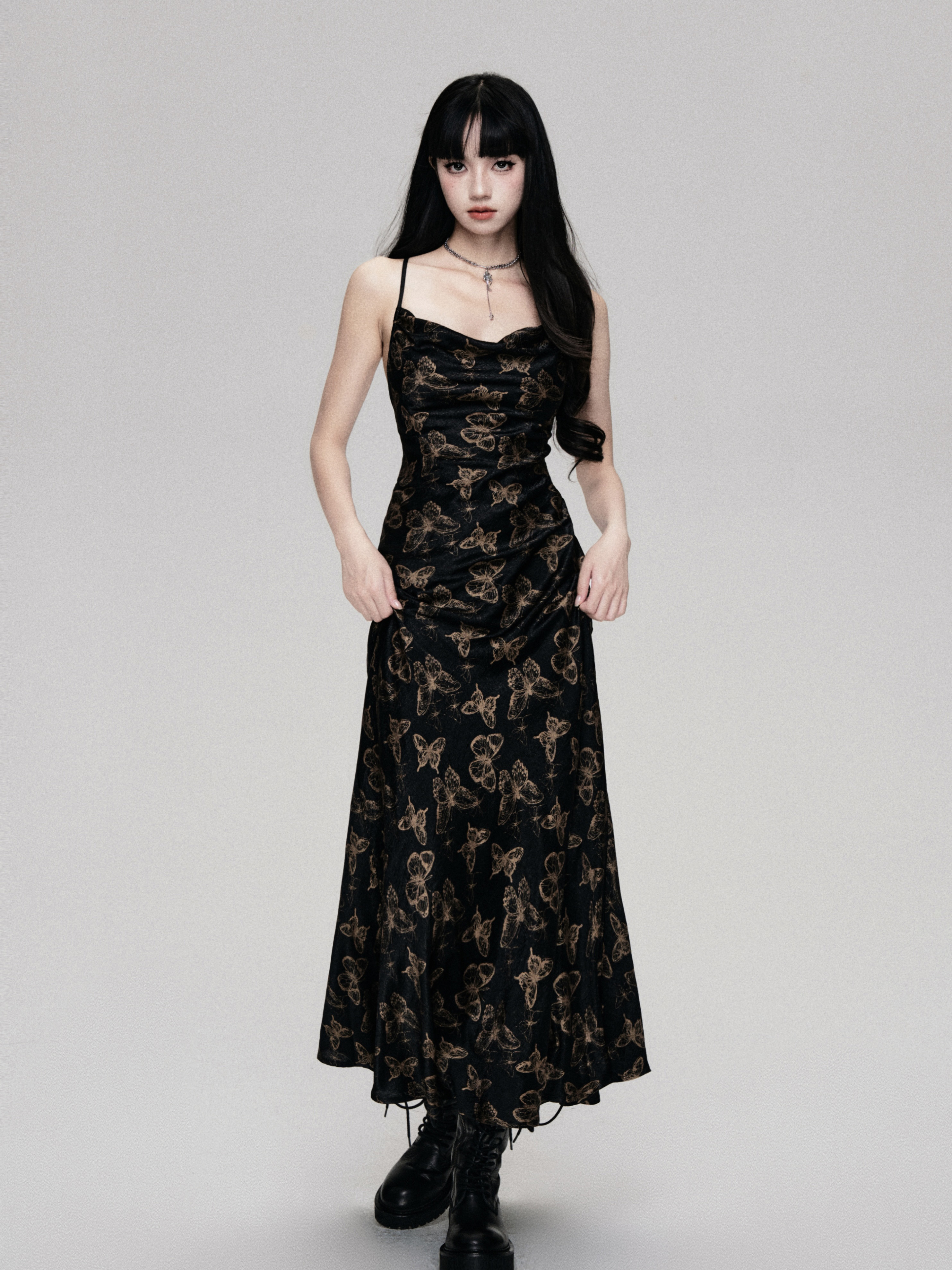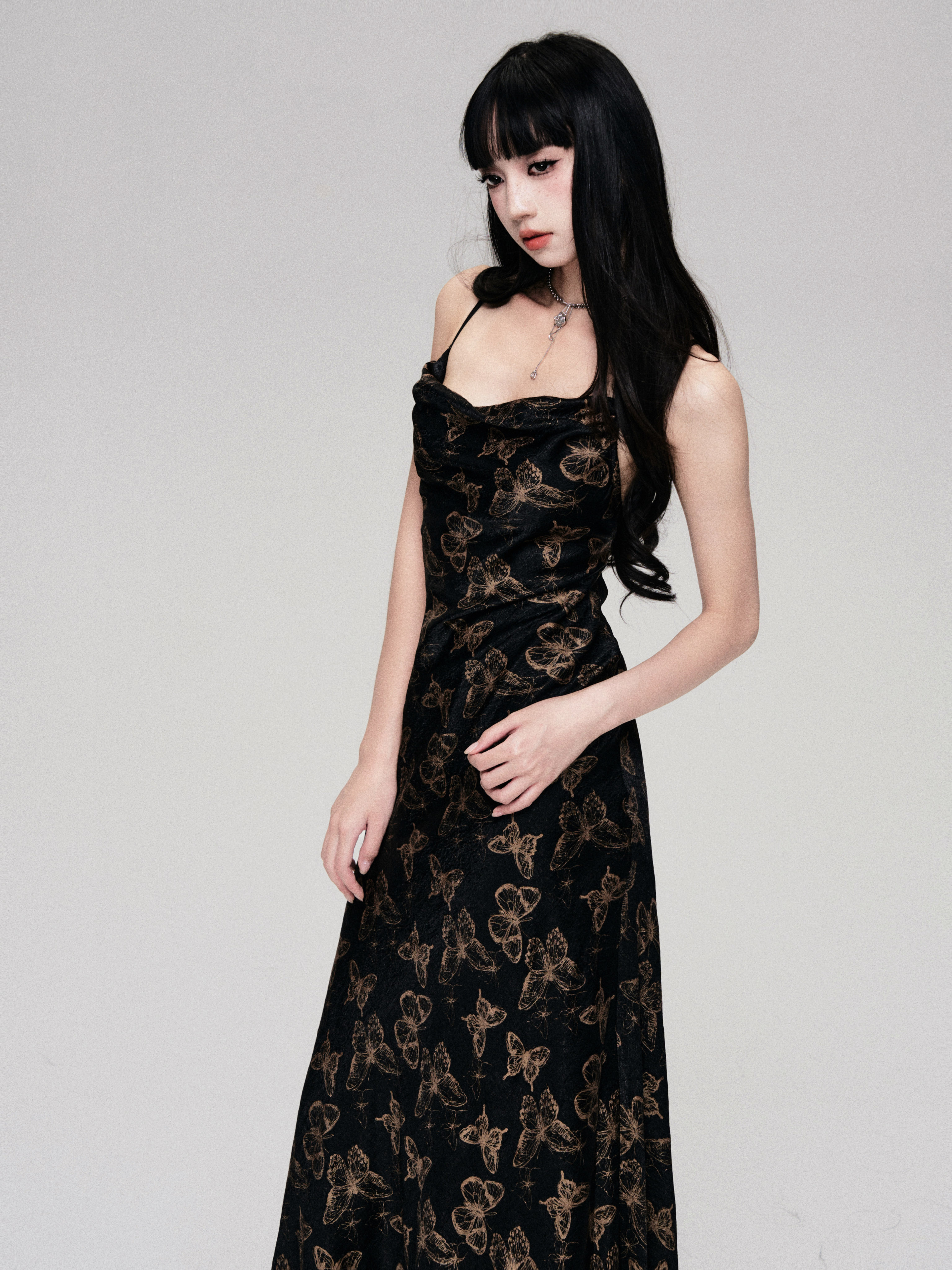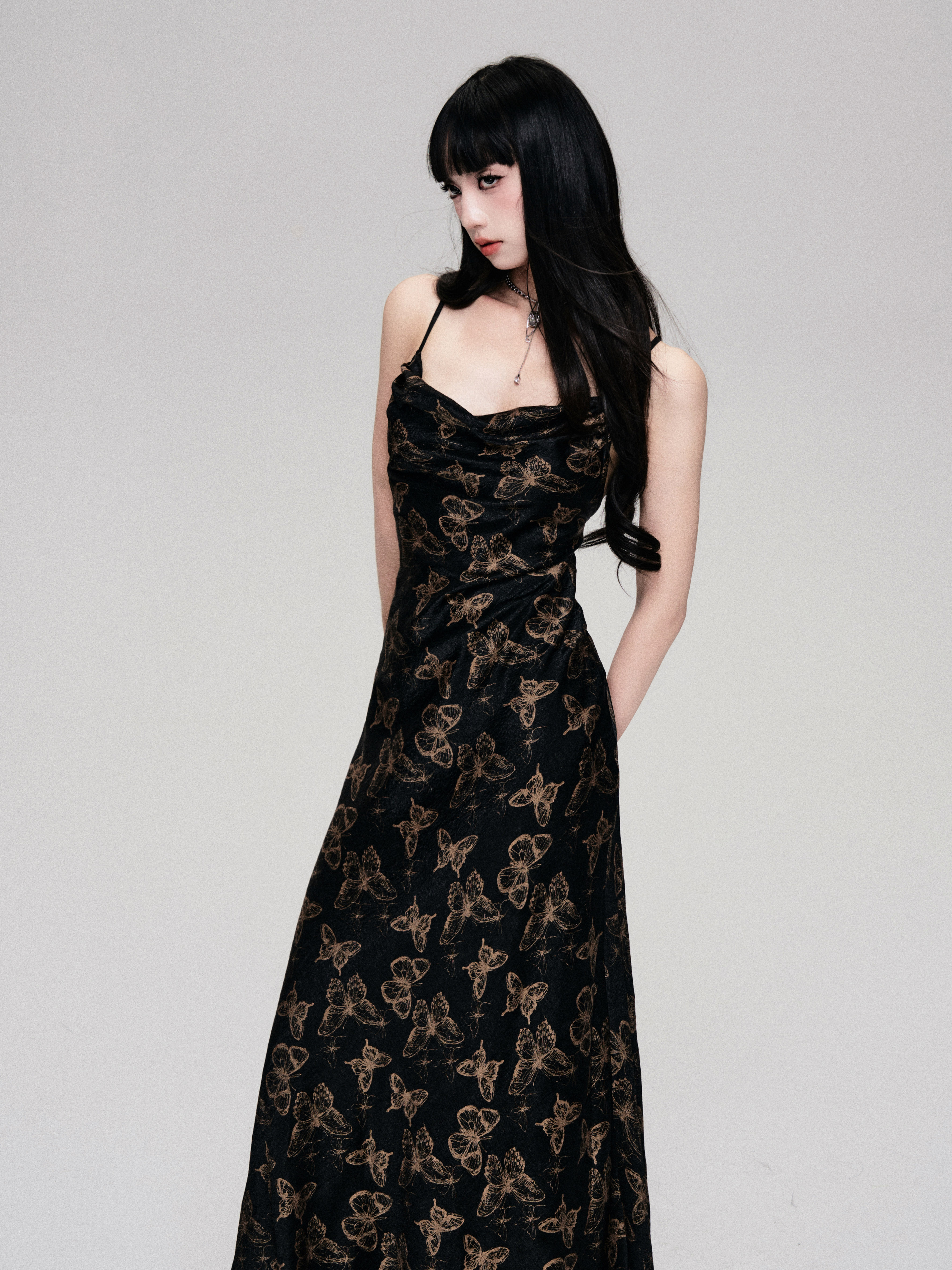 Foil Butterfly Swing Collar Tie Back Slim Slip Dress