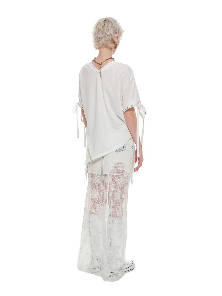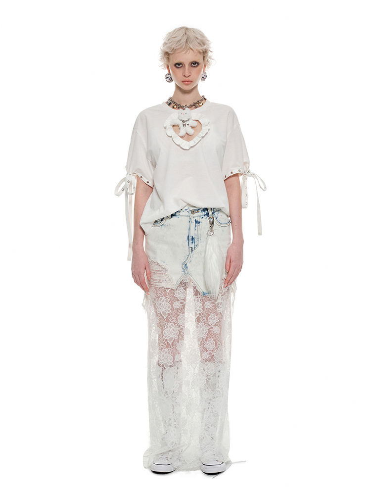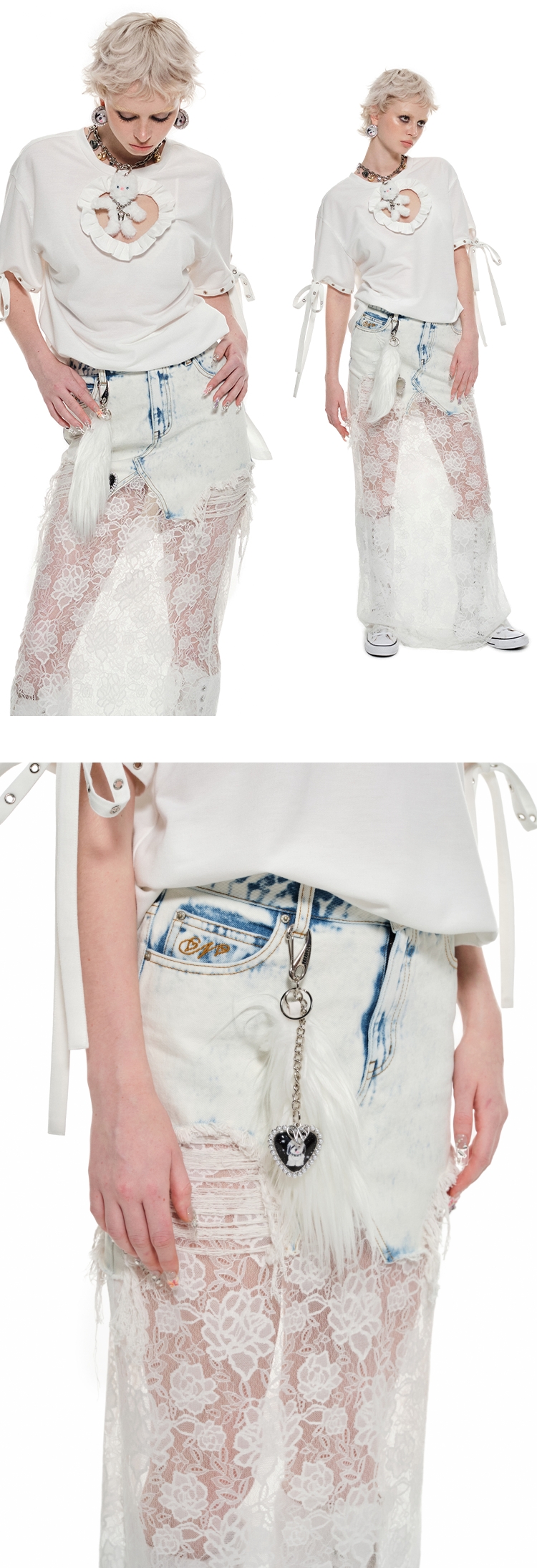 French Lace Panel Denim Maxi Skirt – Sheer Feminine Design