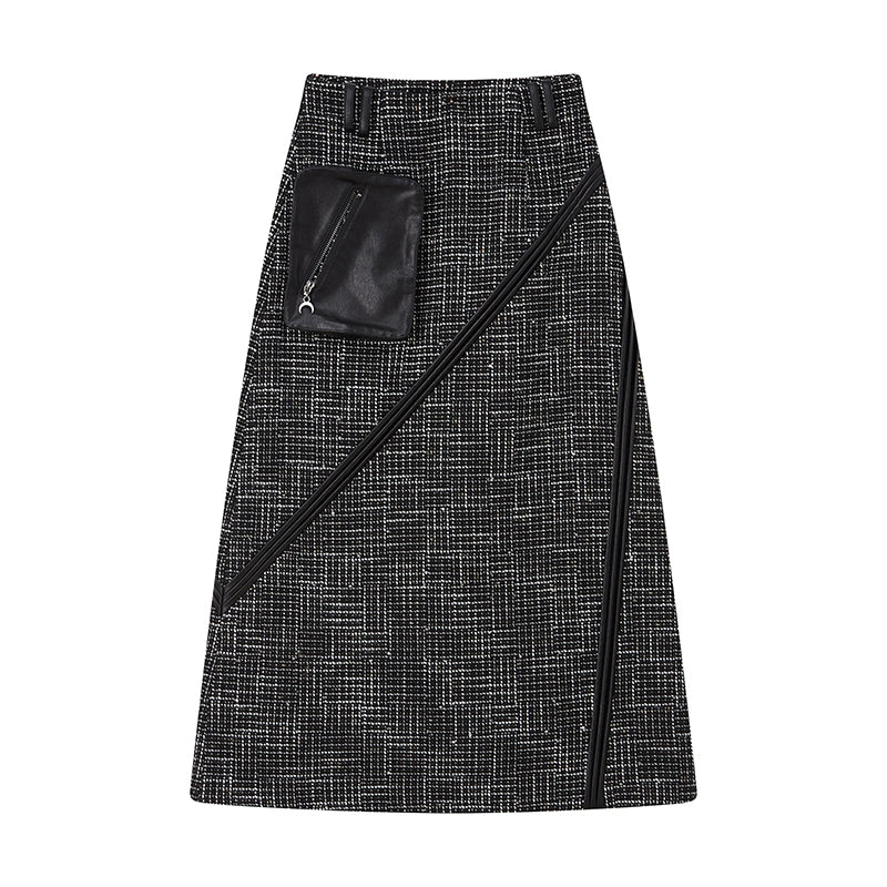 Dark Spliced PU Pocket Plaid Spring Skirt