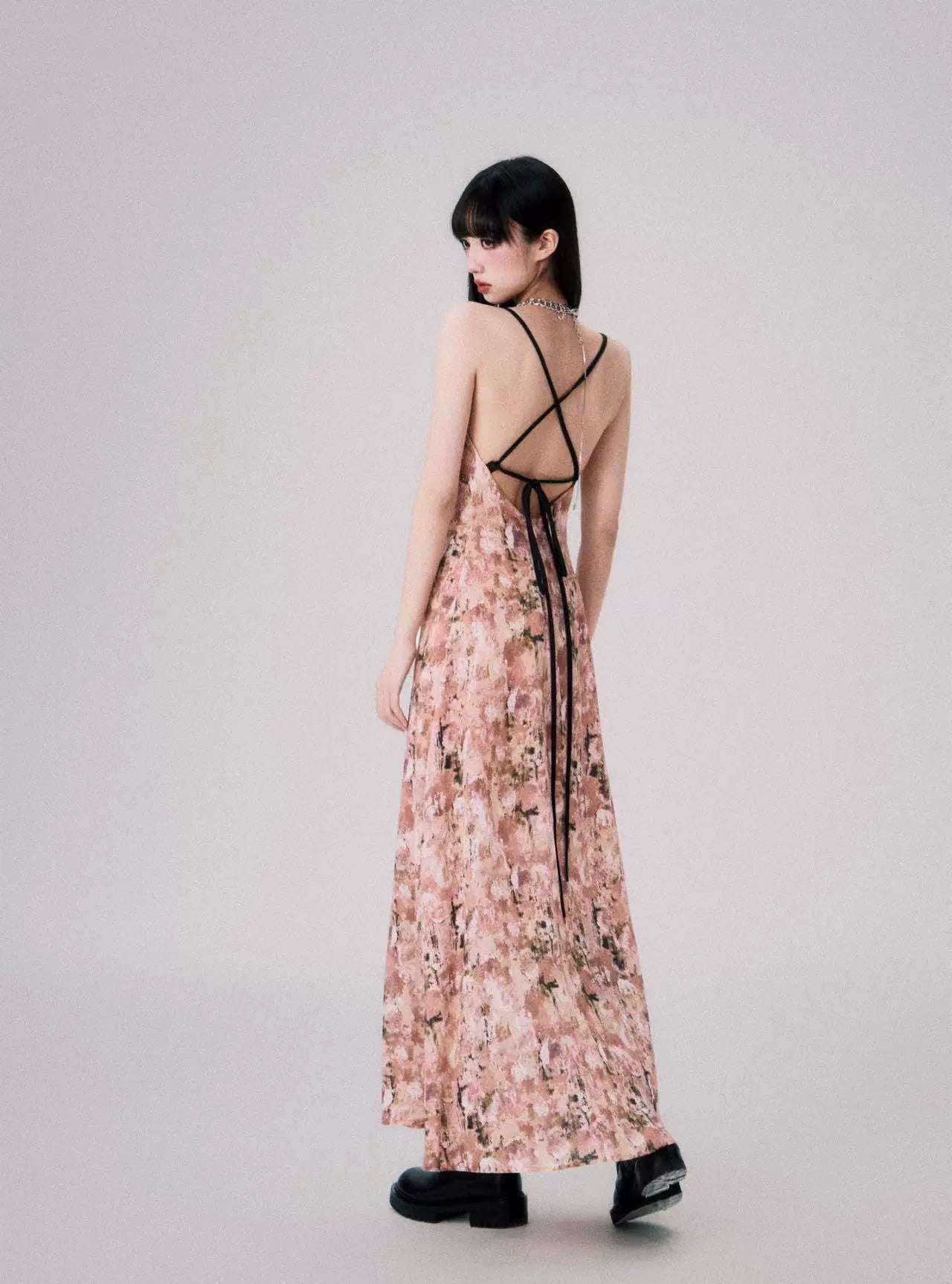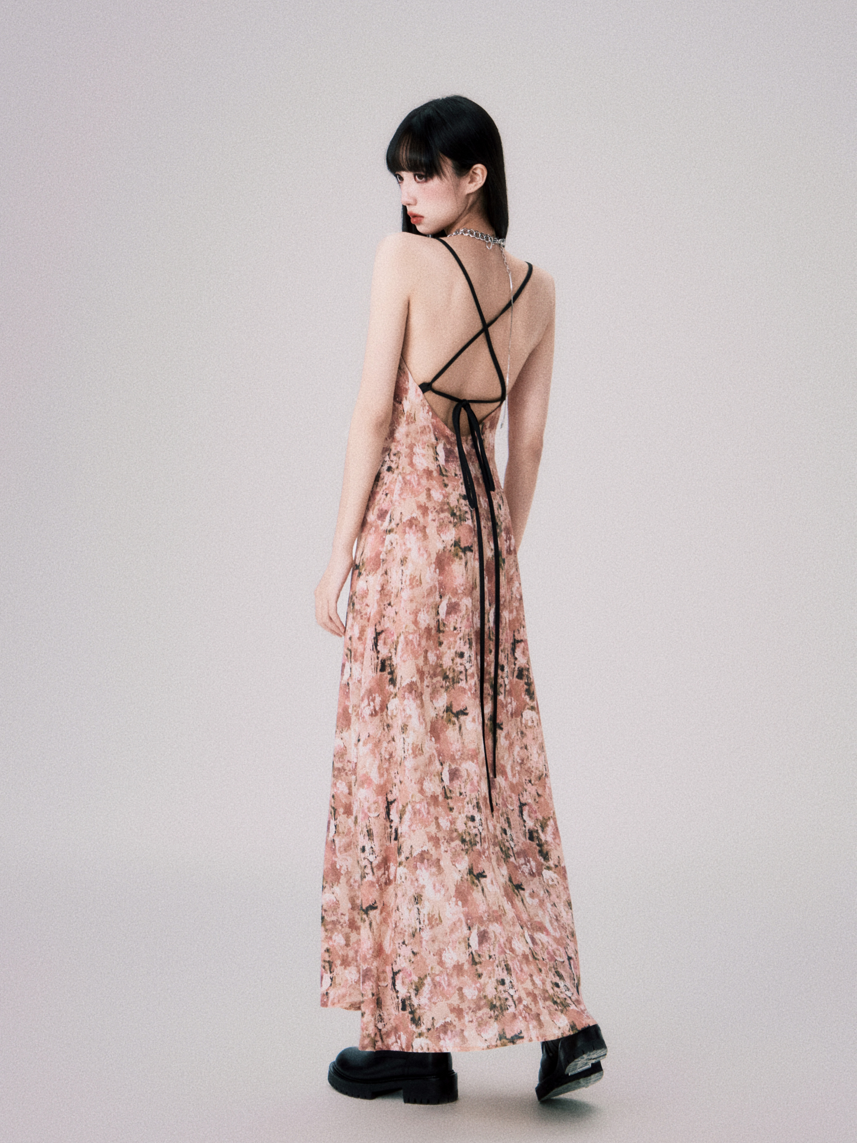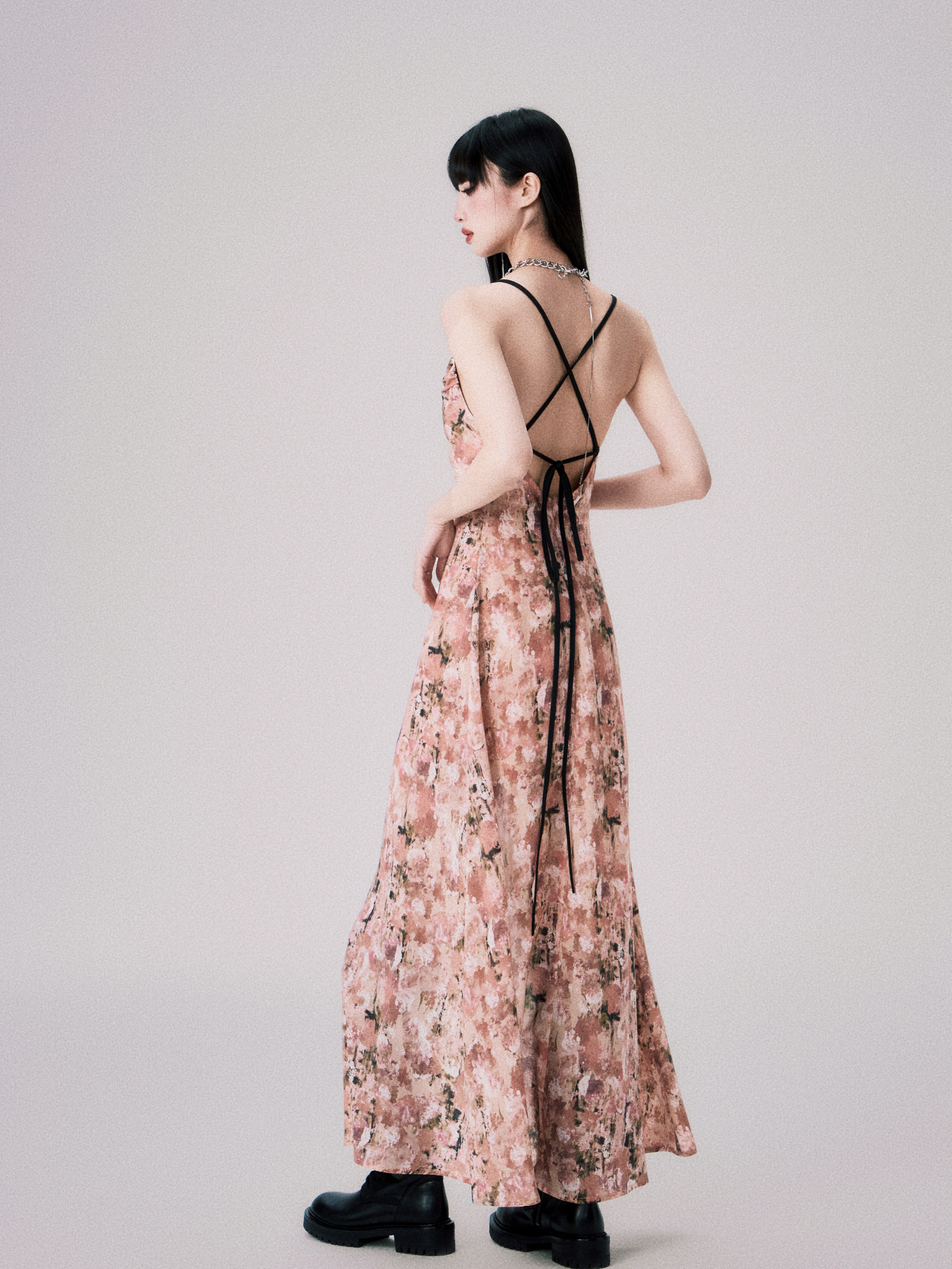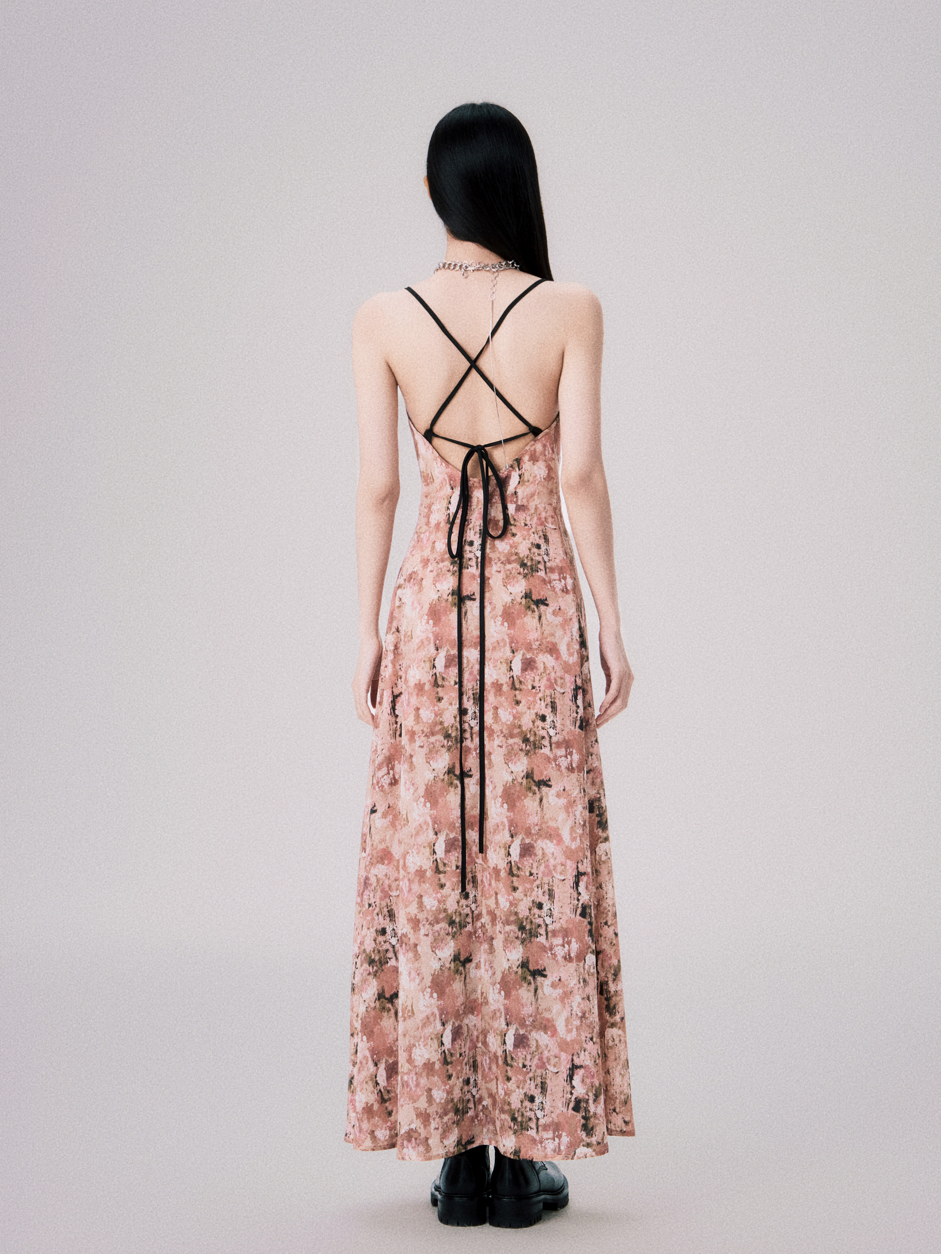 Apricot Pink Floral Swing Neck Backless Date Slip Dress