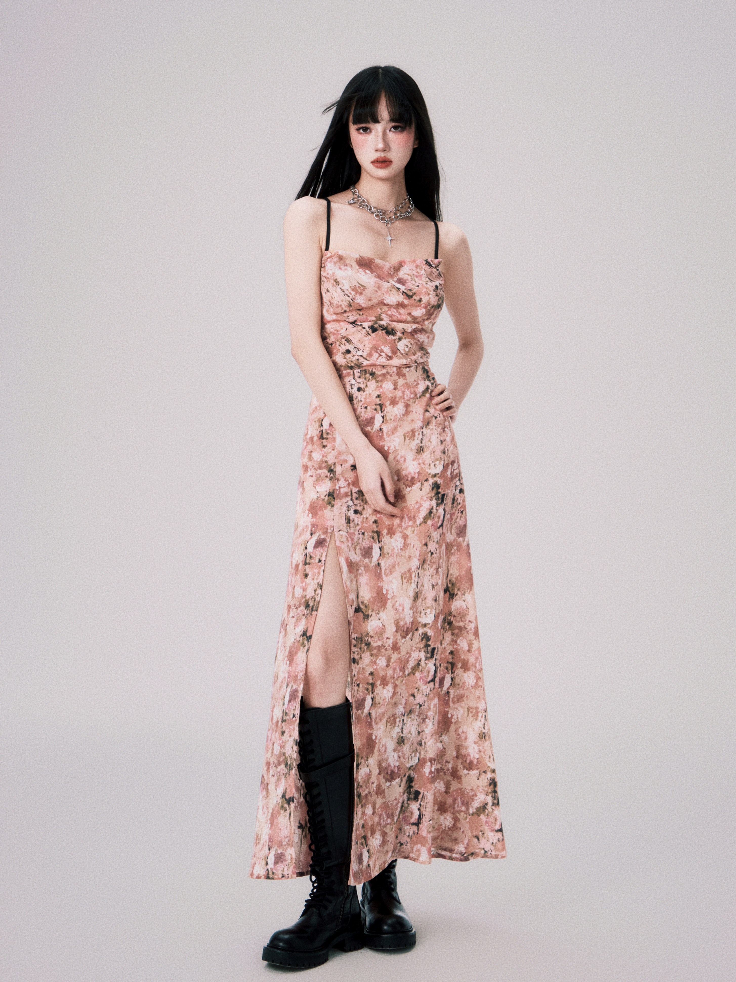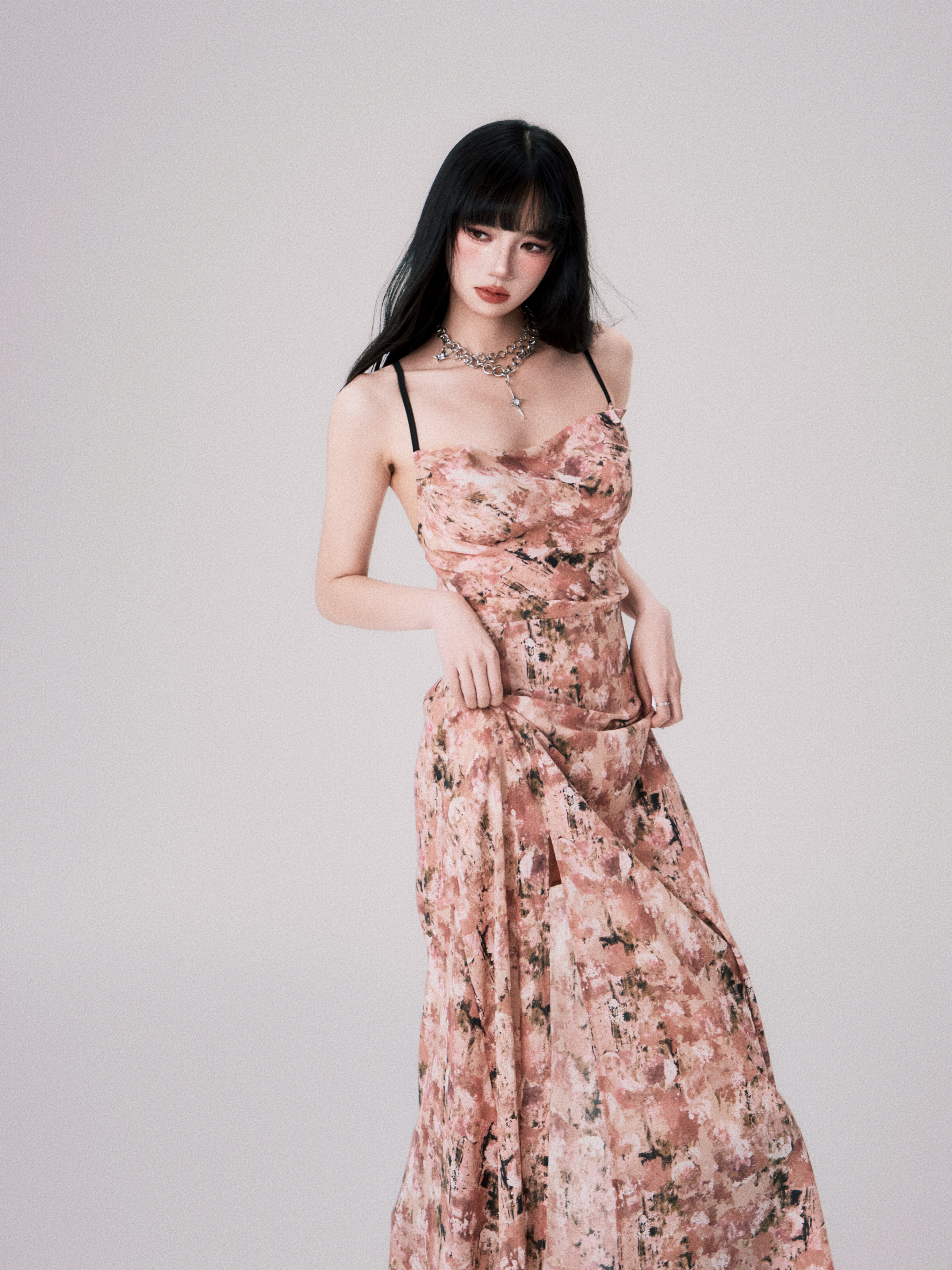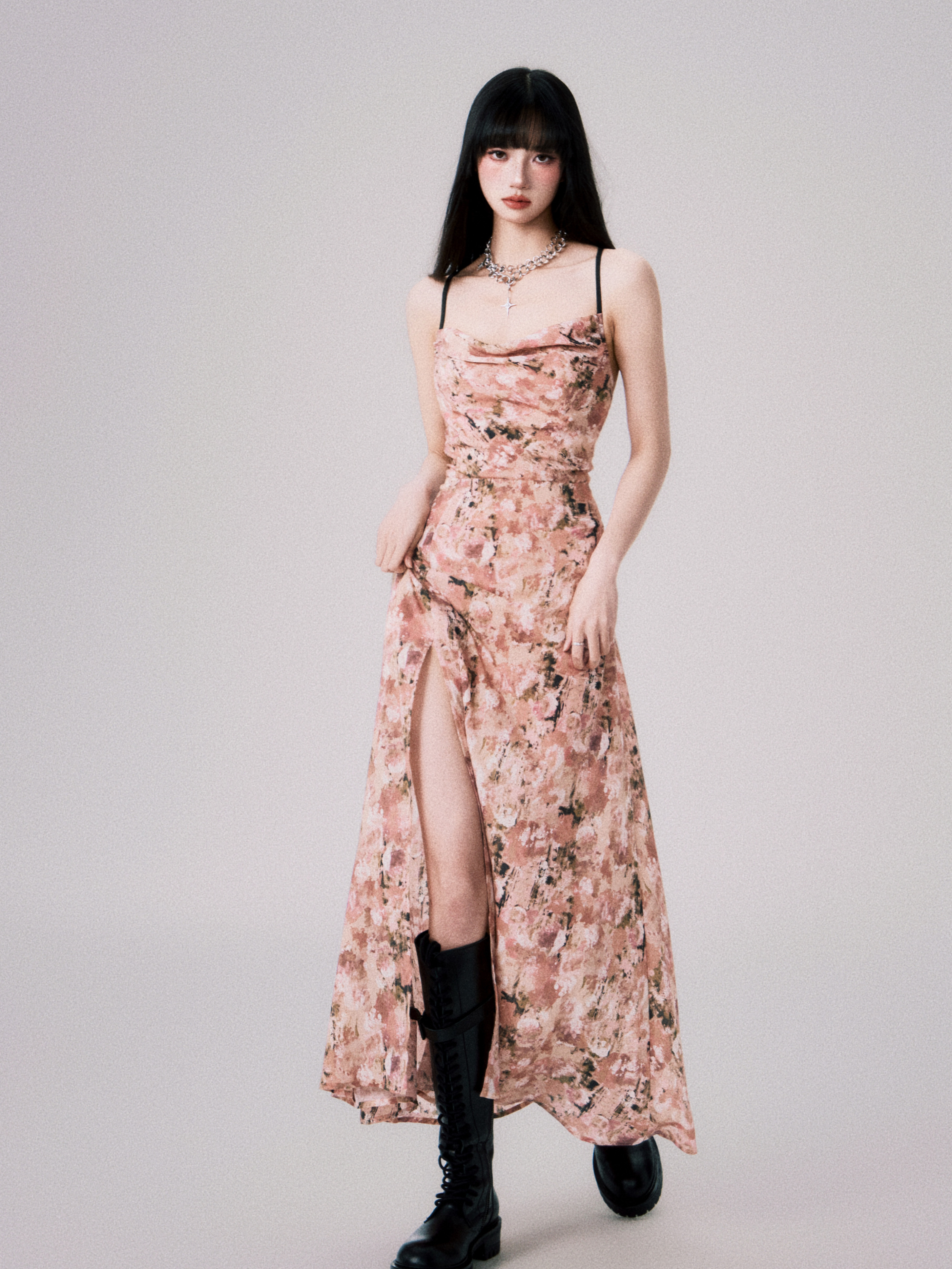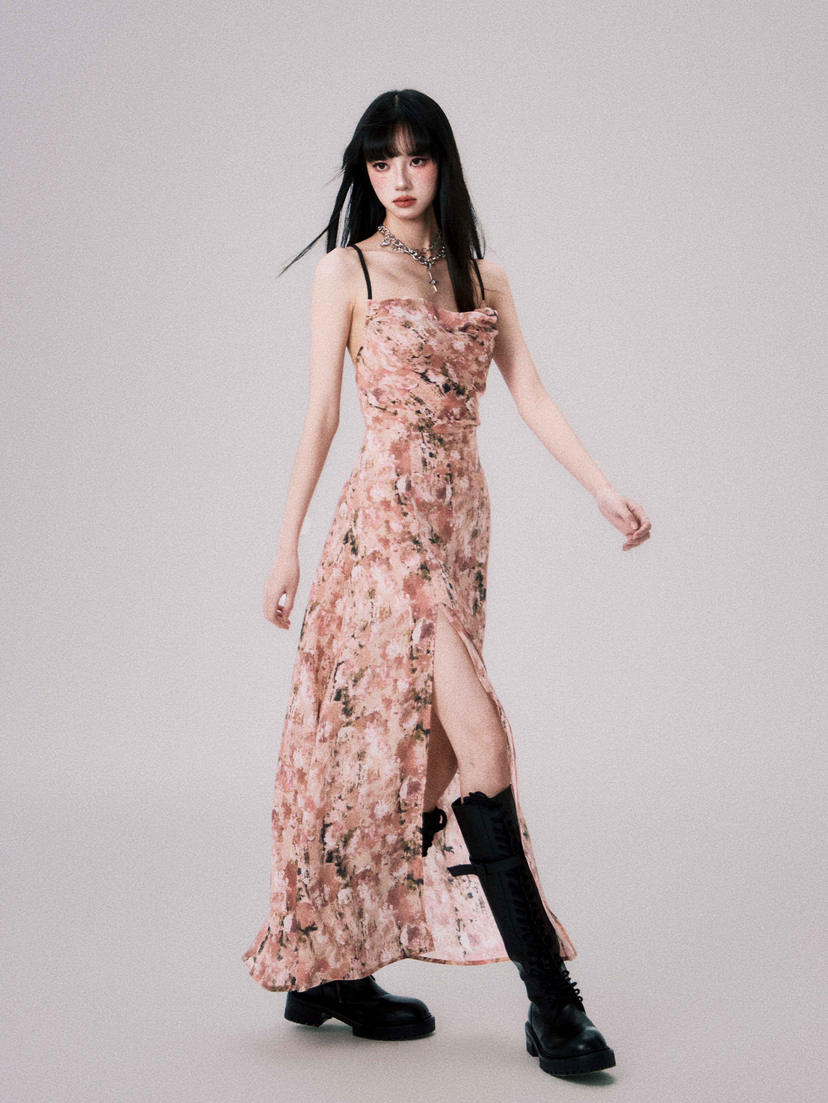 Apricot Pink Floral Swing Neck Backless Date Slip Dress