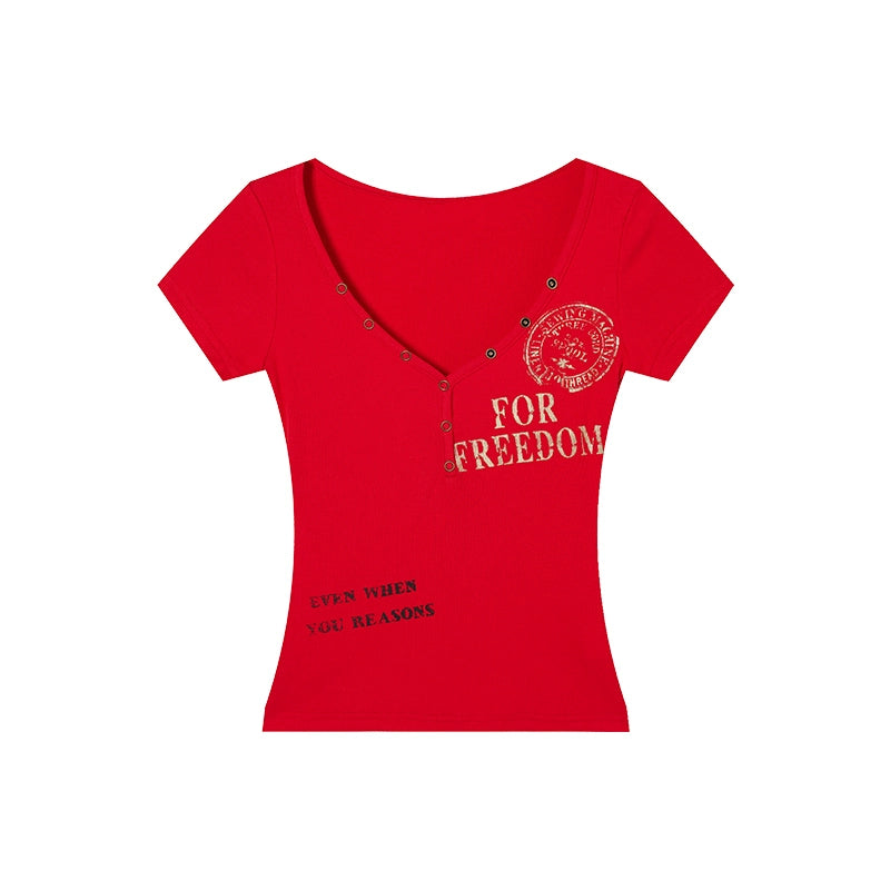 Retro V-Neck Peach Heart Printed T-Shirt - Summer Slim-Fit Style