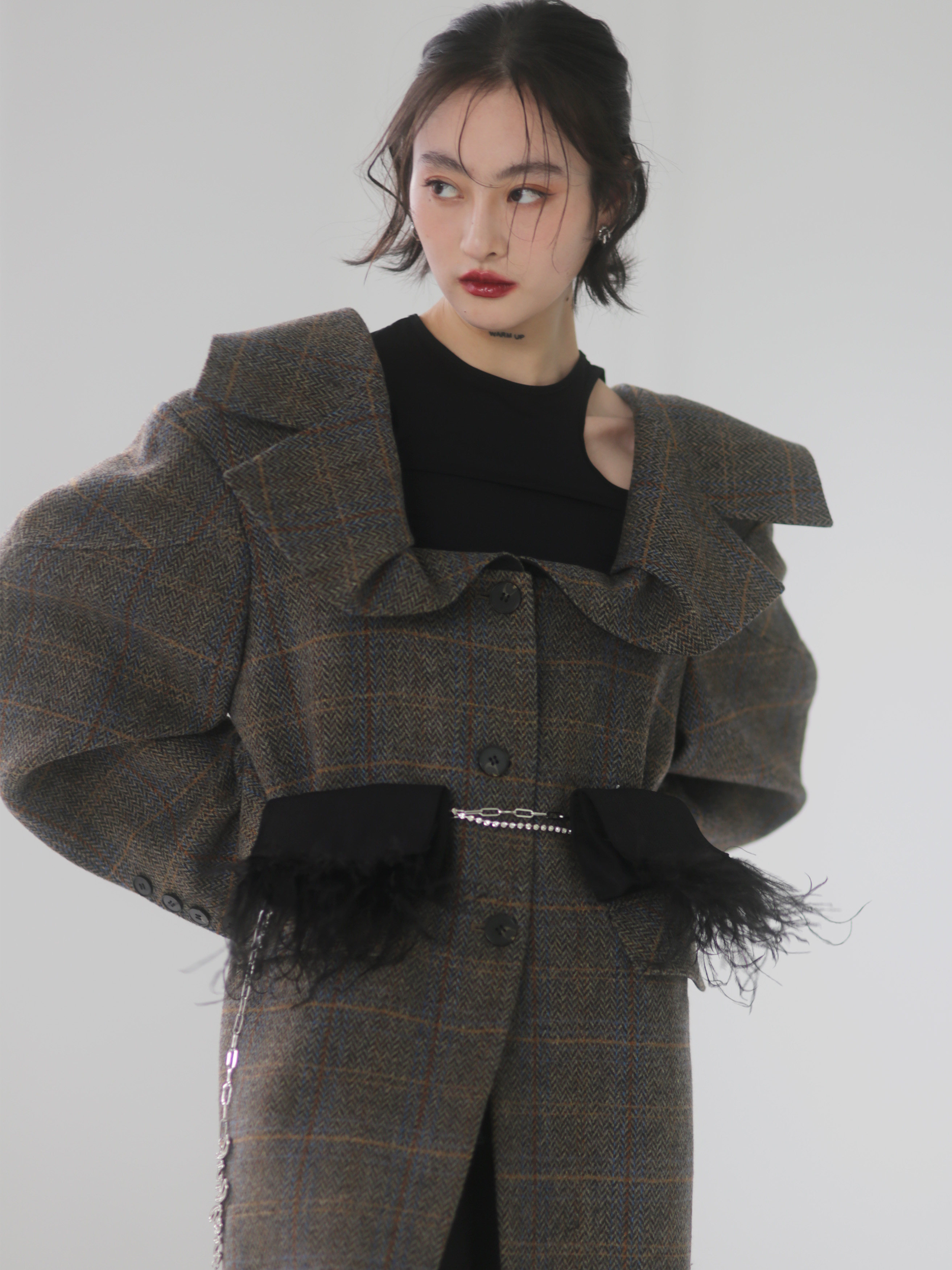 Generous Collar Off Shoulder Plaid Woolen Long Coat