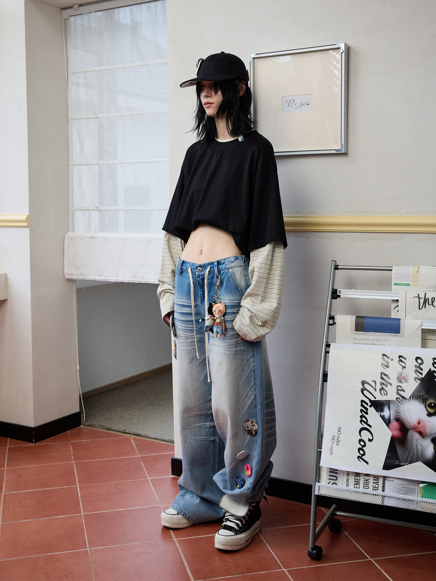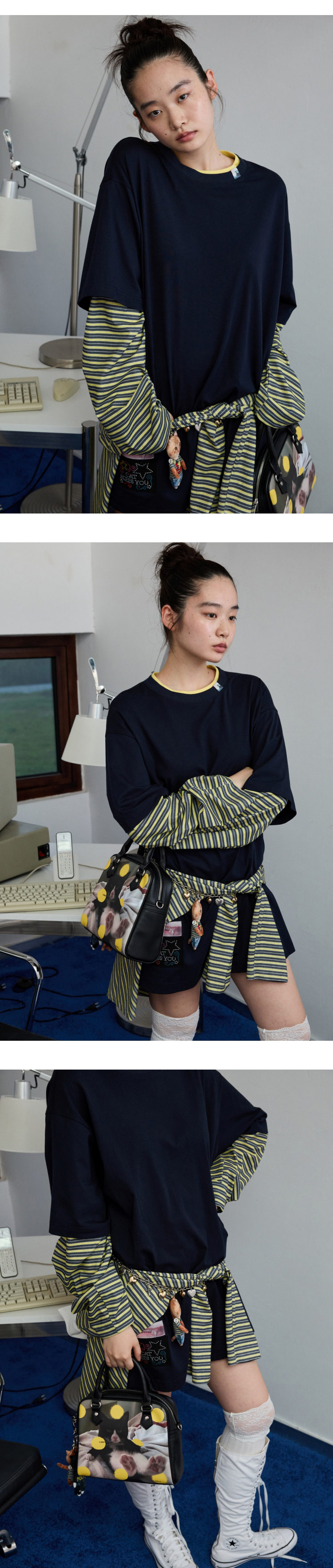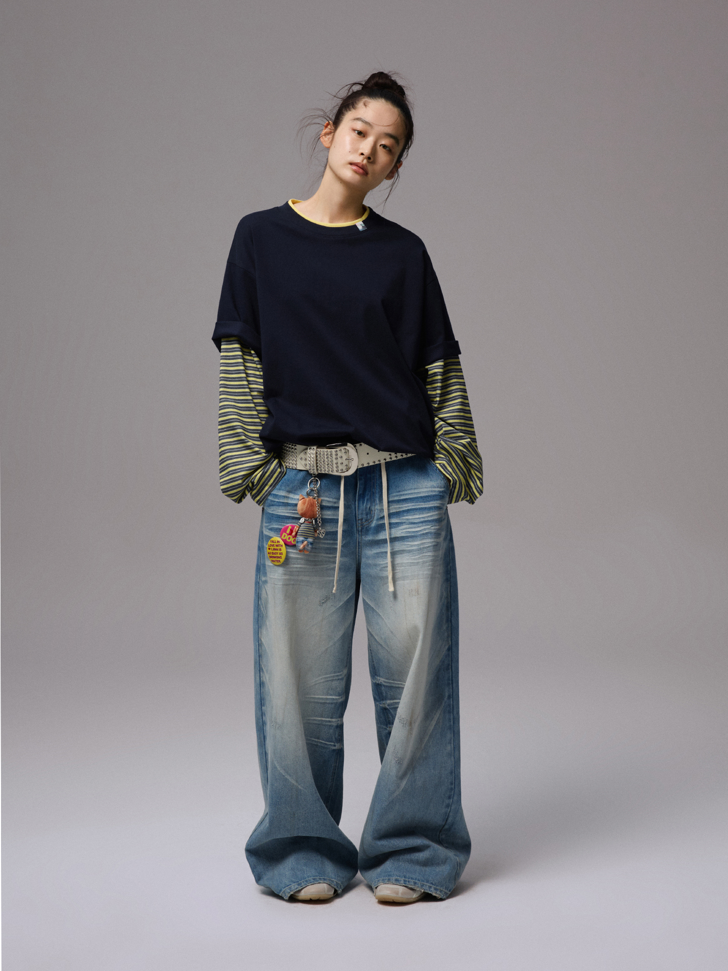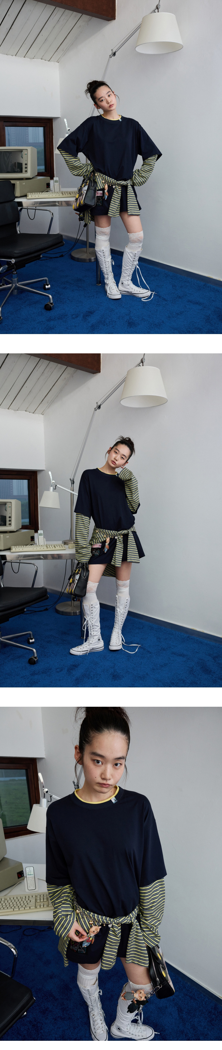 Oversized Striped Fake Two-Piece T-Shirt – Loose Contrast Long Sleeve Top