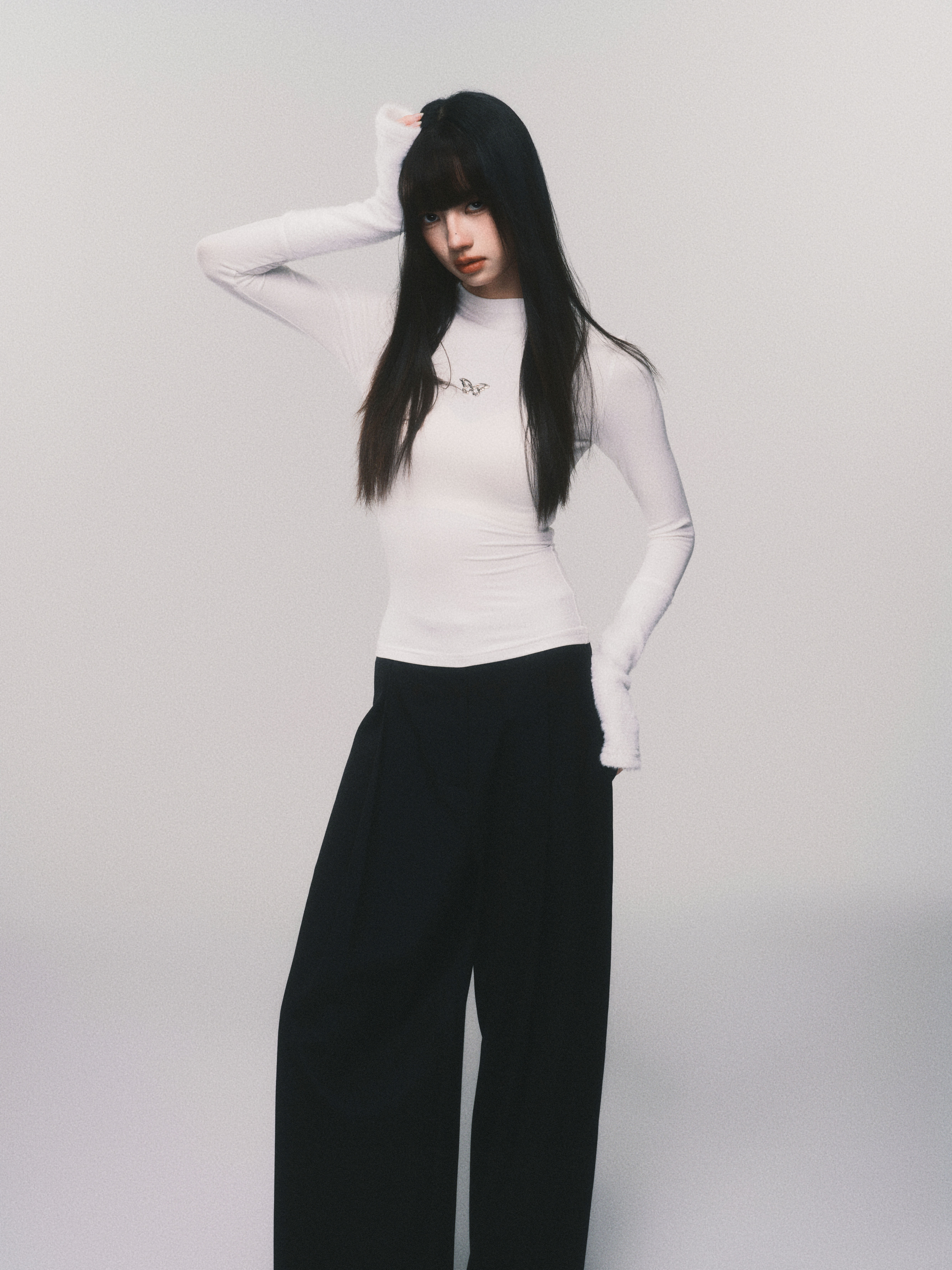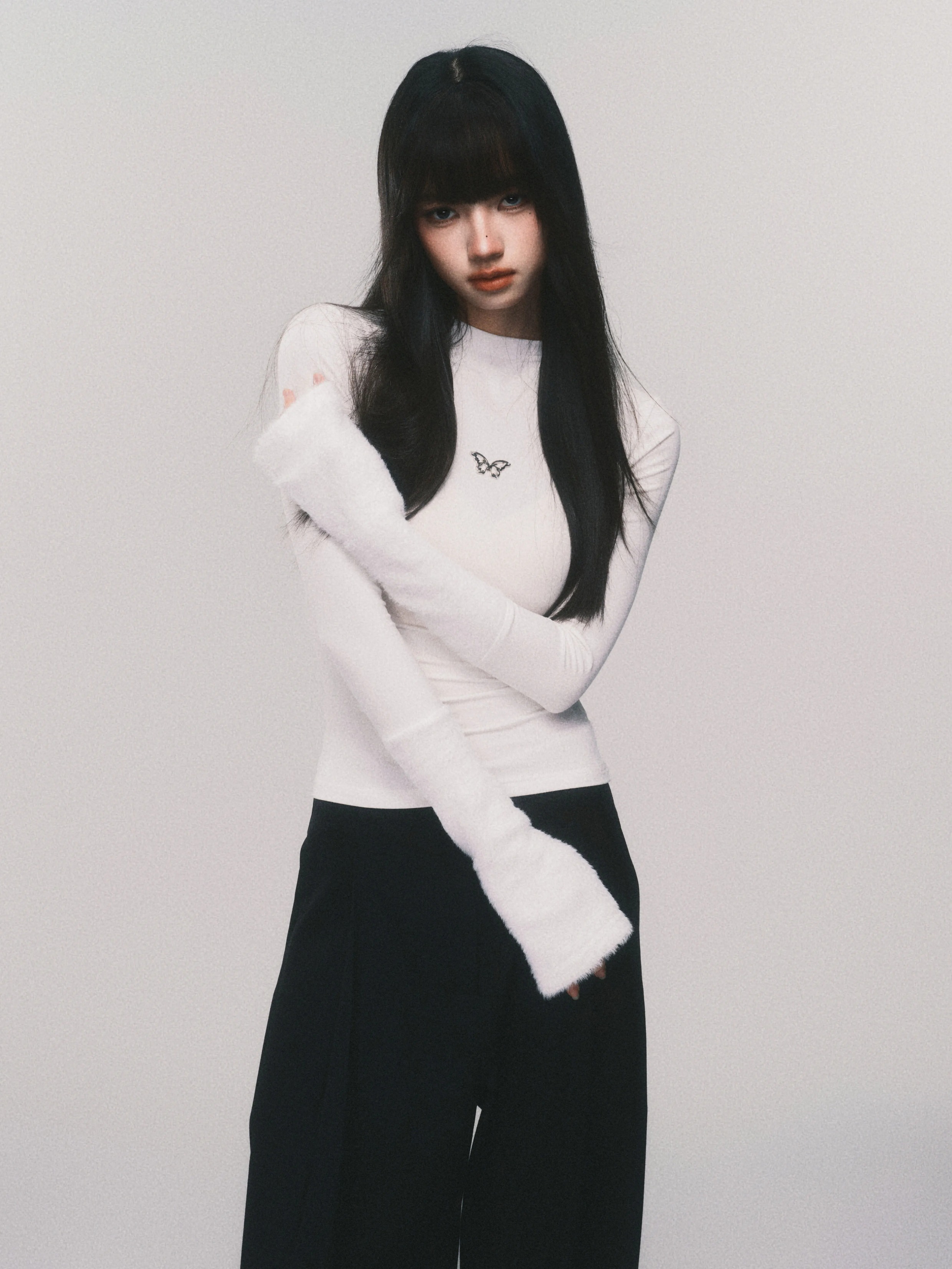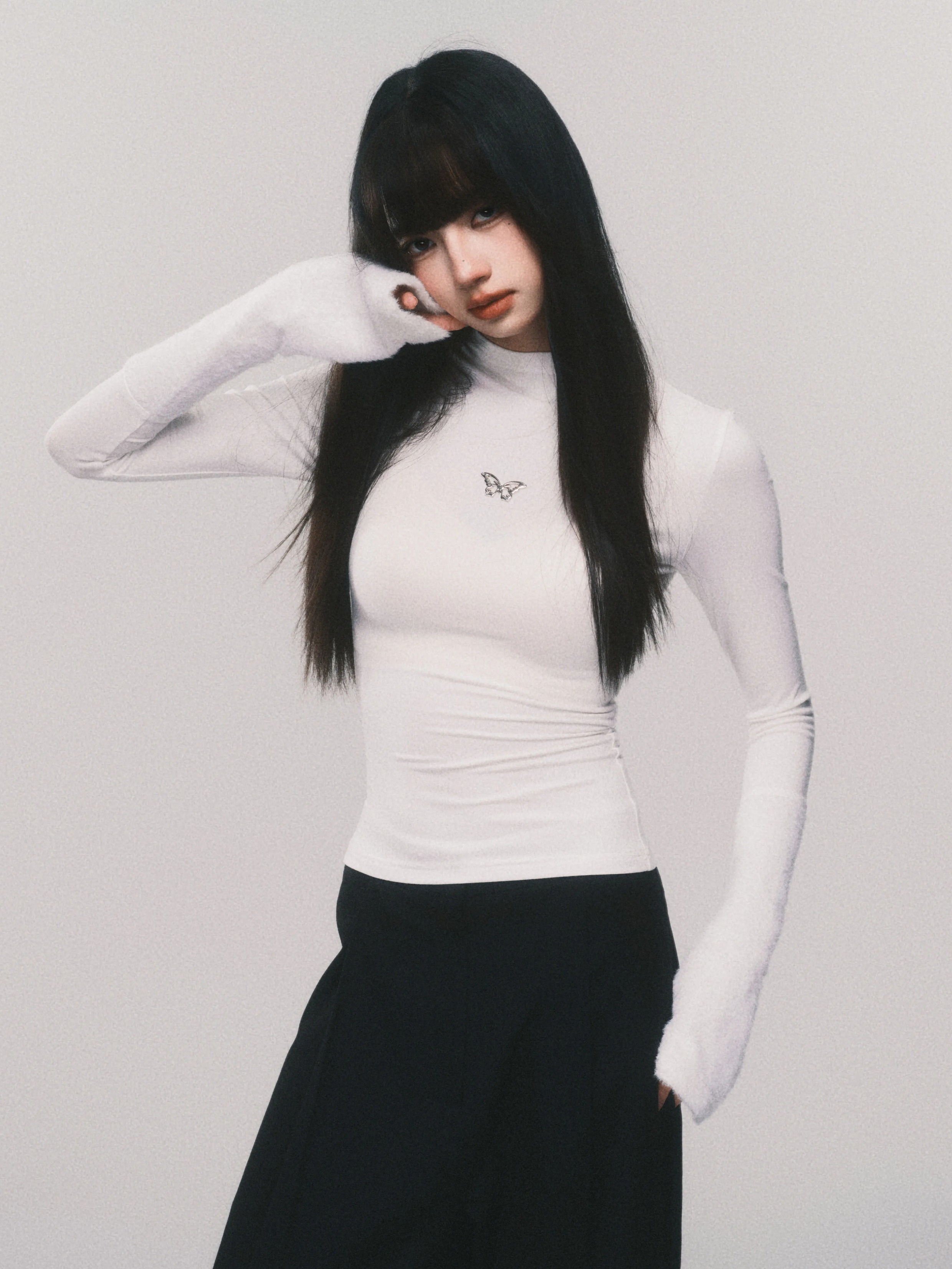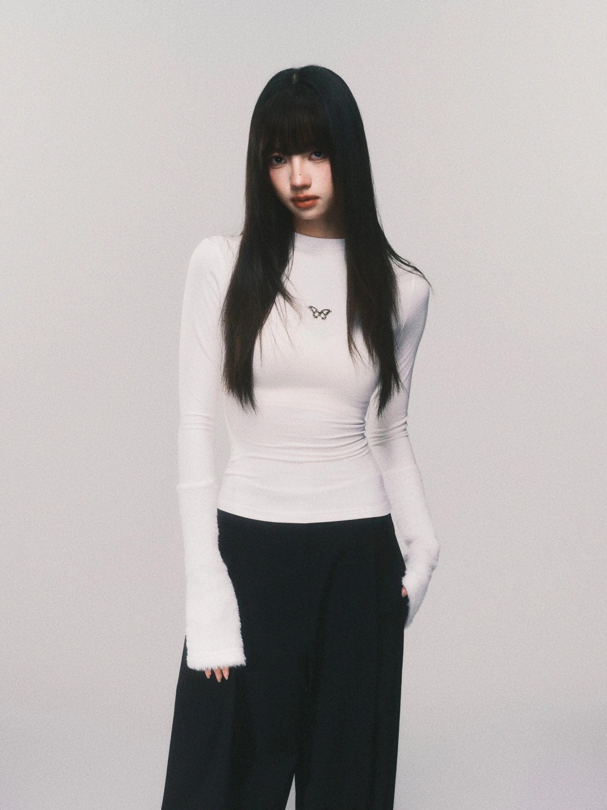 Metallic Butterfly High-Neck Plush Cuff Winter Base Layer