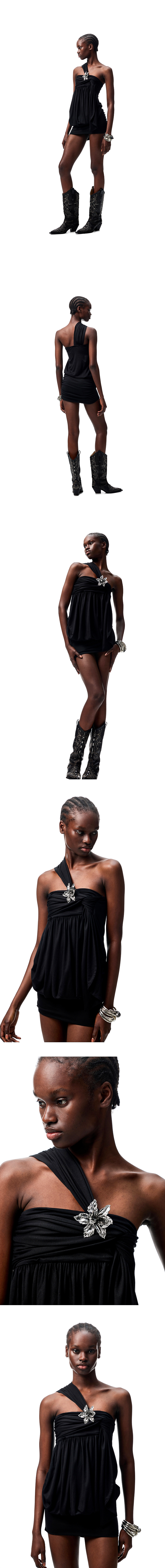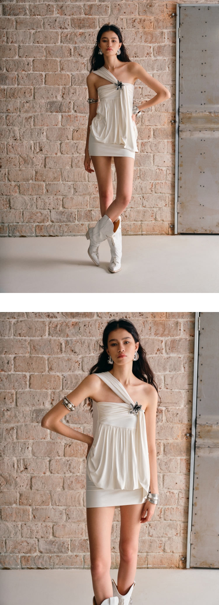 One-Shoulder Acetate Bandeau Dress – Slim Fit Pleated Wrap Mini