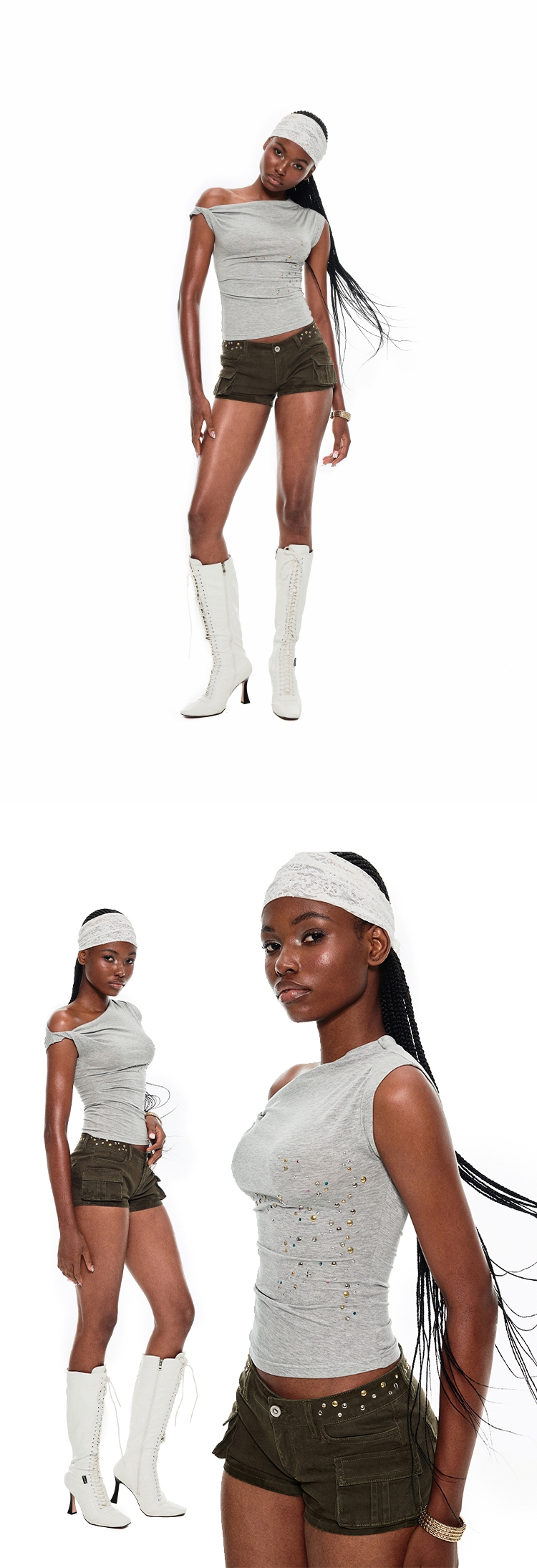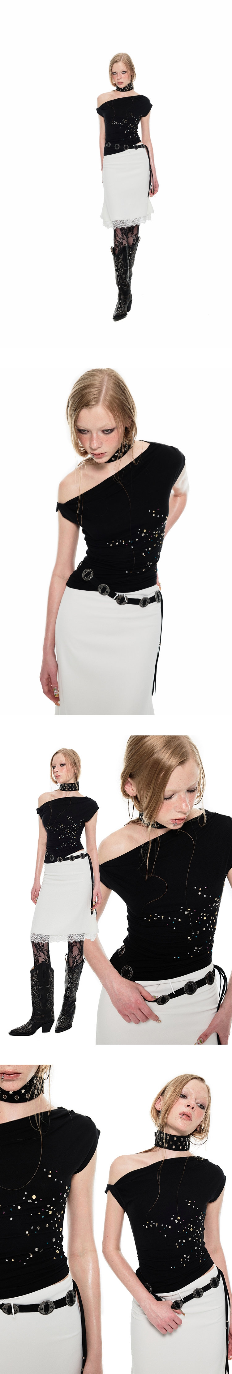 One-Shoulder Twisted Irregular Pleated T-Shirt – Studded Detail for Edgy Looks