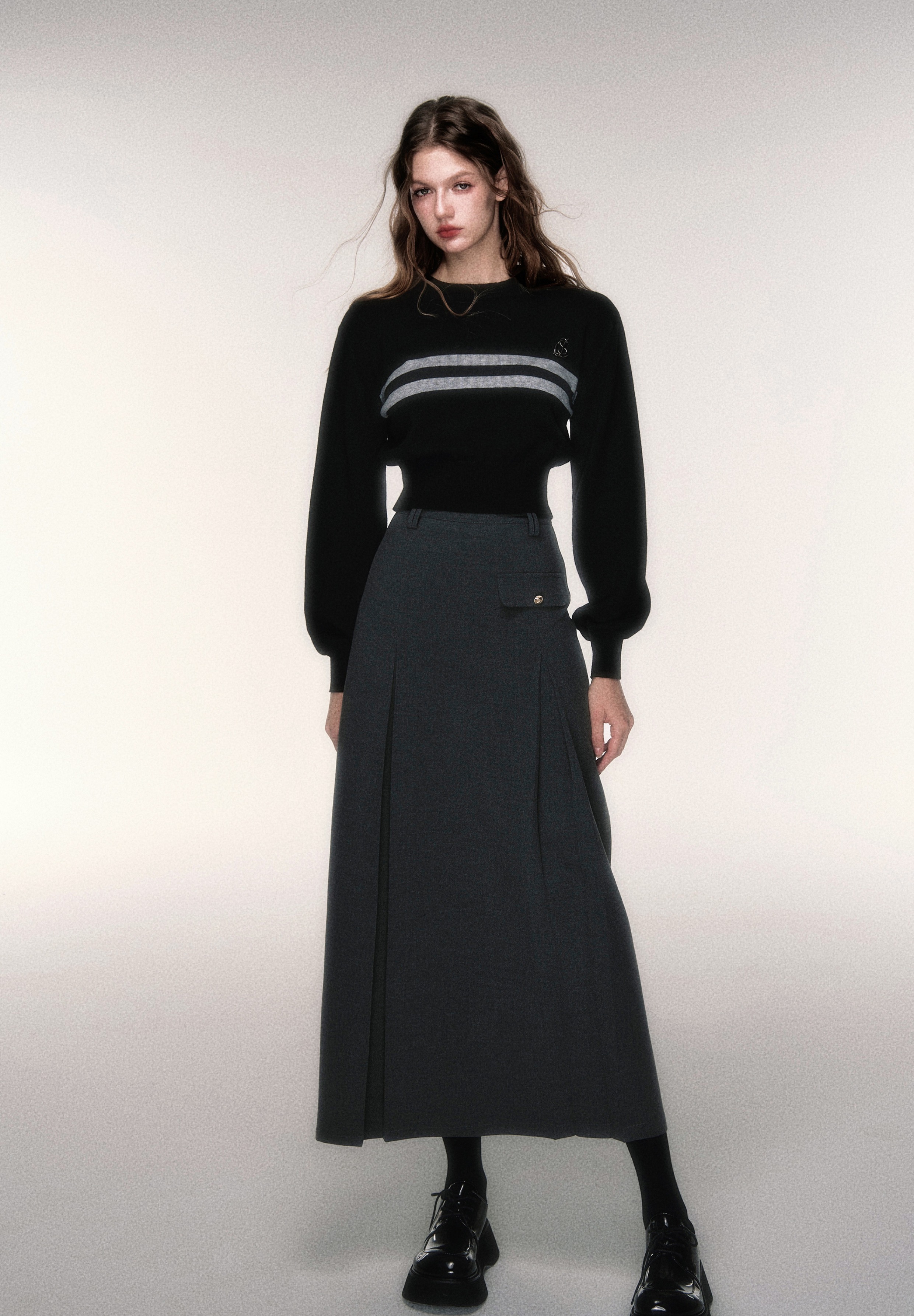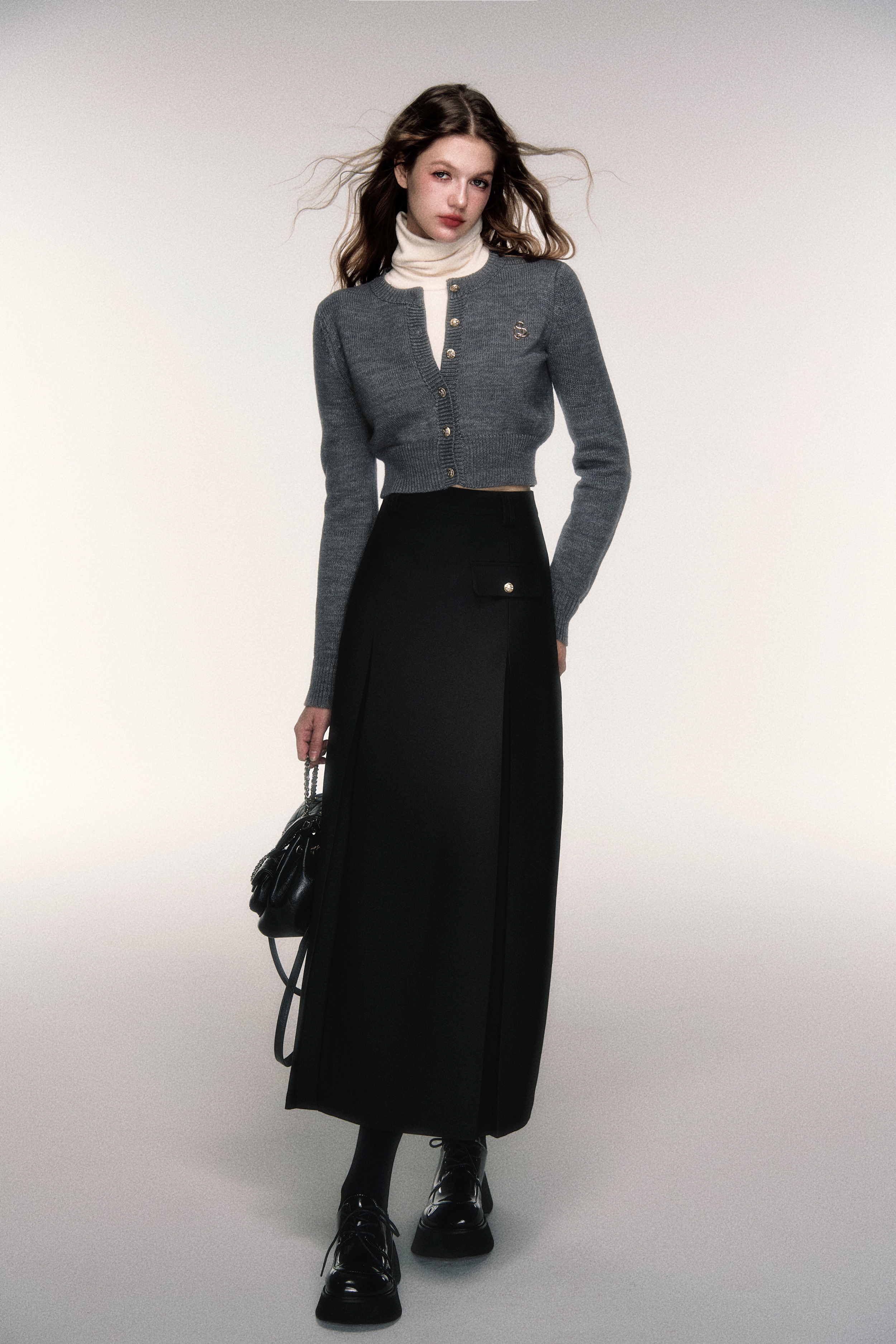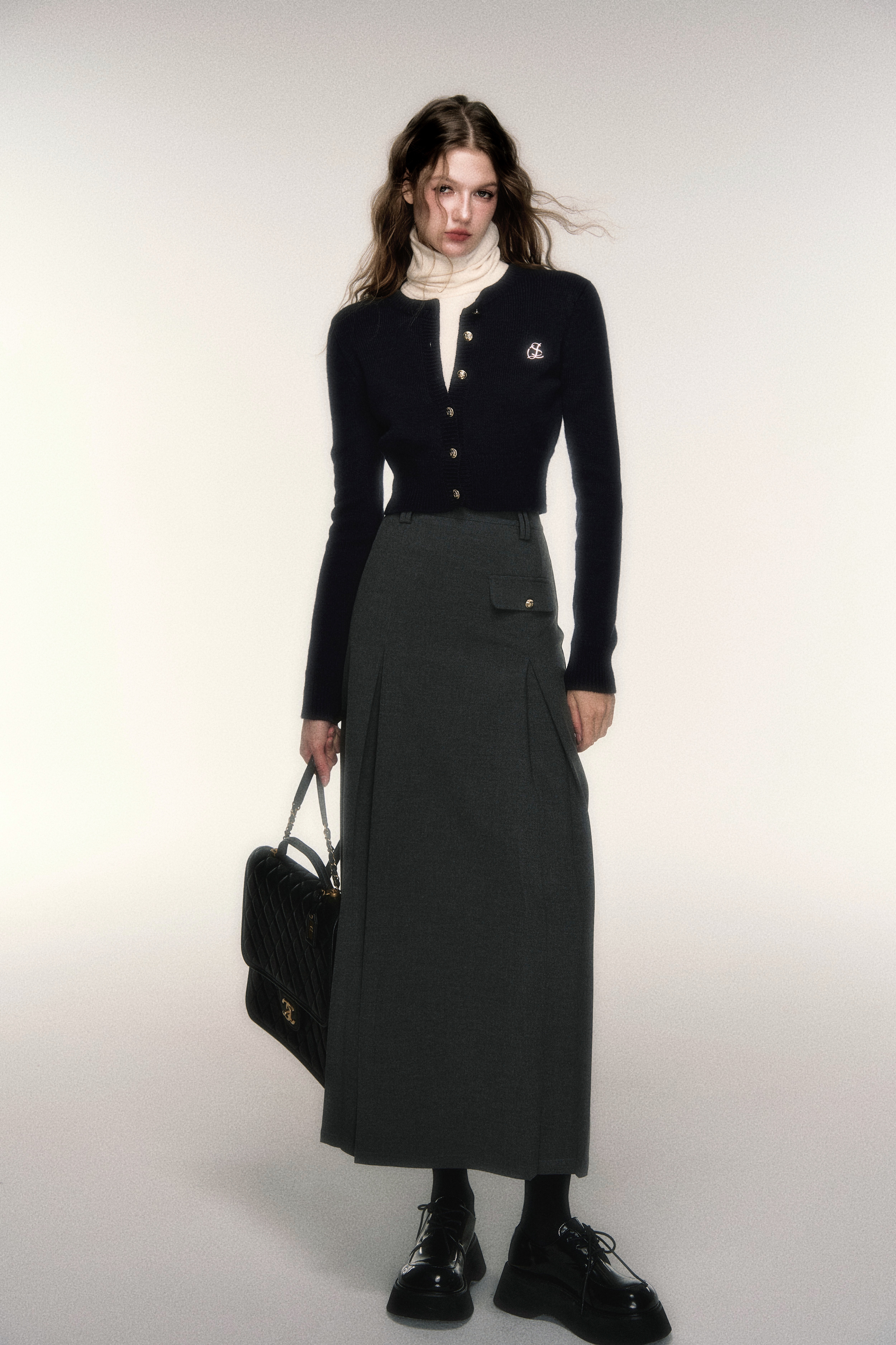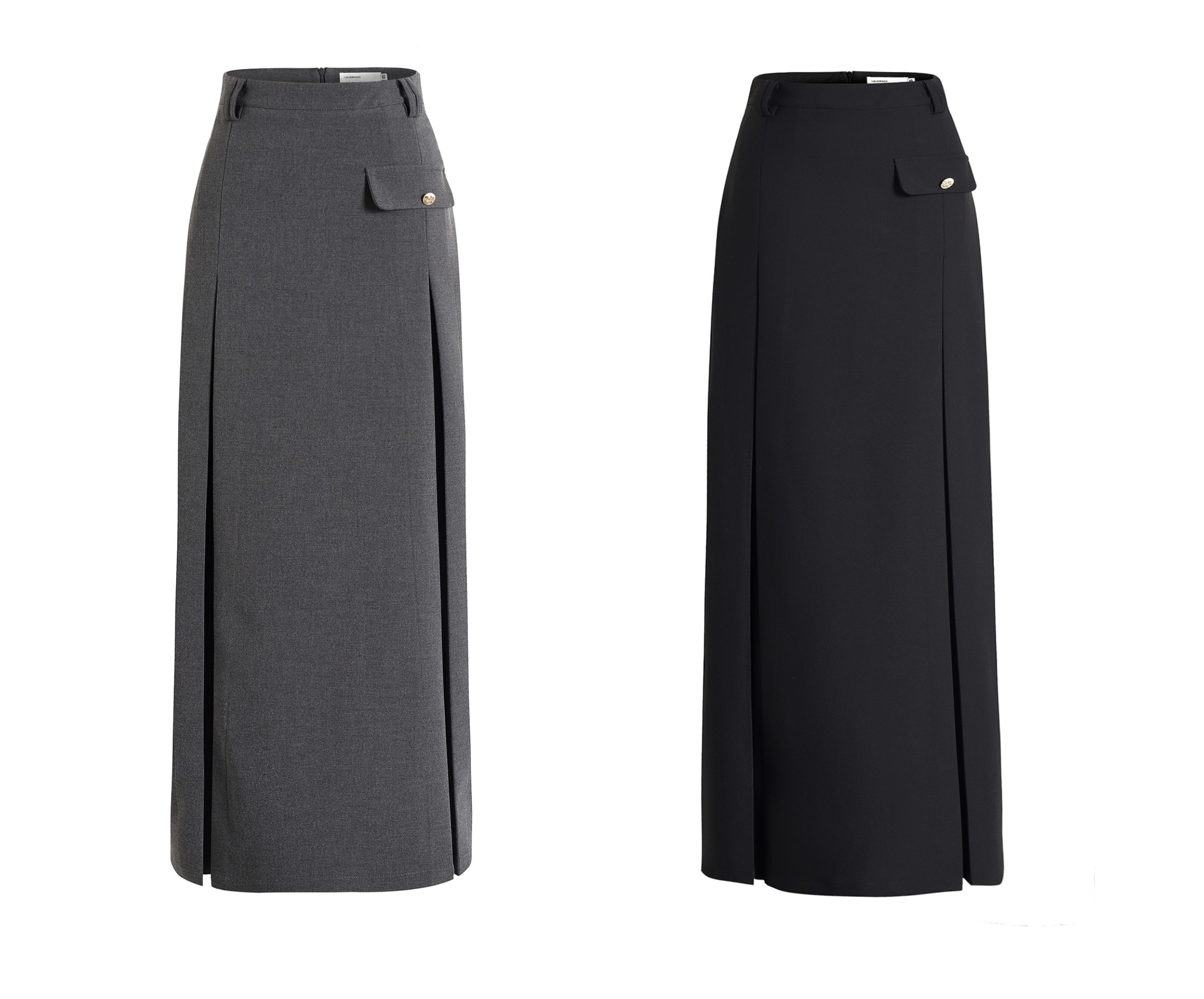 Dark Grey Long Folded Skirt - Small Gold Buttons