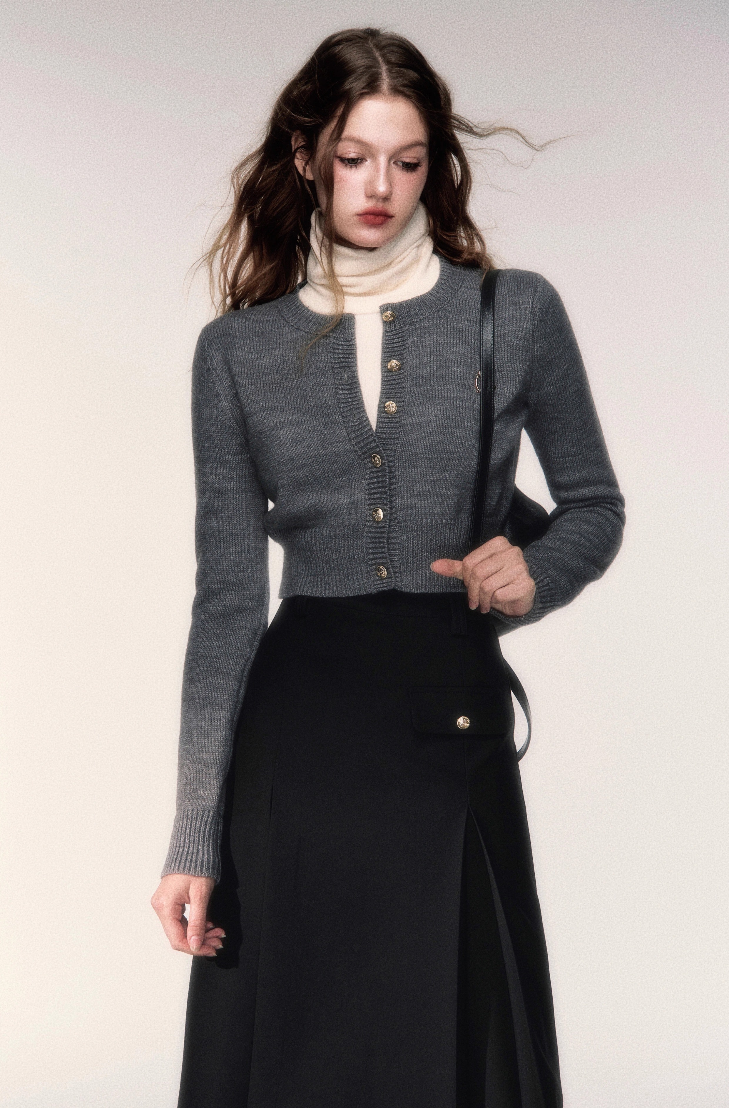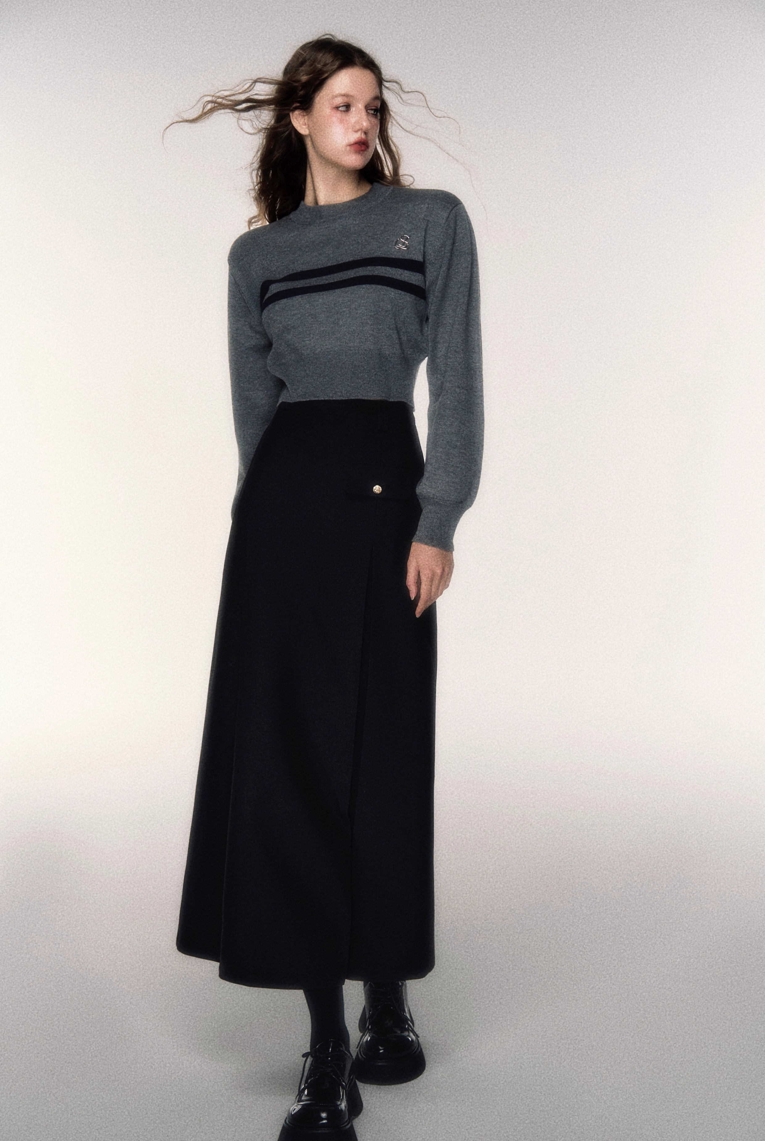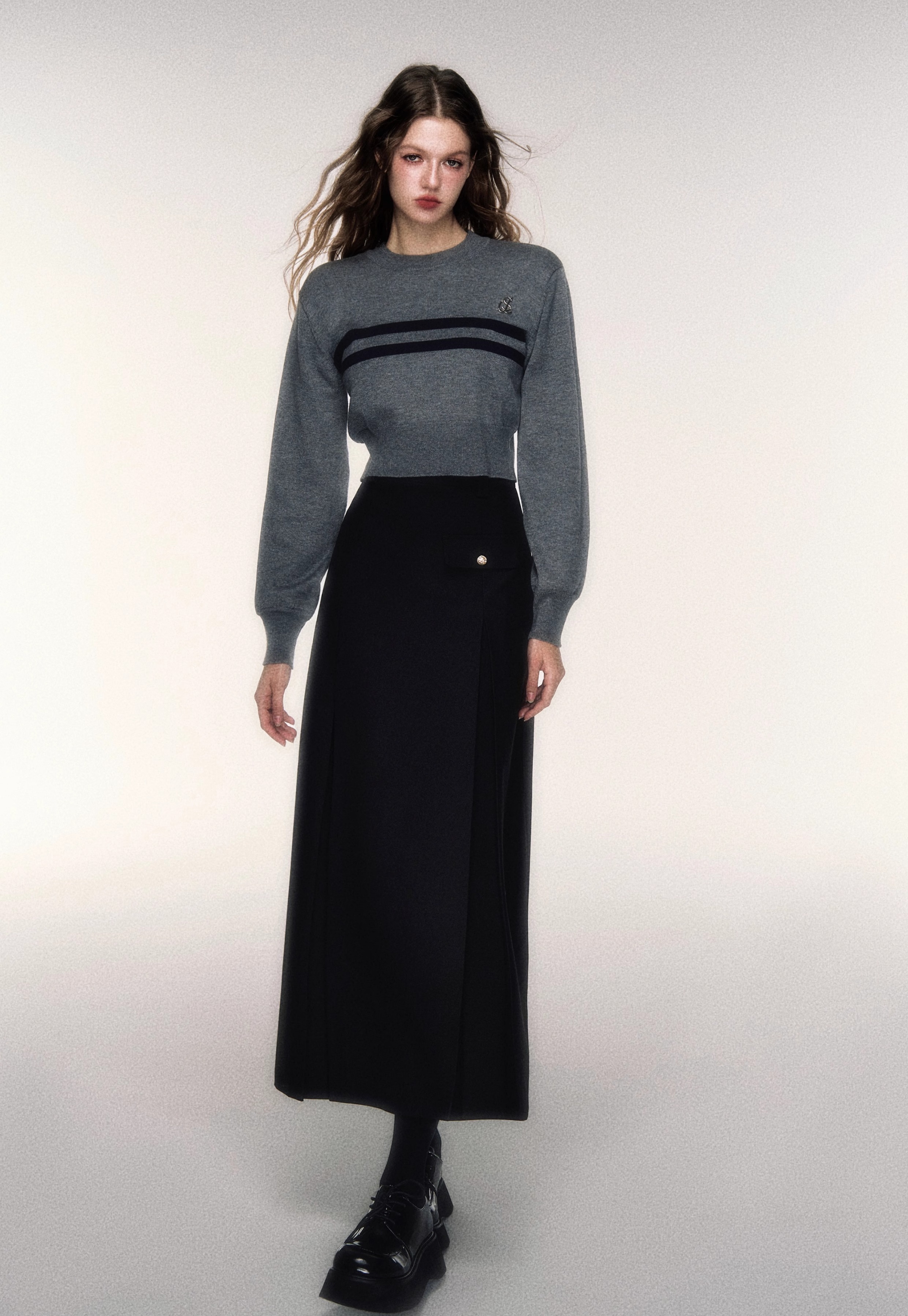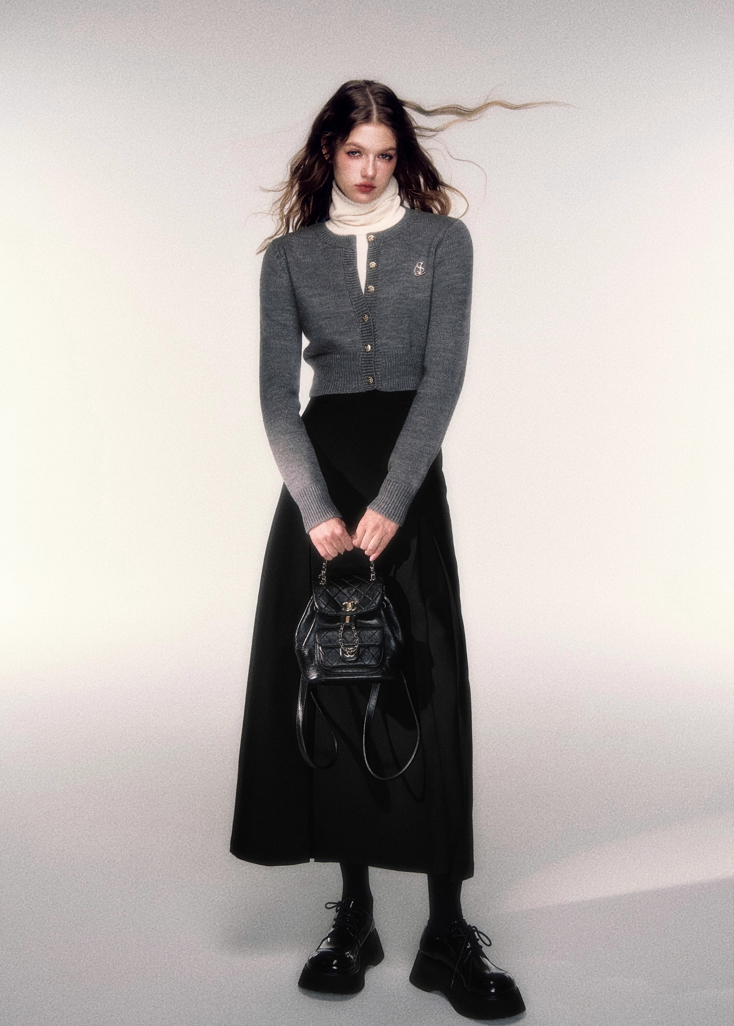 Dark Grey Long Folded Skirt - Small Gold Buttons