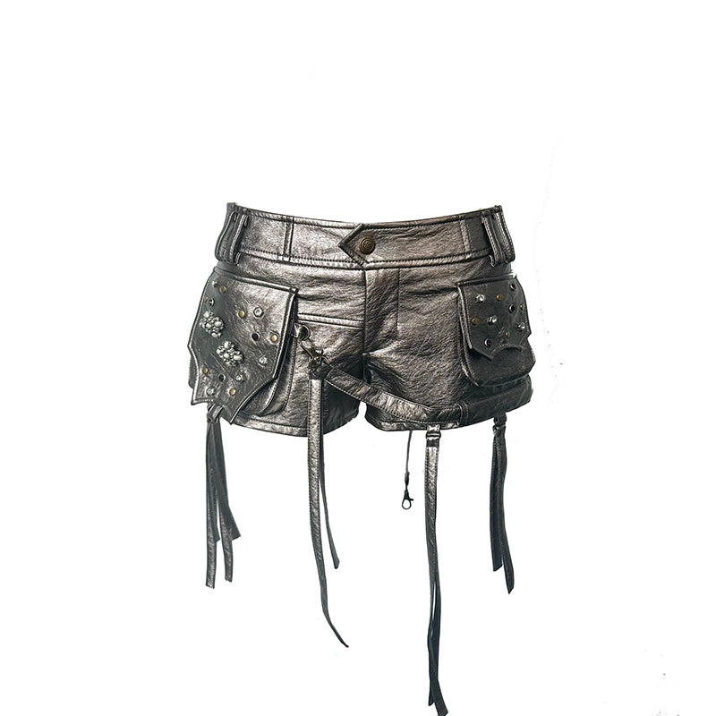 Metal Silver Leather Heavy Industry Riveted Low Waist Shorts