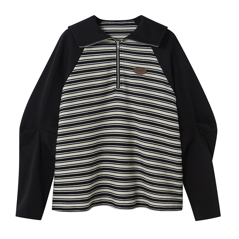 Striped Lapel - Black Hoodie with Zipper