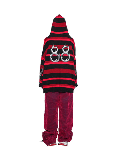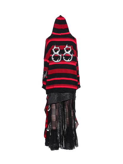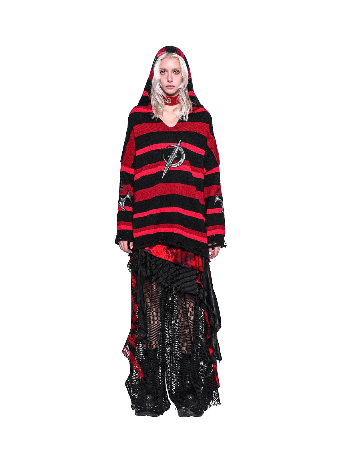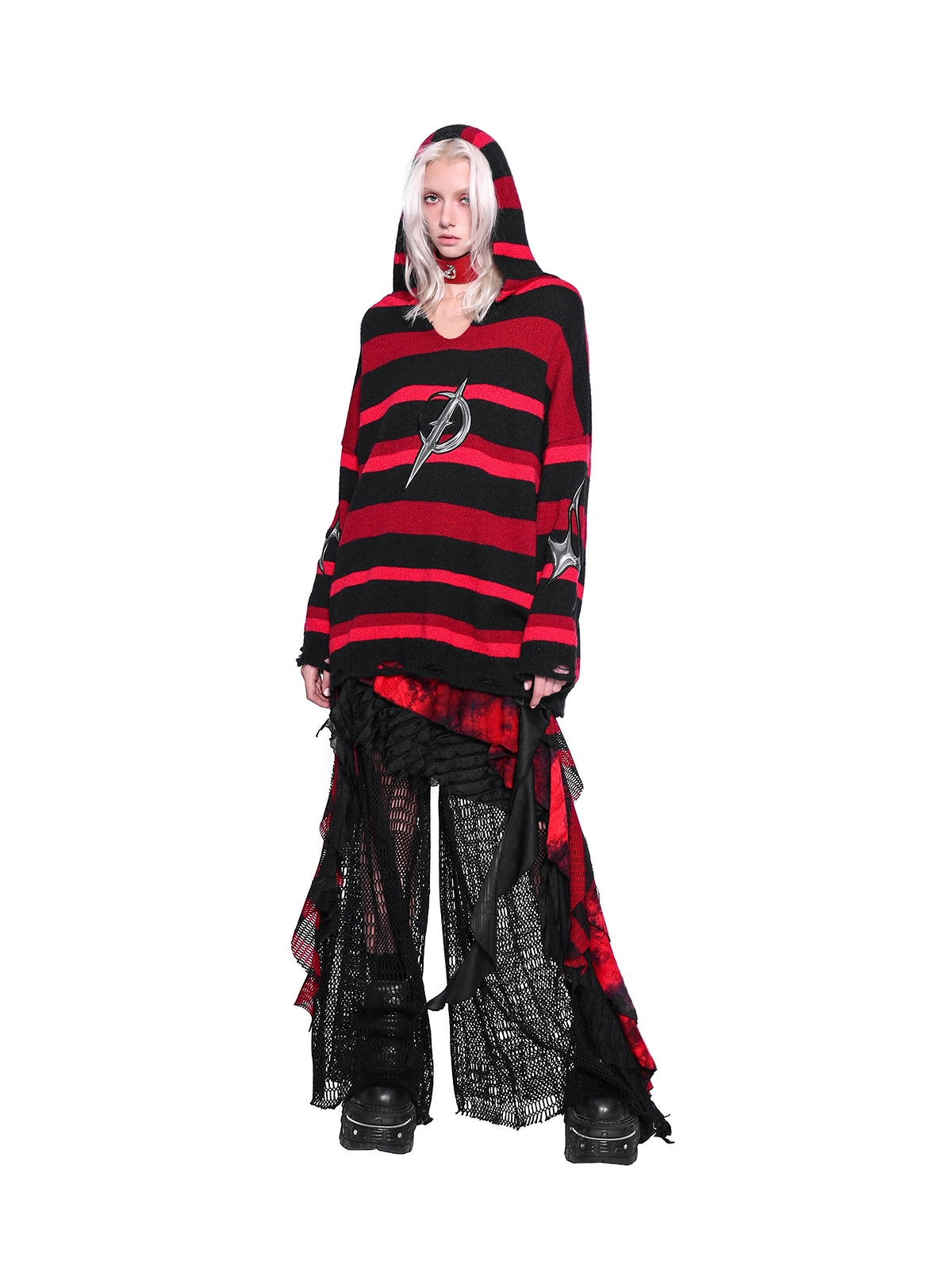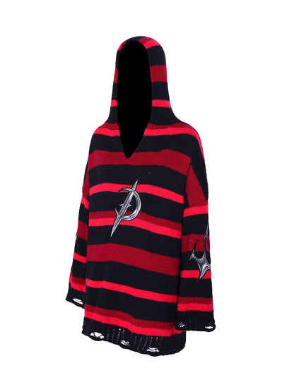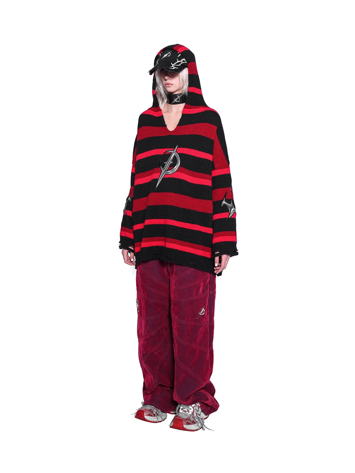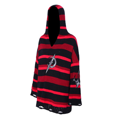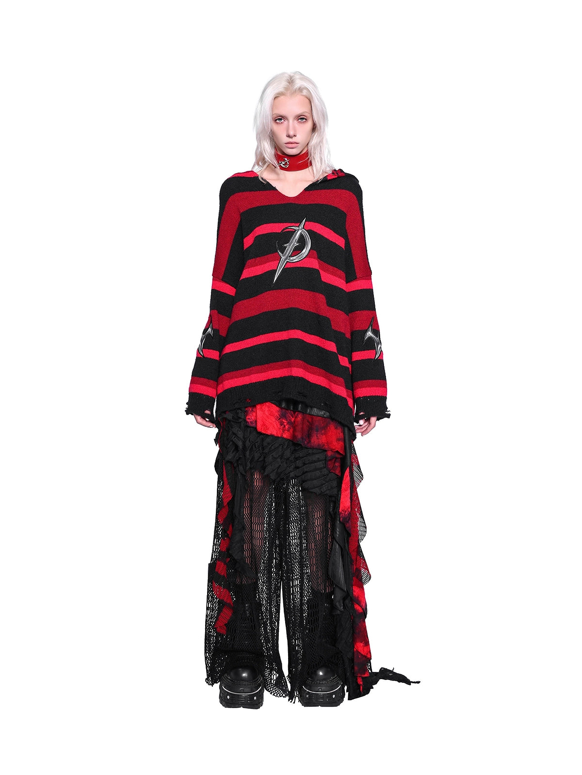 Red & Black Striped V-Neck Ripped Embroidered Y2K Punk Sweater