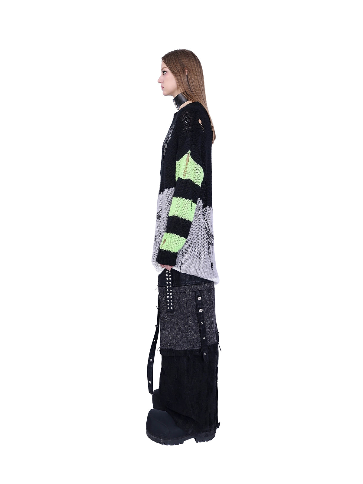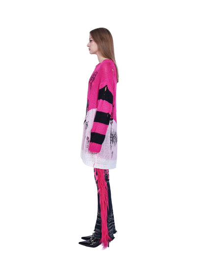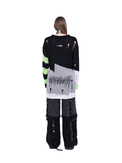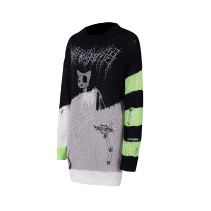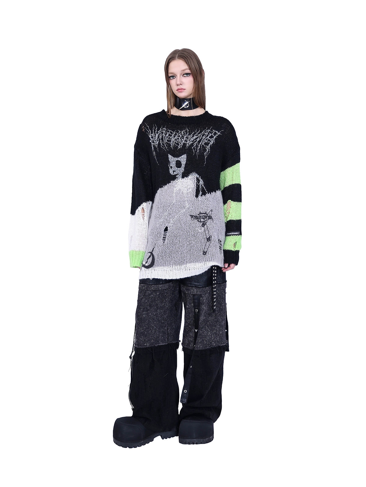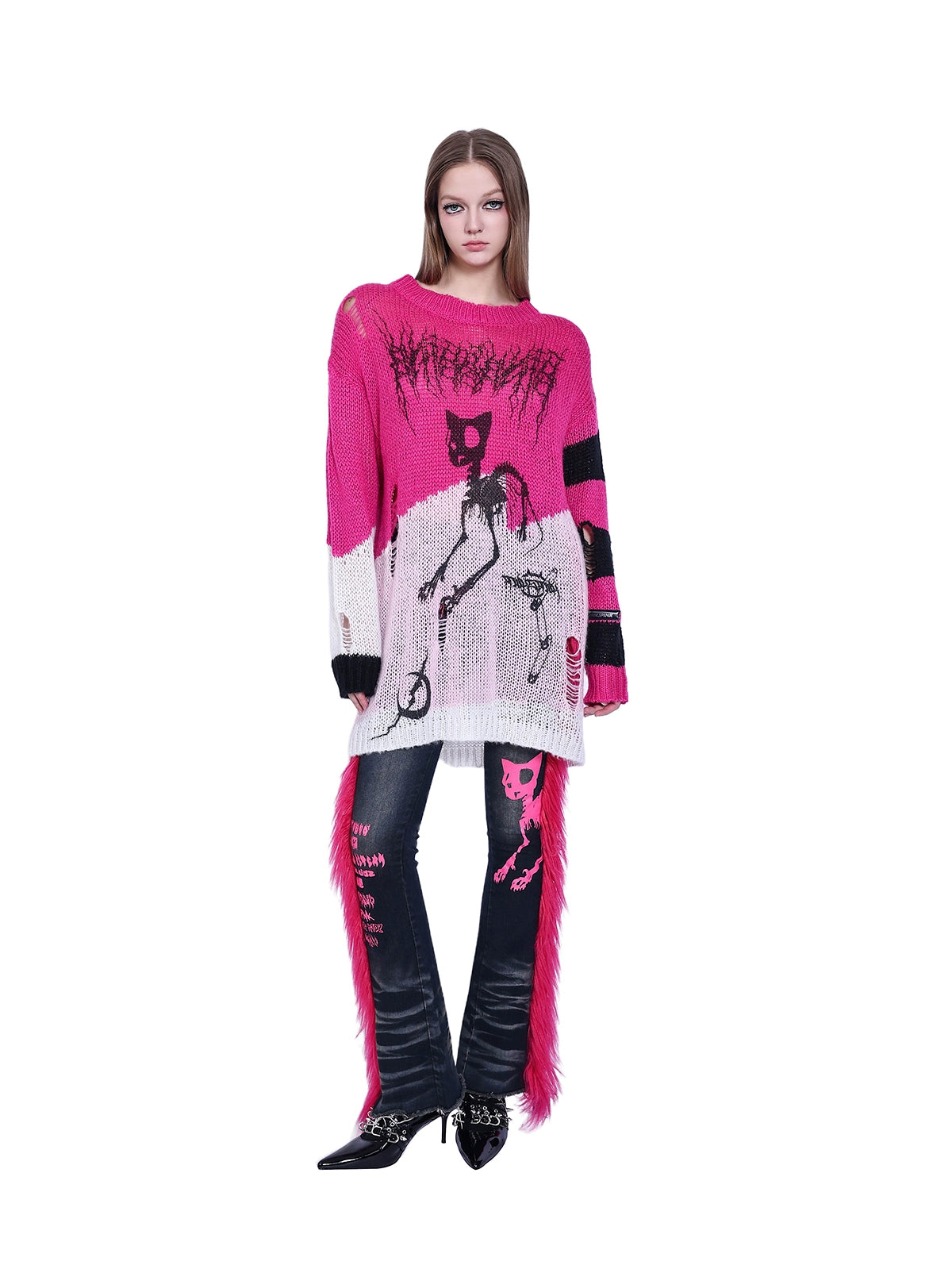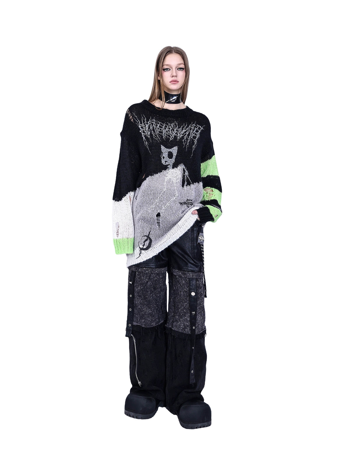 Sphinx Cat Misaligned Stitch Rock Y2K Ripped Sweater
