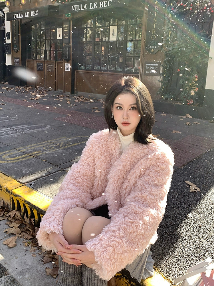 Pink Eco-Friendly Fur Coat - Women's Autumn/Winter Short Wool Curly Fit
