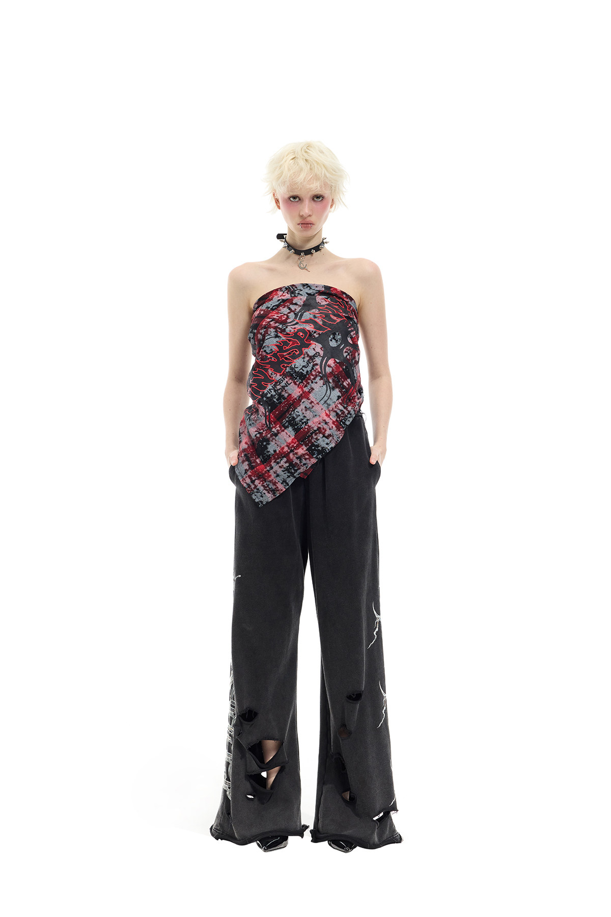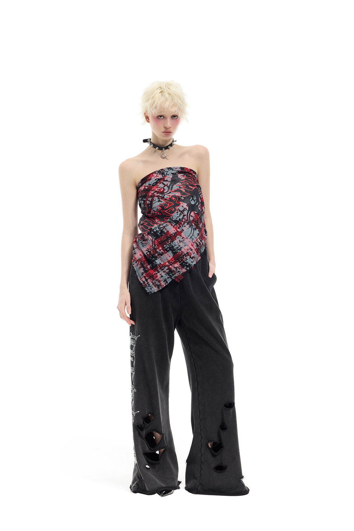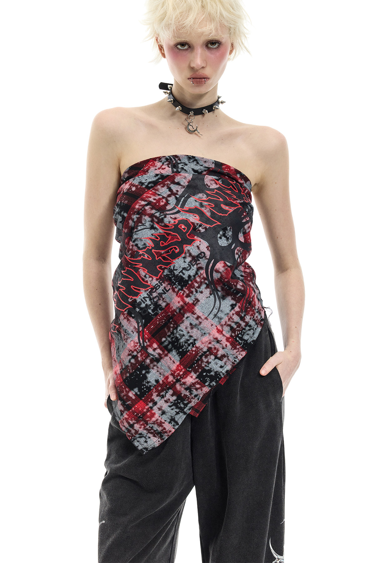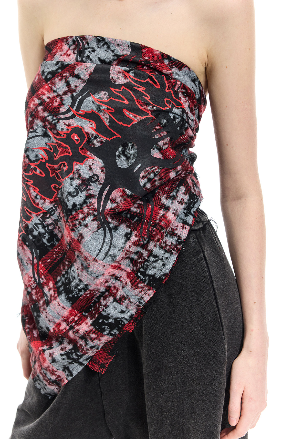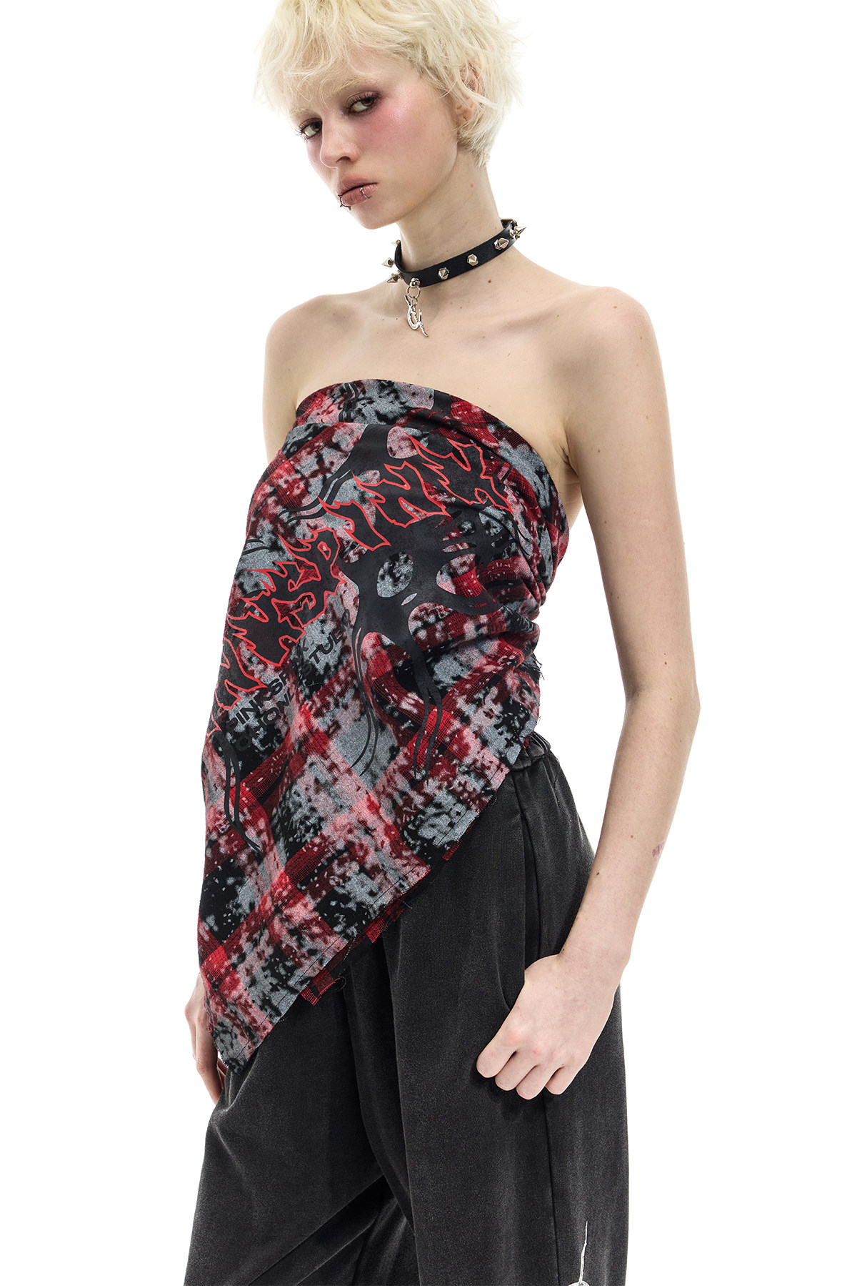 Spray-Painted Red Plaid Strapless Scarf – Unisex Y3K Statement Accessory