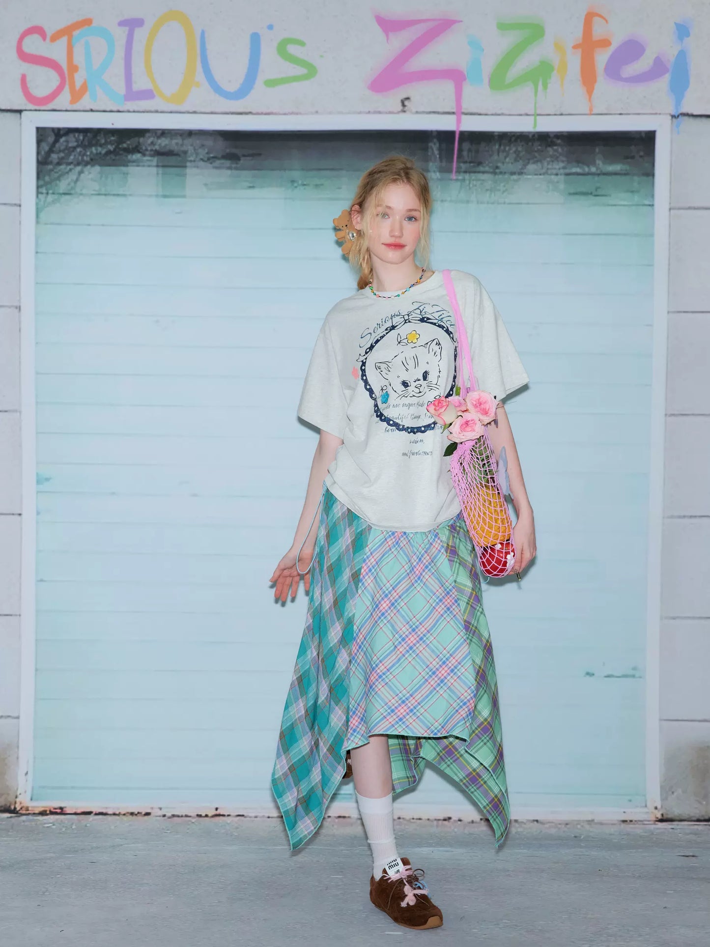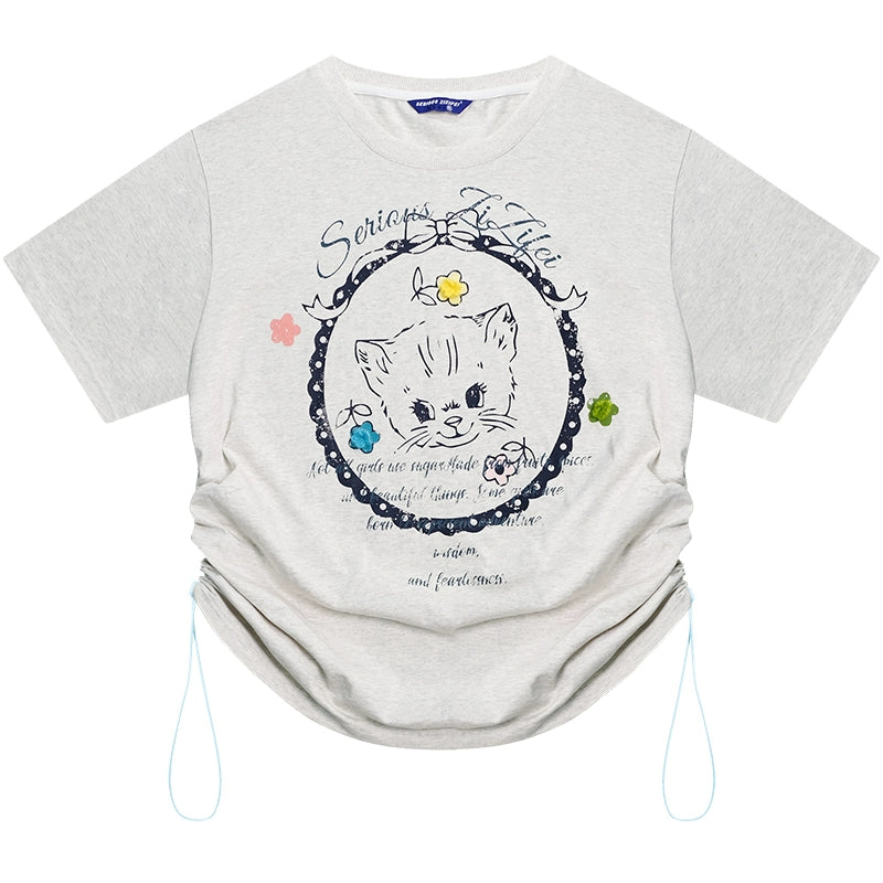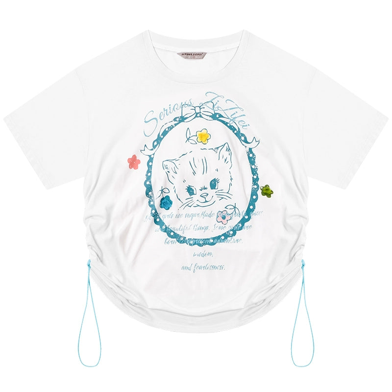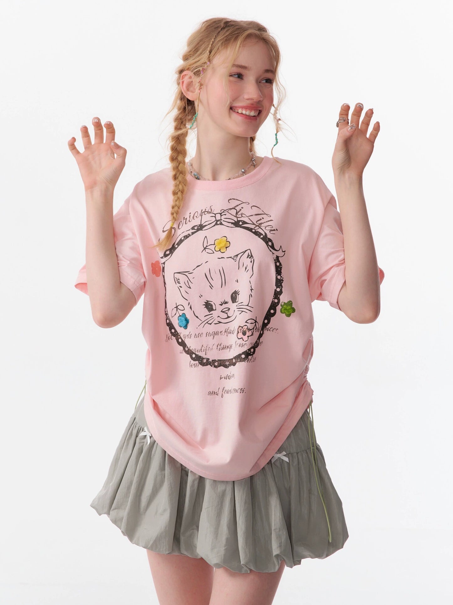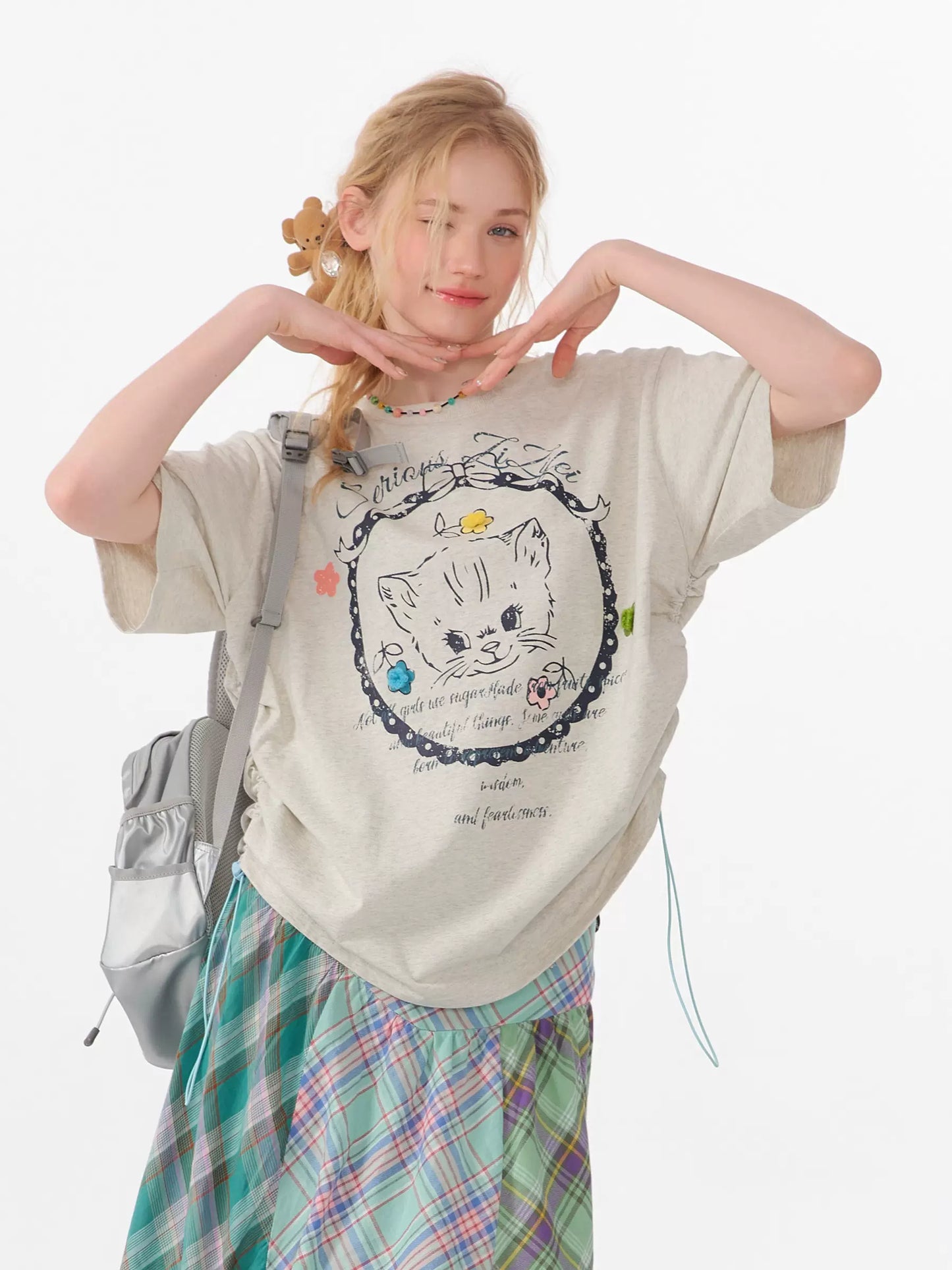 Cat Print Loose T-shirt | Drawstring Round Neck Short Sleeve for Summer