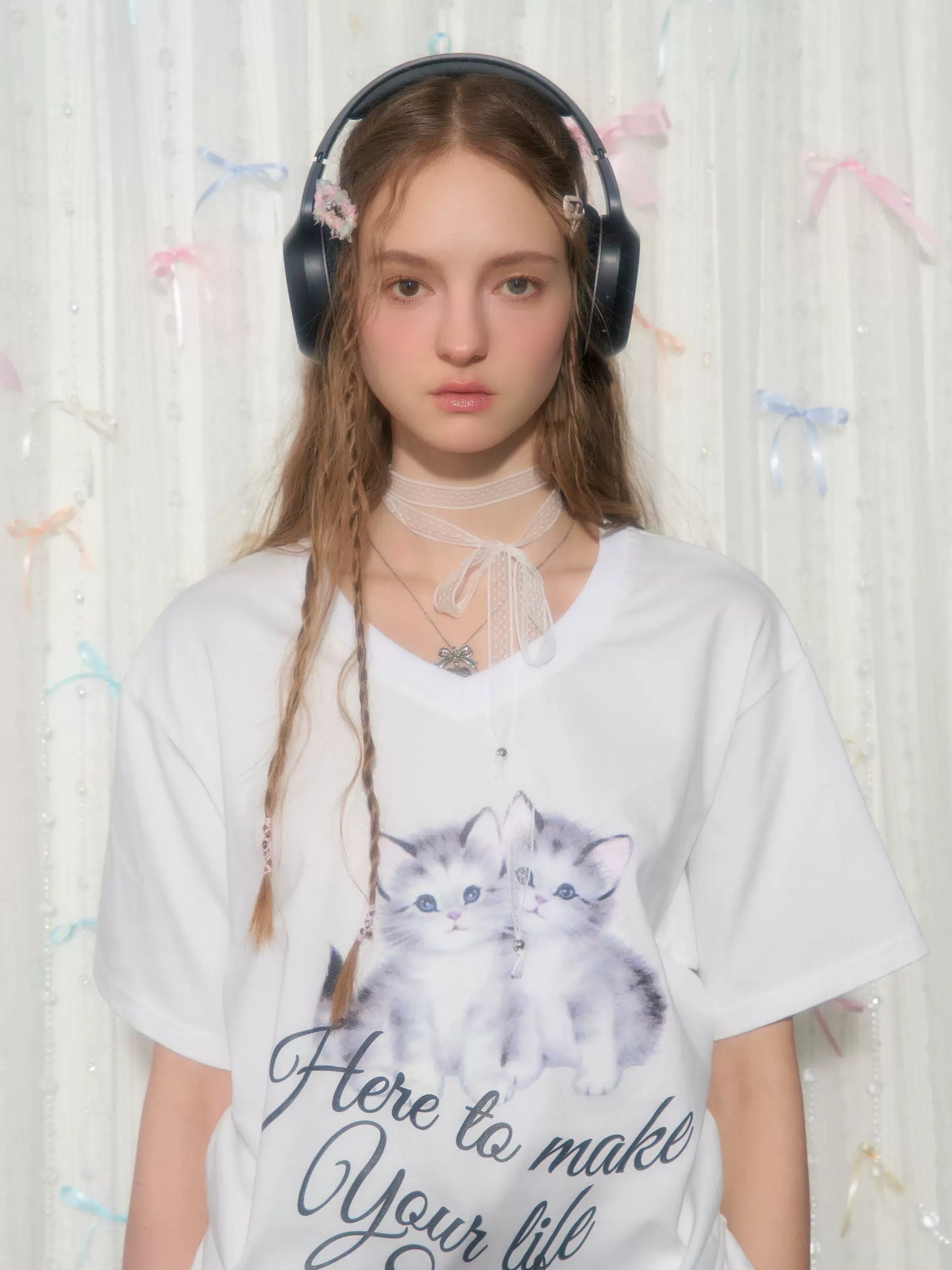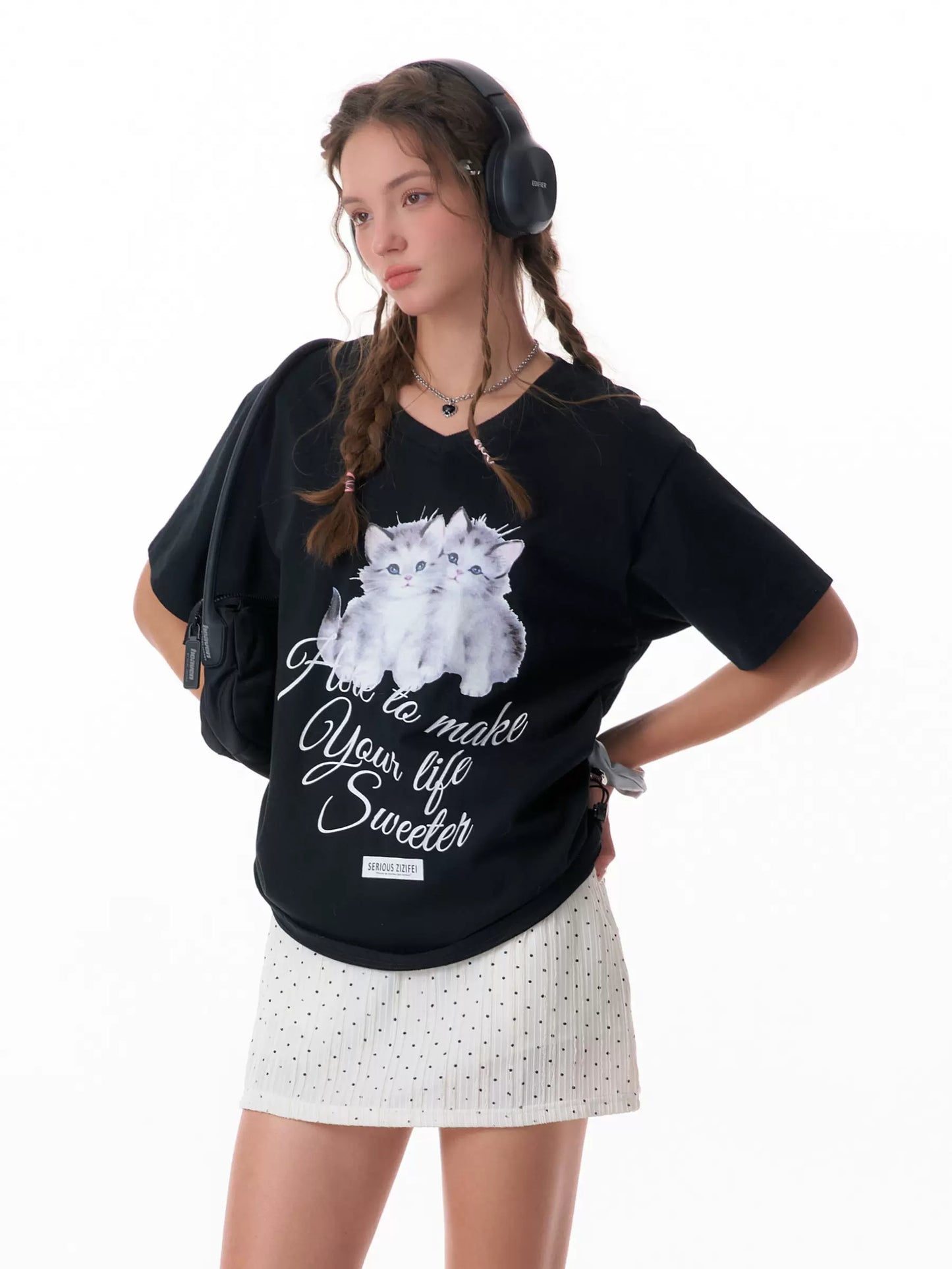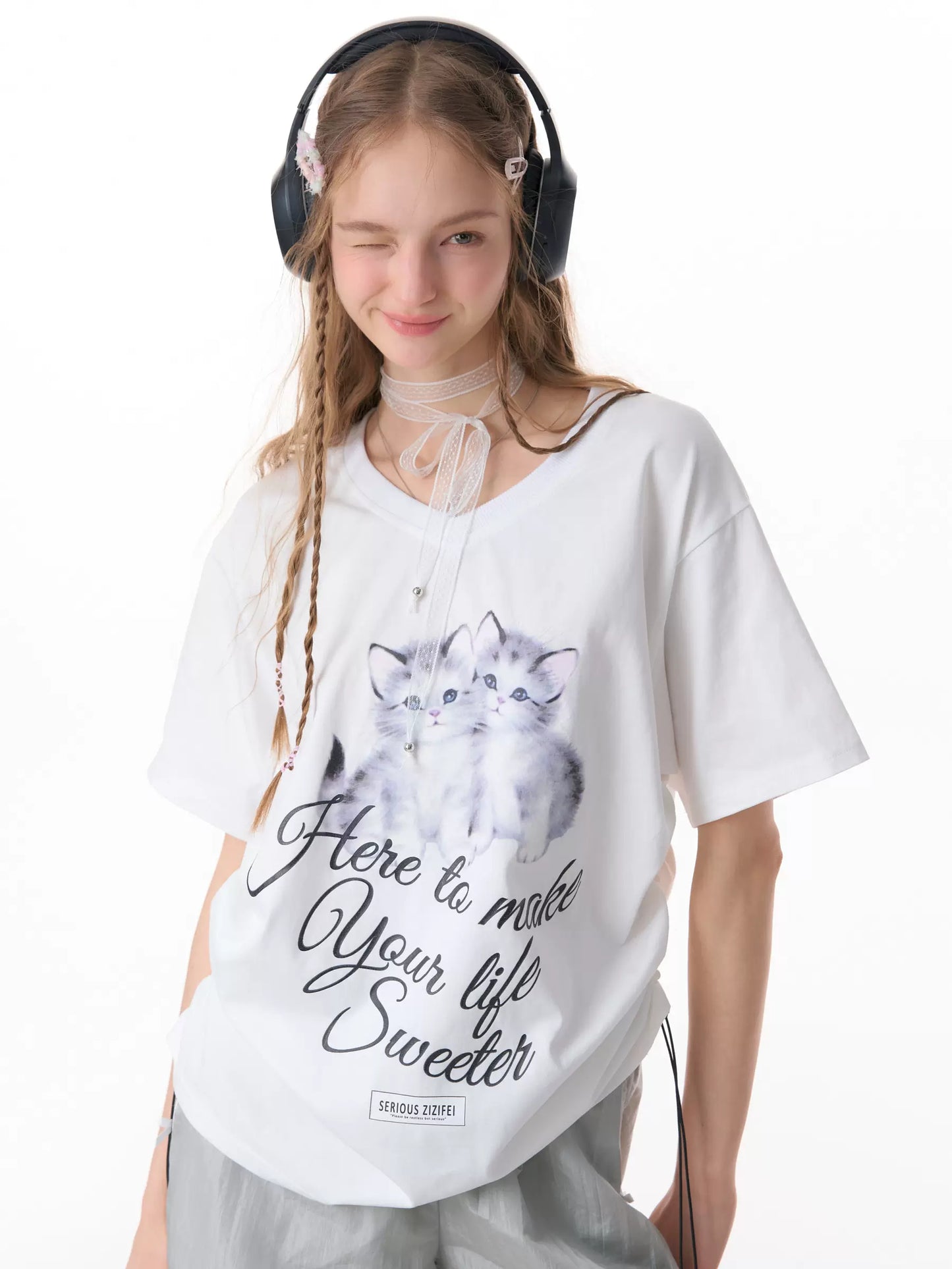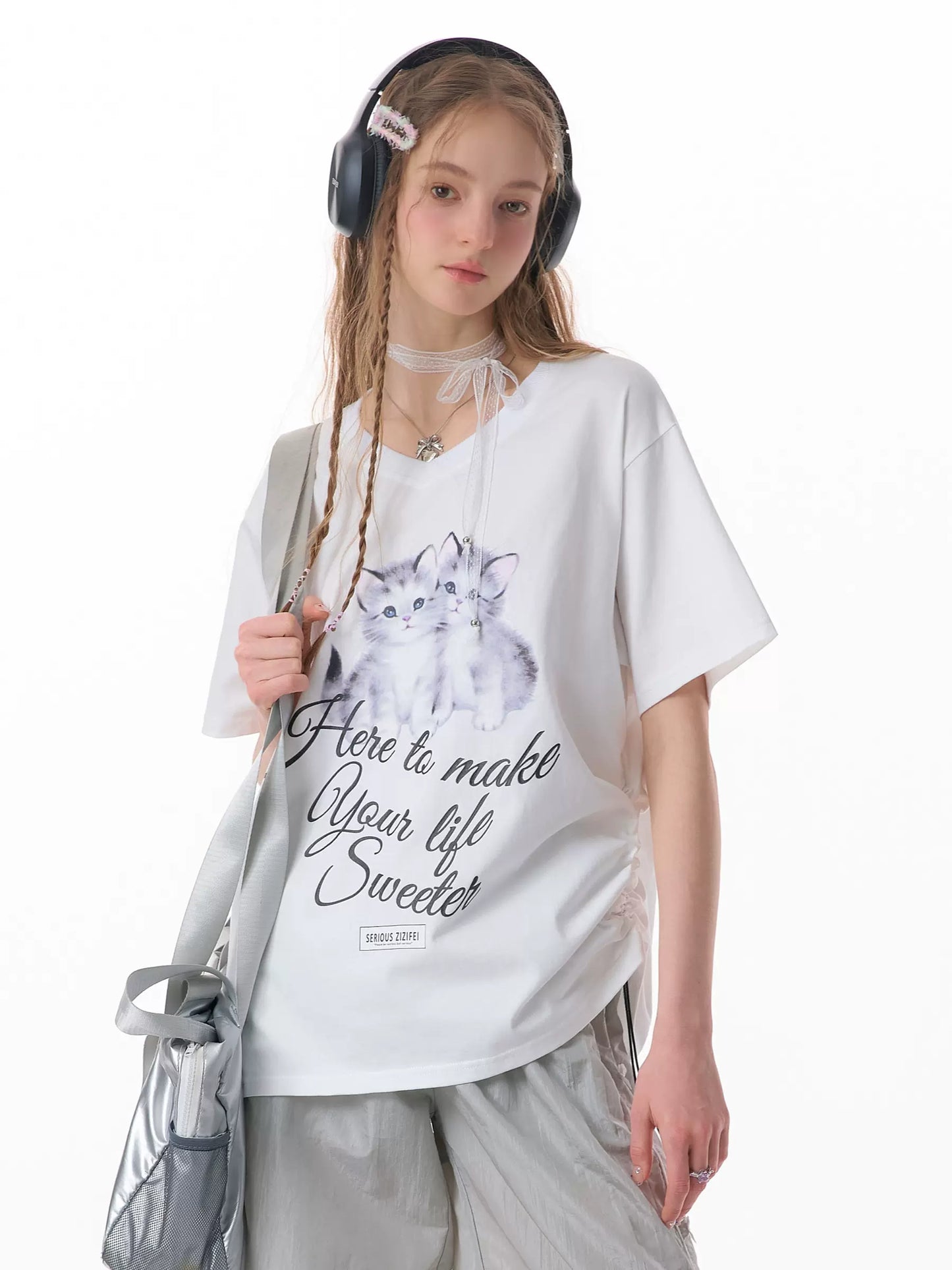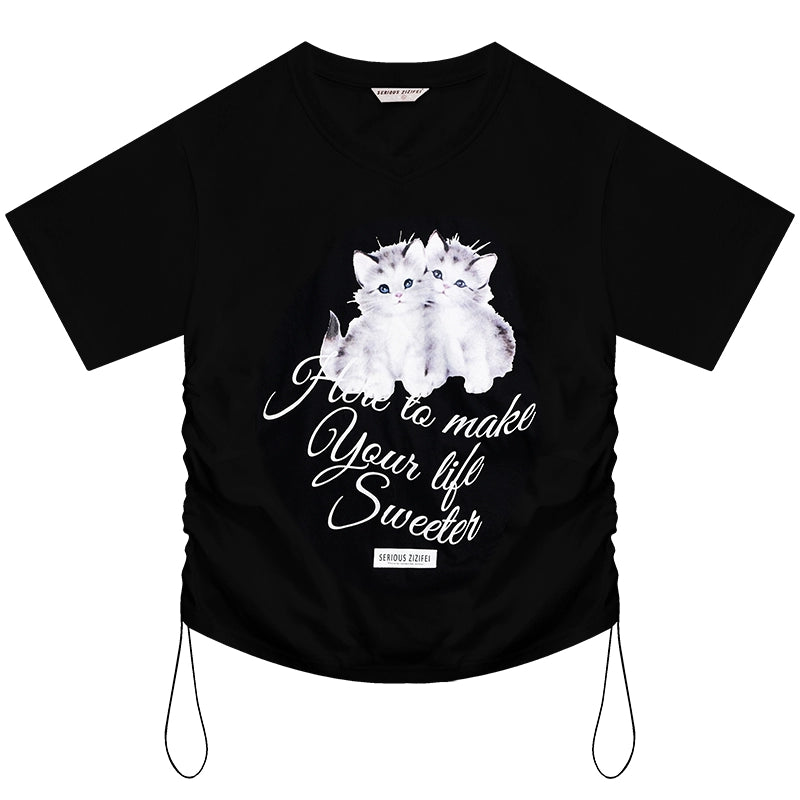 Cat Print V-neck Drawstring T-shirt | Loose Fit Summer Retro Design