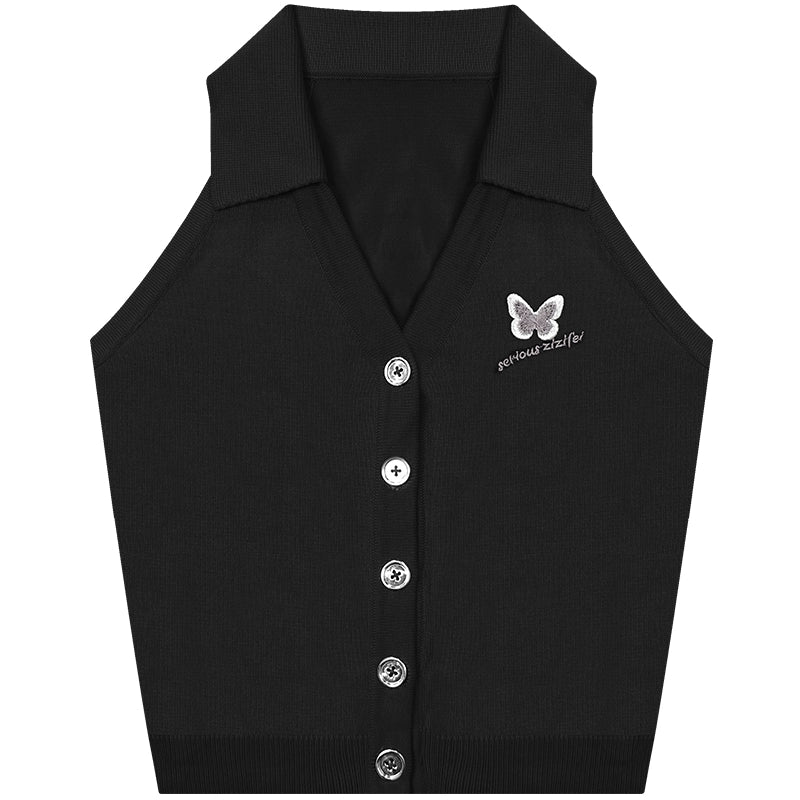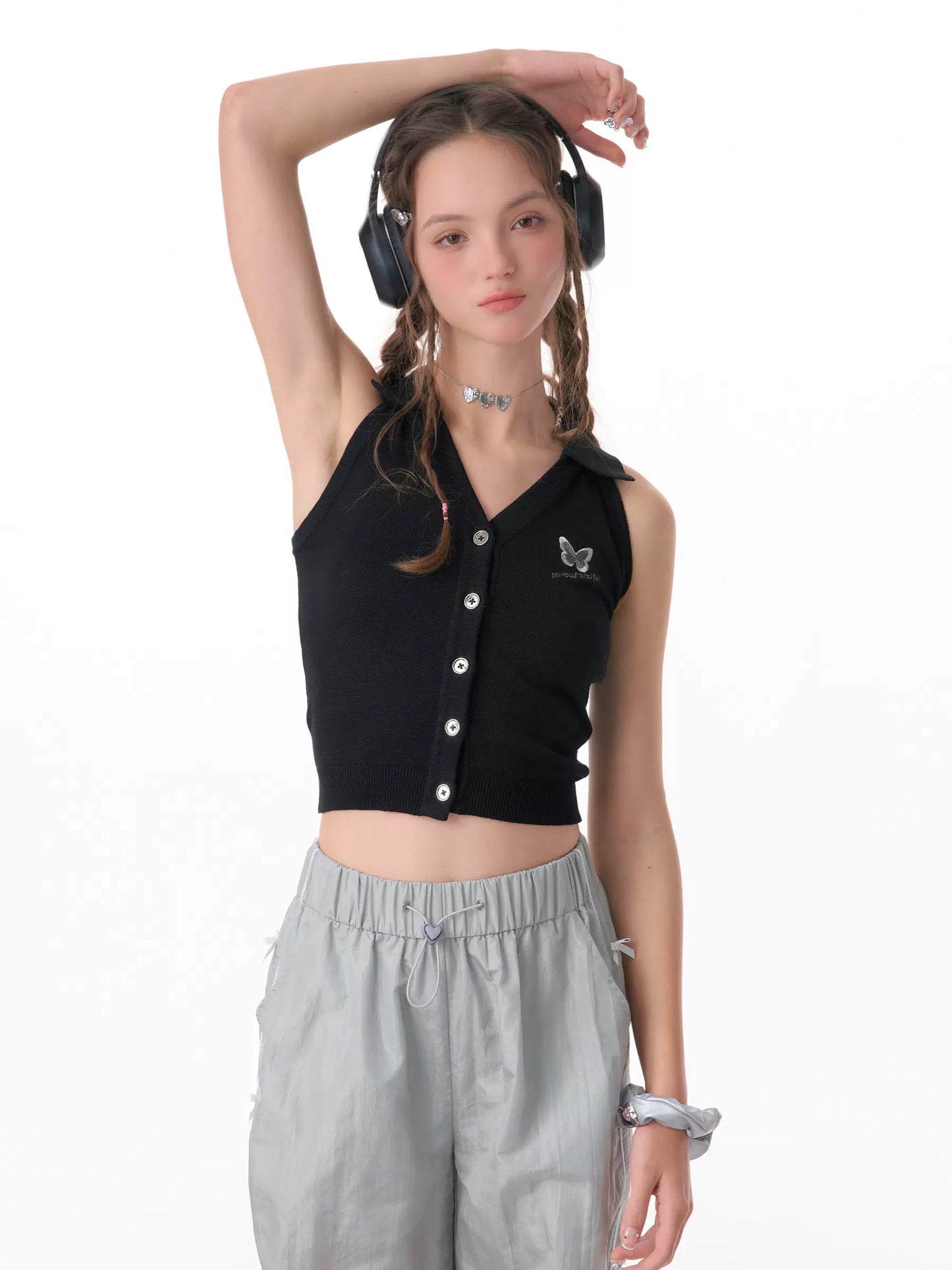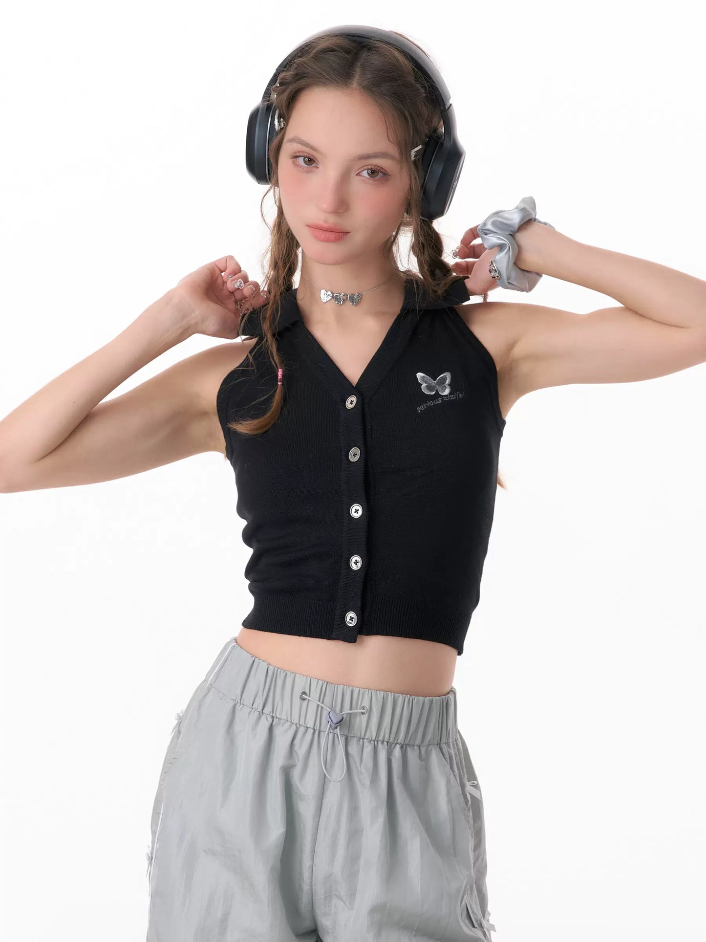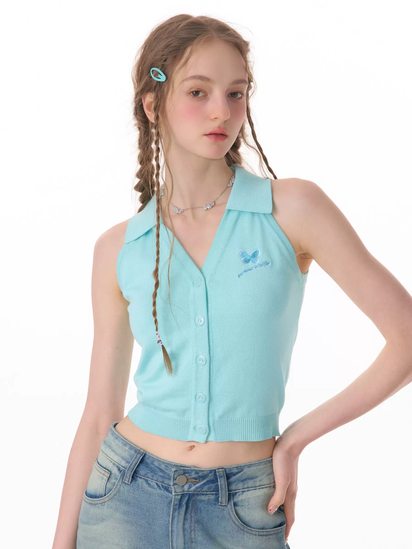 Butterfly Embroidered Wool Tank Top | Knitted Open Collar Design for Summer