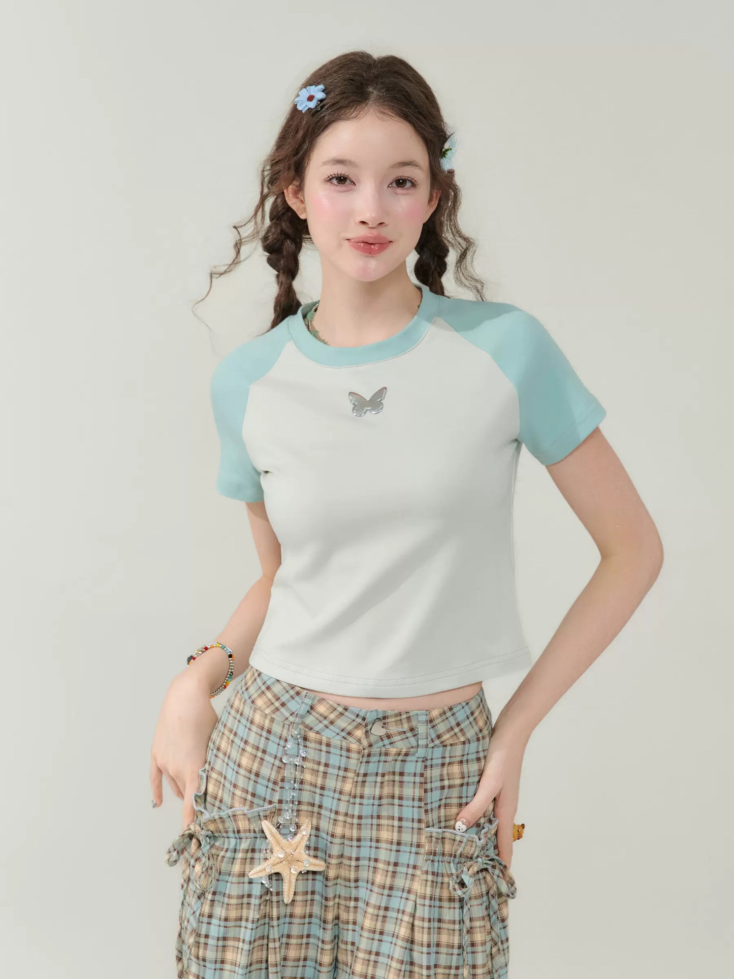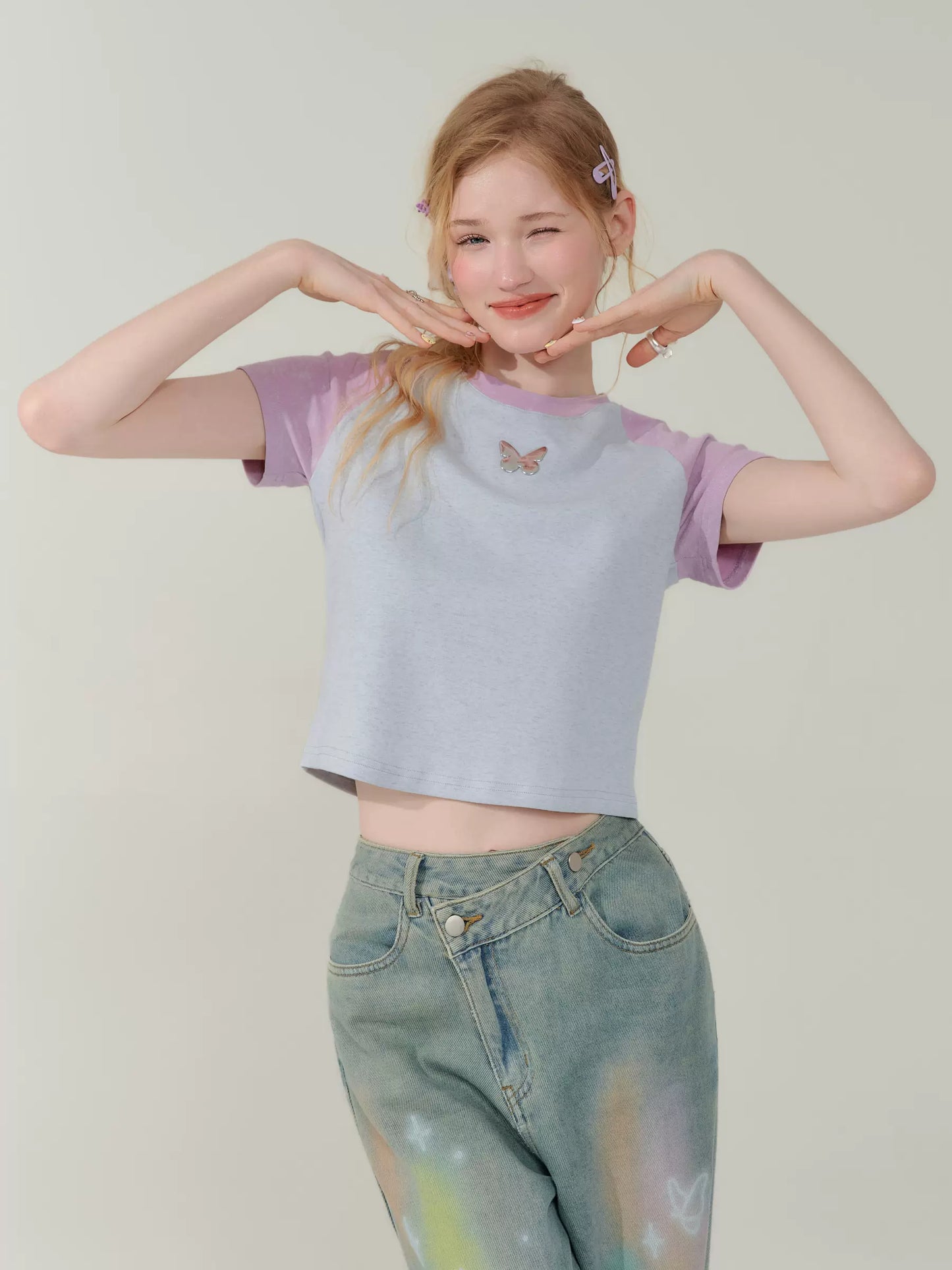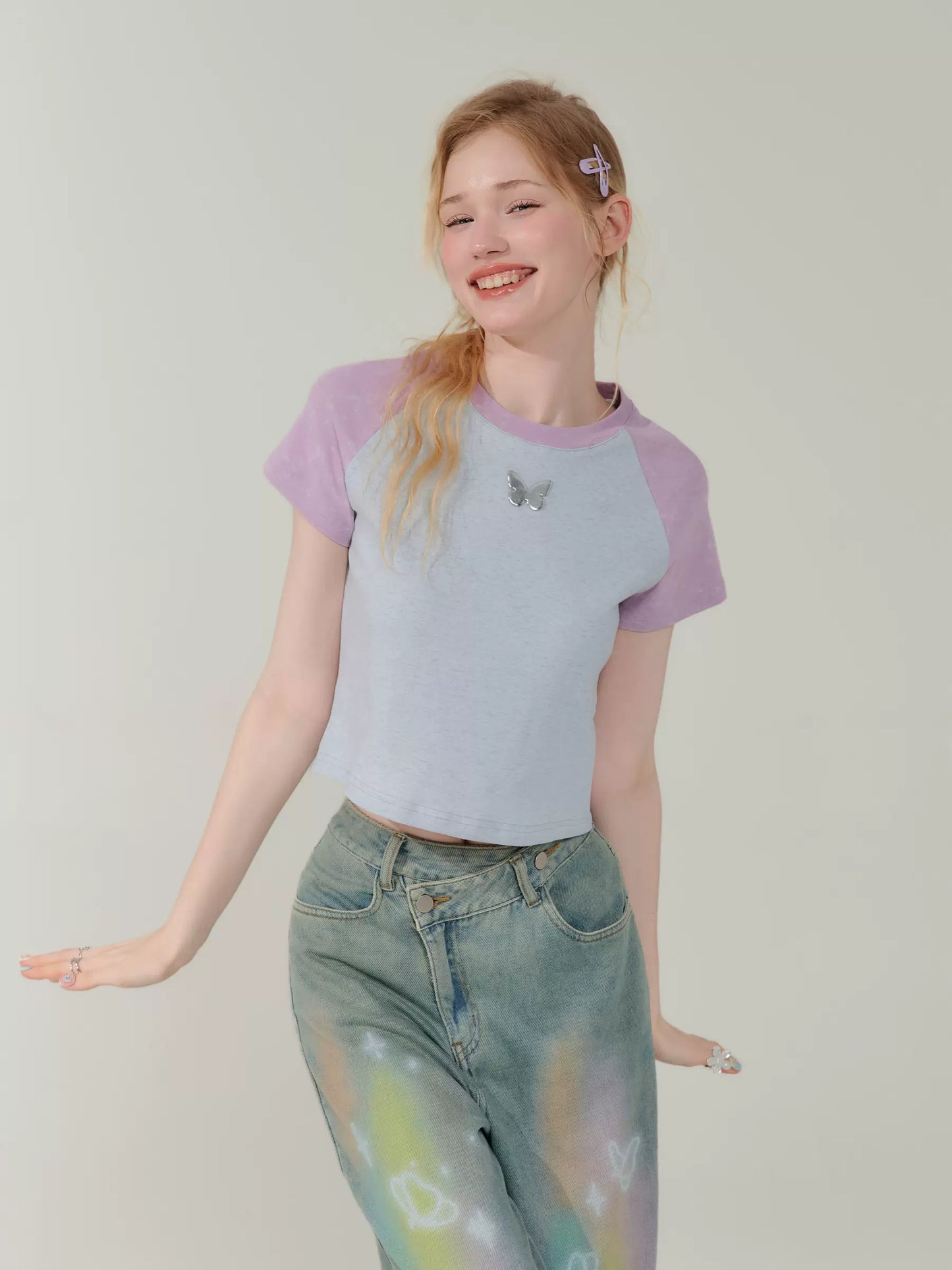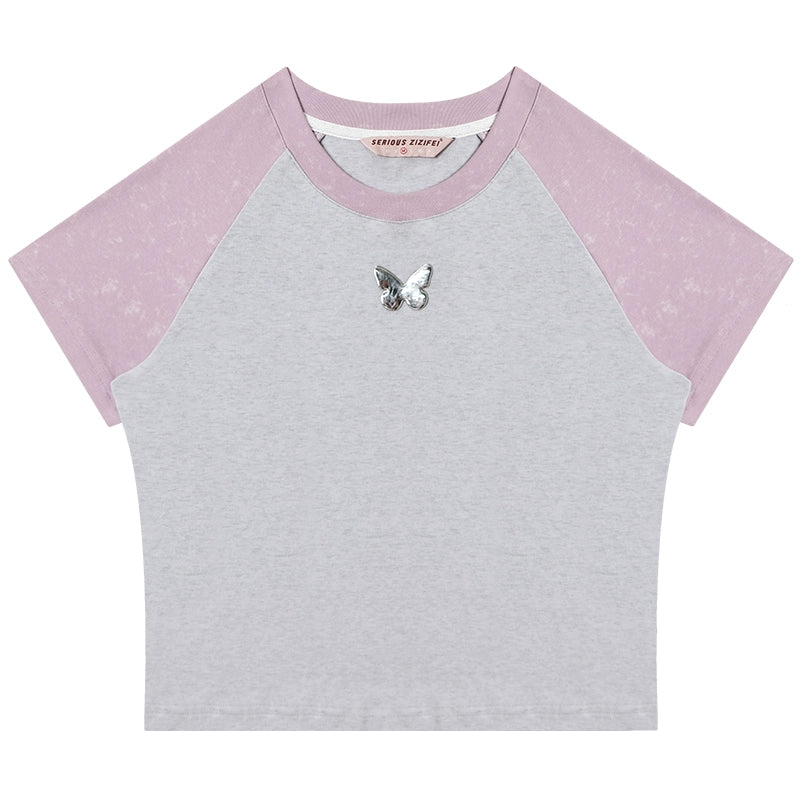 Contrast Stitch Raglan Sleeve T-shirt | Metal Butterfly Short Sleeve for Summer