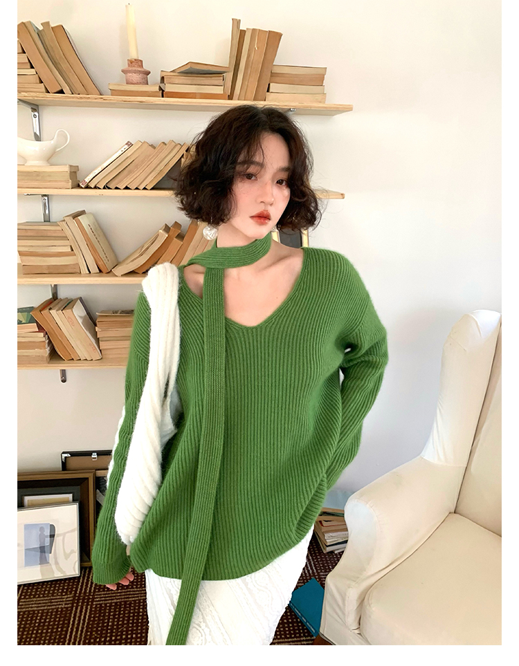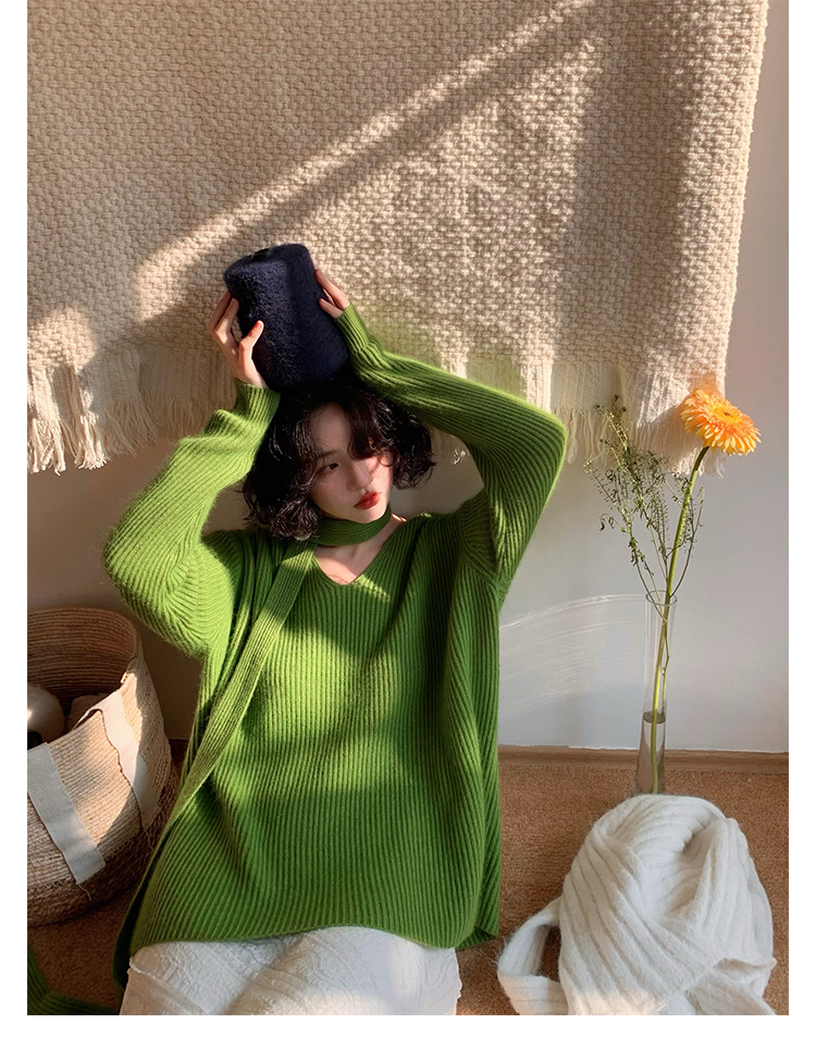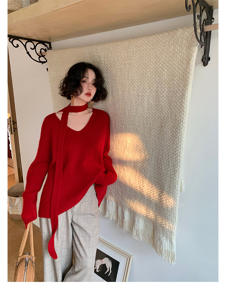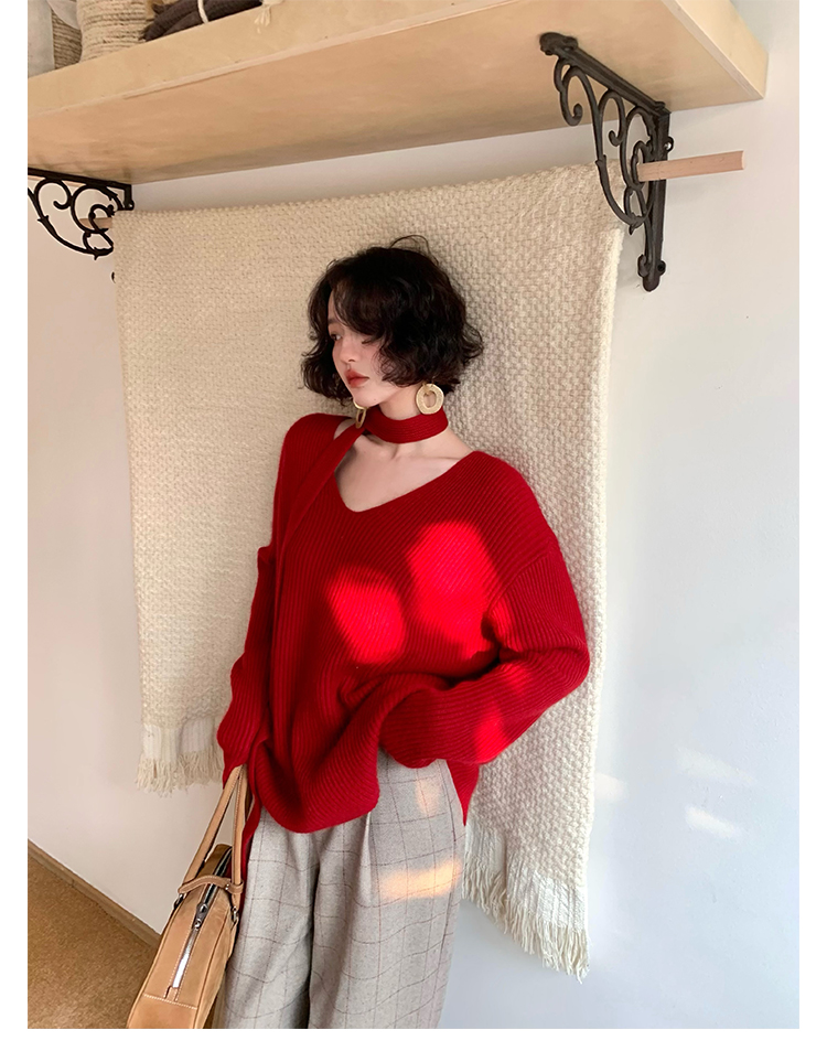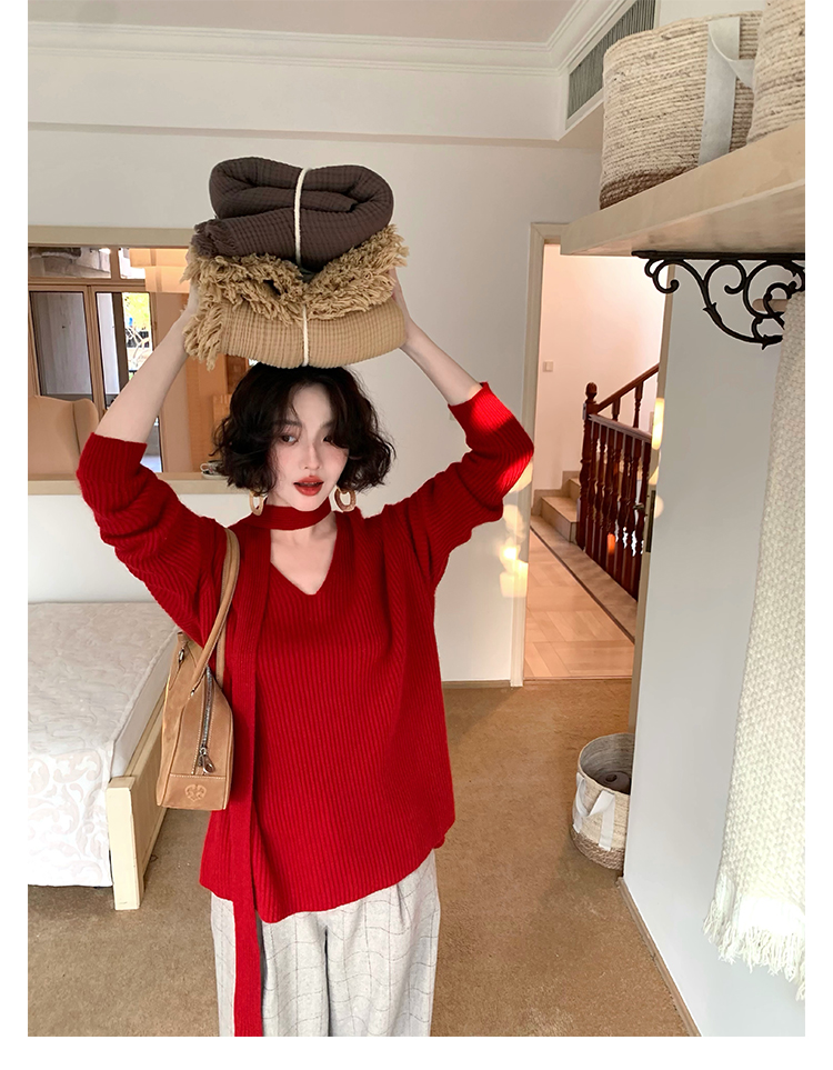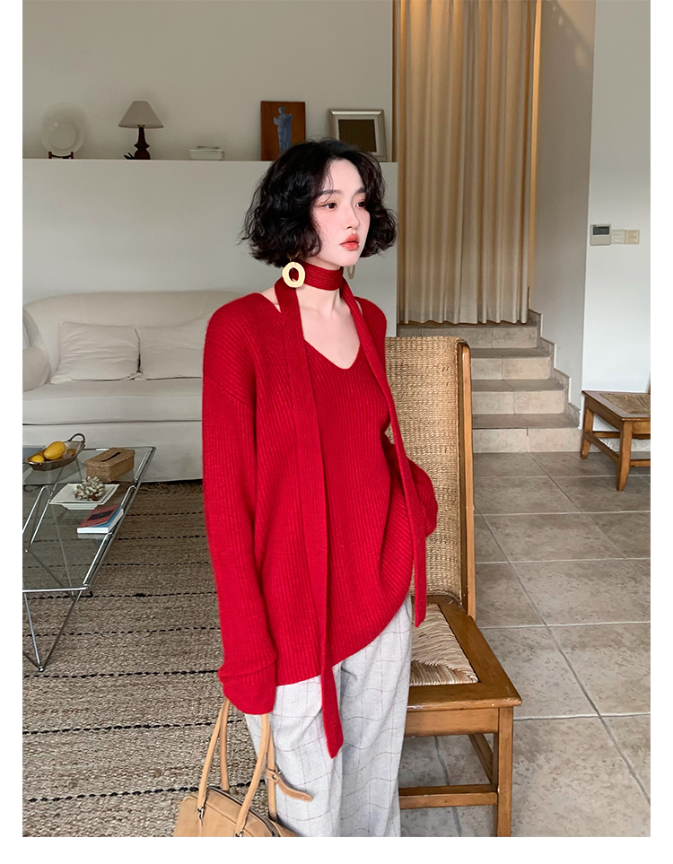 V-Neck Raccoon Velvet Base Sweater with Scarf (Strawberry Jam)
