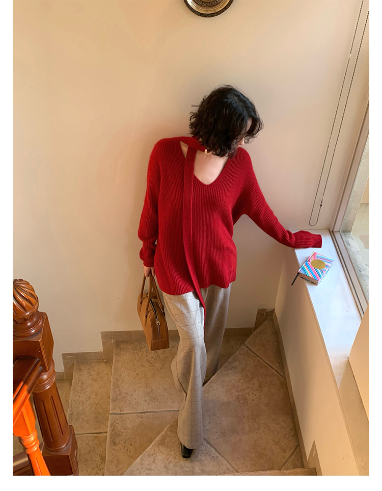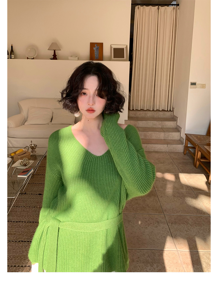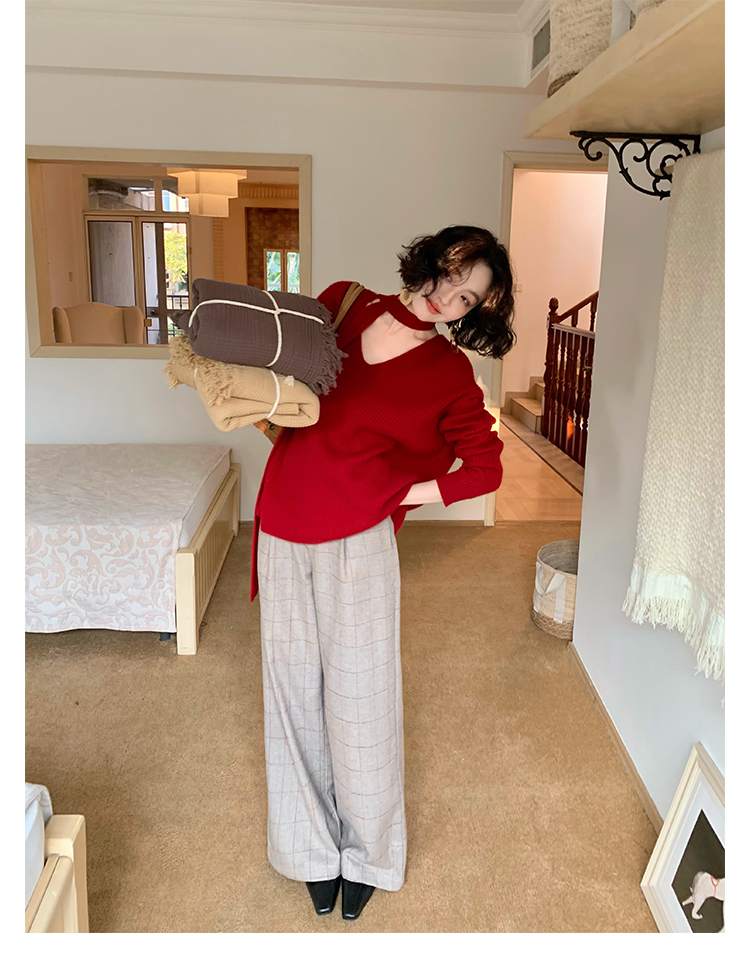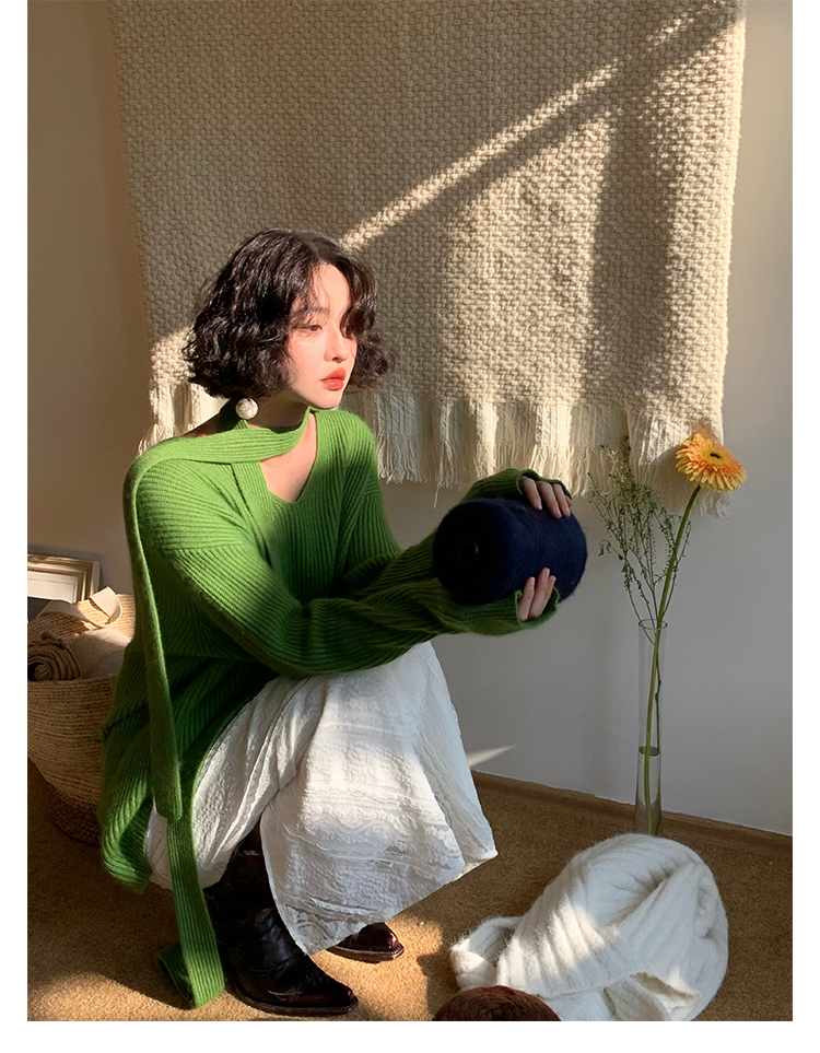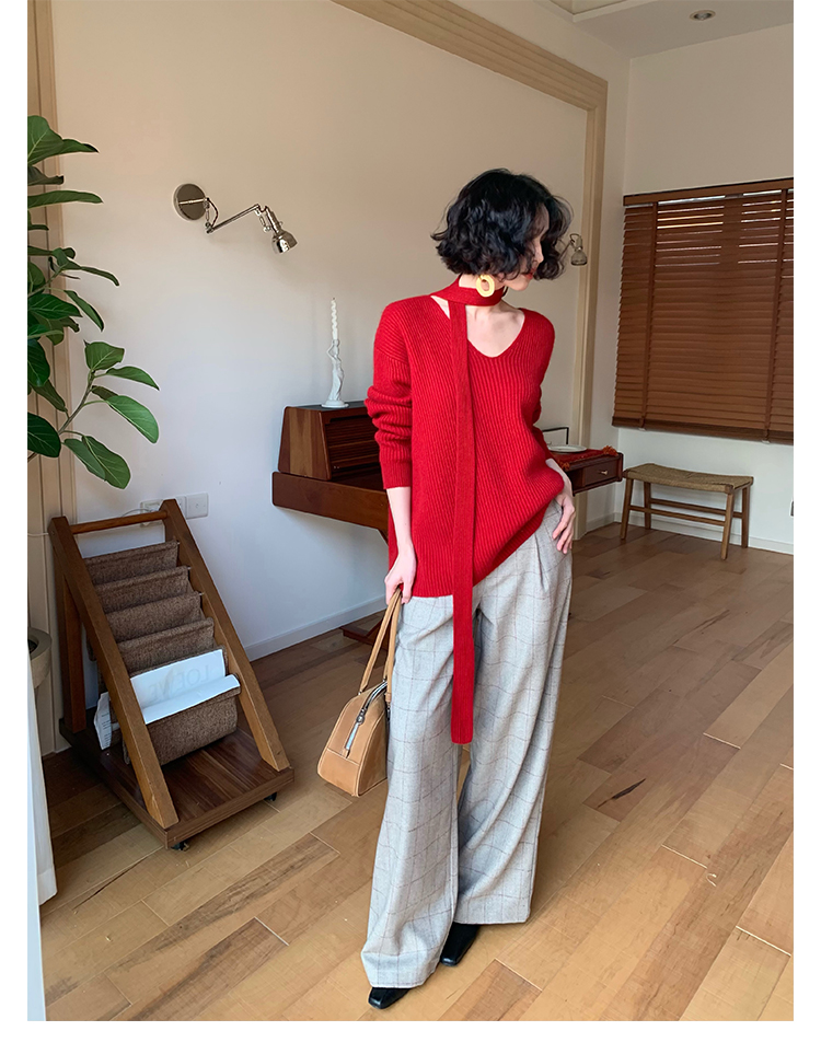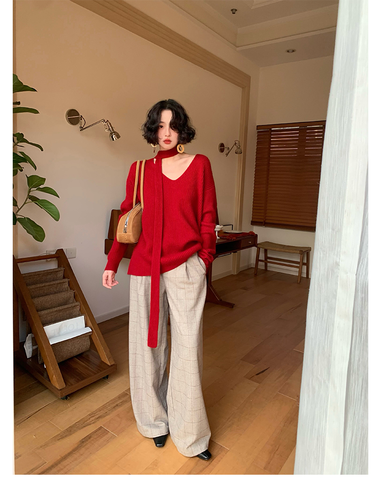 V-Neck Raccoon Velvet Base Sweater with Scarf (Strawberry Jam)