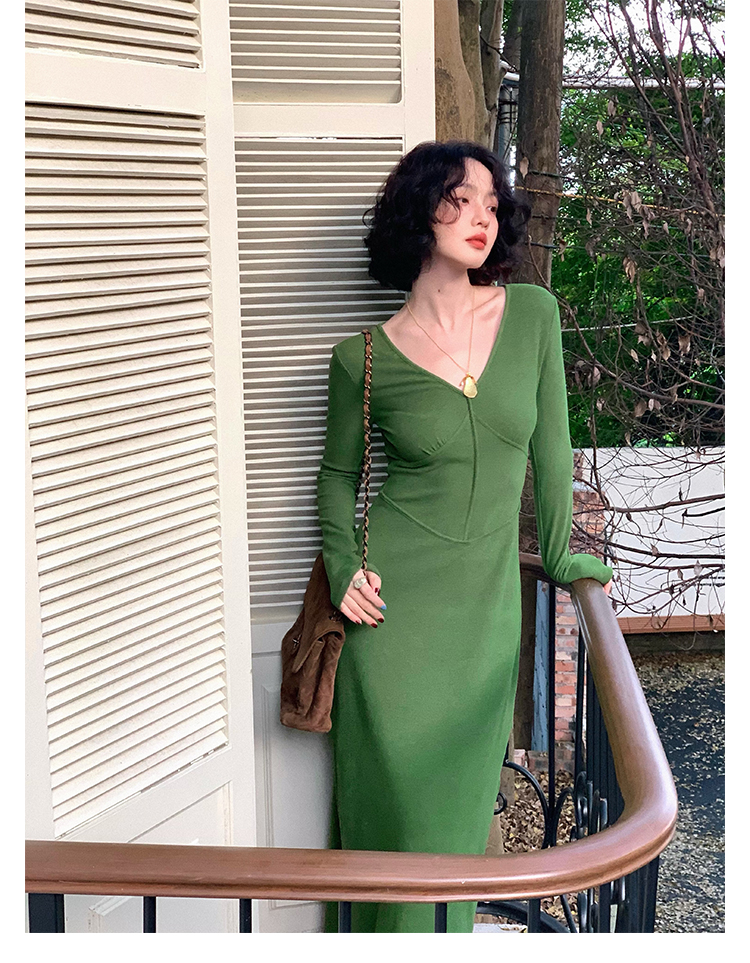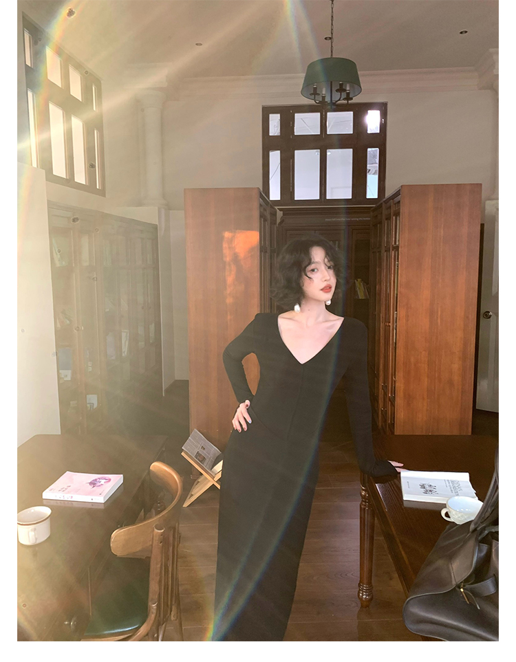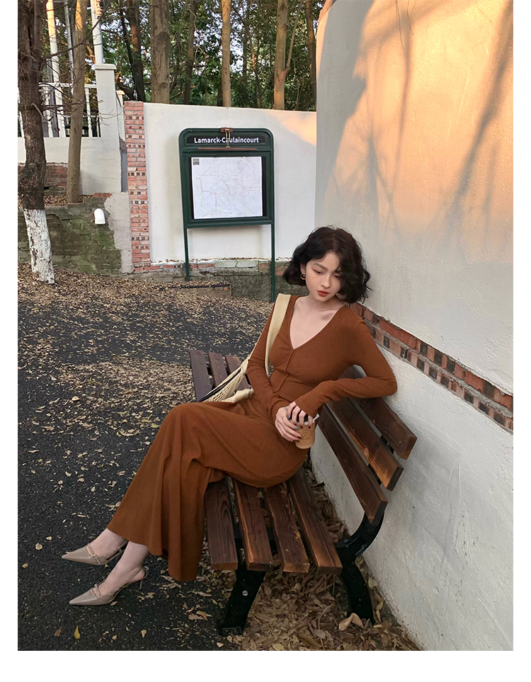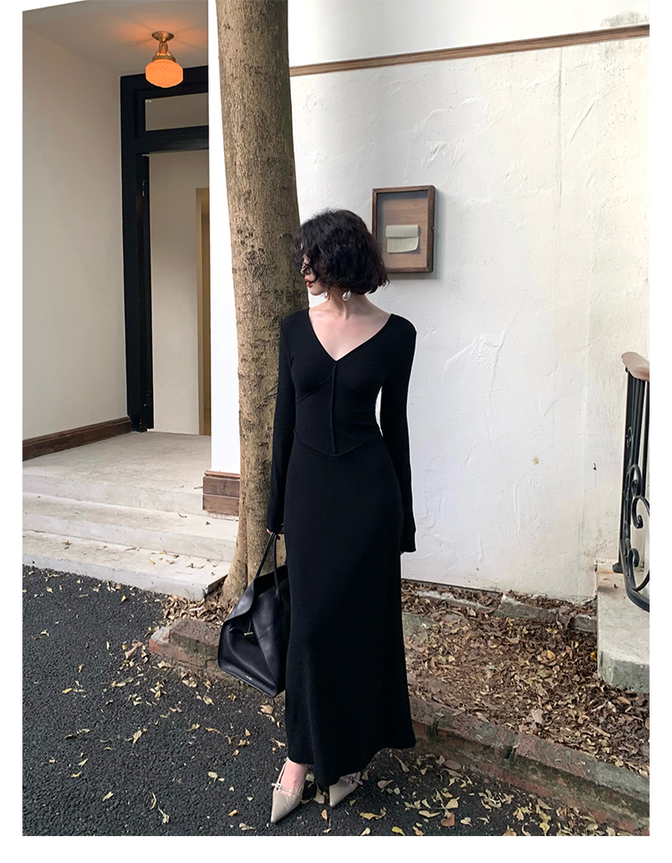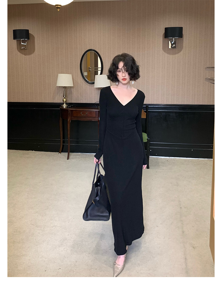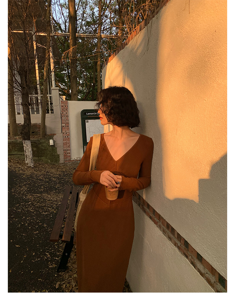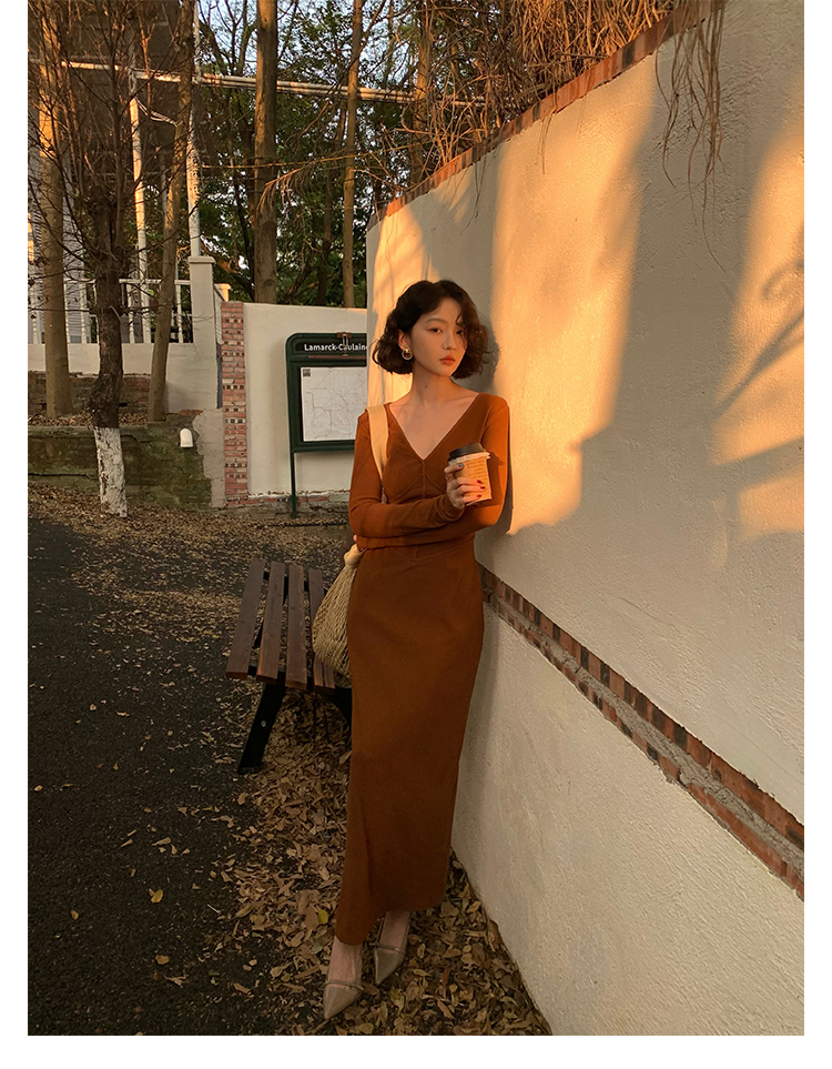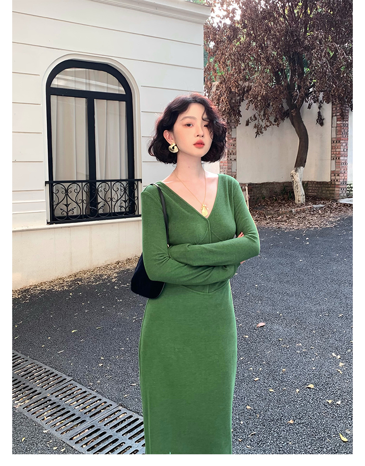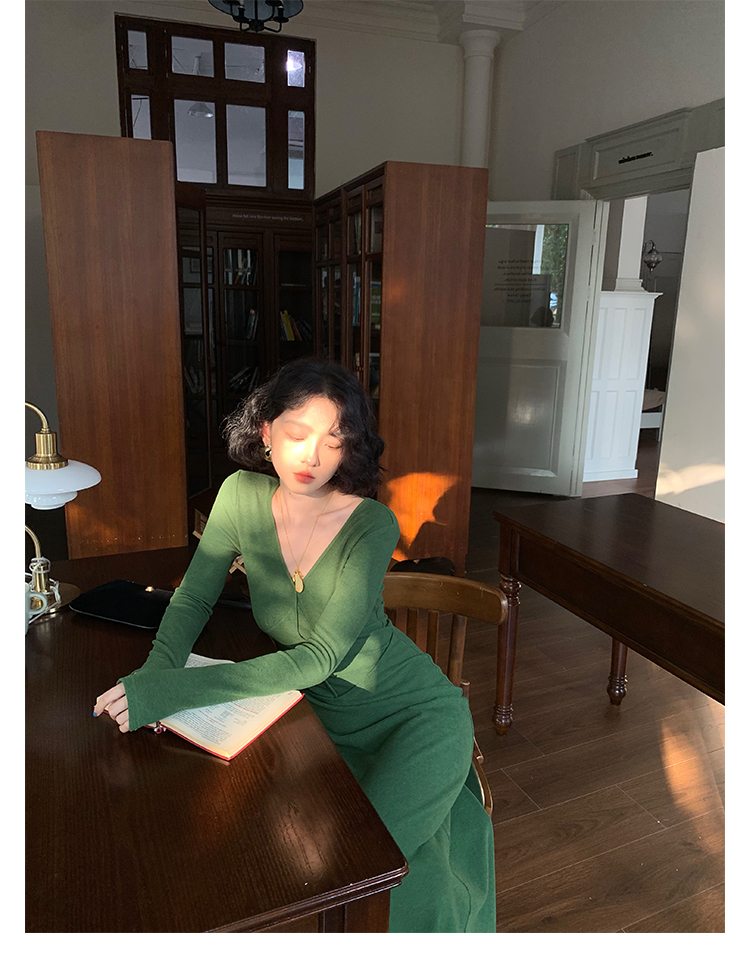 Shirred V-Neck Long Knitted Dress – Double 11 Chic Style