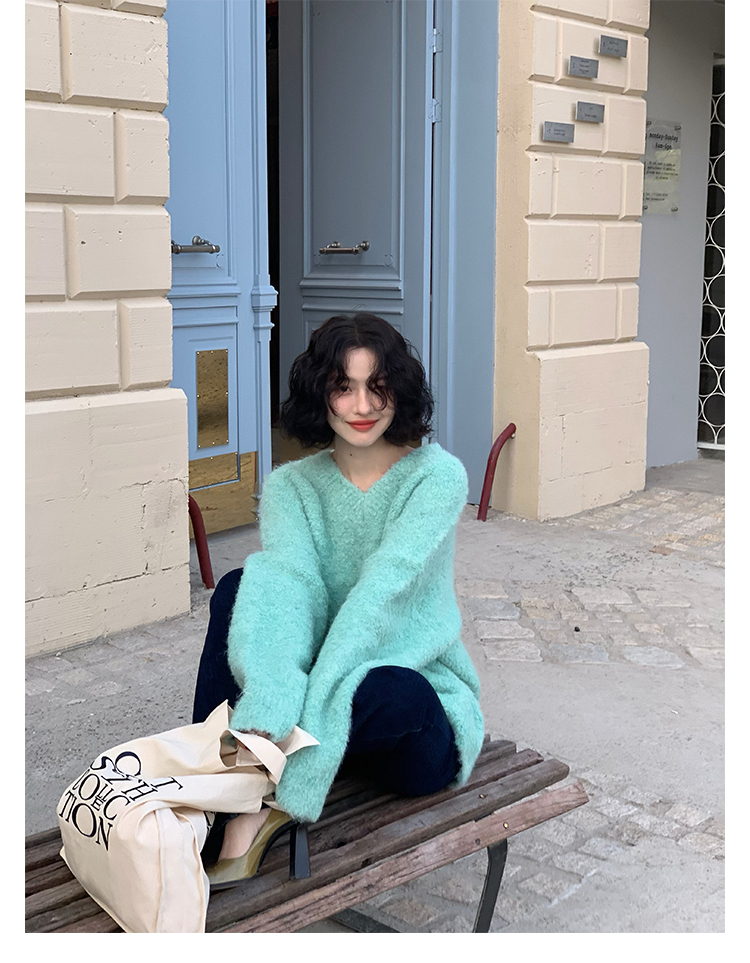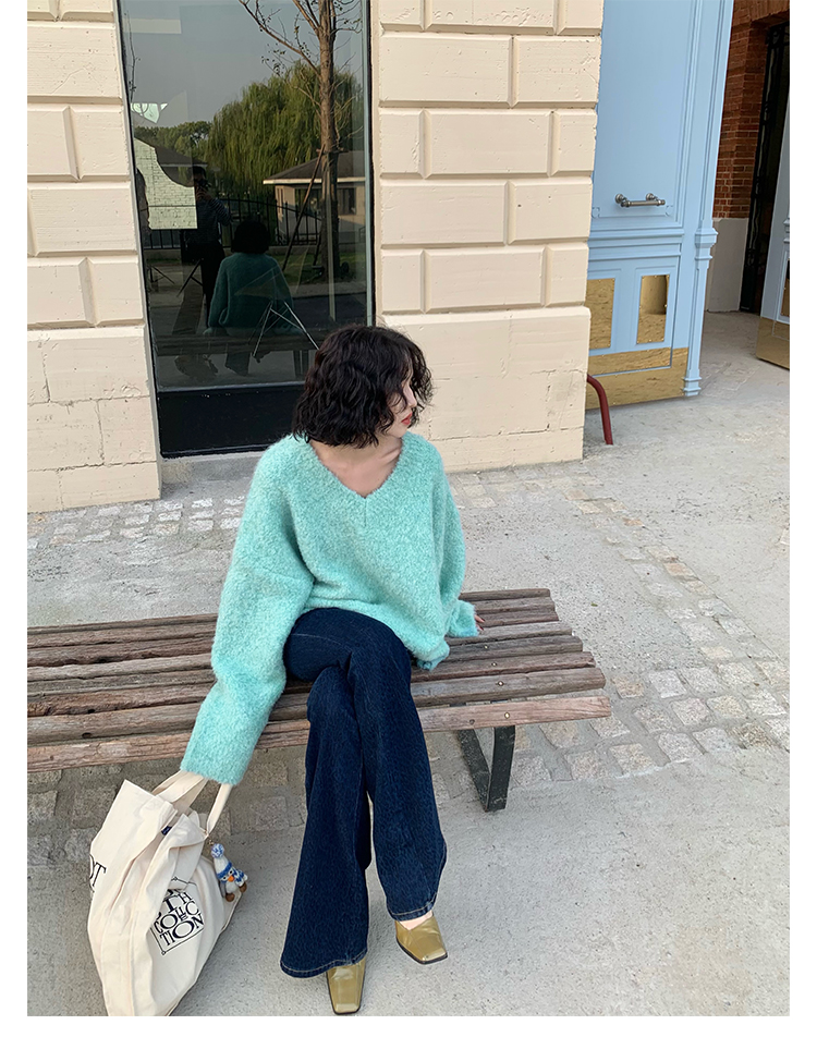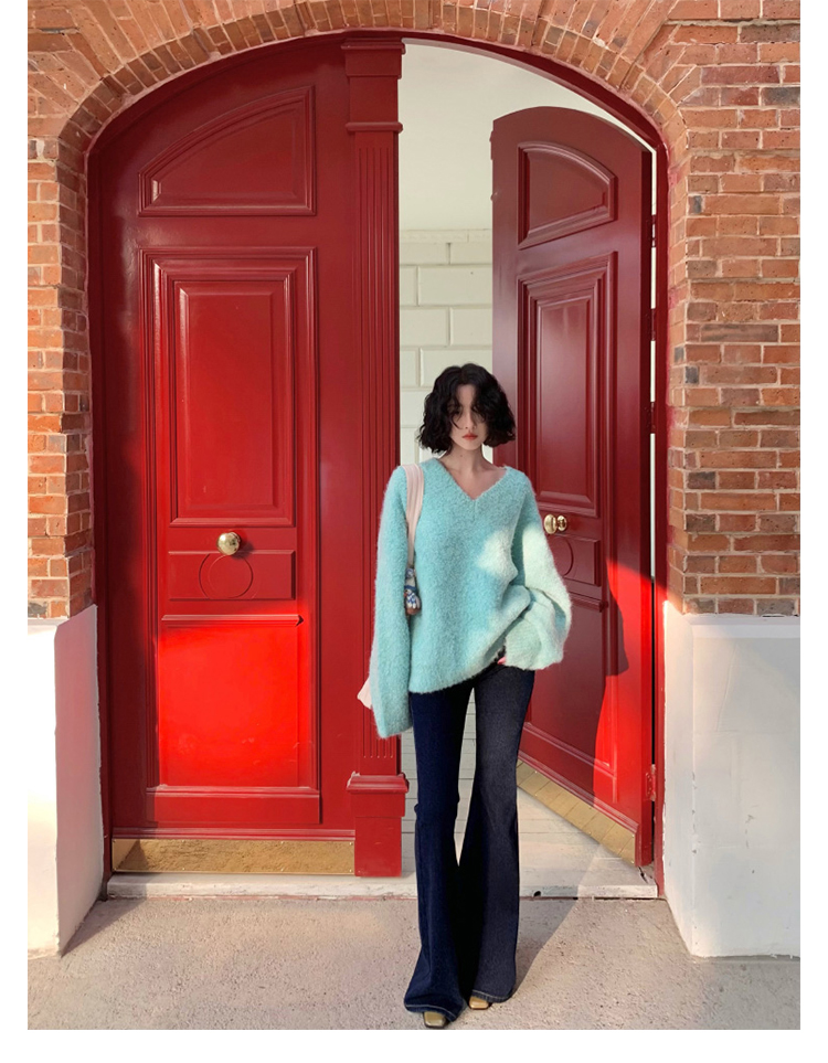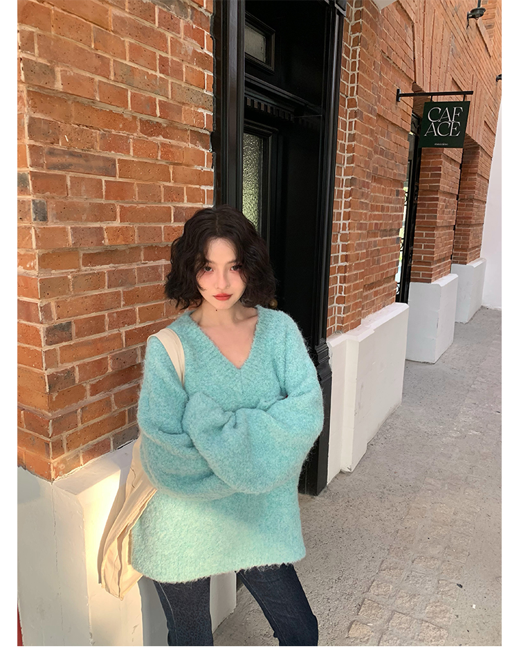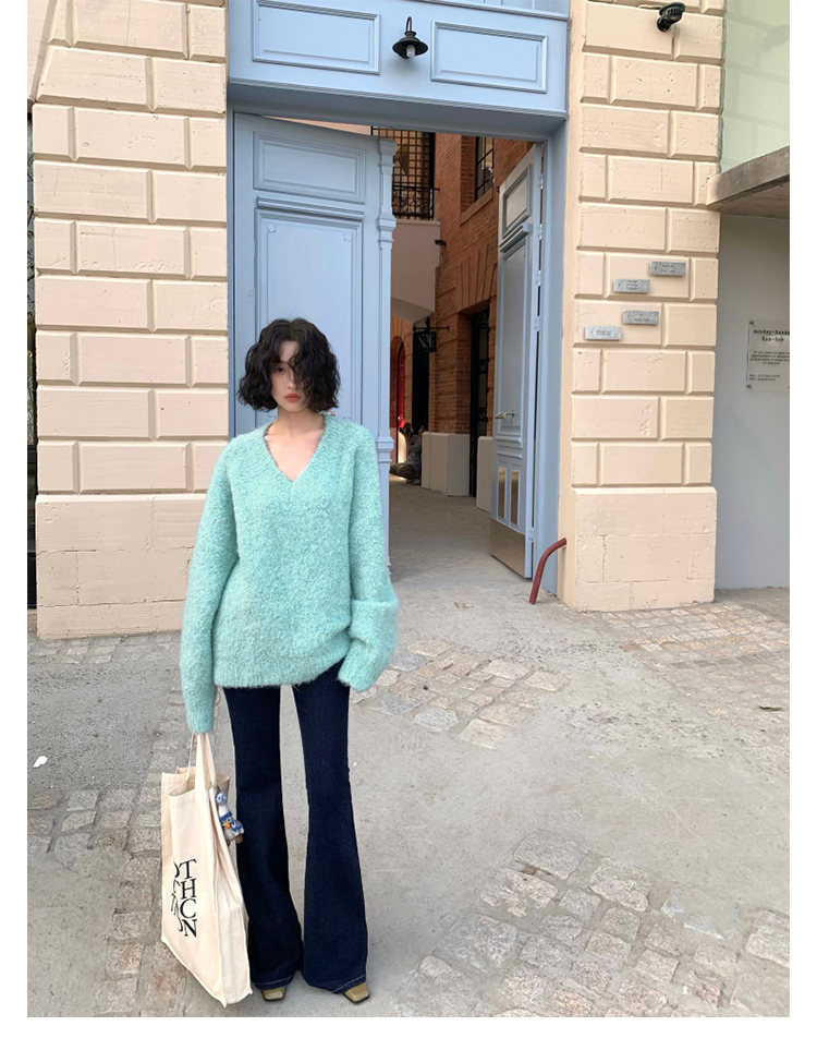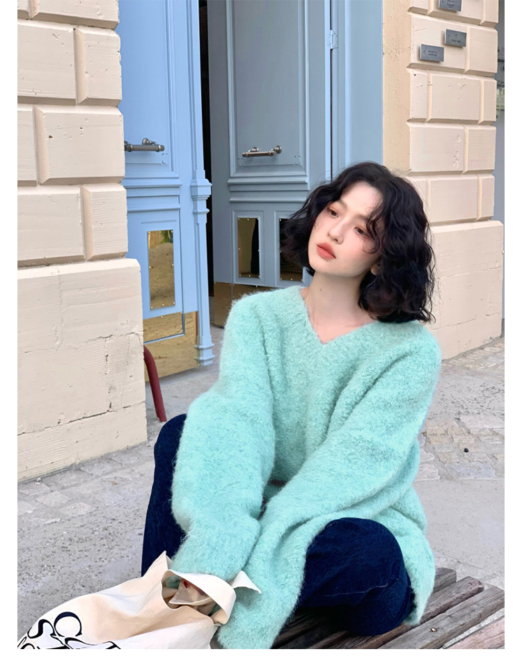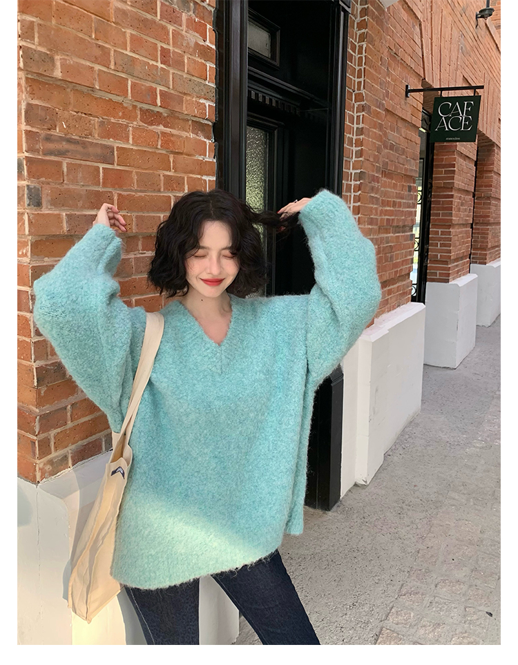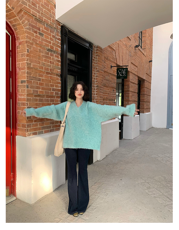 Ice Blue V-Neck Loose Wool Sweater – Cozy Fit