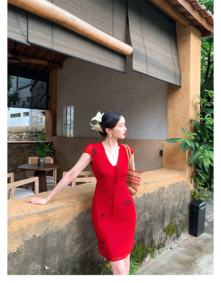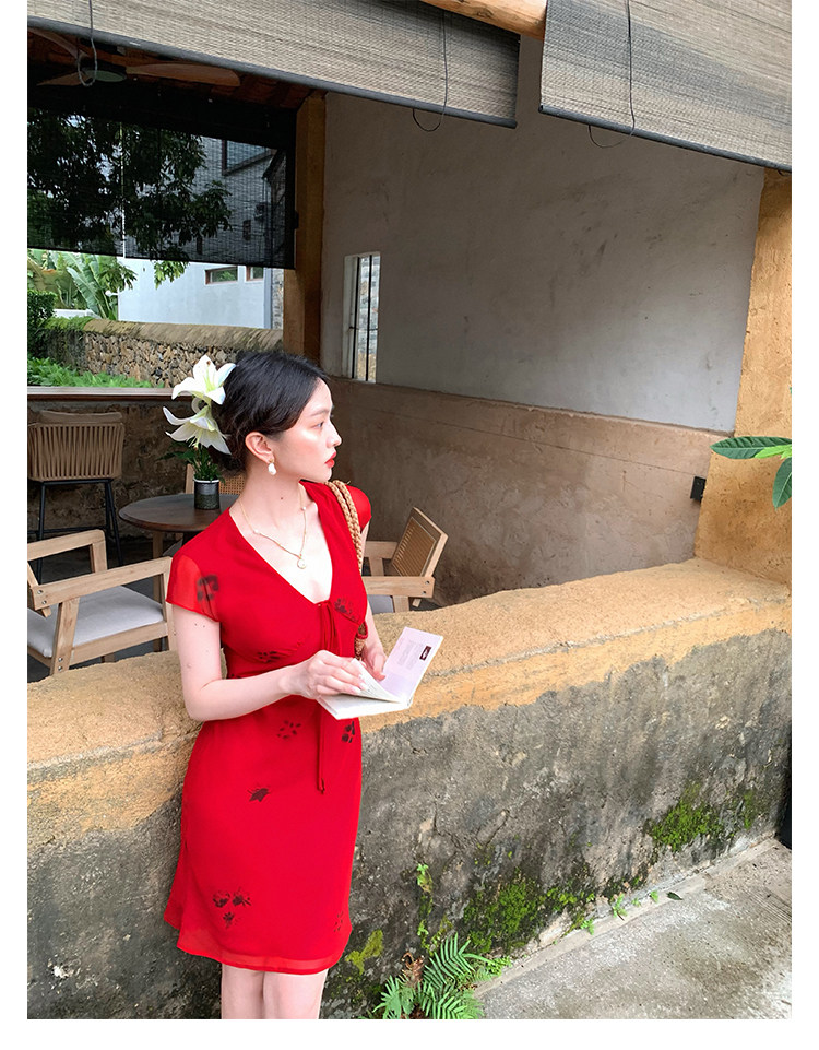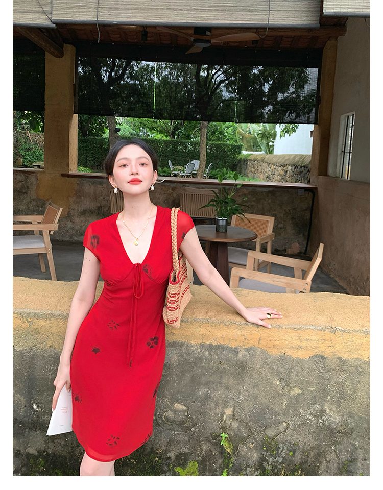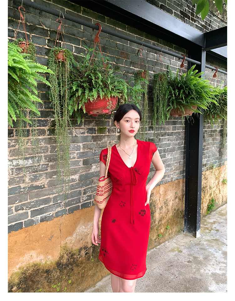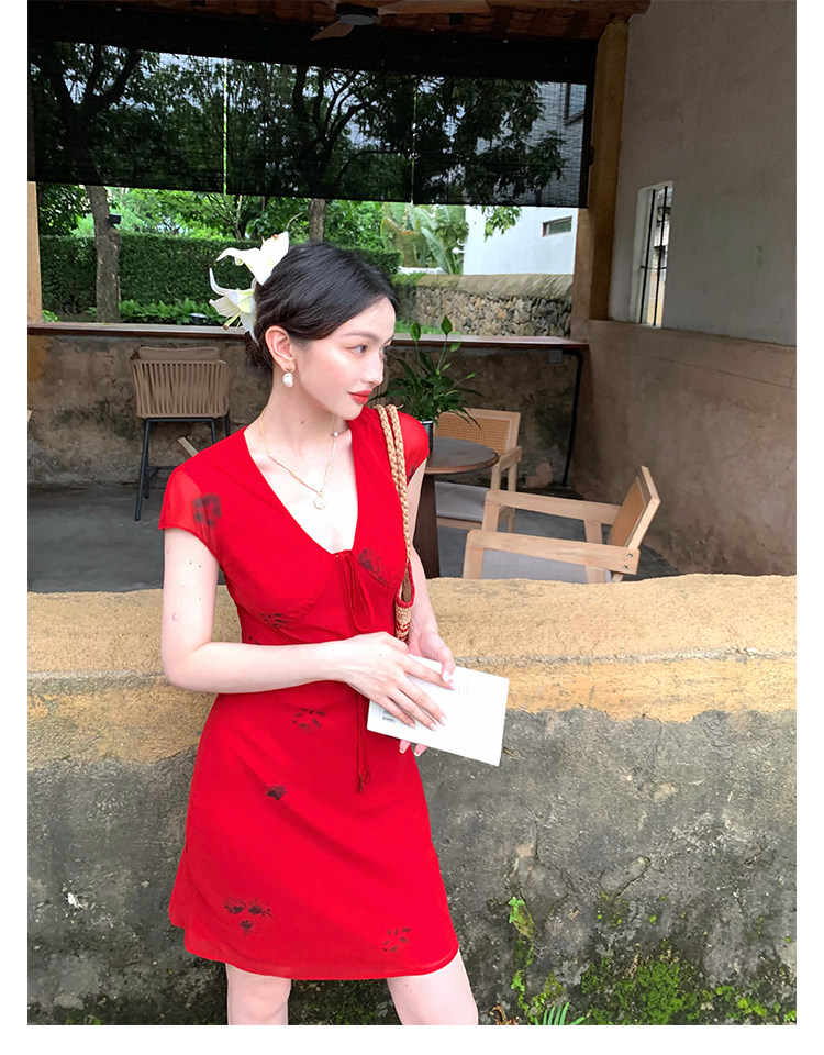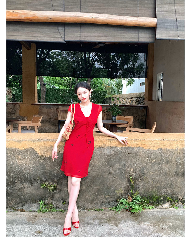 Red V-Neck Lace-Up Chiffon Dress