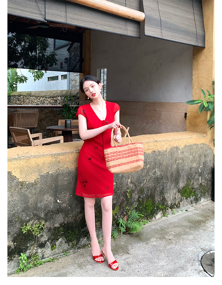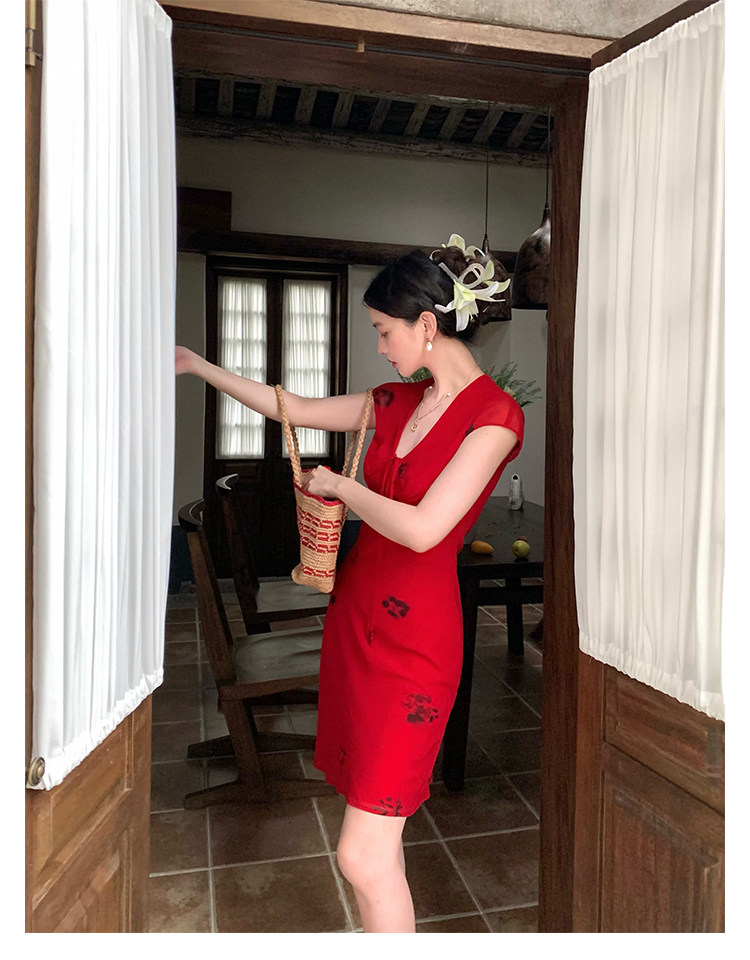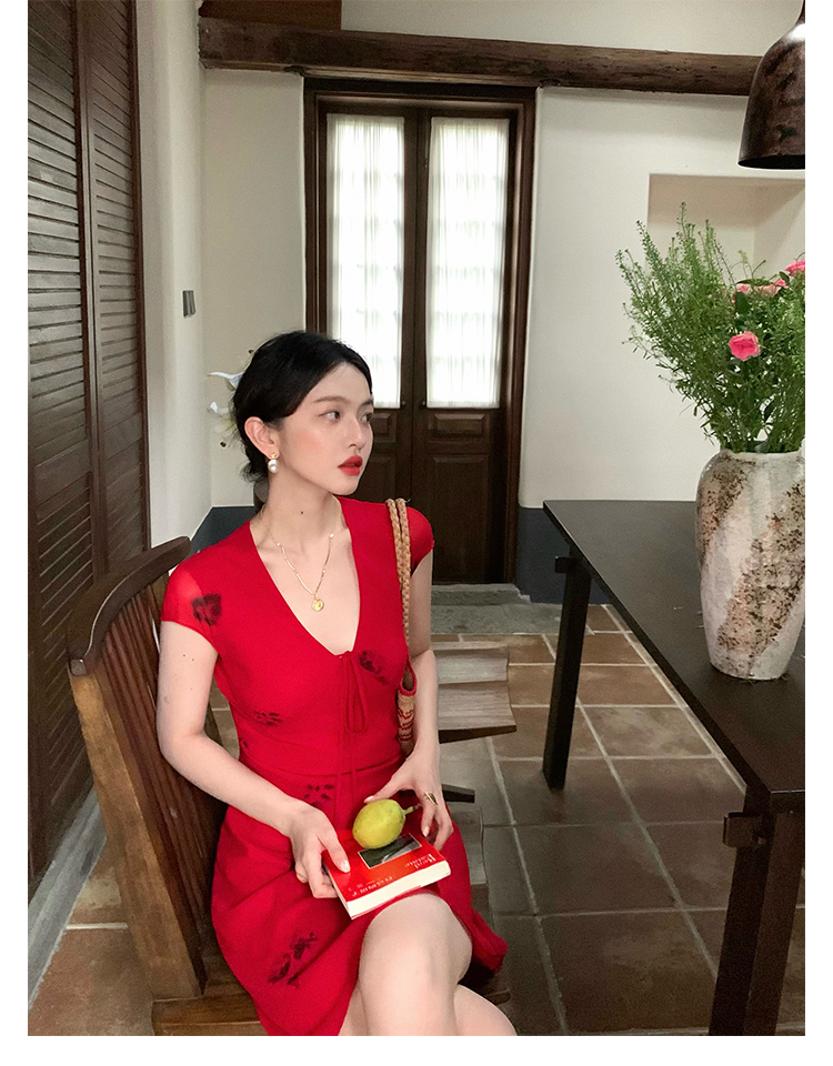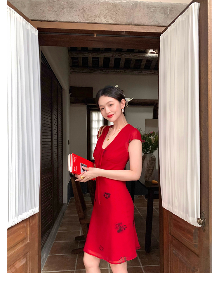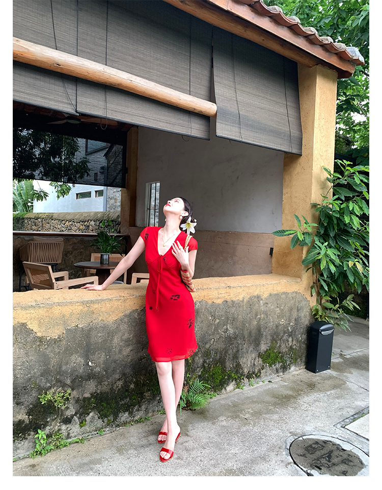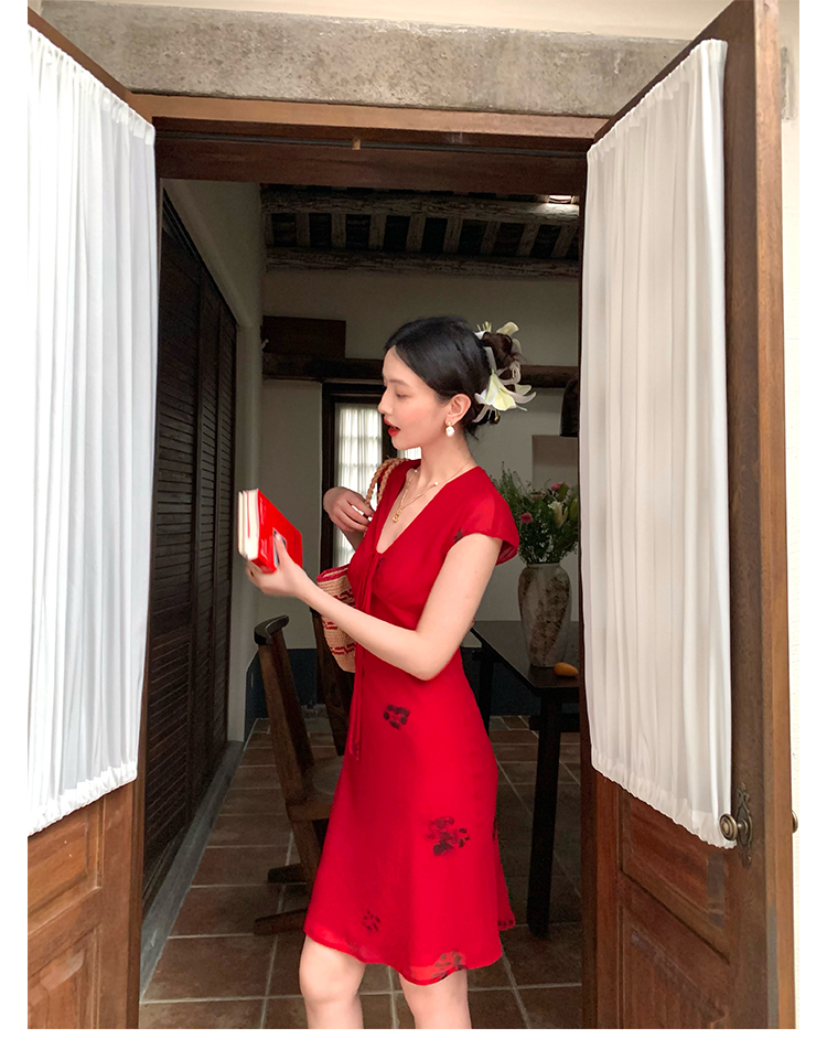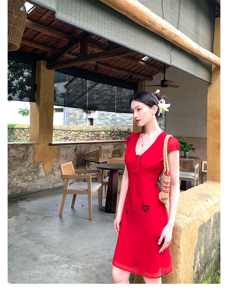 Red V-Neck Lace-Up Chiffon Dress