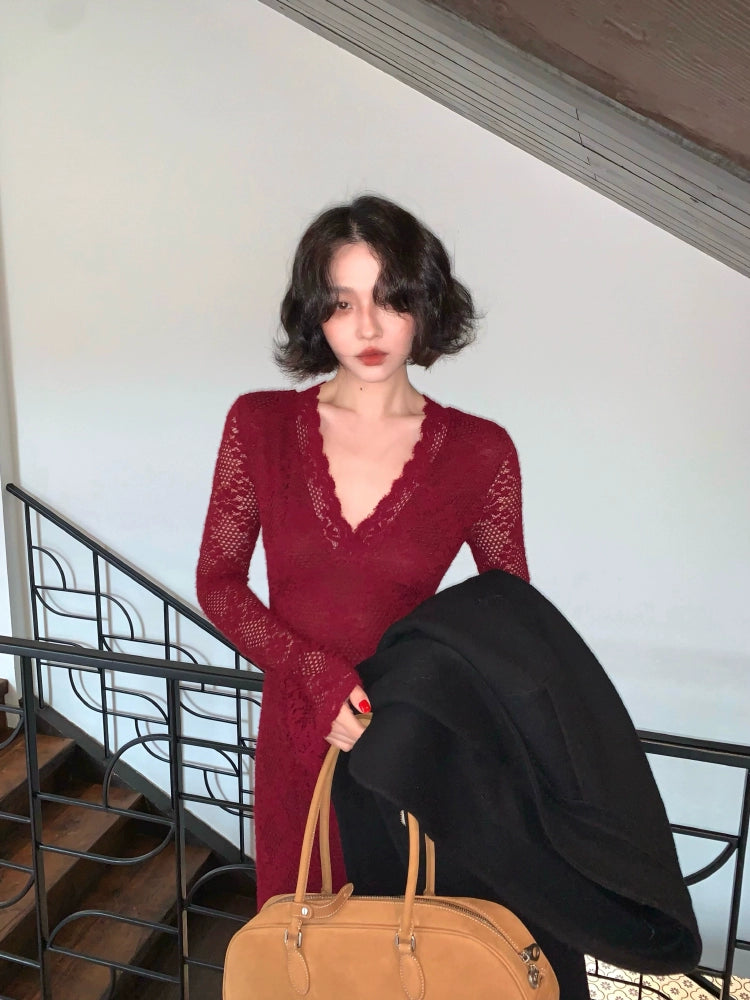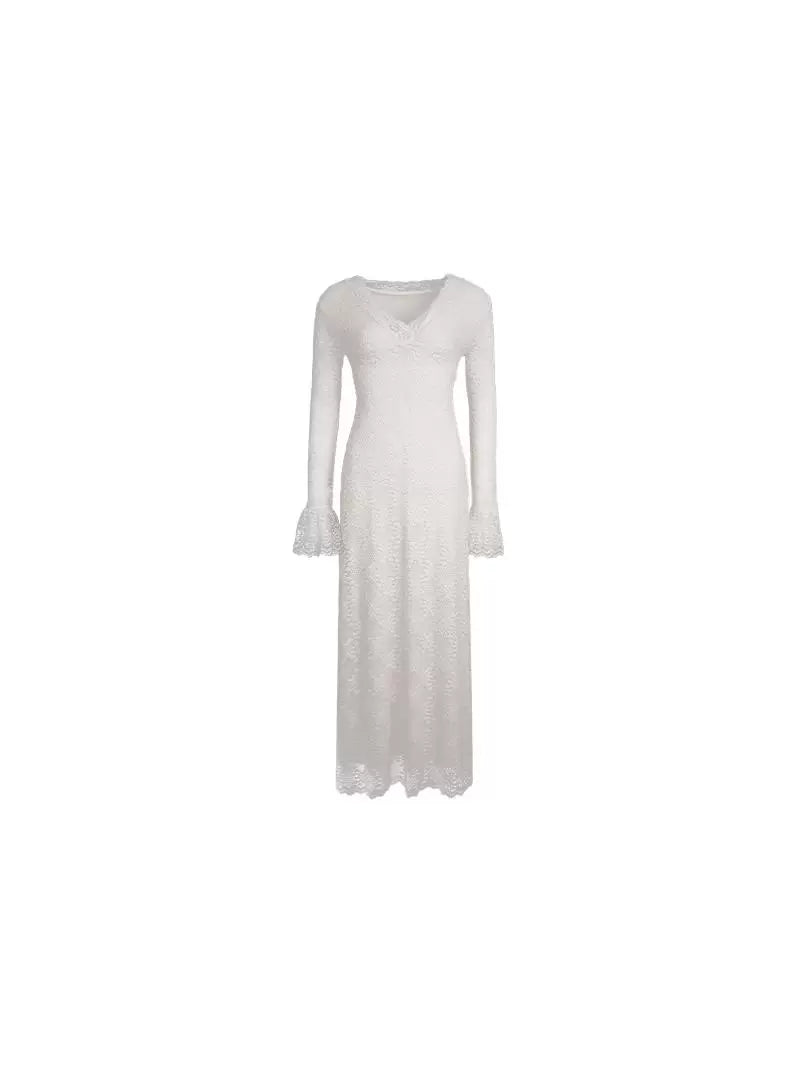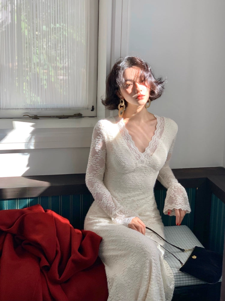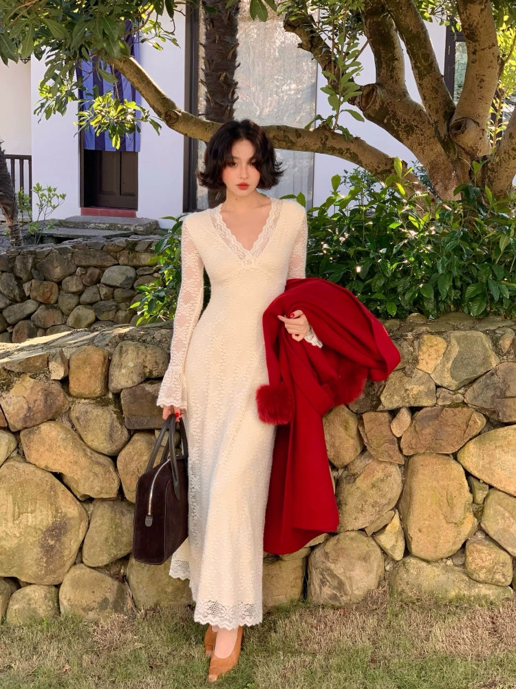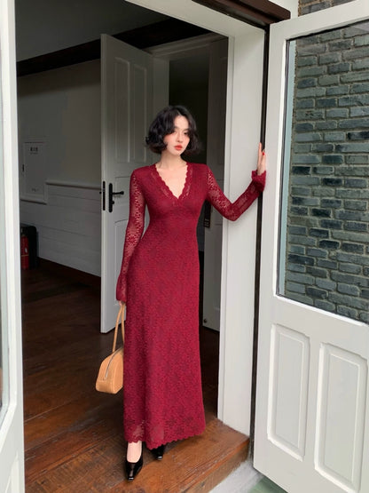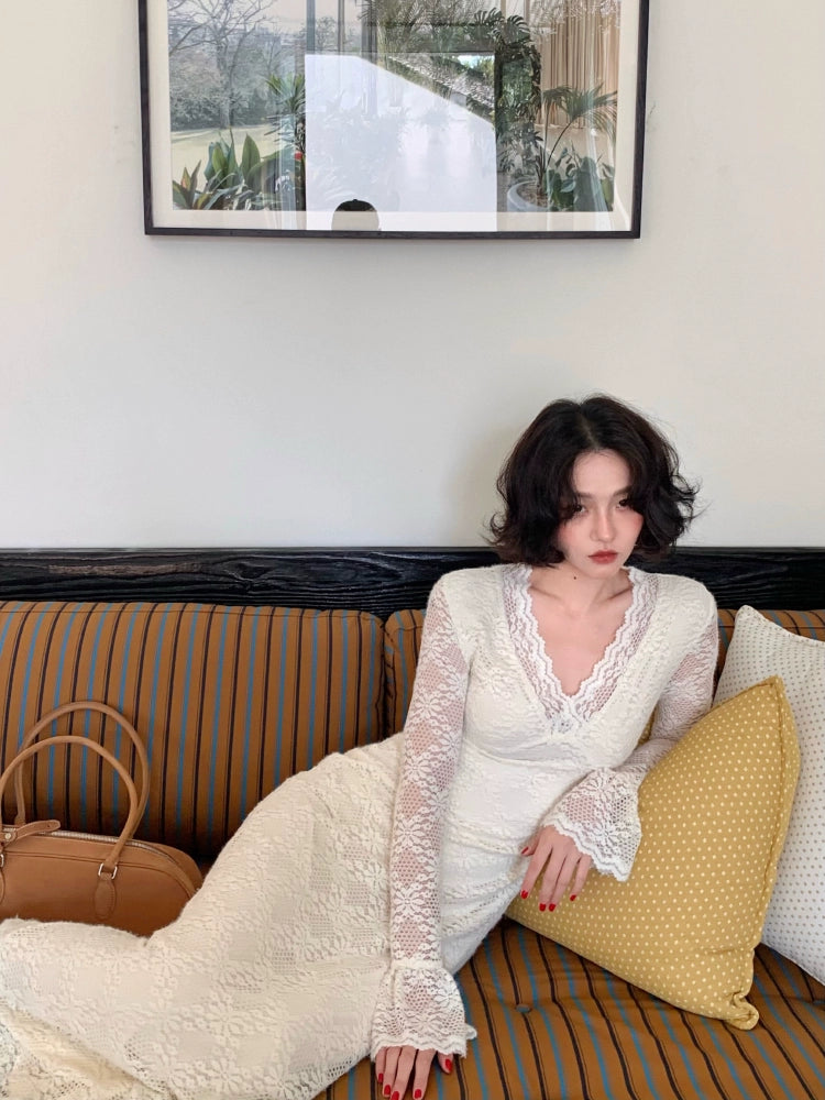 Nanzhi French V-Neck Lace Long Dress – Premium Elegance