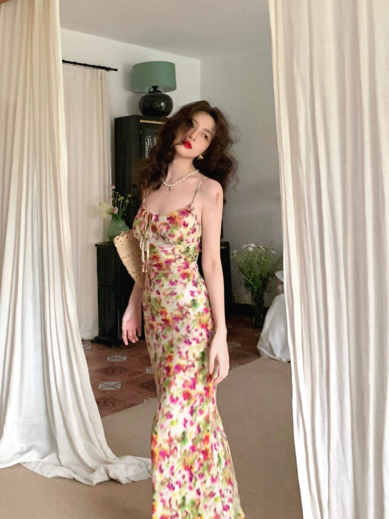 French Vintage Rose Dress: Summer's Fish Tail Elegance