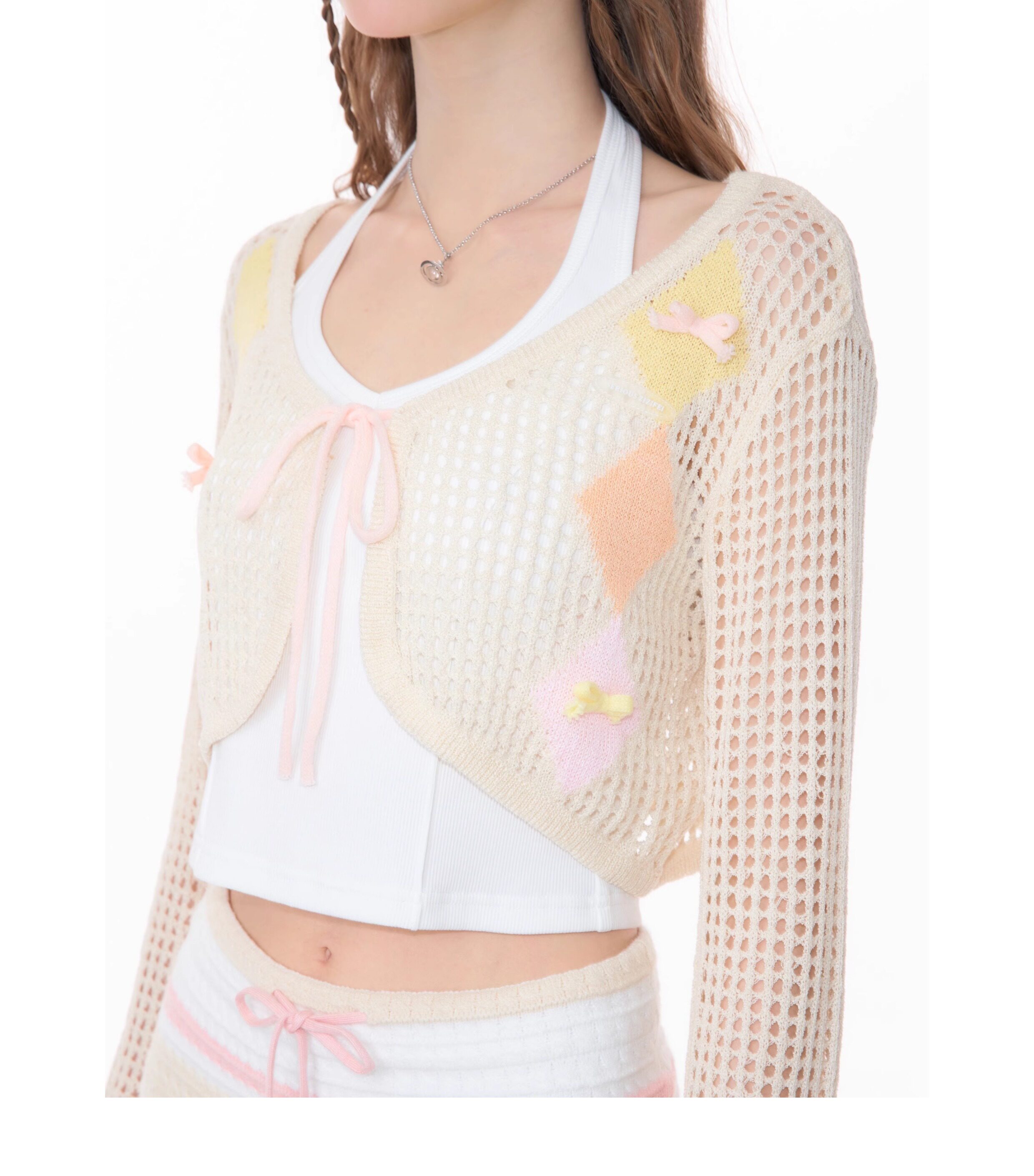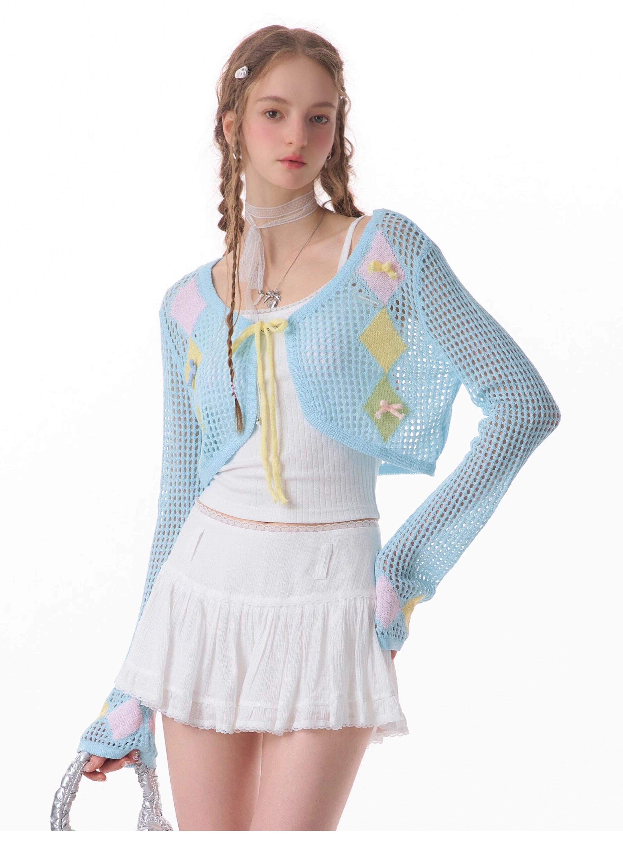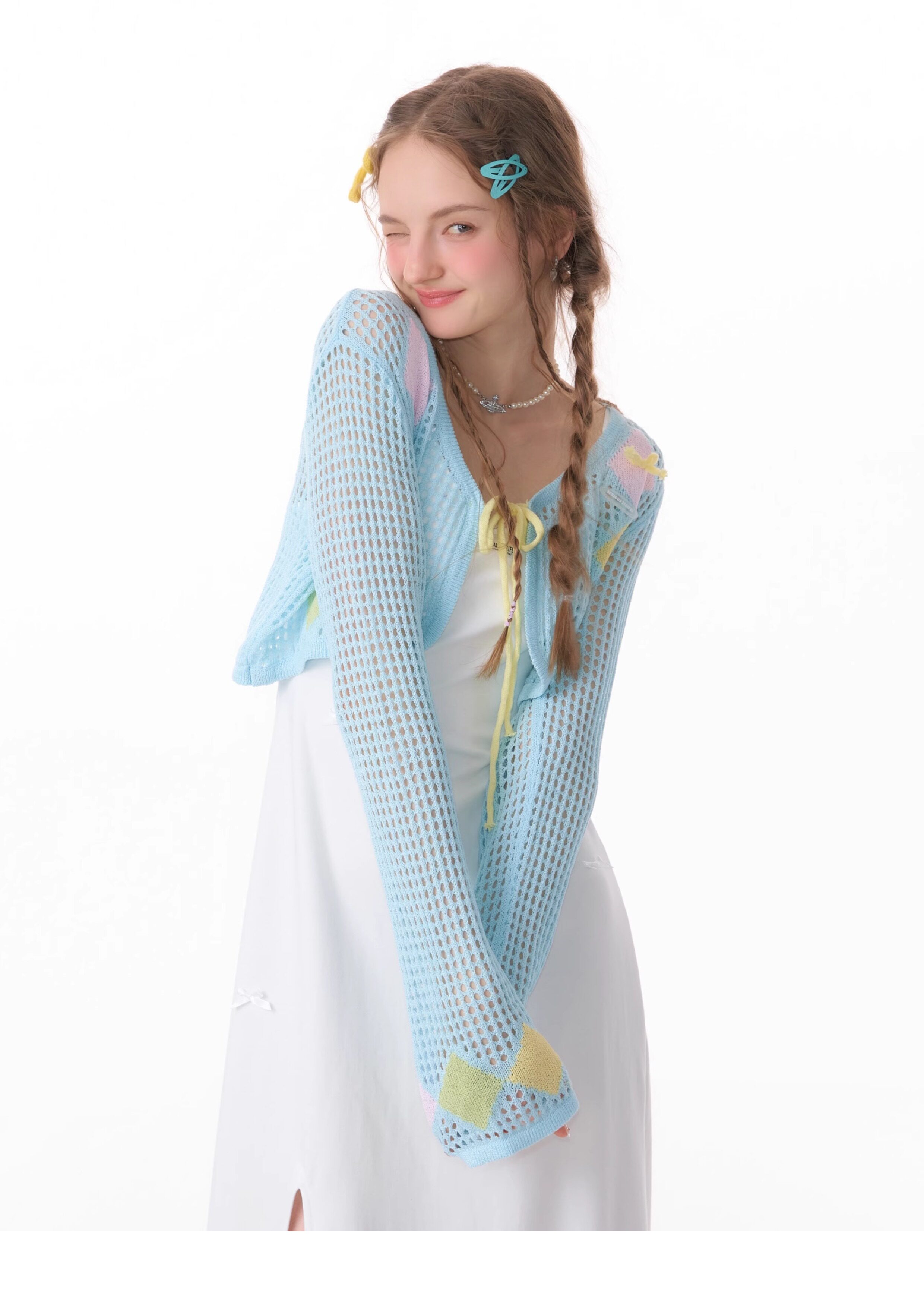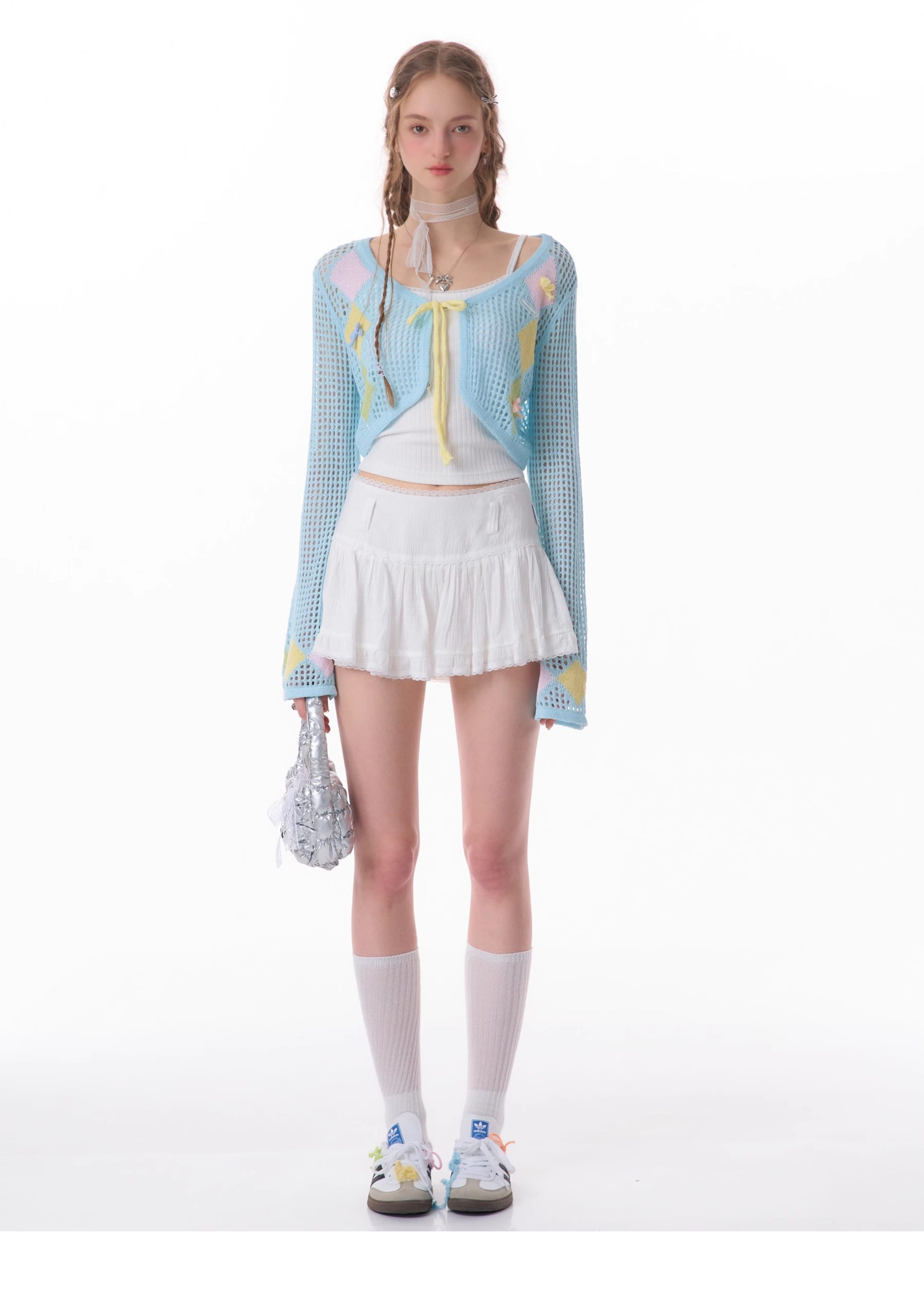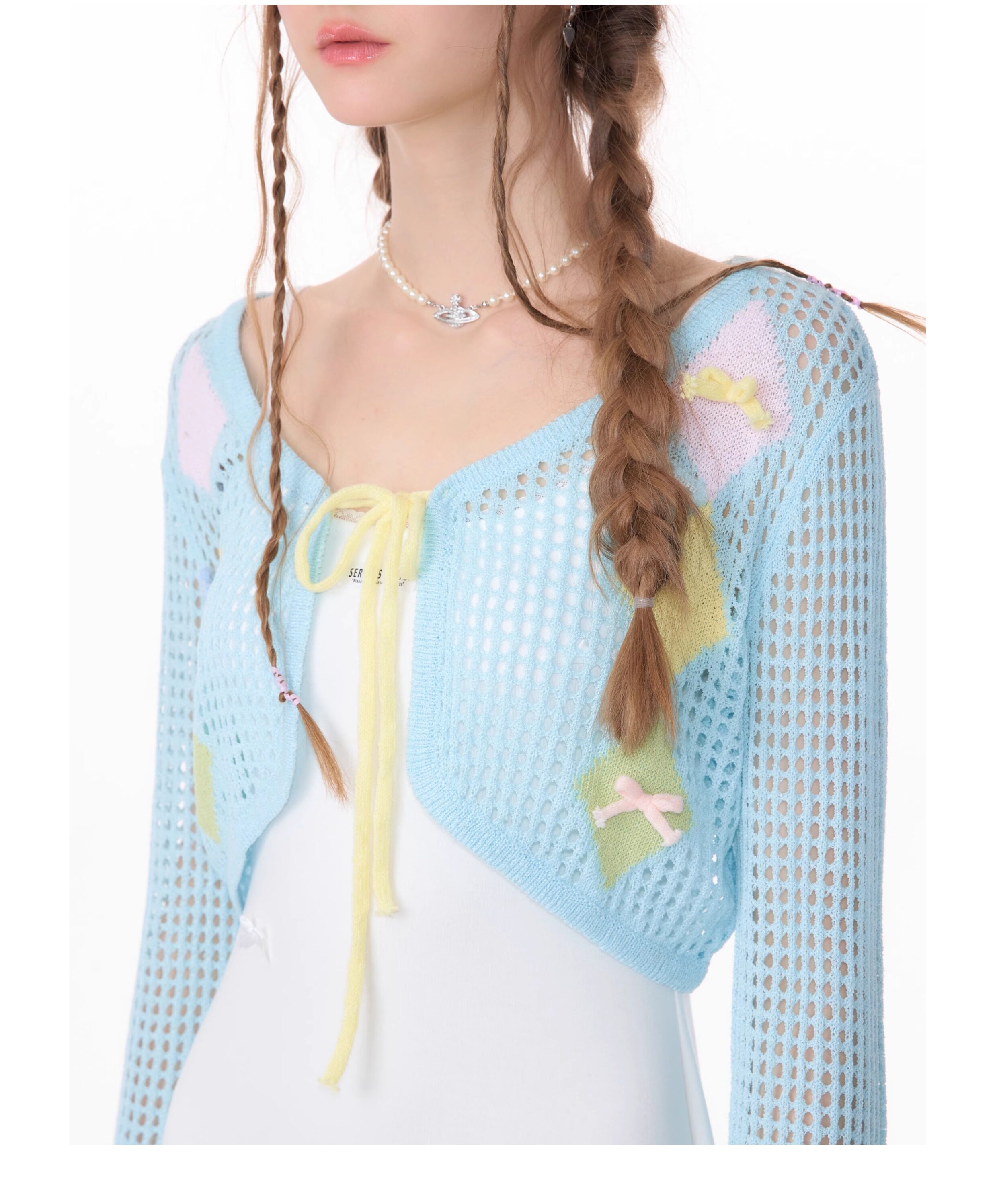 Bow Short Sleeve Hollow Knit Cardigan | Lightweight American Design for Summer
