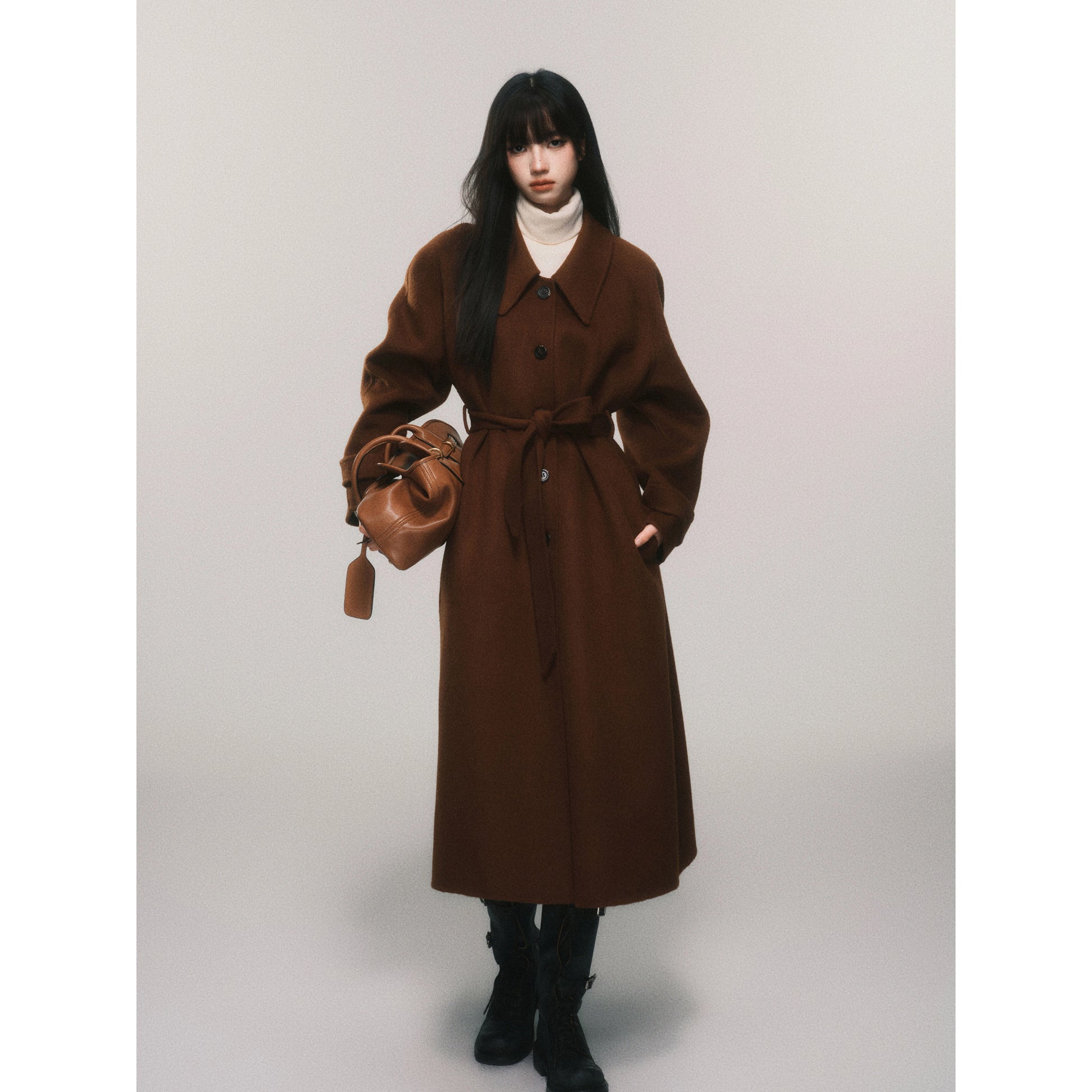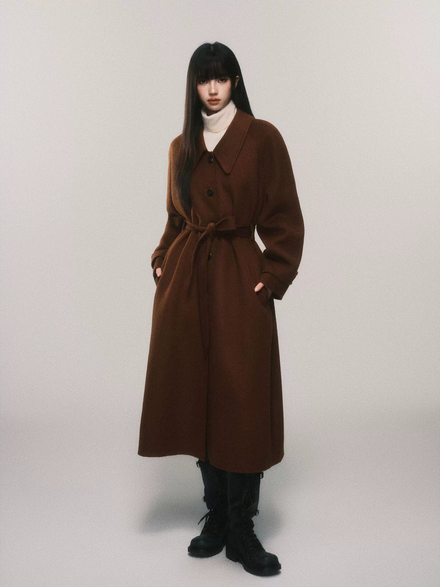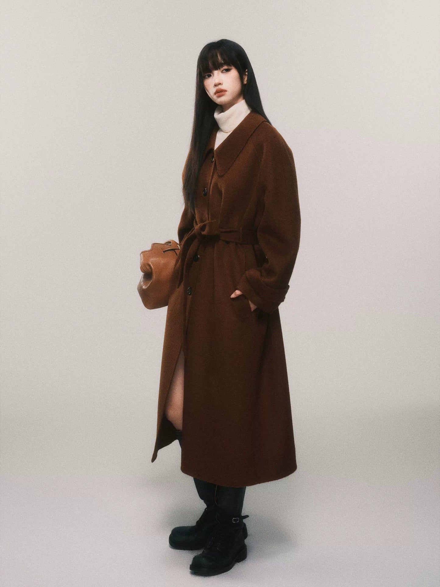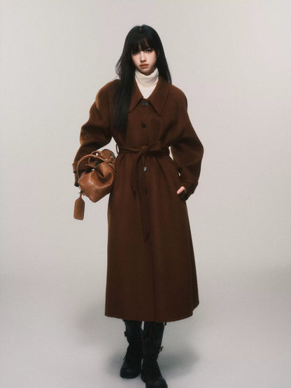 Vintage Maple Leaf Alpaca Handmade Waist Long Coat for Women