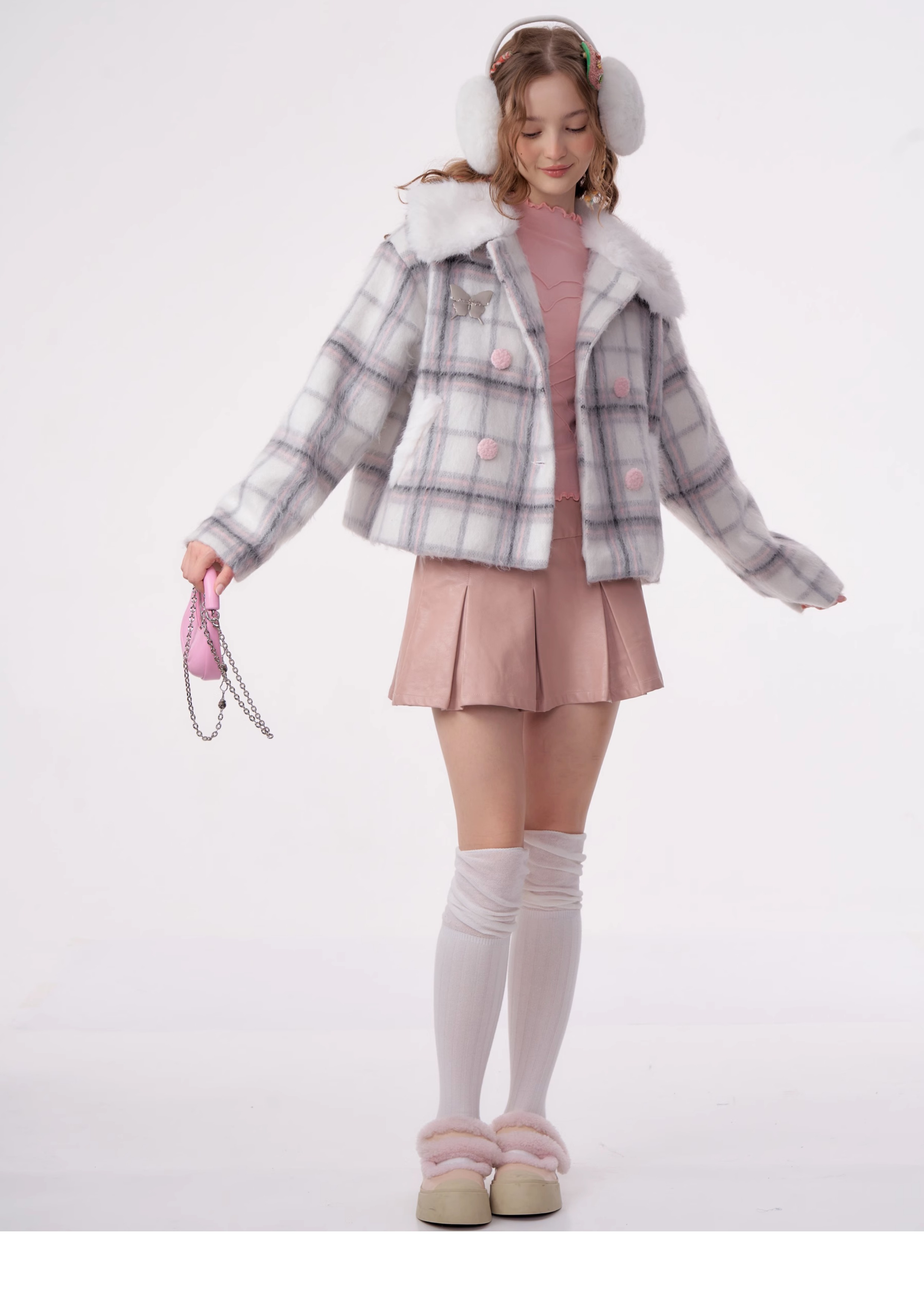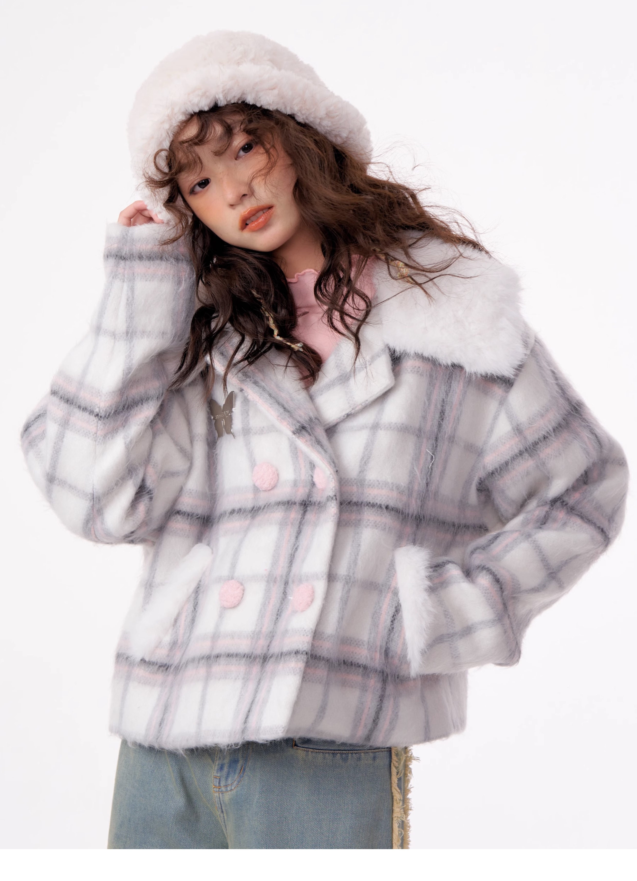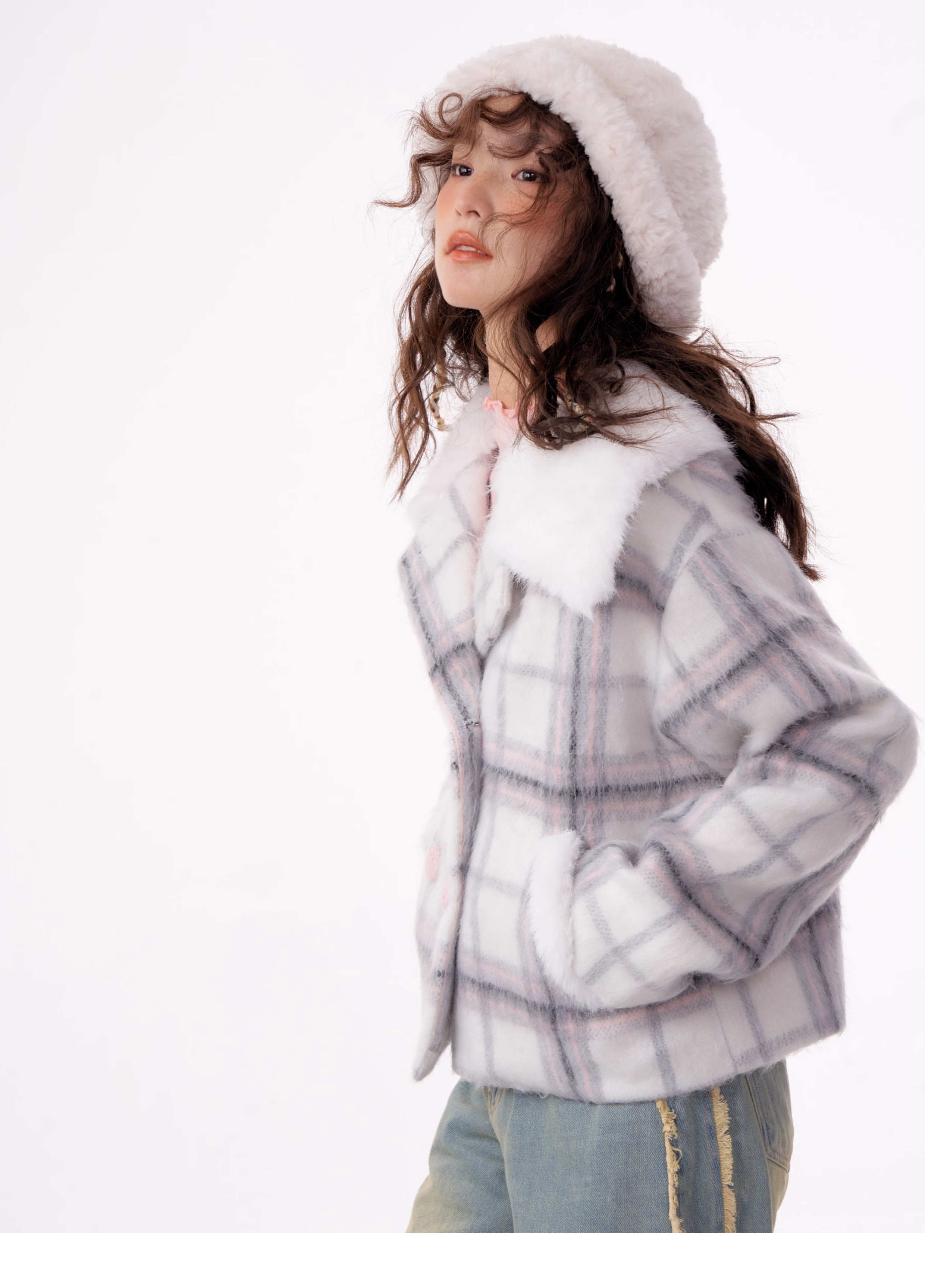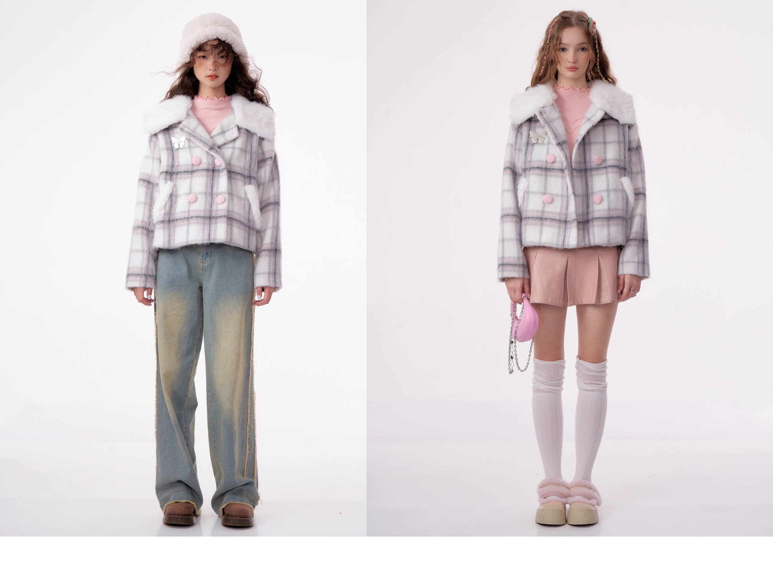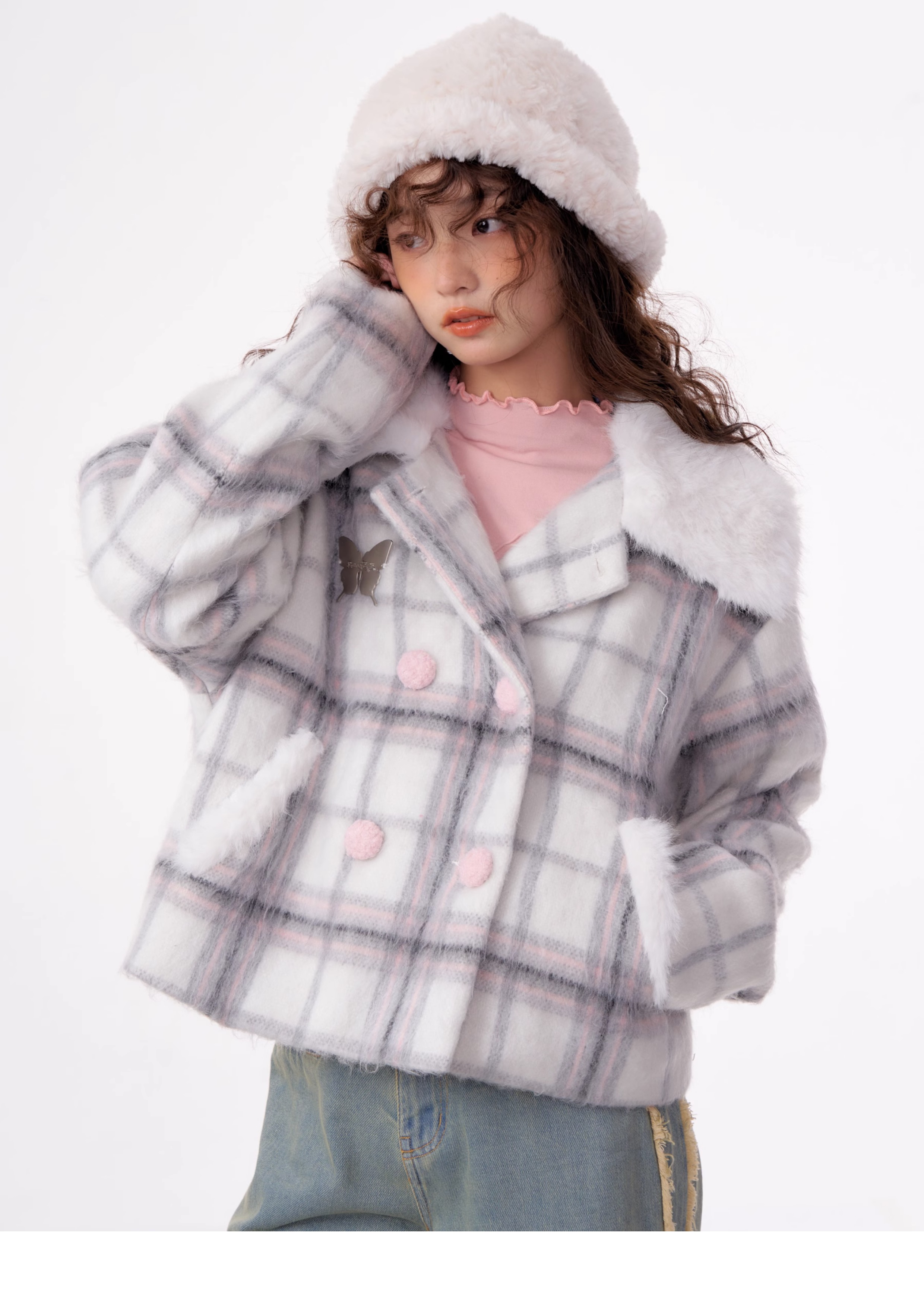 Шерстяная куртка с клетчатым кожаным воротником | Толстый бархатный дизайн в стиле ретро для осени/зимы