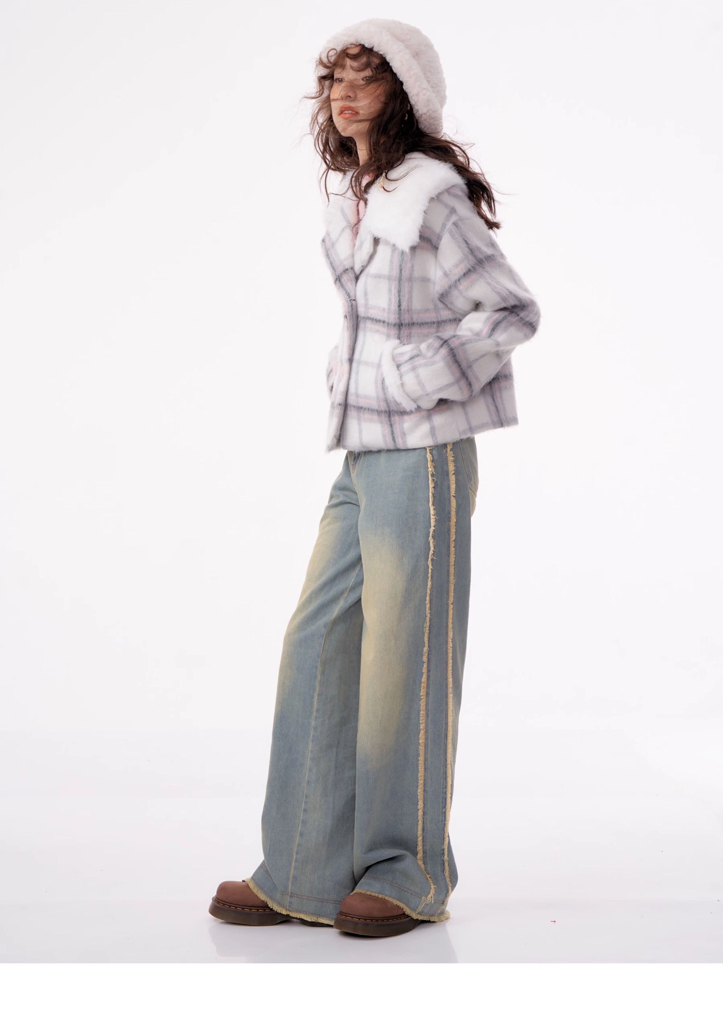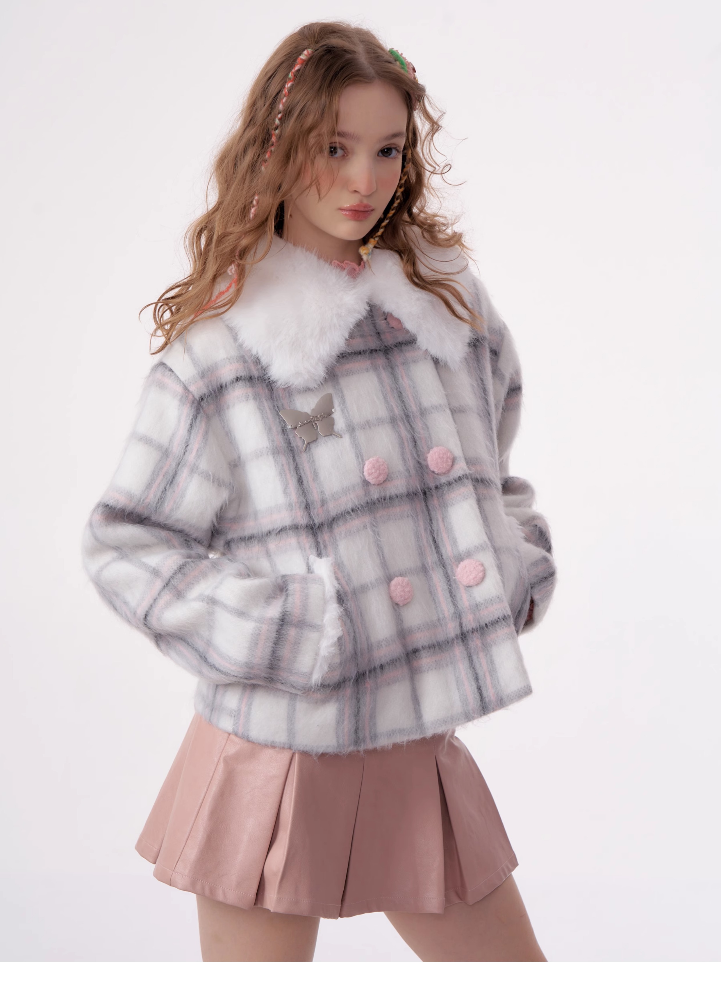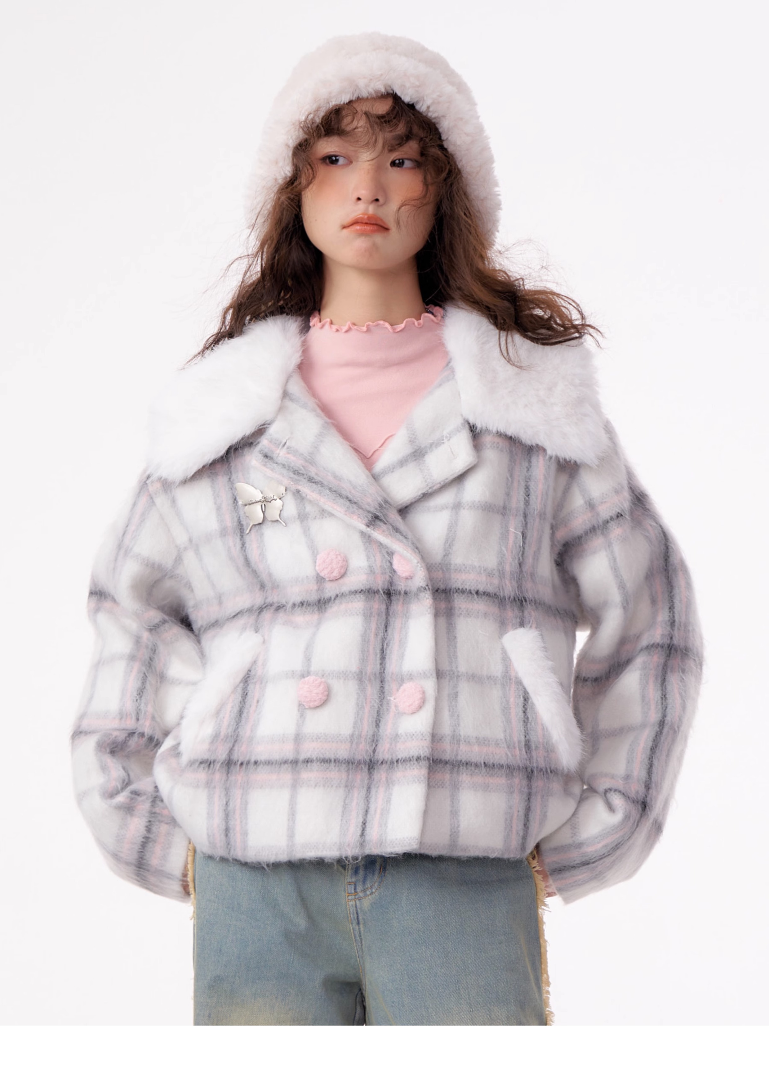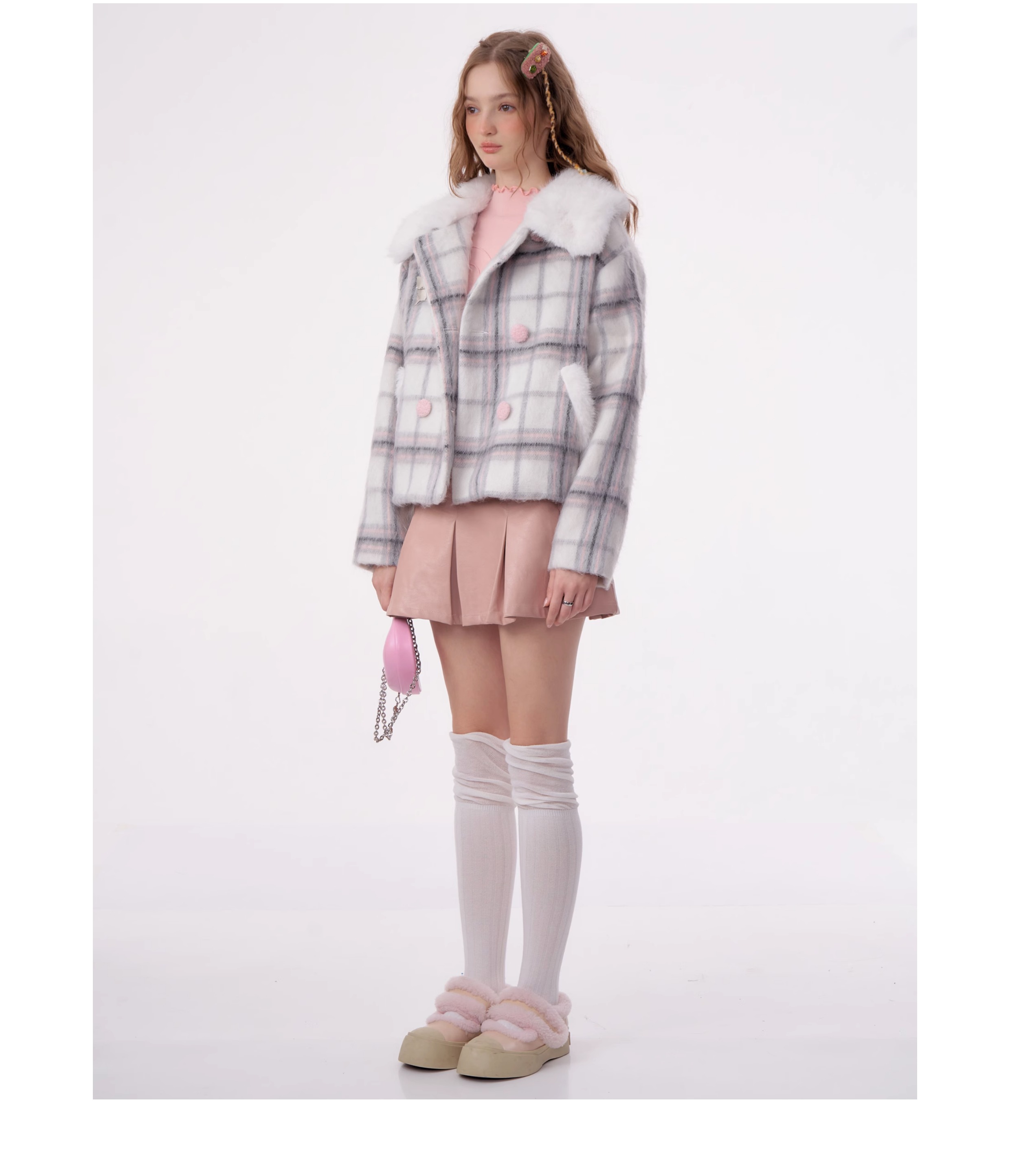 Шерстяная куртка с клетчатым кожаным воротником | Толстый бархатный дизайн в стиле ретро для осени/зимы