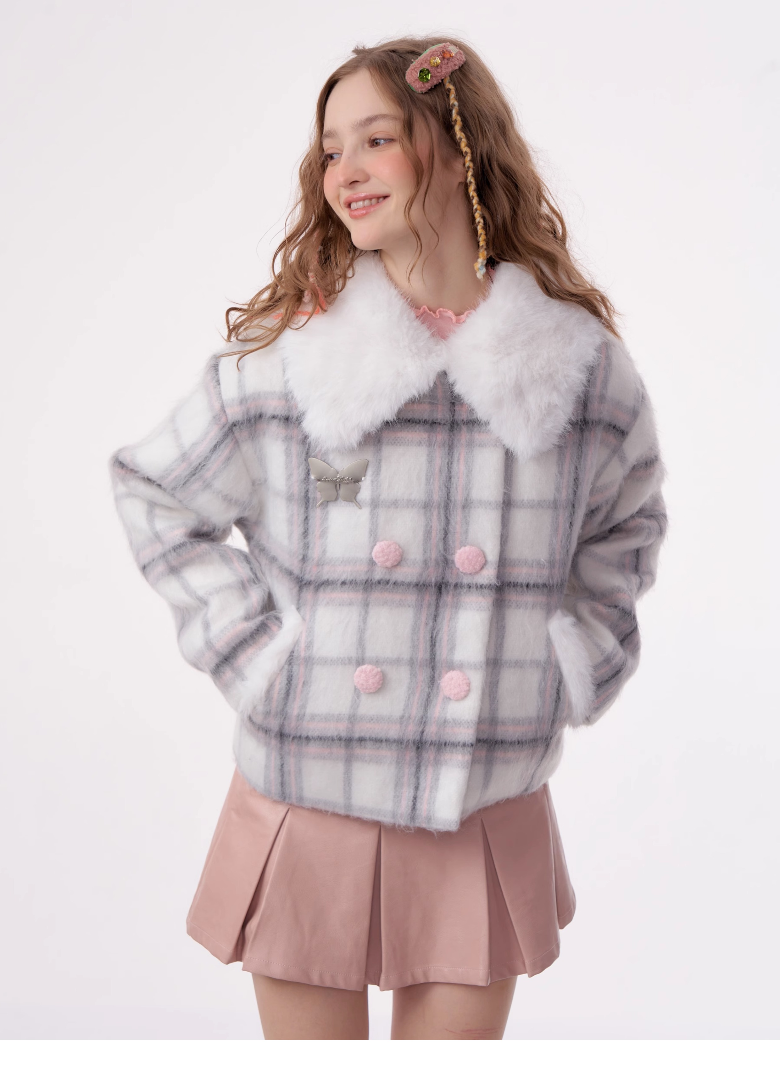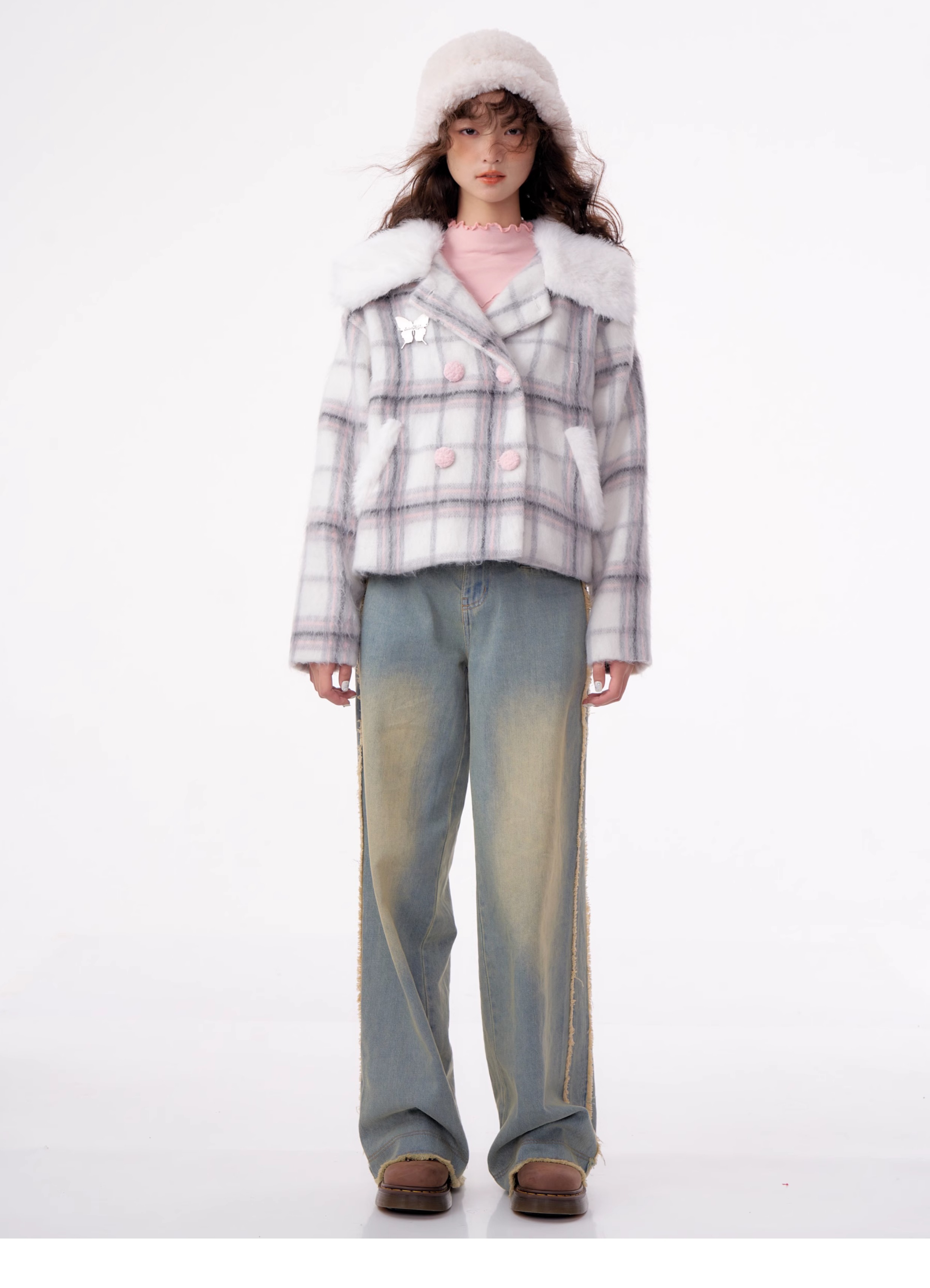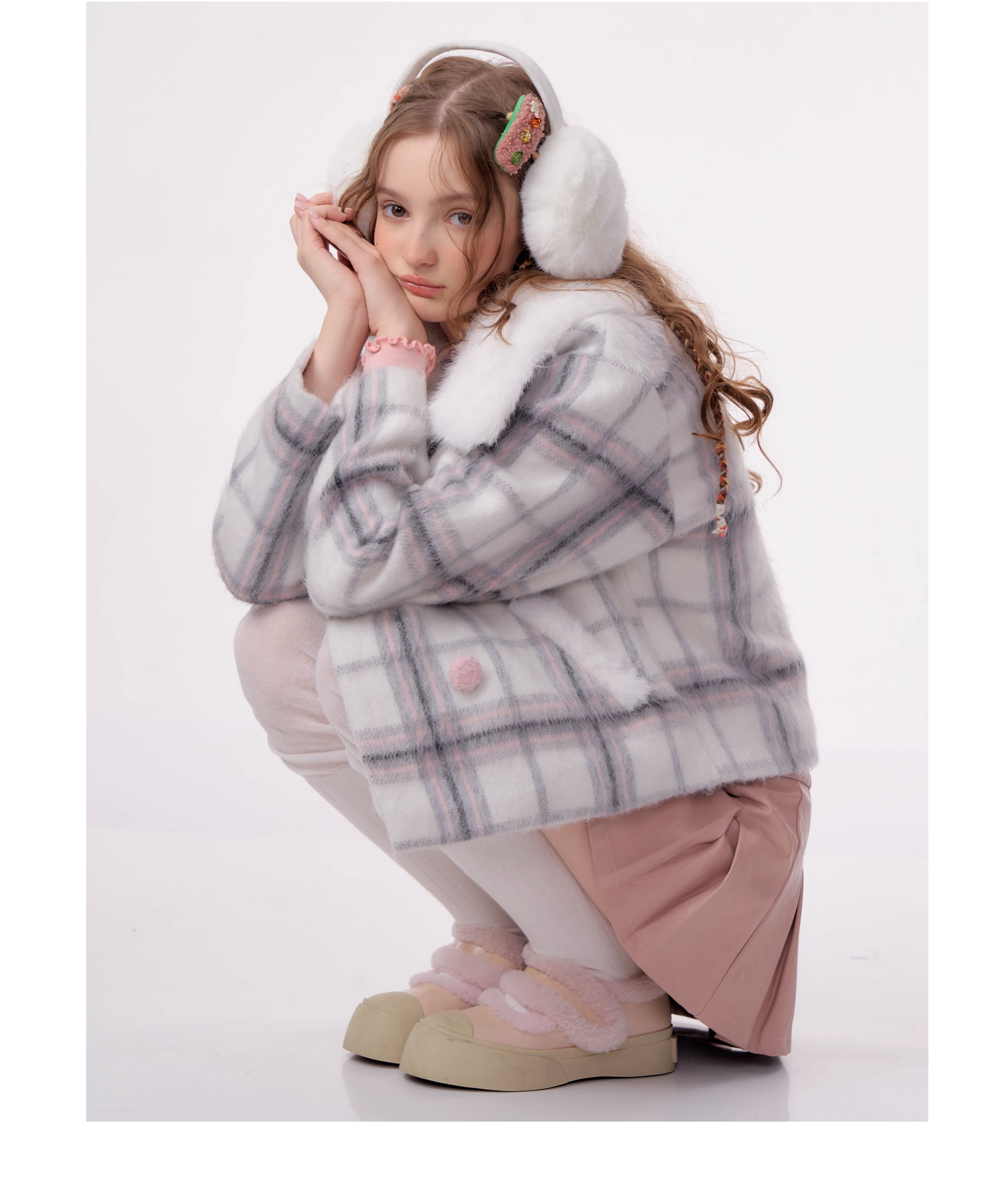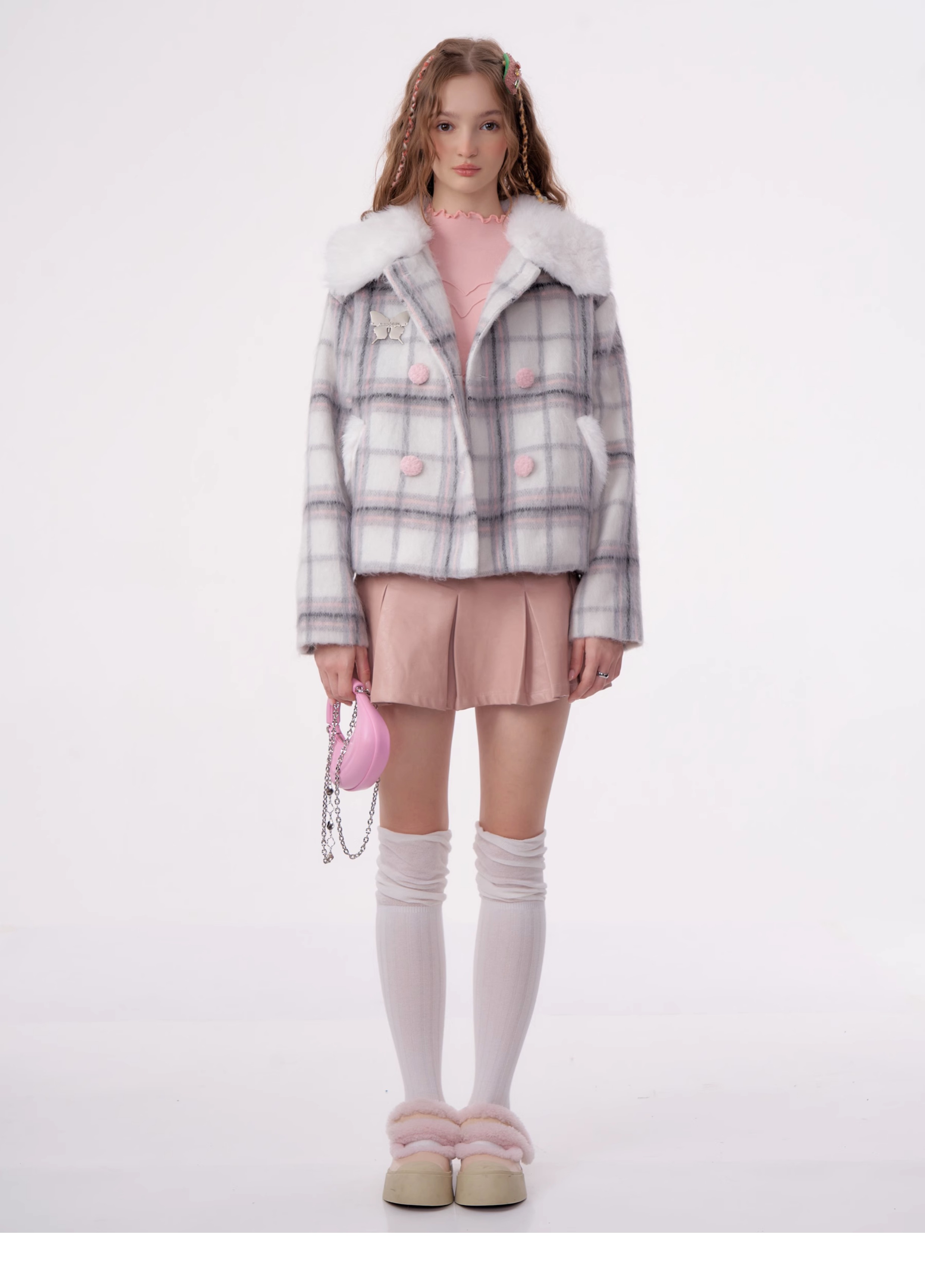 Шерстяная куртка с клетчатым кожаным воротником | Толстый бархатный дизайн в стиле ретро для осени/зимы
