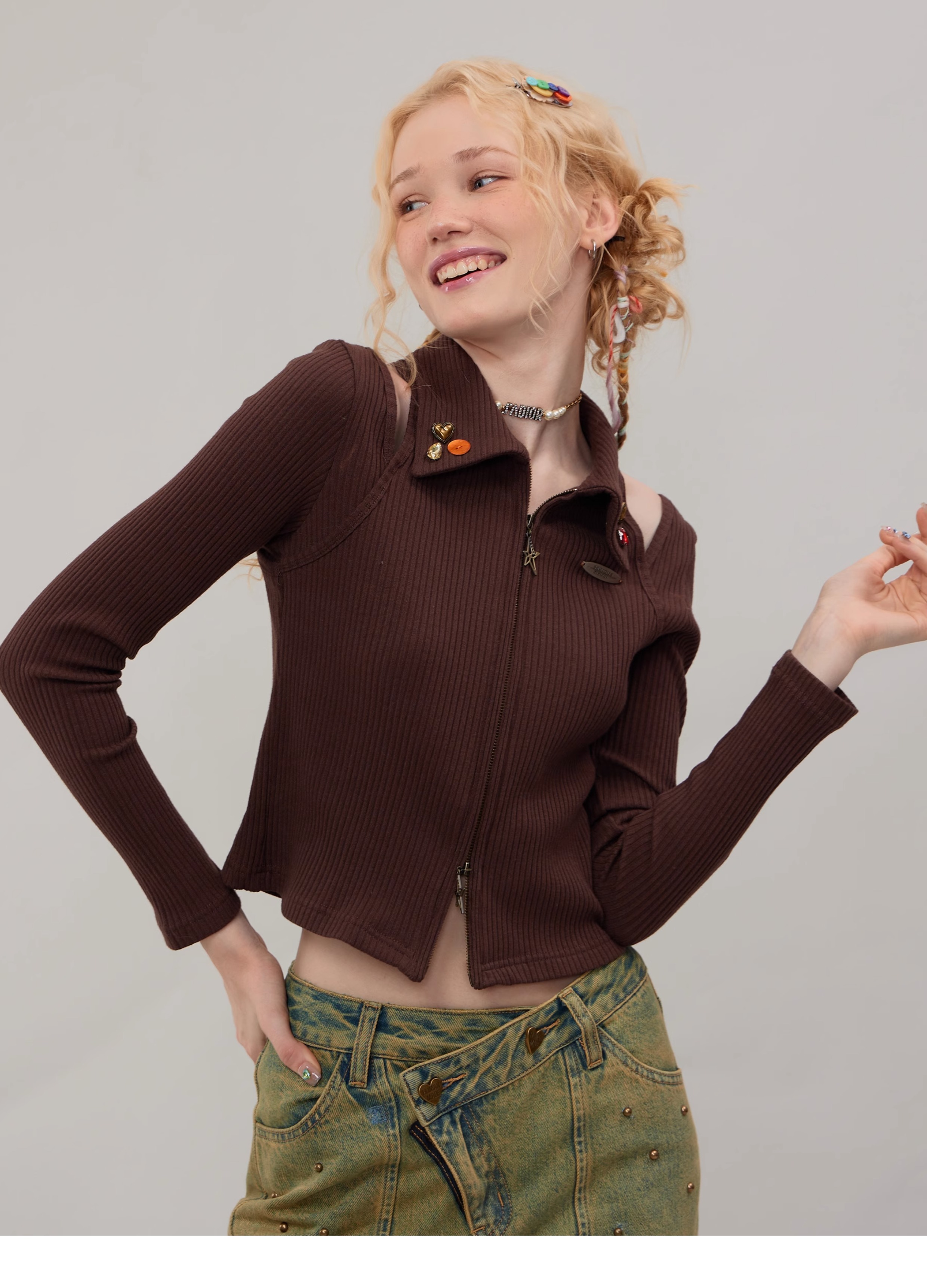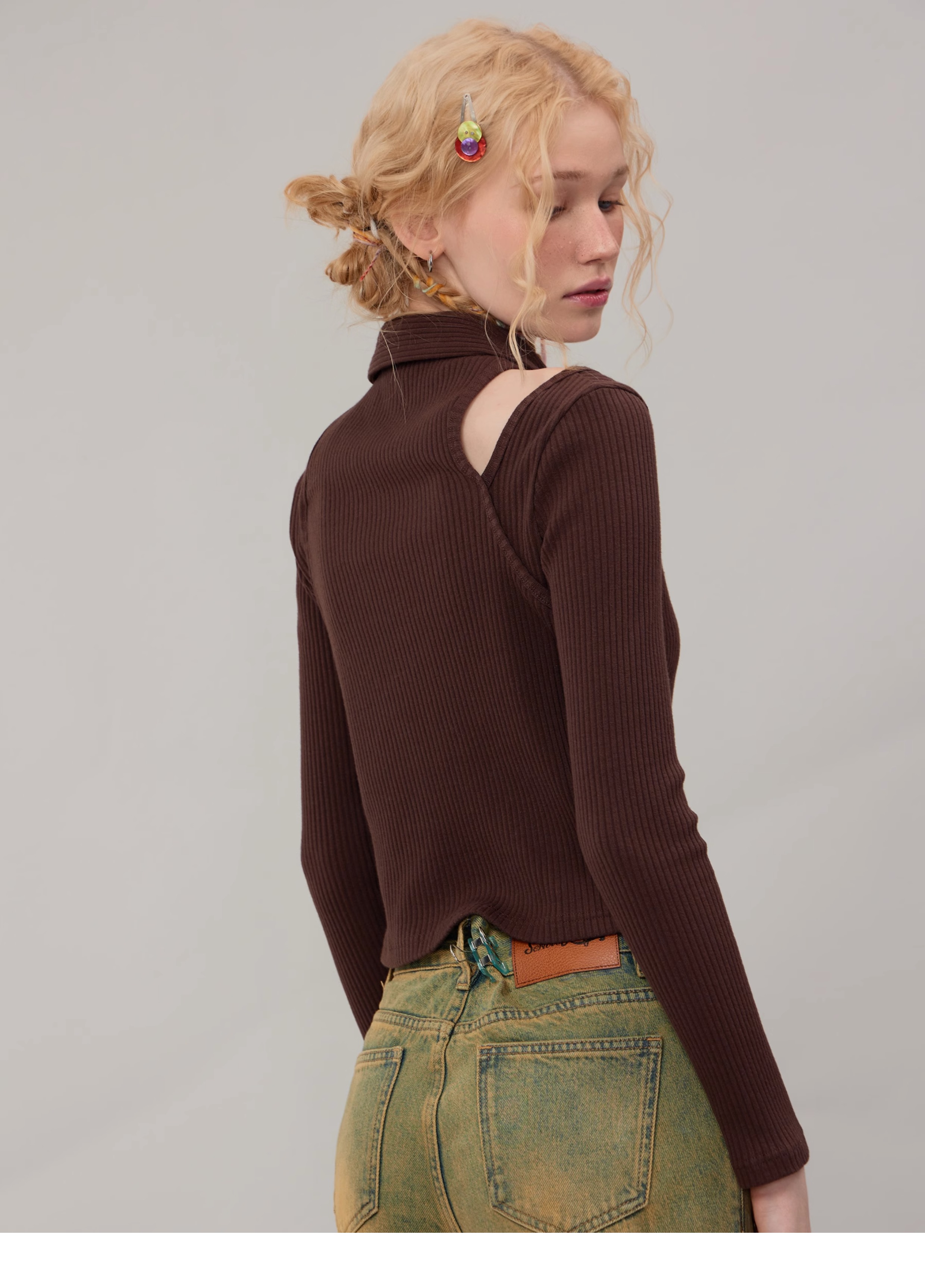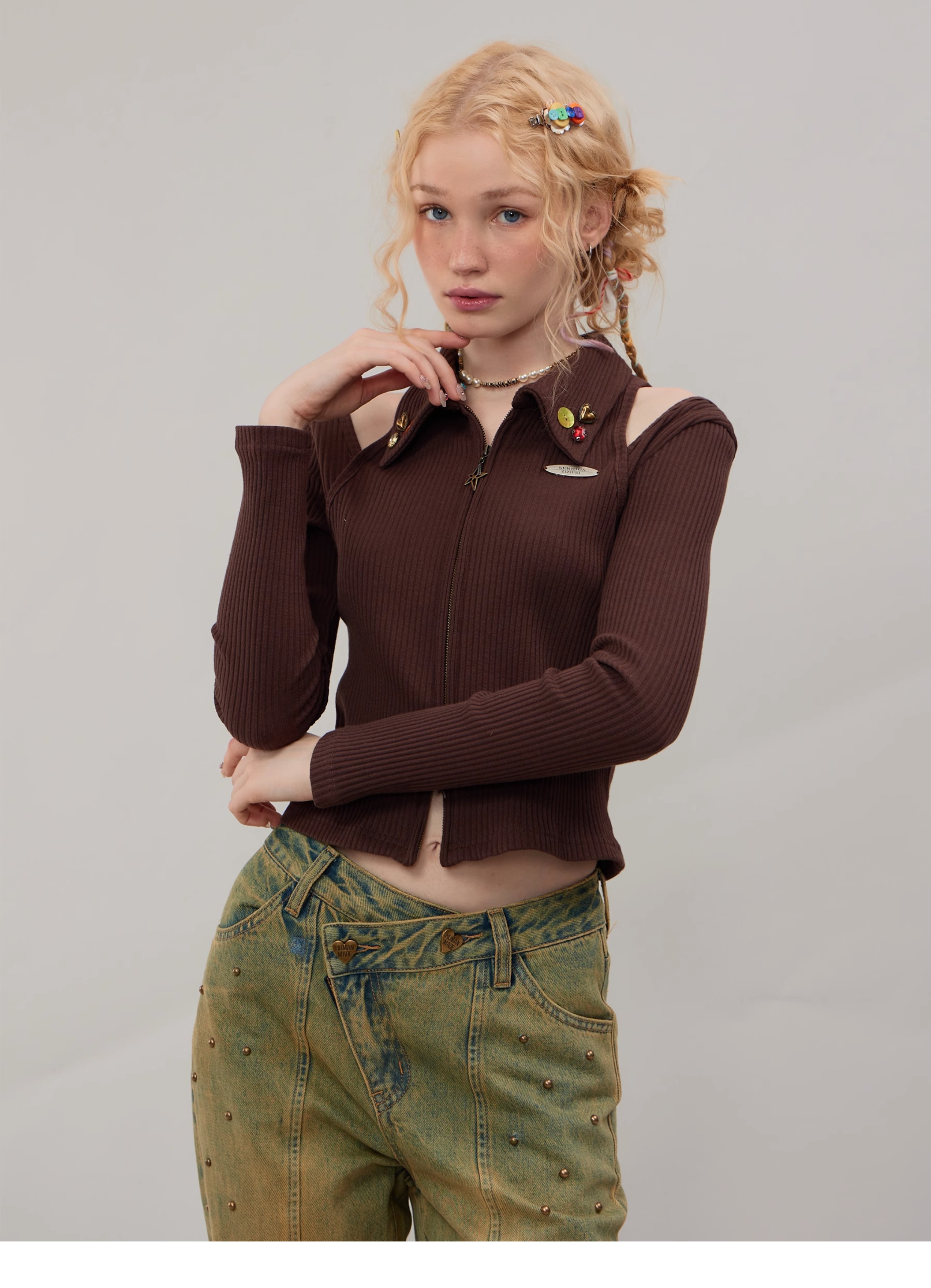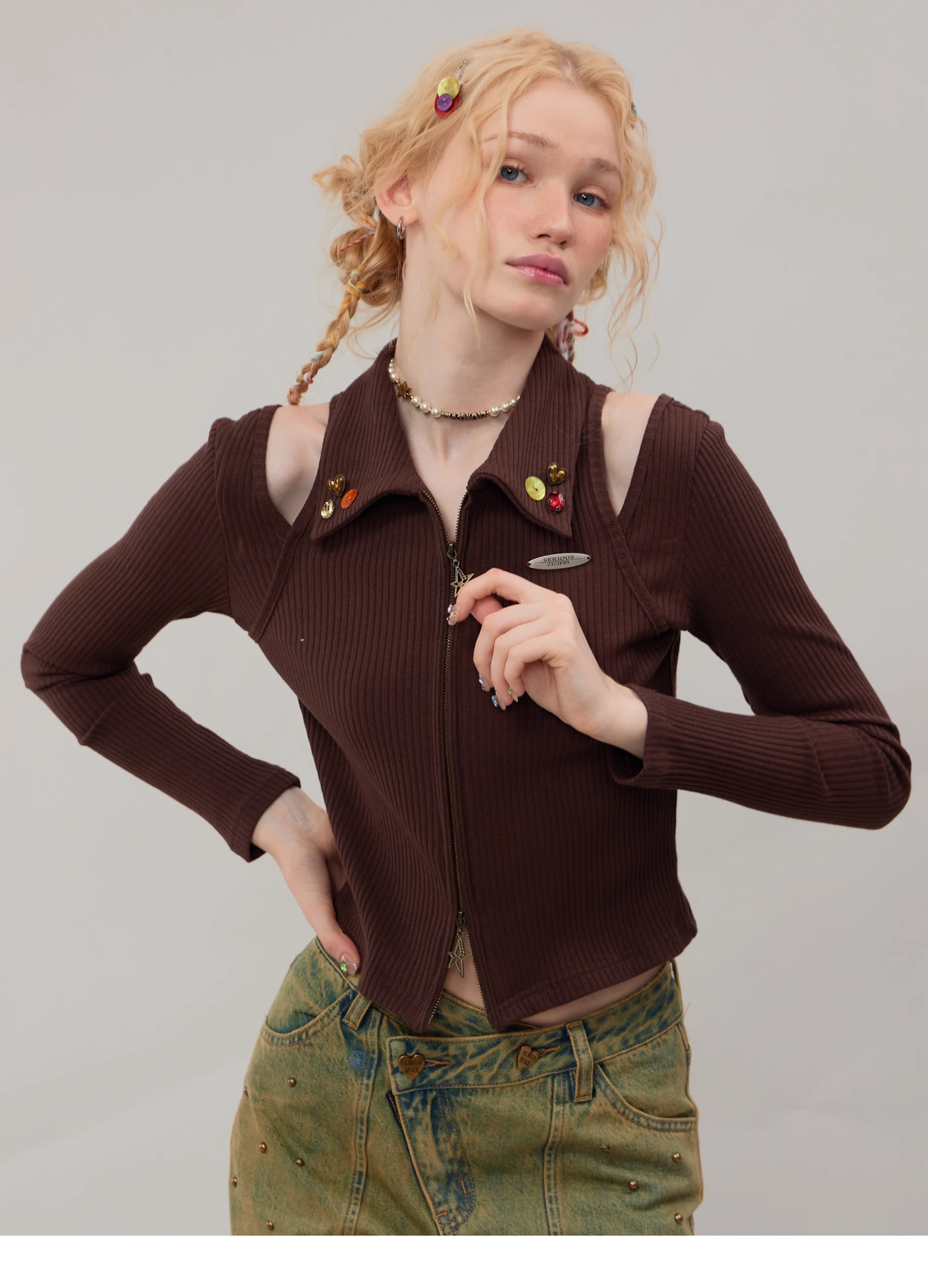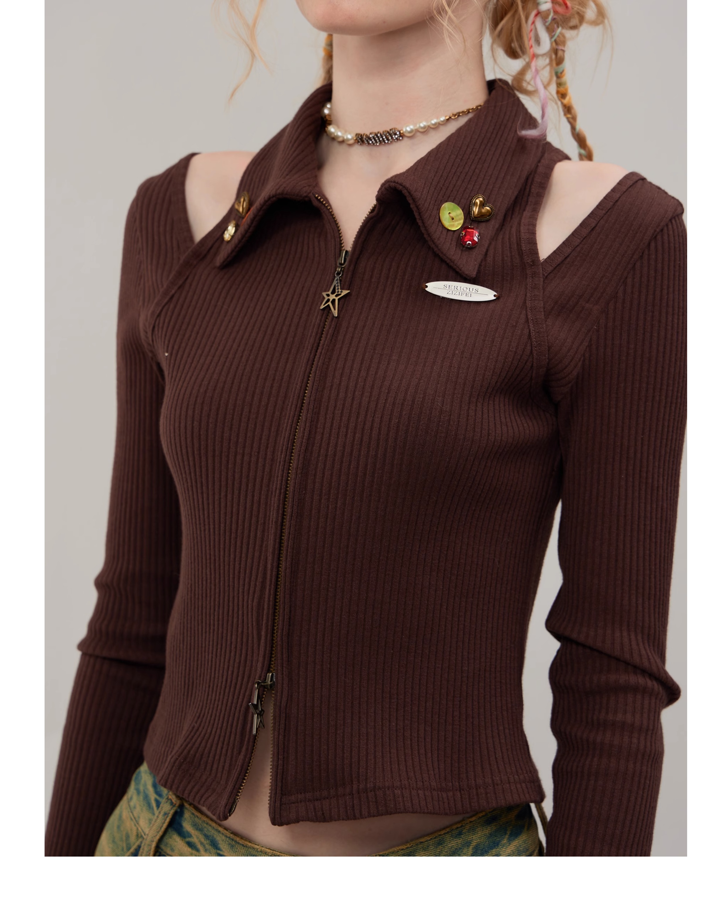 Топ с воротником-поло на молнии и текстурированной рубашкой с длинными рукавами для осенне-зимнего ретро-стиля