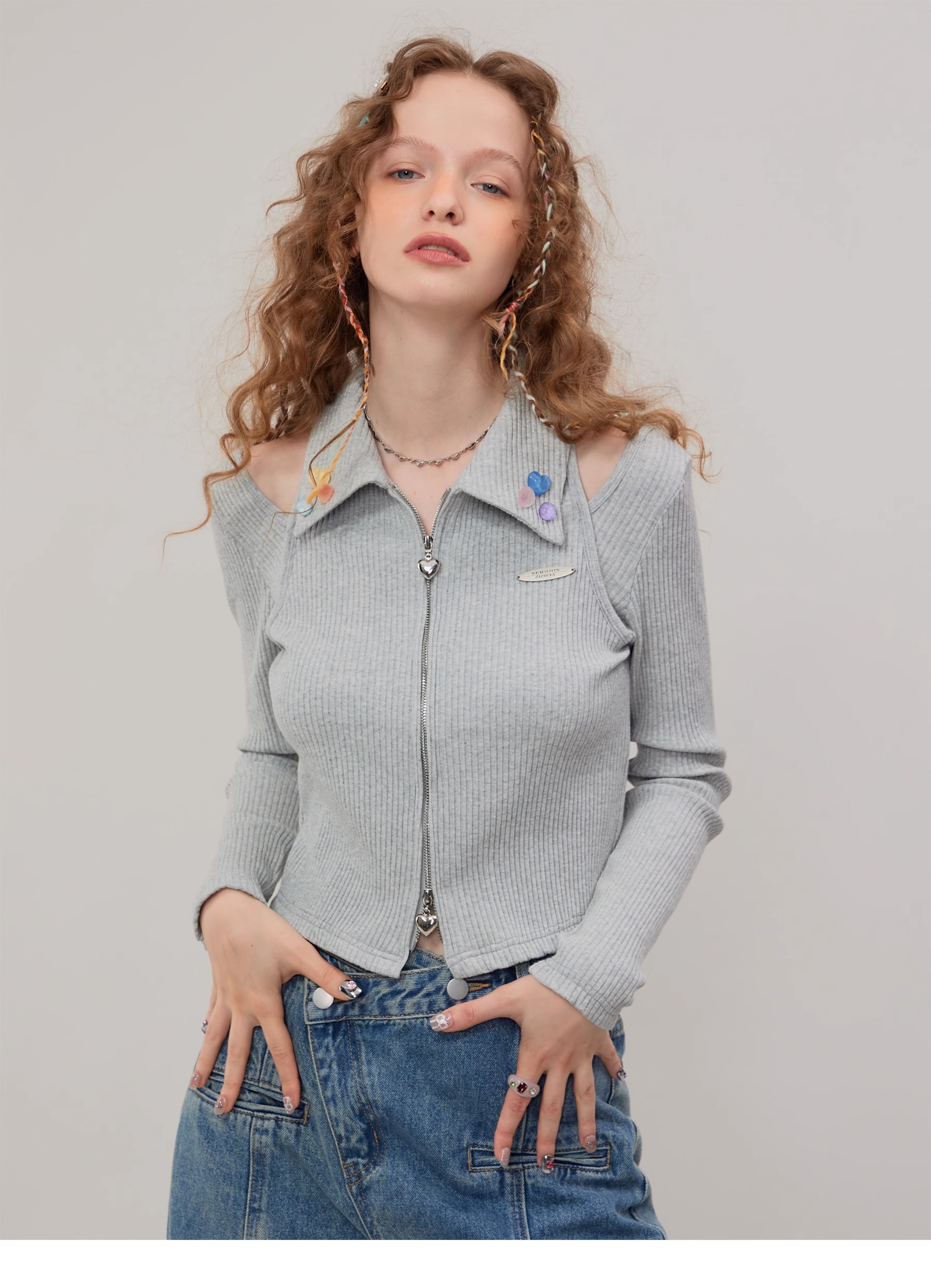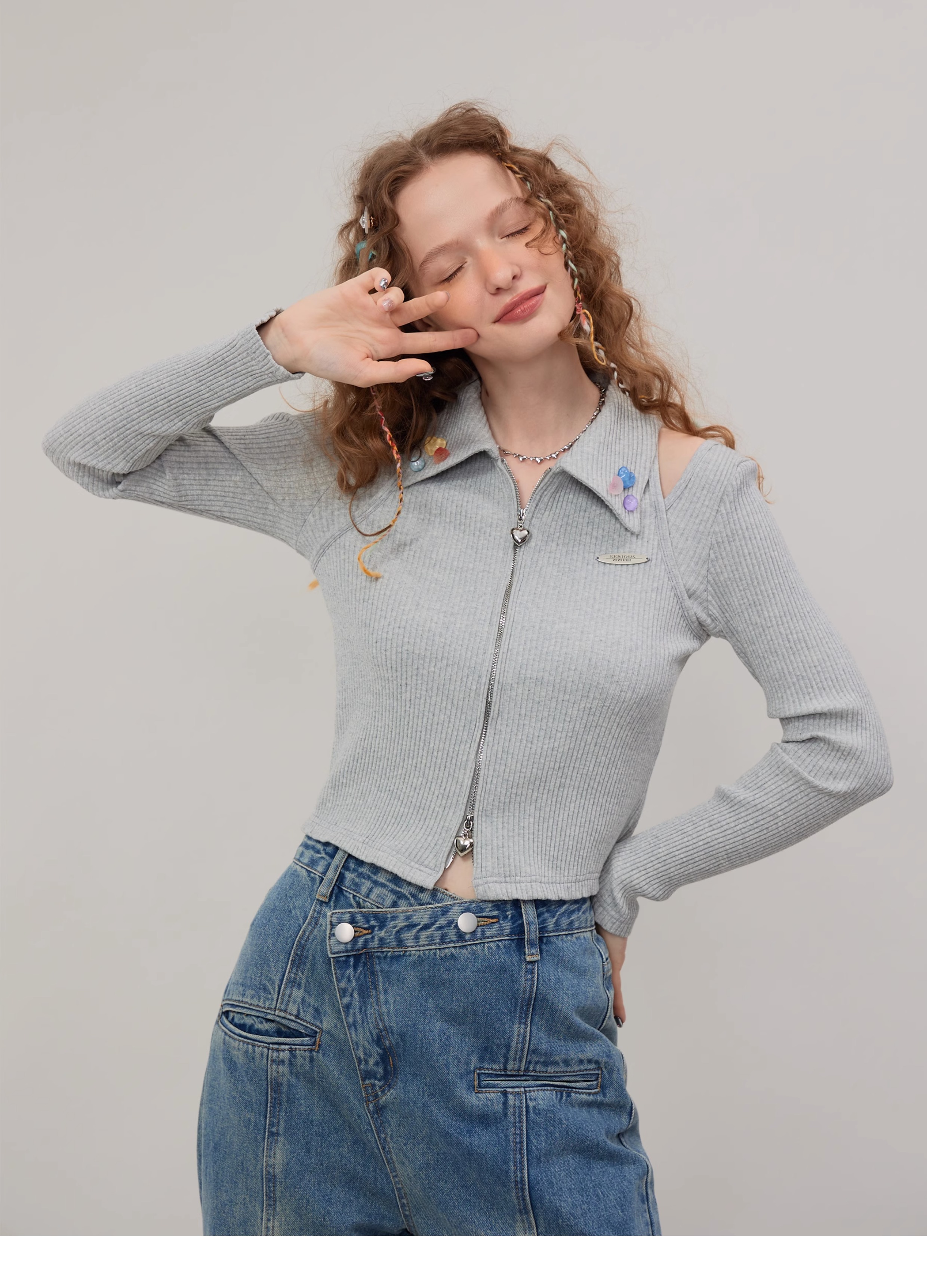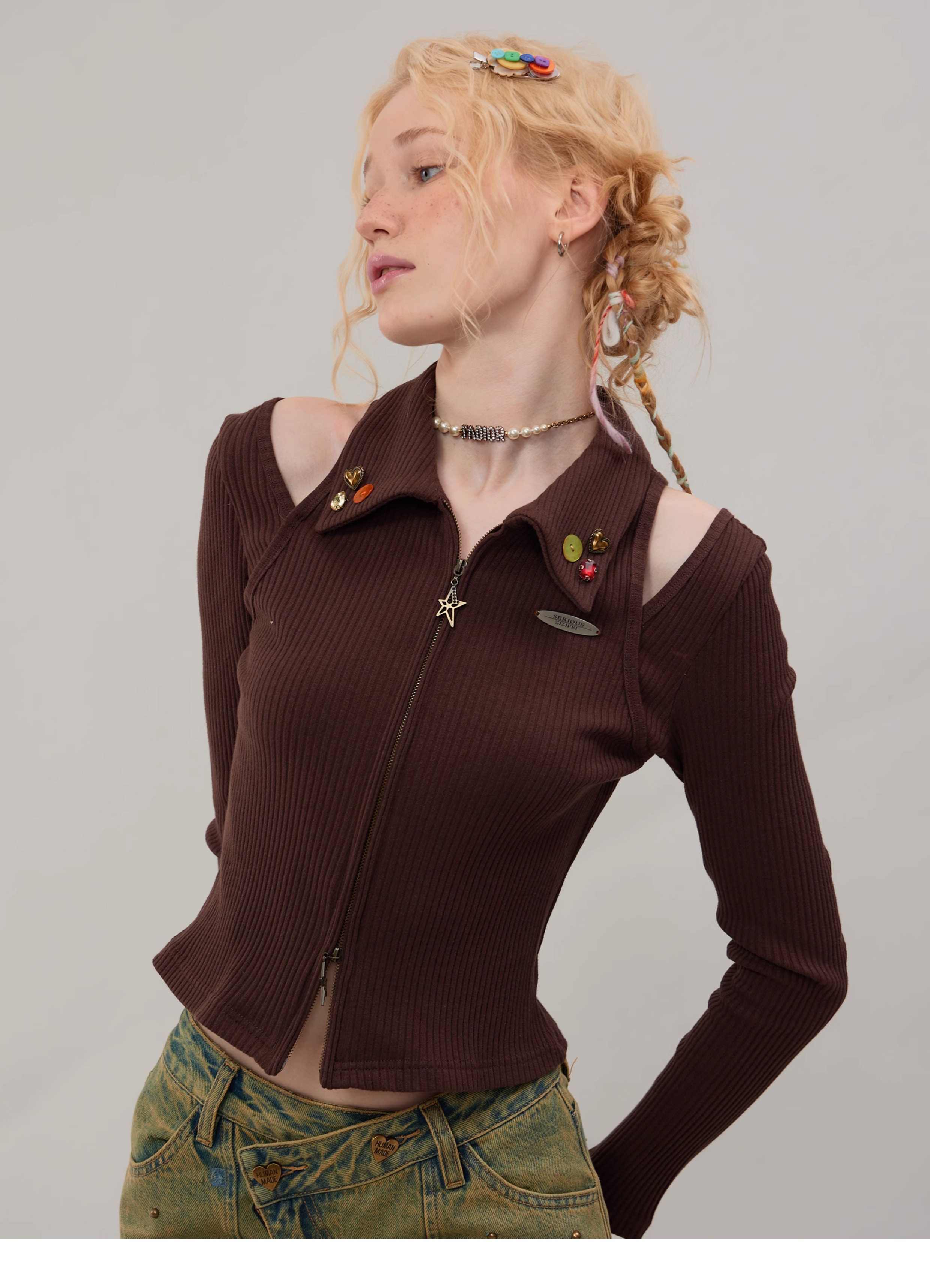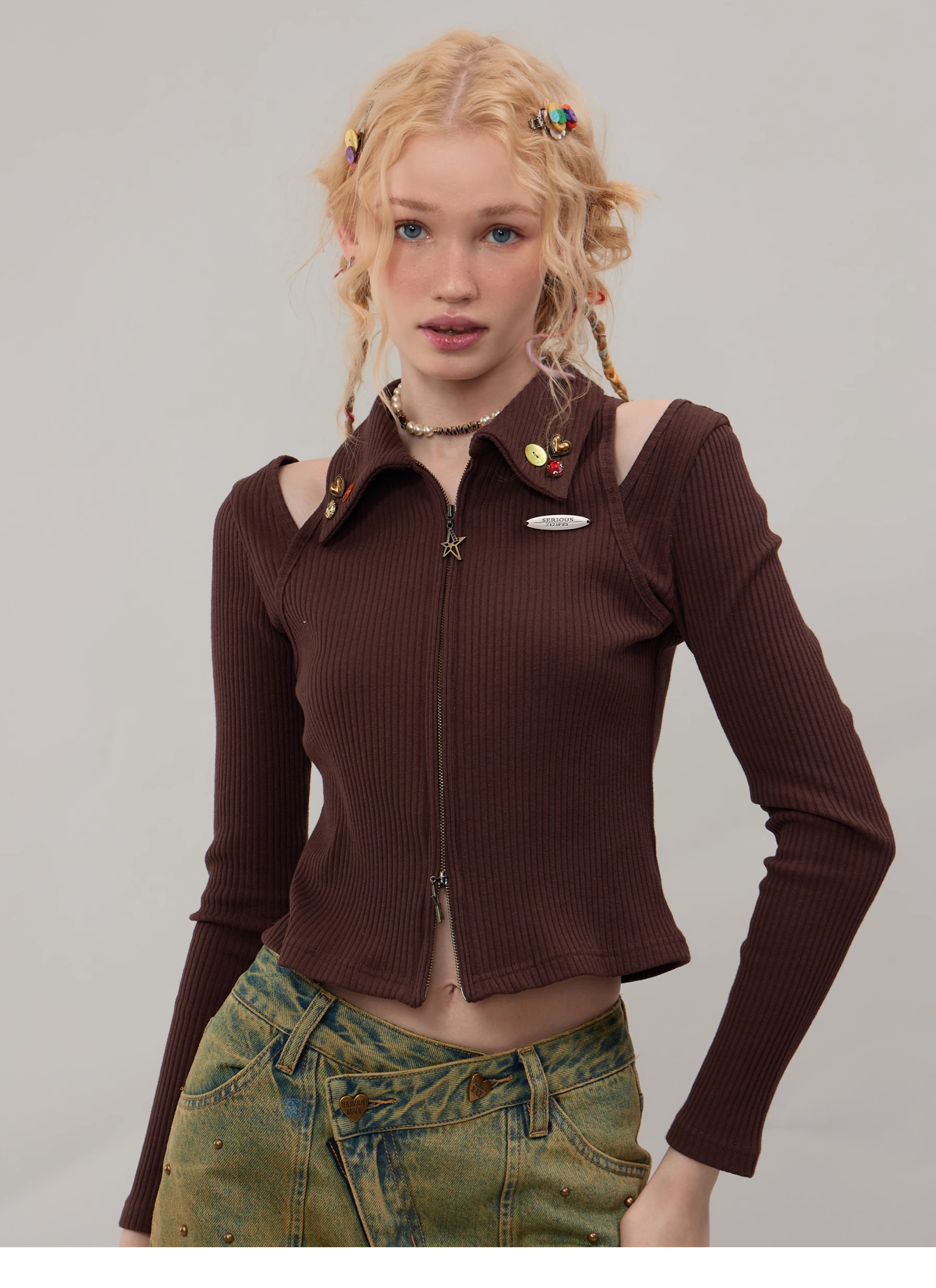 Топ с воротником-поло на молнии и текстурированной рубашкой с длинными рукавами для осенне-зимнего ретро-стиля